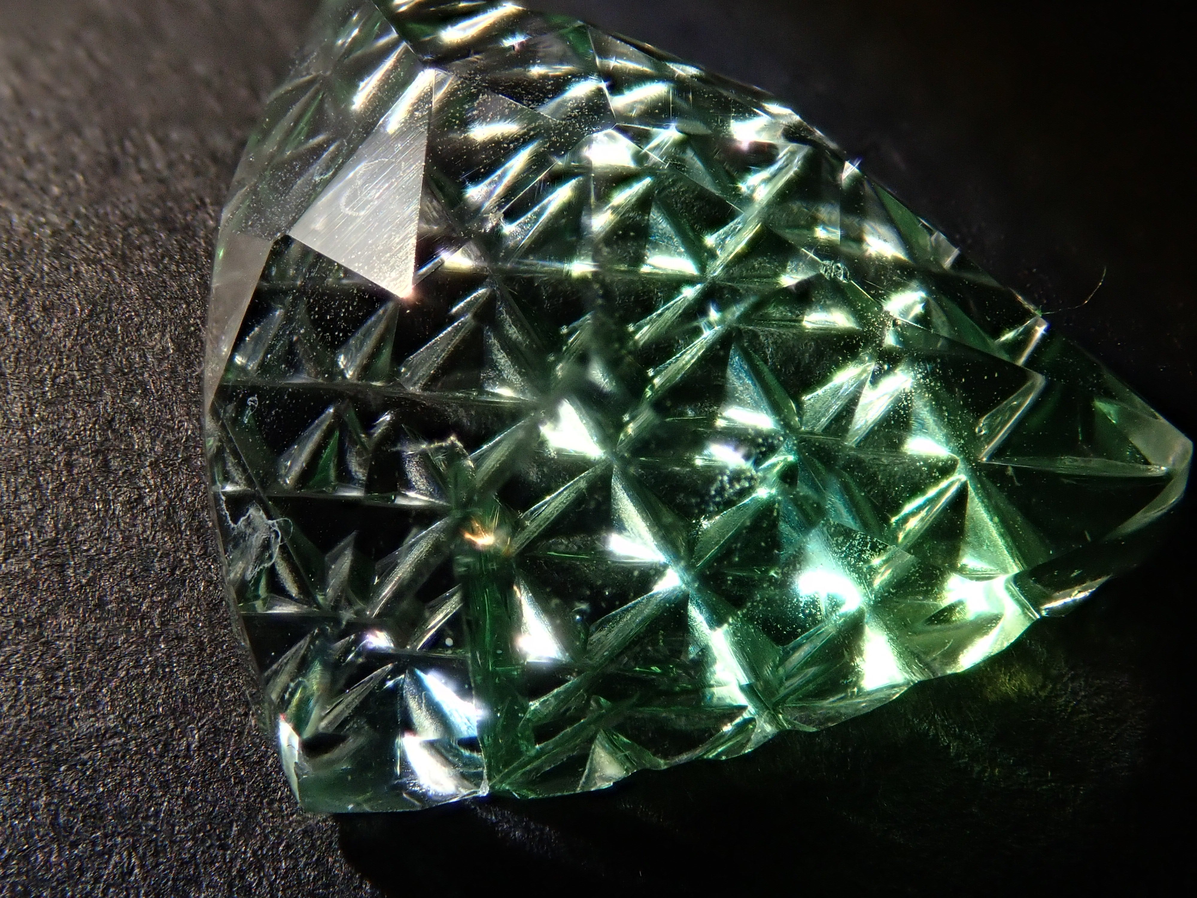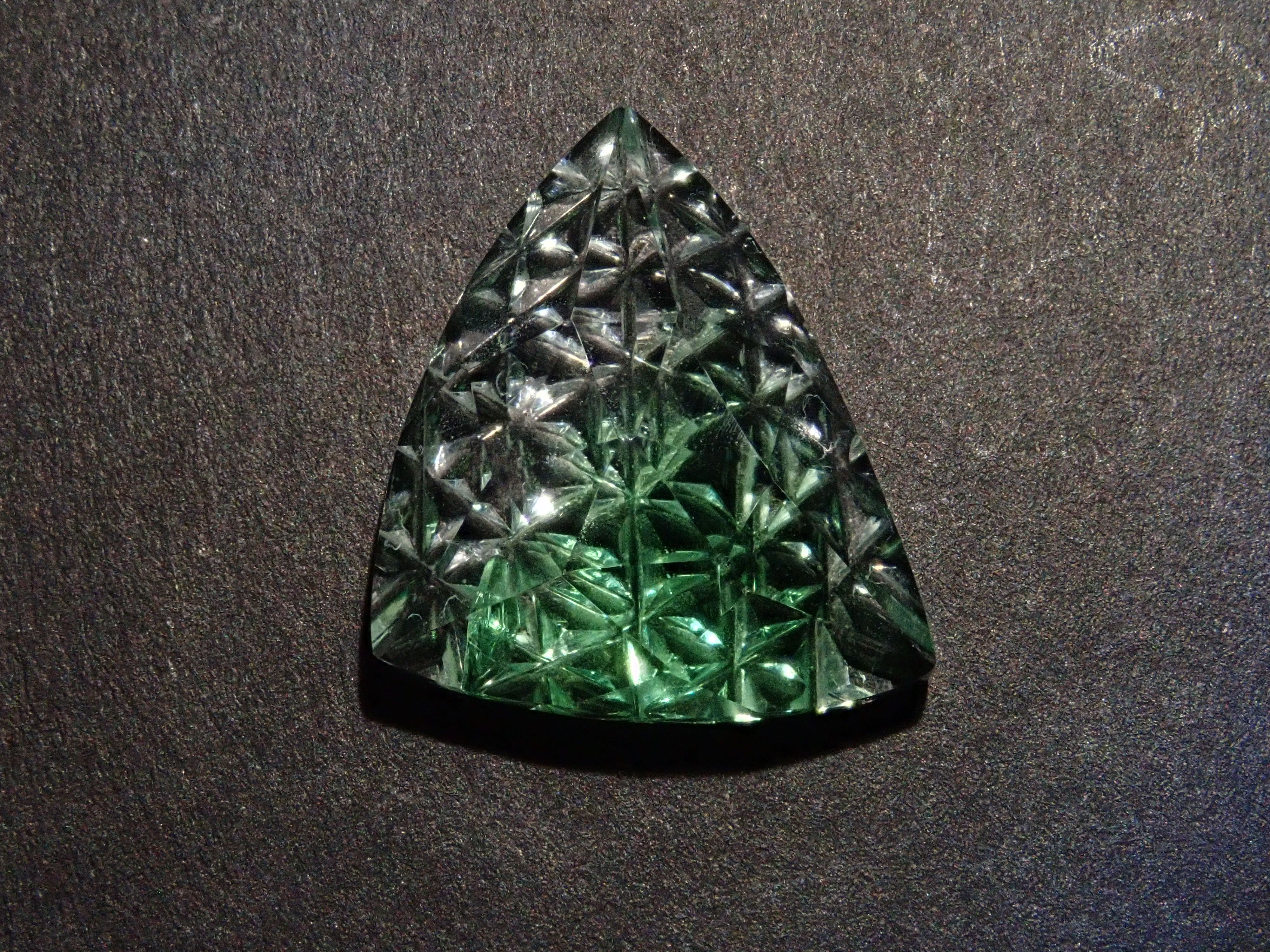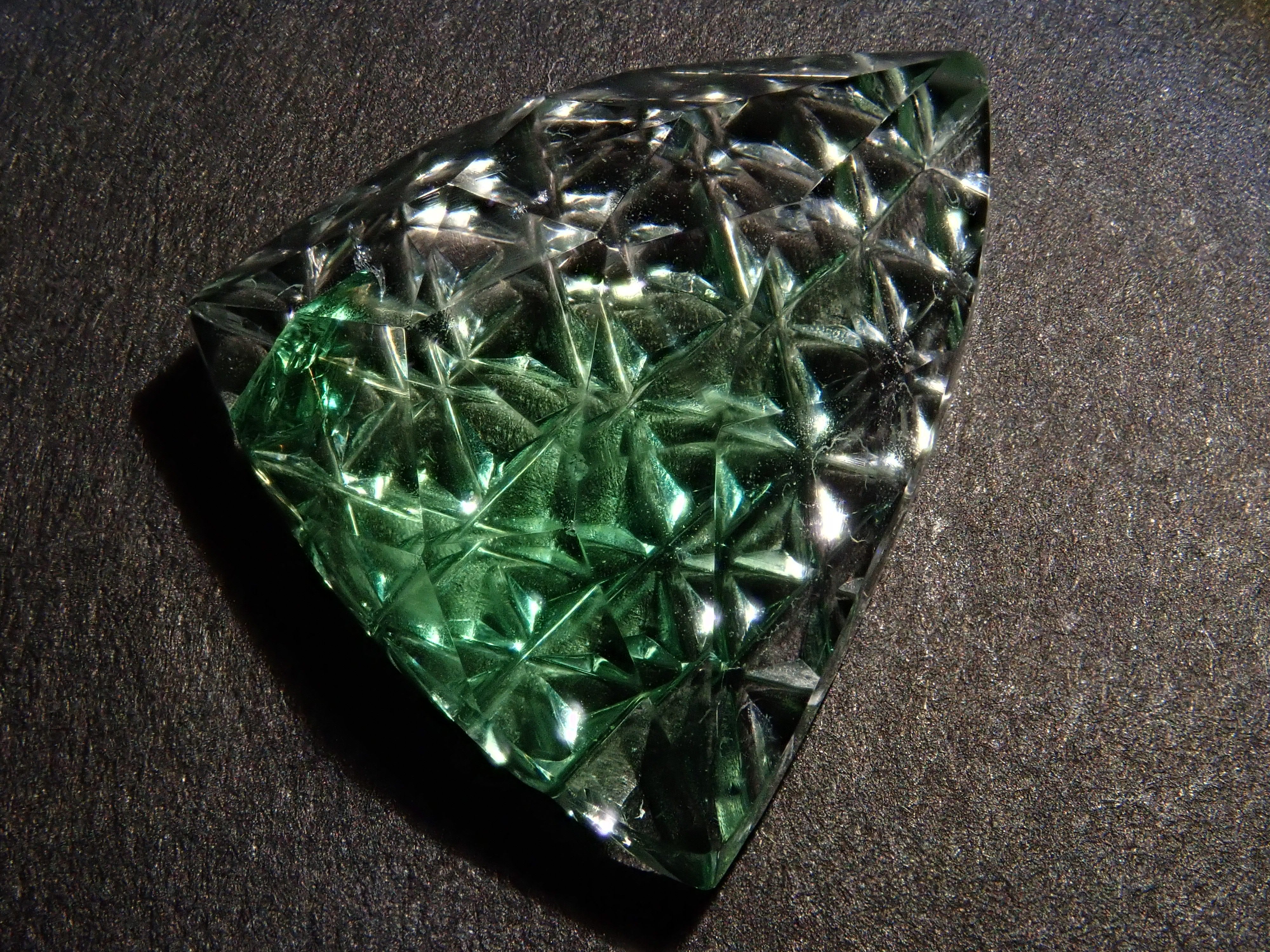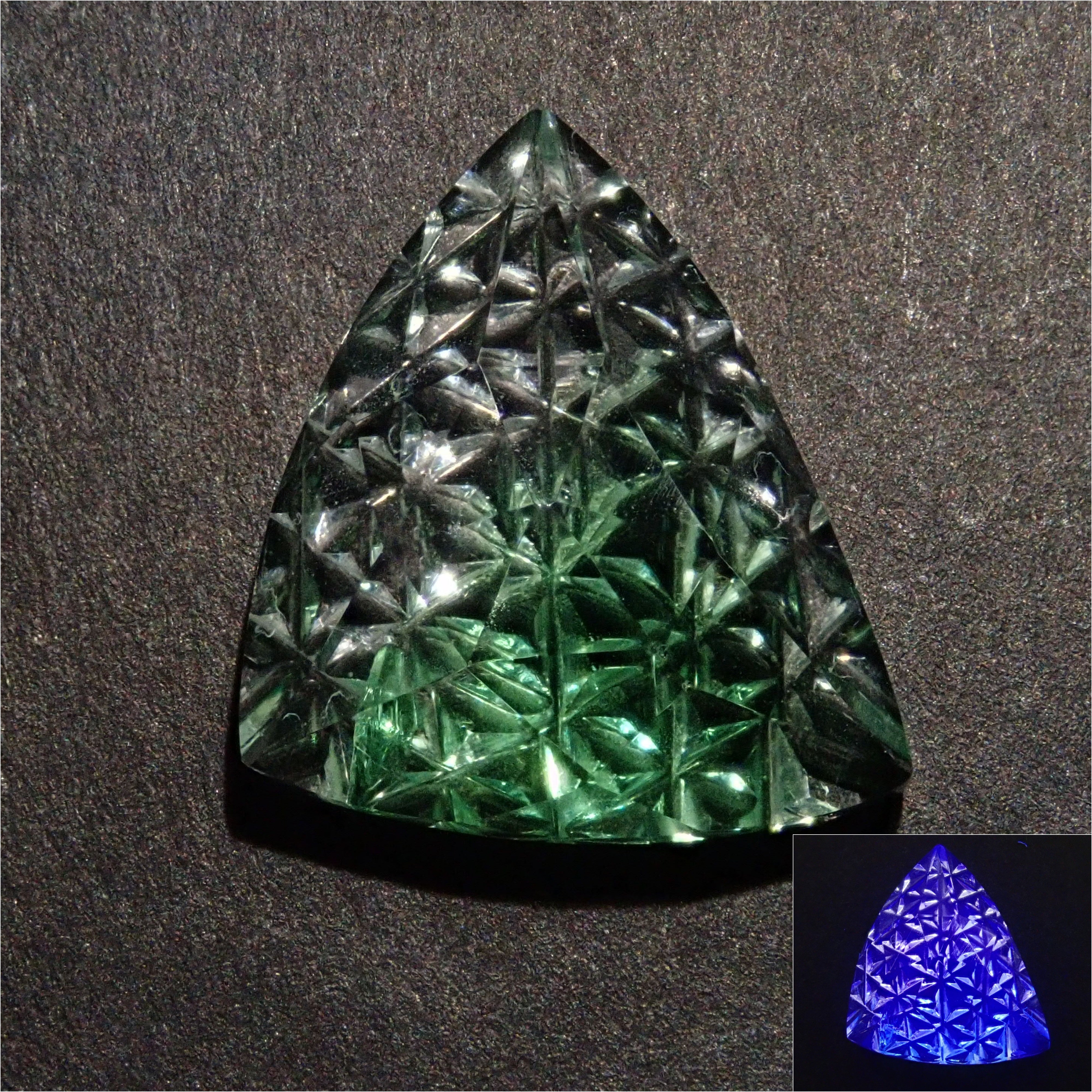 這是一塊鬆散的哥倫比亞螢石,由 Koshu Takaishi Kiriko 製作,由 Shimizu Kiseki 和 Yoichi Fukasawa 合作完成。這款甲州寶石切子切割由兩位大師創作:清水寶石的代表清水幸雄和珠寶工藝深澤的代表深澤洋一。清水先生負責刻面,深澤先生負責刻面。暴露在黑光下時會發出夢幻般的藍色光芒 這是甲州寶石切割玻璃。高度透明的螢石,可讓您欣賞綠色和黃色兩種色調。