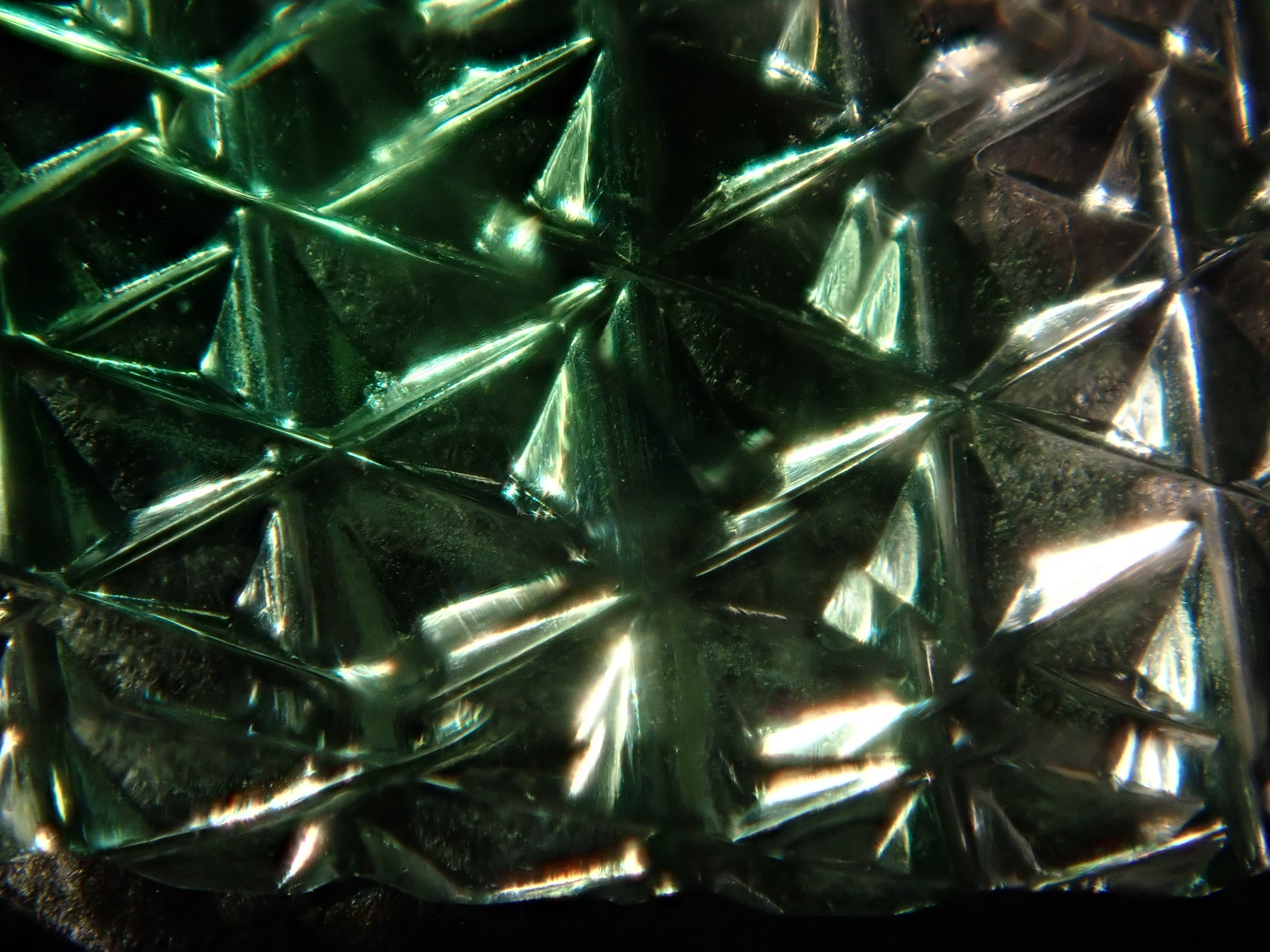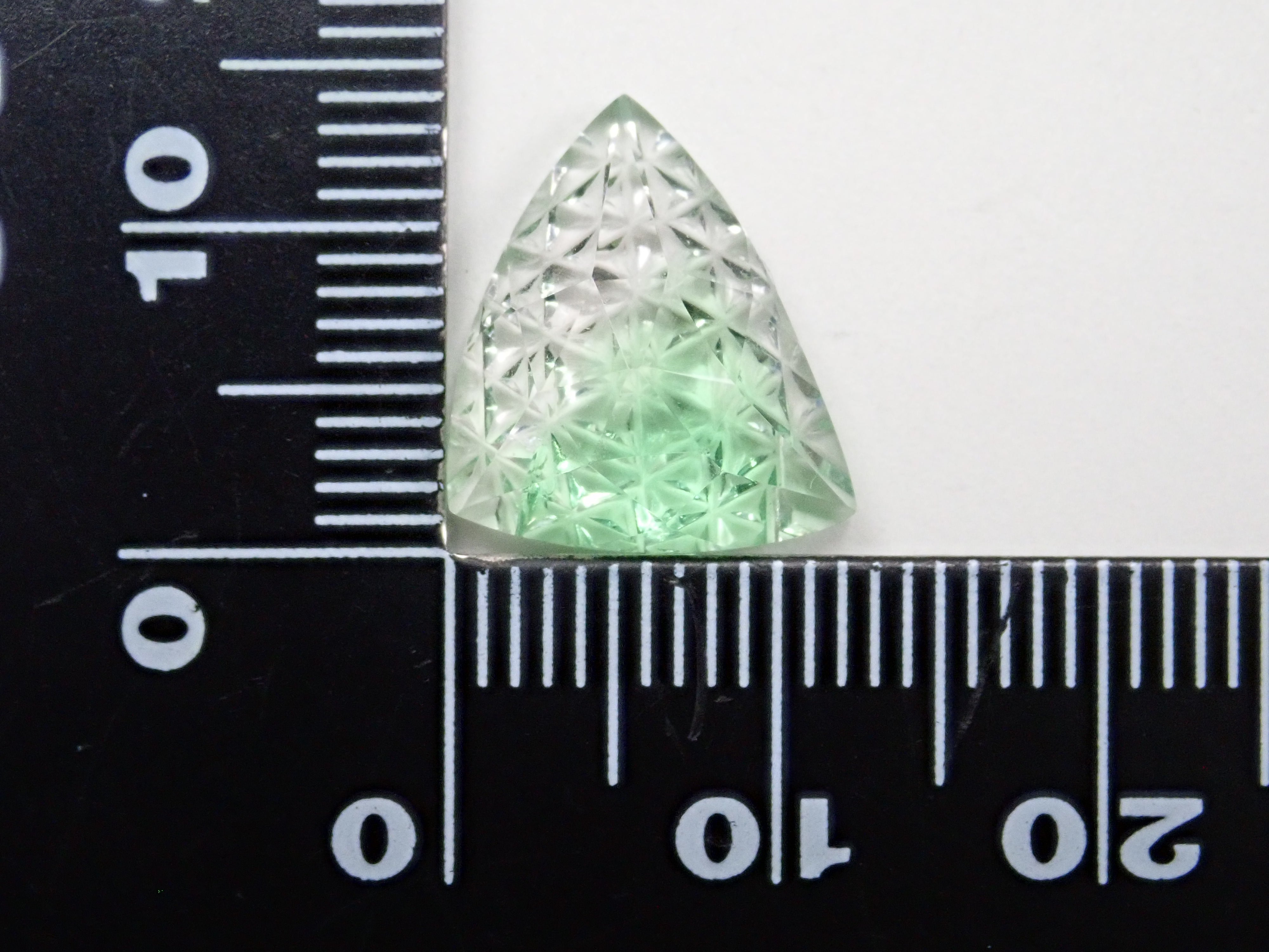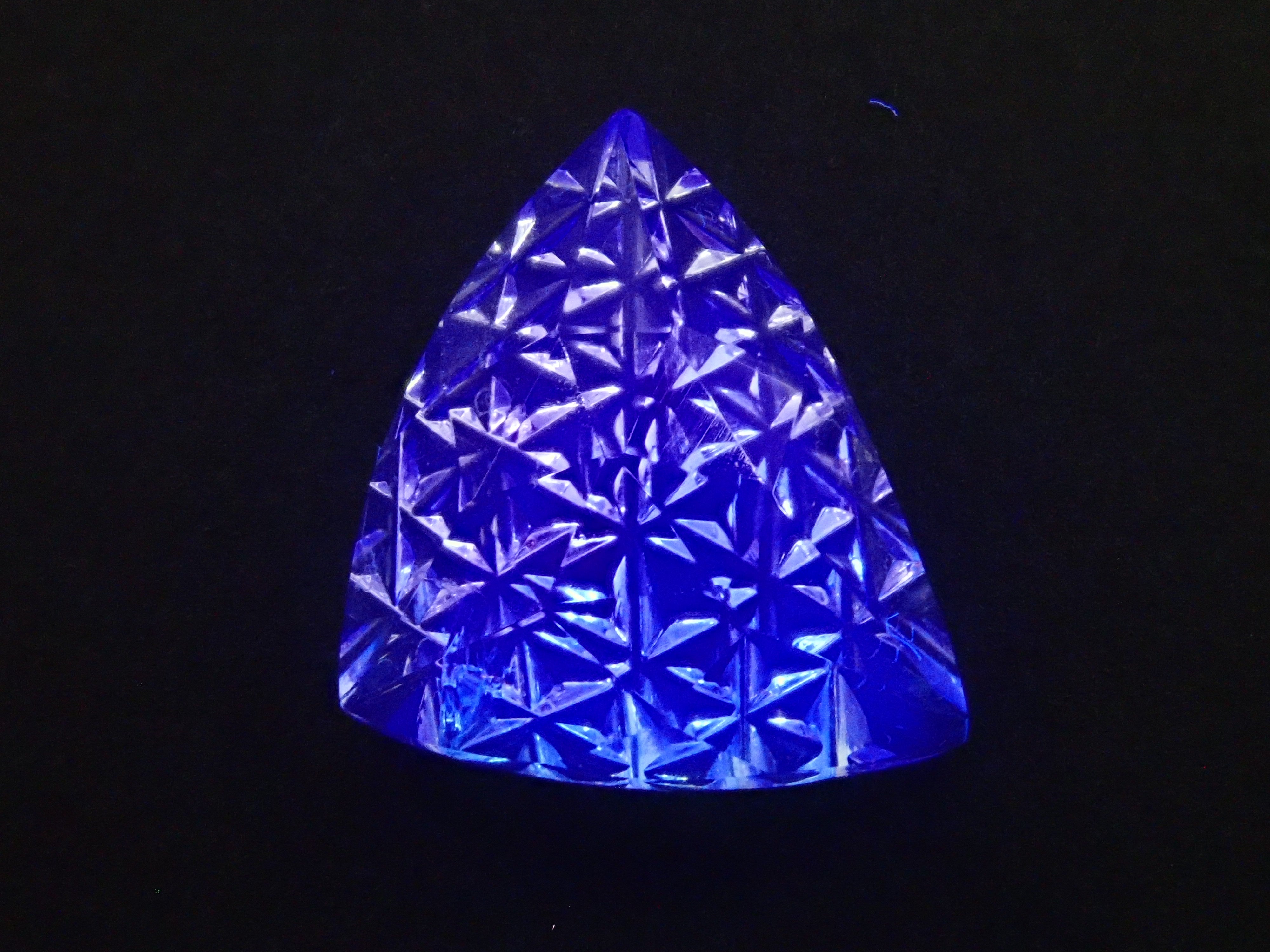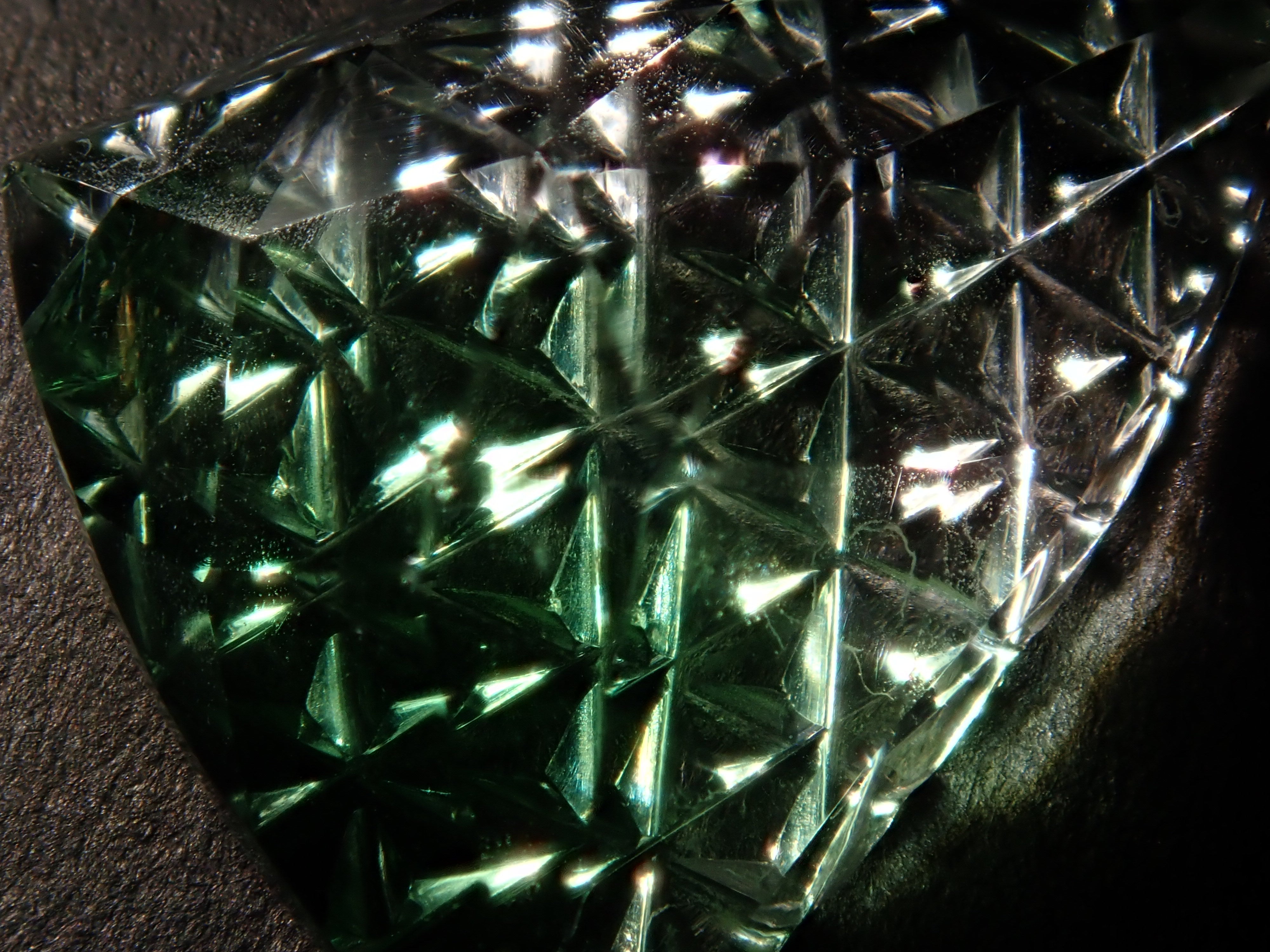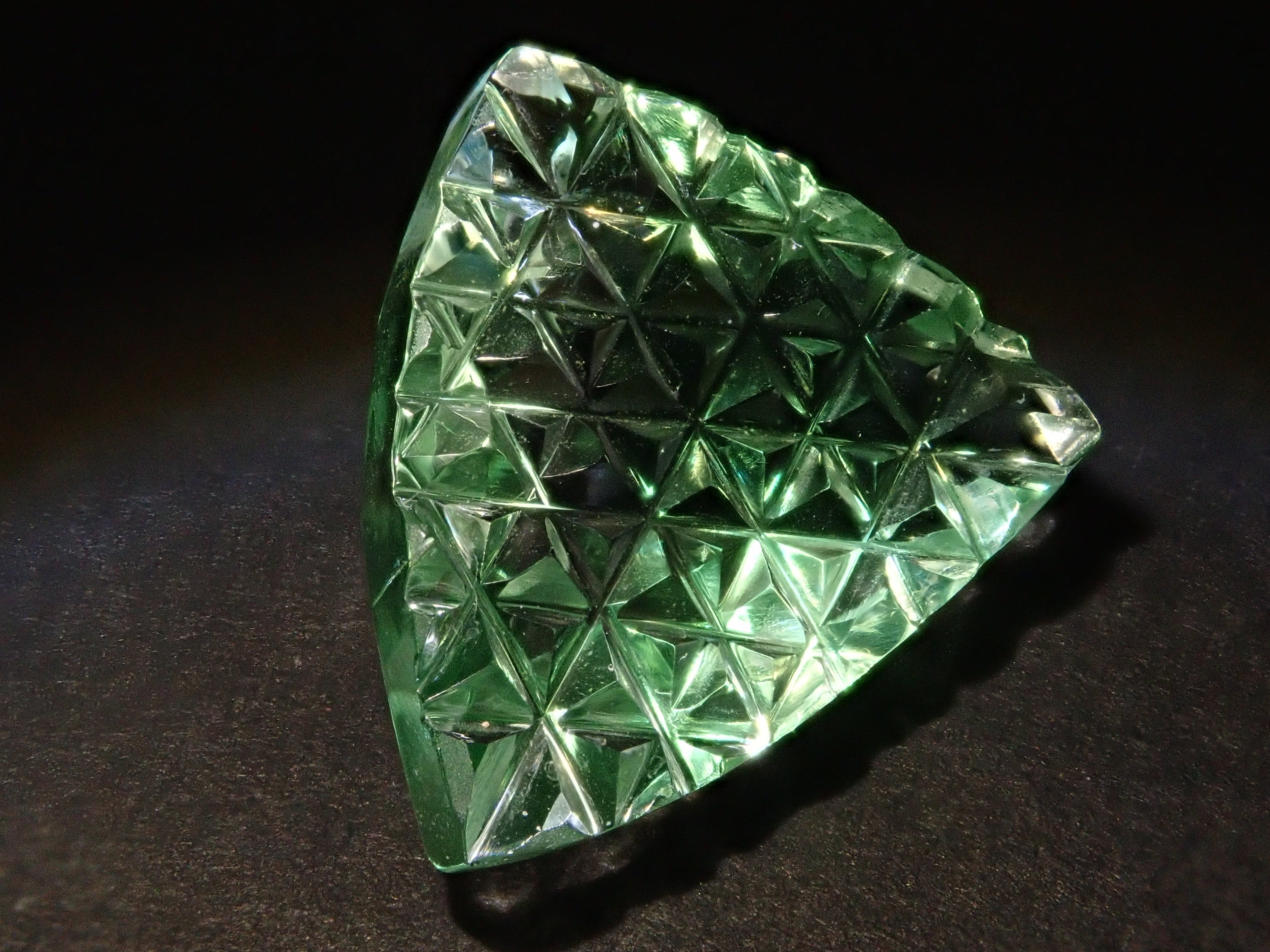 這是一塊鬆散的哥倫比亞螢石,由 Koshu Takaishi Kiriko 製作,由 Shimizu Kiseki 和 Yoichi Fukasawa 合作完成。這款甲州寶石切子切割由兩位大師創作:清水寶石的代表清水幸雄和珠寶工藝深澤的代表深澤洋一。清水先生負責刻面,深澤先生負責刻面。暴露在黑光下時會發出夢幻般的藍色光芒 這是甲州寶石切割玻璃。高度透明的螢石,可讓您欣賞綠色和黃色兩種色調。
