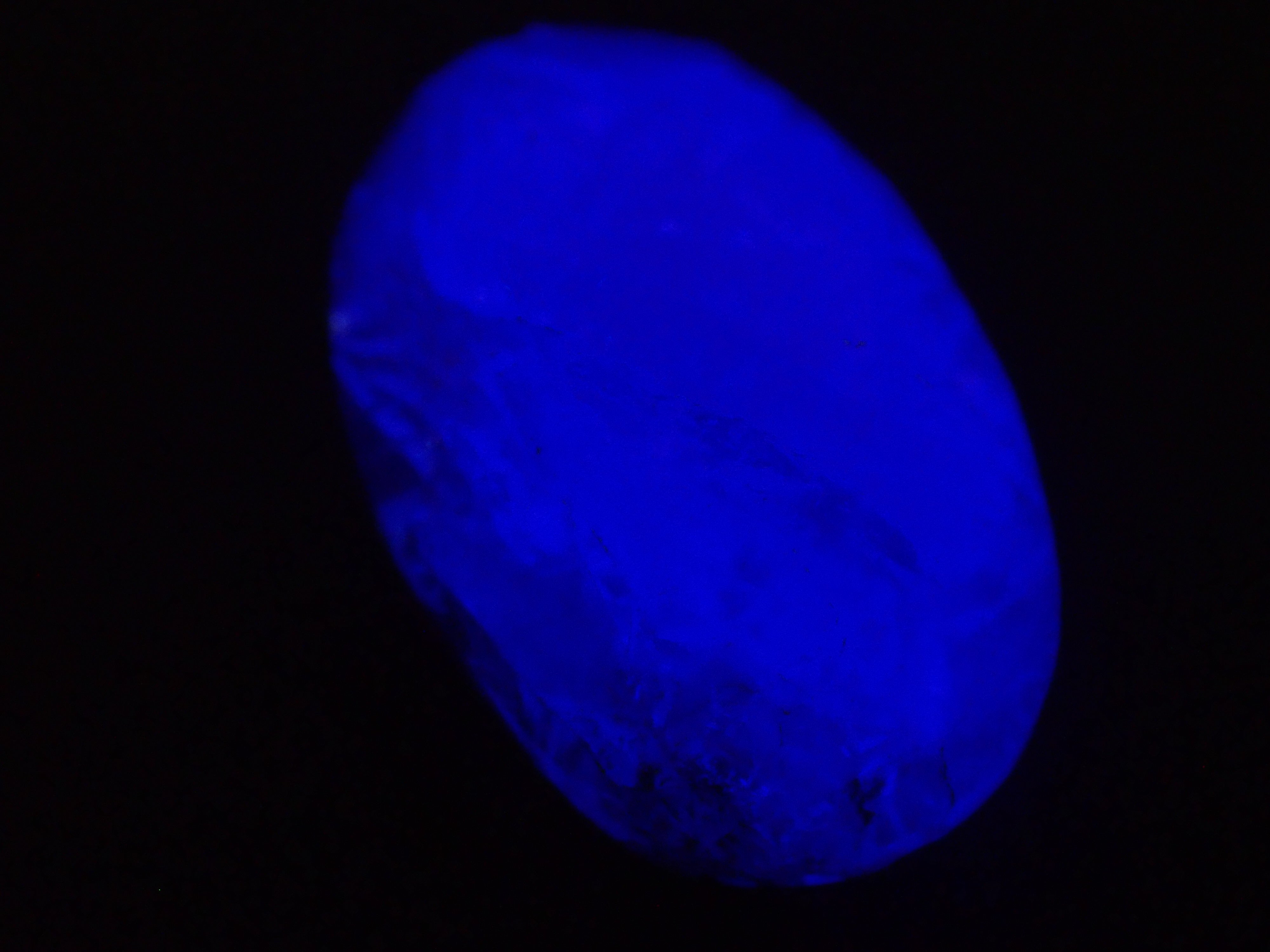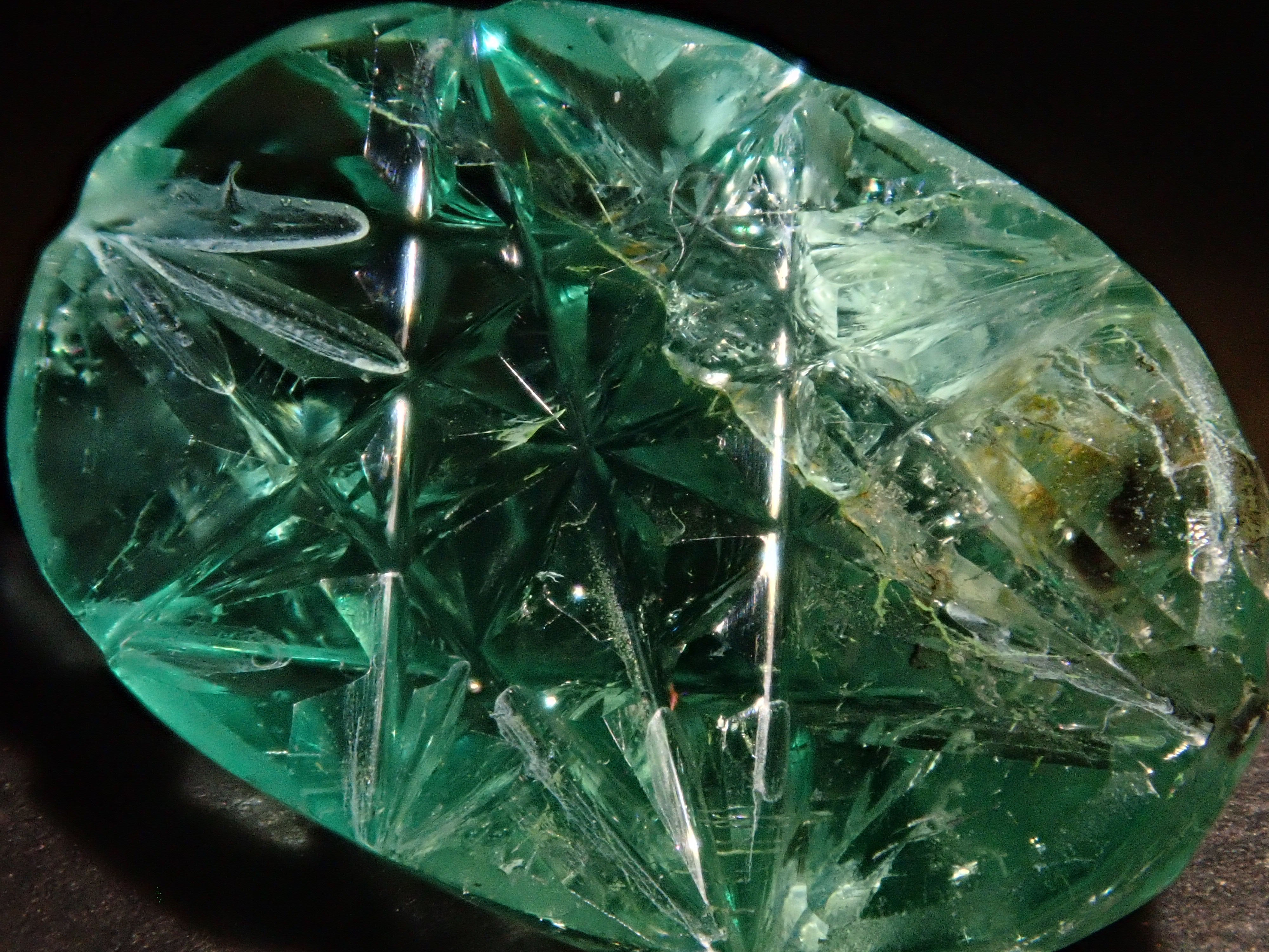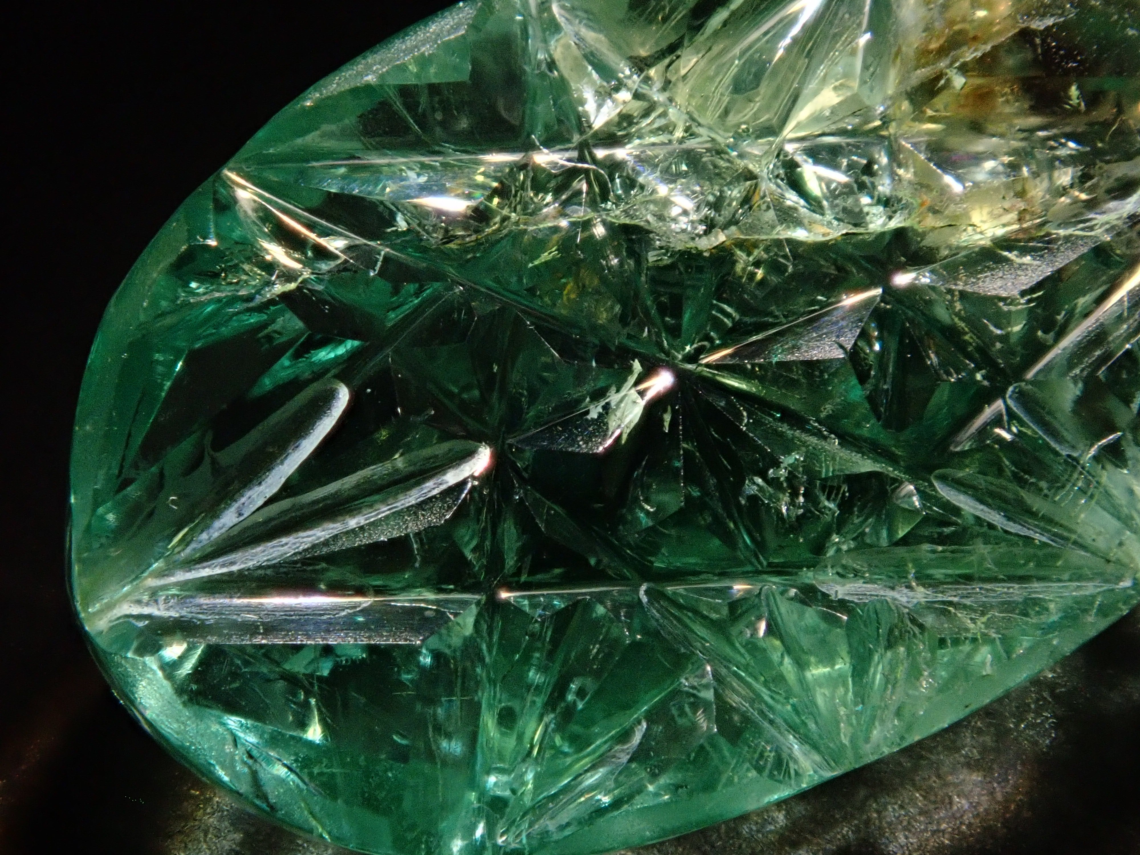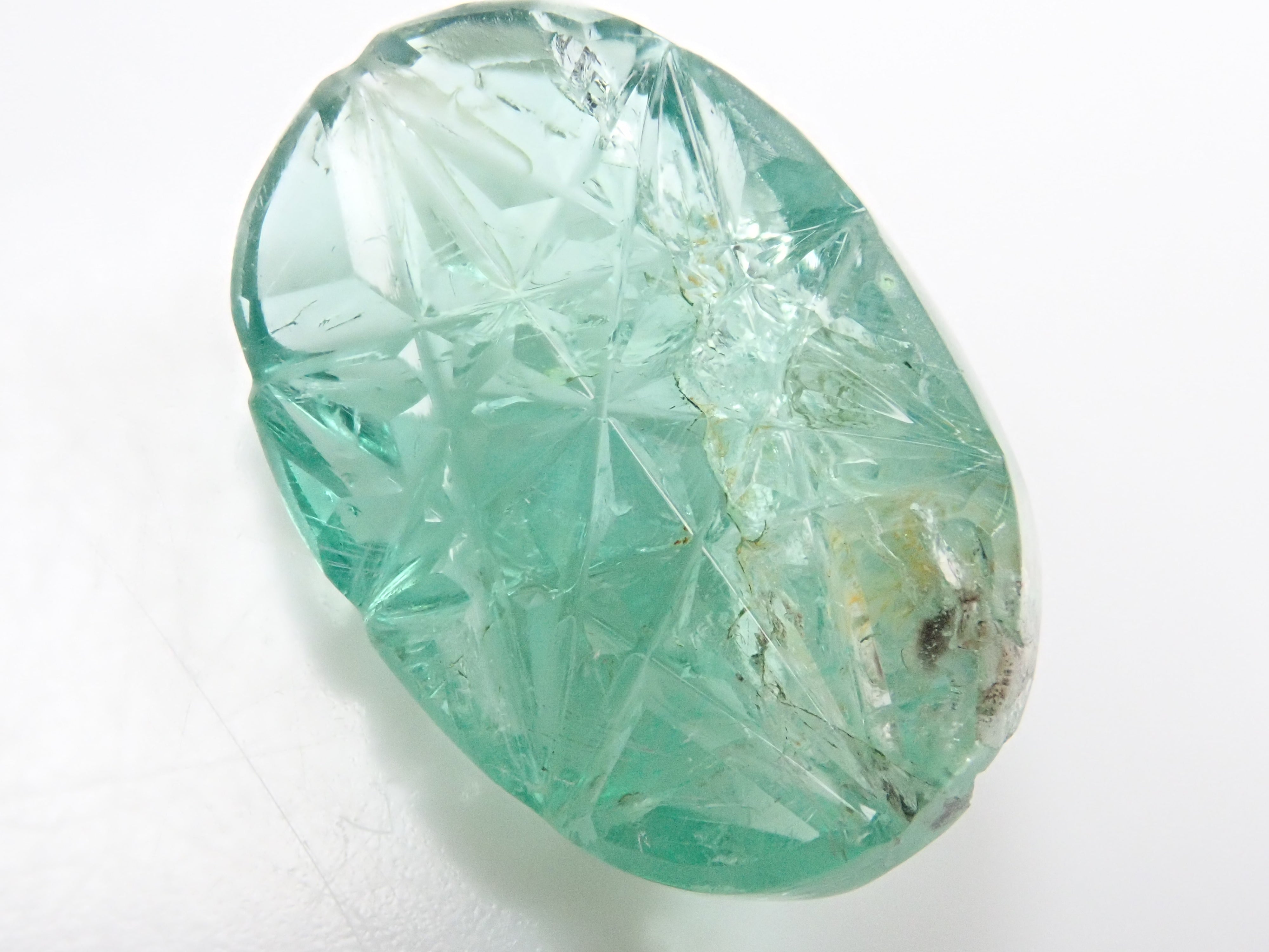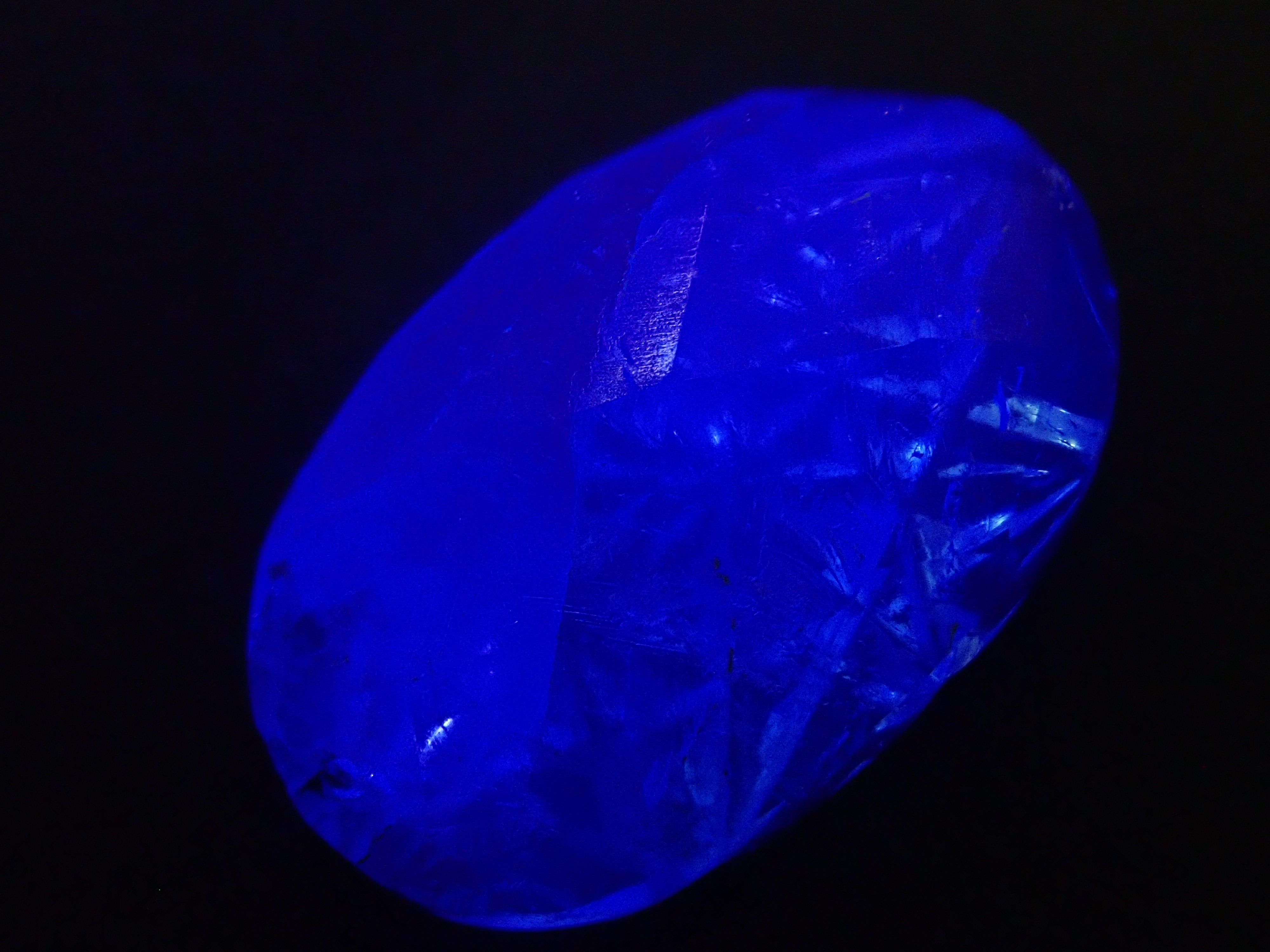這是一塊鬆散的哥倫比亞螢石,由 Koshu Takaishi Kiriko 製作,由 Shimizu Kiseki 和 Yoichi Fukasawa 合作完成。當暴露在黑光下時,它會發出亮藍色螢光。這款甲州寶石切子切割由兩位大師創作:清水寶石的代表清水幸雄和珠寶工藝深澤的代表深澤洋一。清水先生負責刻面,深澤先生負責刻面。