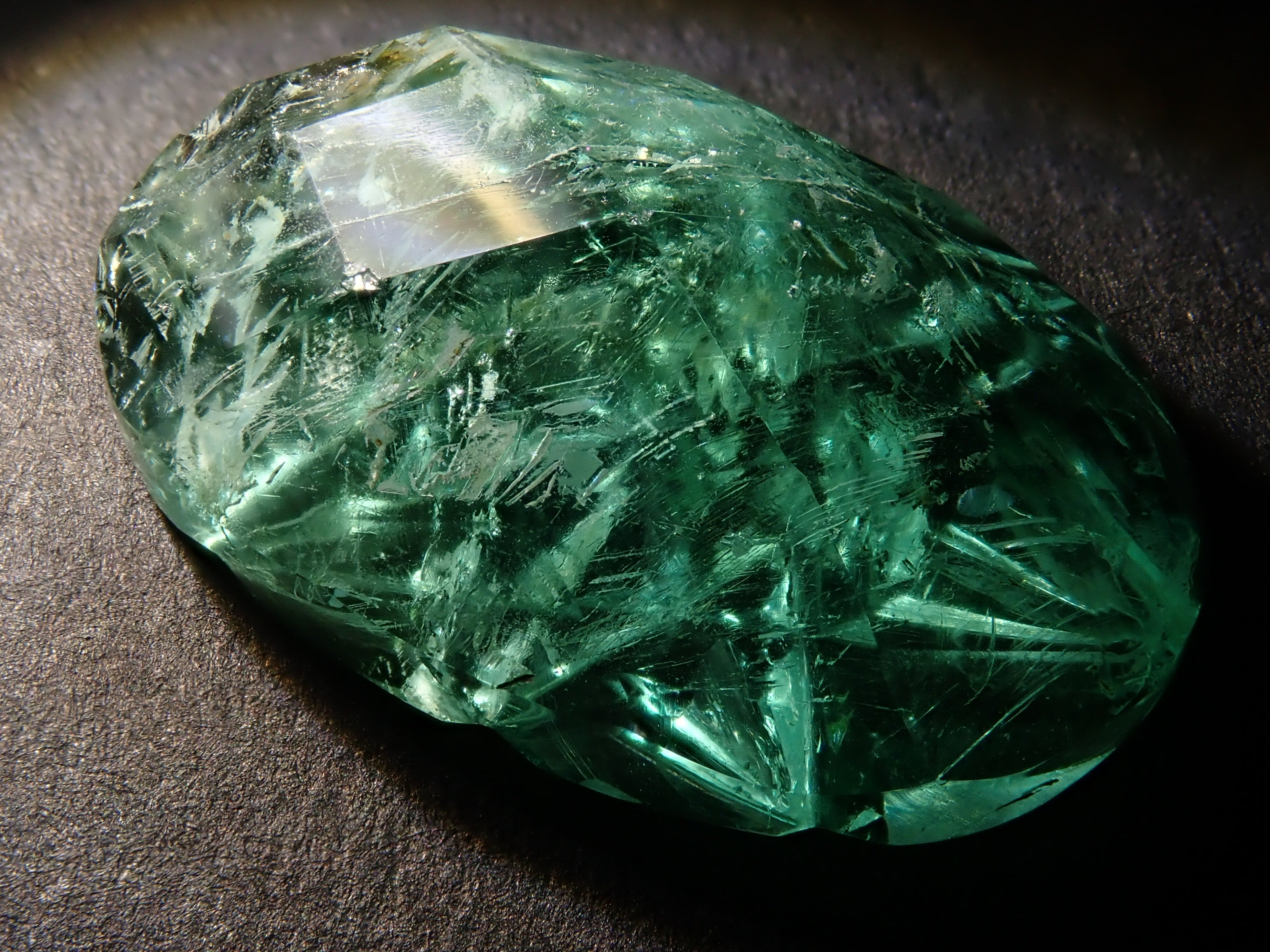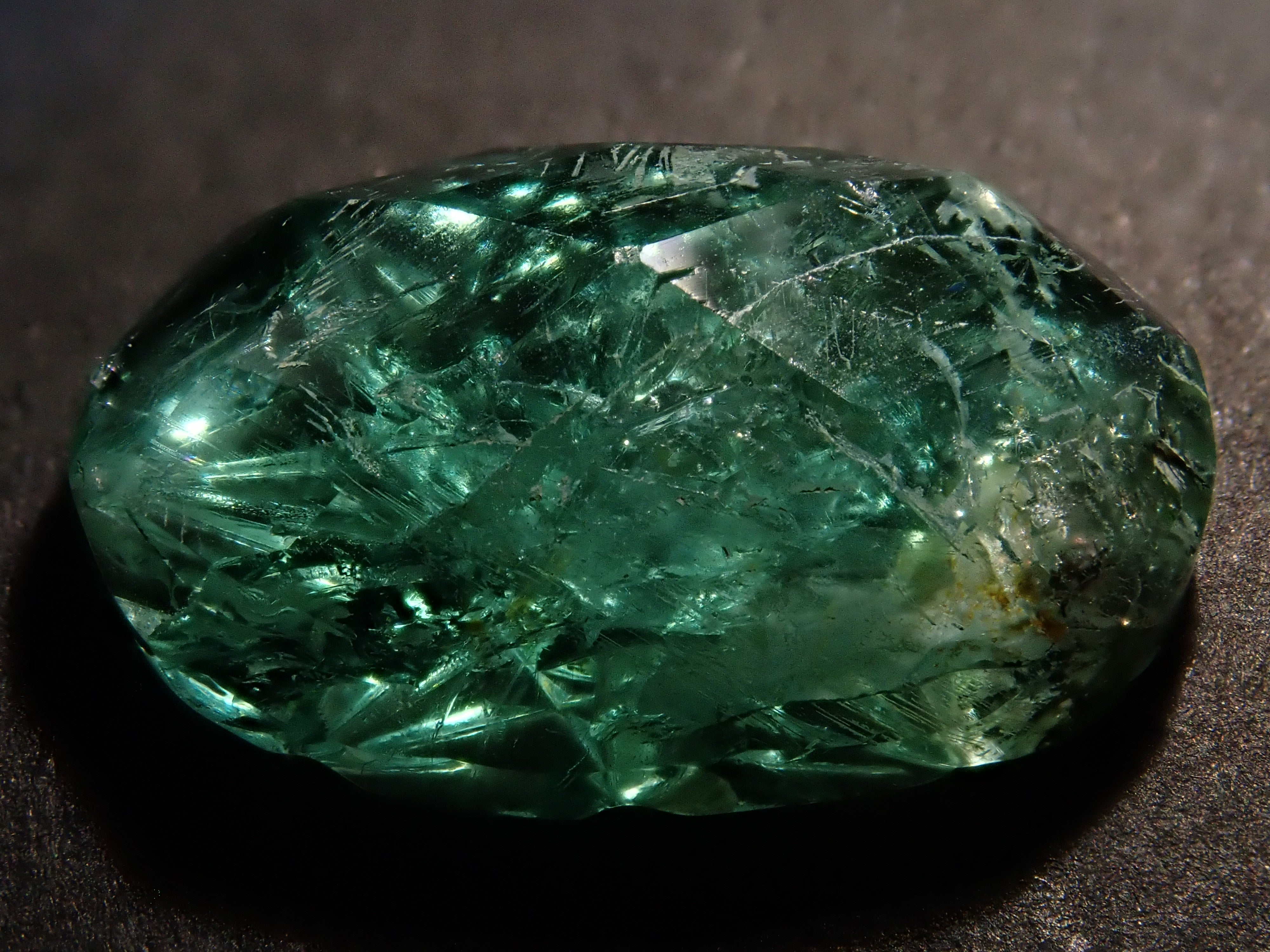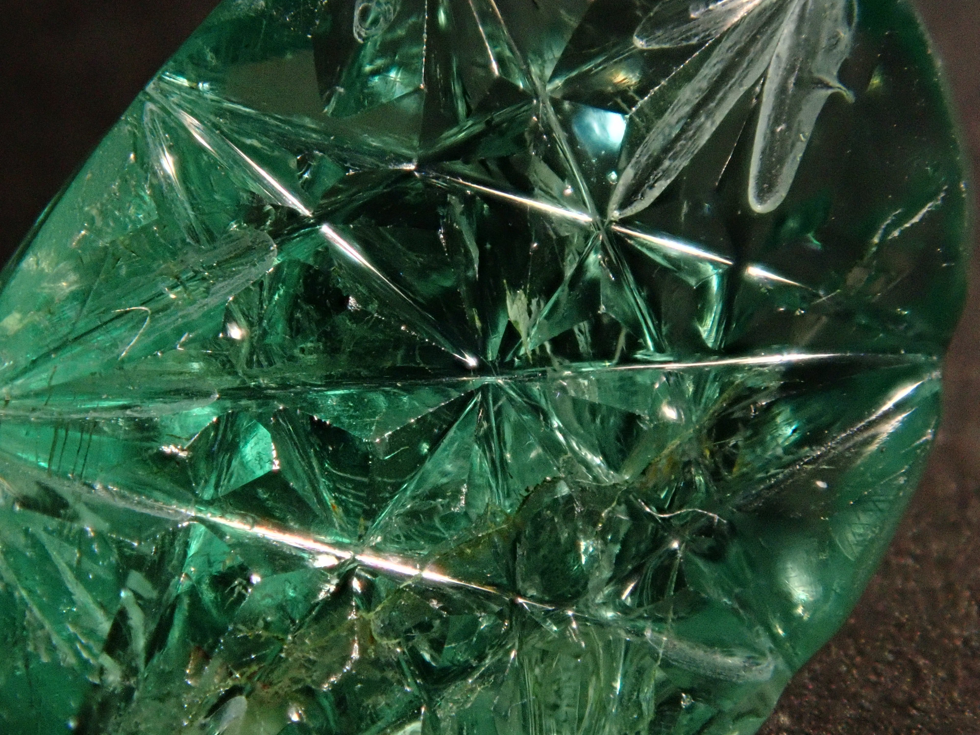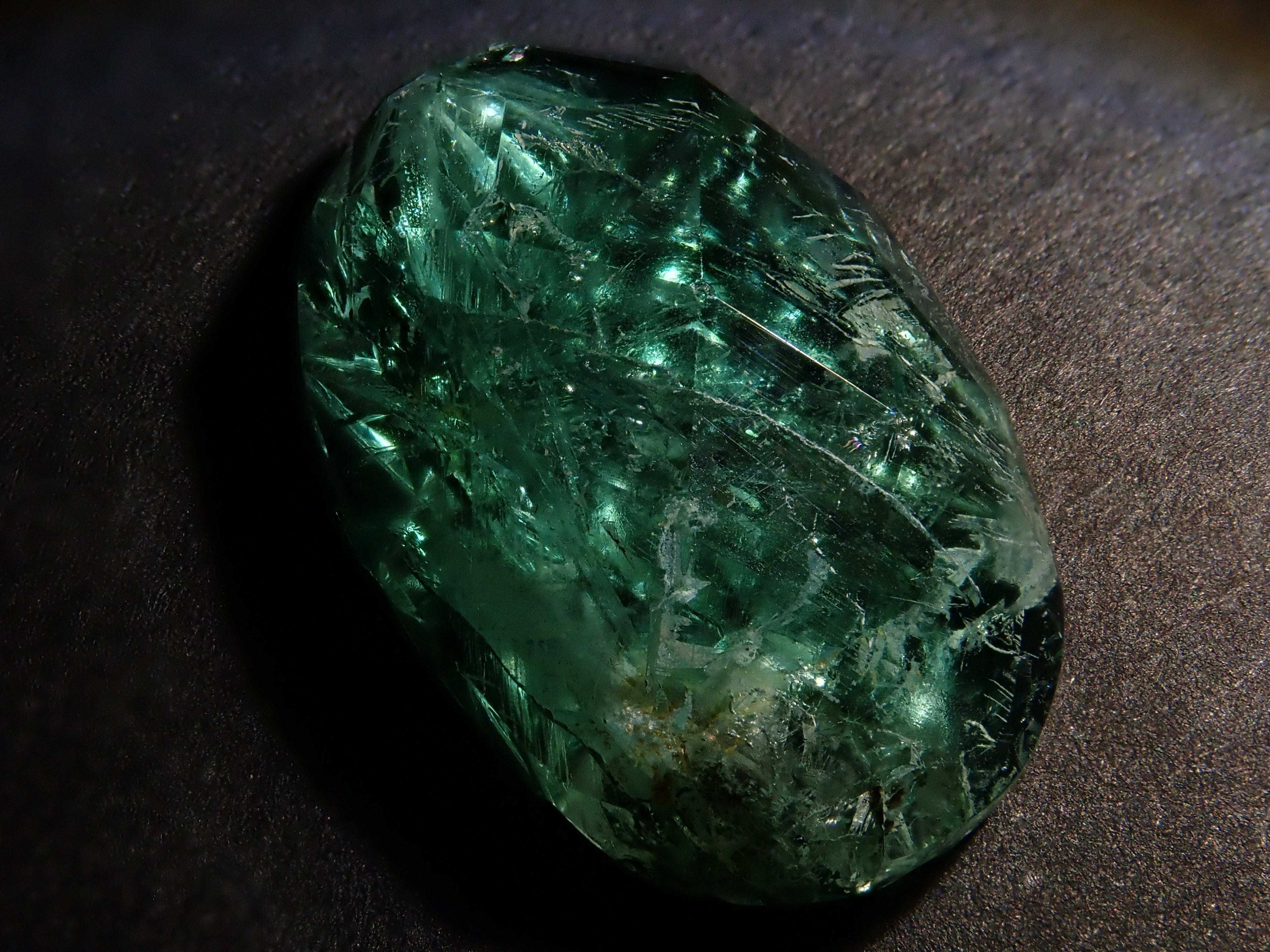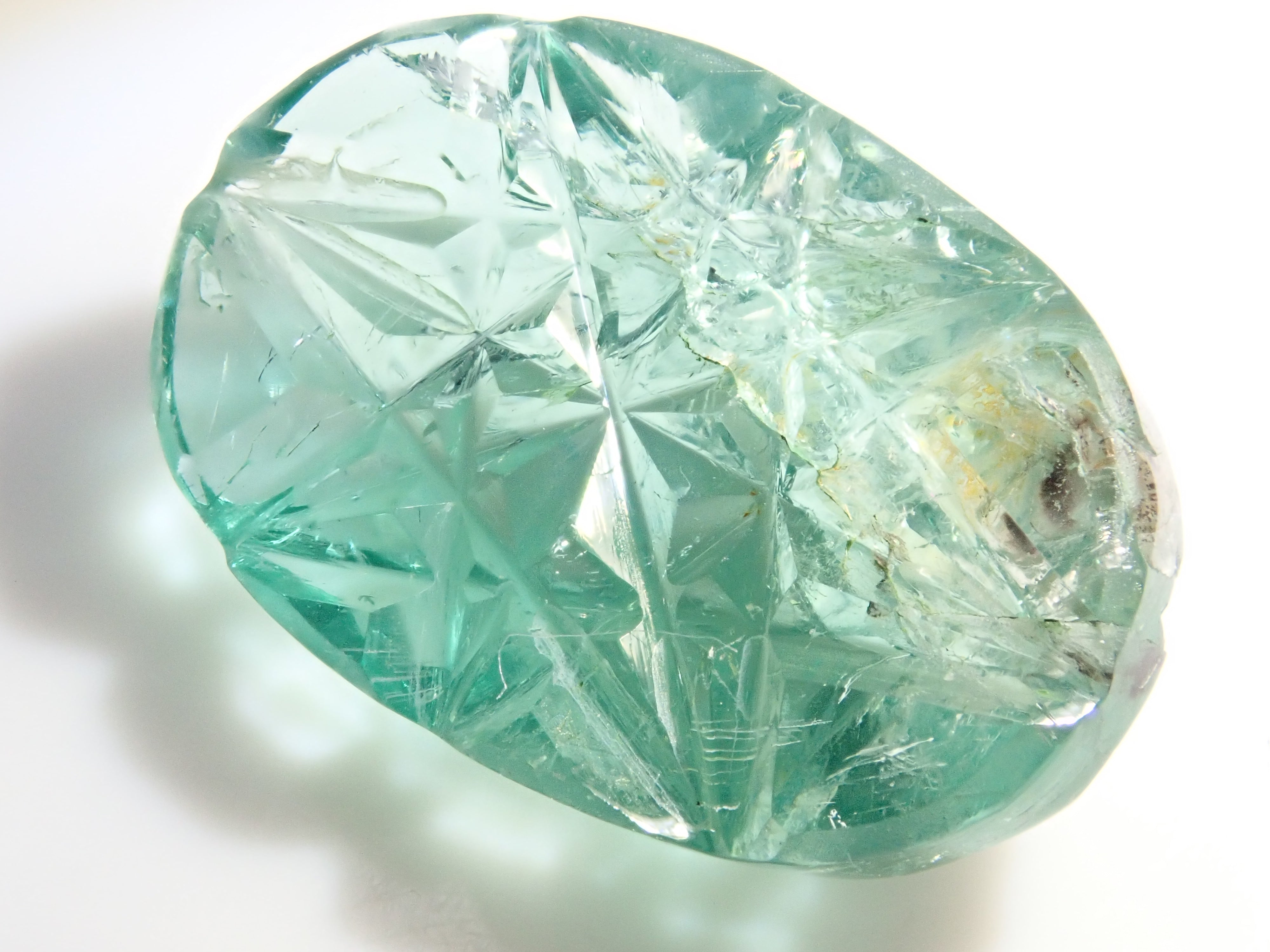 這是一塊鬆散的哥倫比亞螢石,由 Koshu Takaishi Kiriko 製作,由 Shimizu Kiseki 和 Yoichi Fukasawa 合作完成。當暴露在黑光下時,它會發出亮藍色螢光。這款甲州寶石切子切割由兩位大師創作:清水寶石的代表清水幸雄和珠寶工藝深澤的代表深澤洋一。清水先生負責刻面,深澤先生負責刻面。