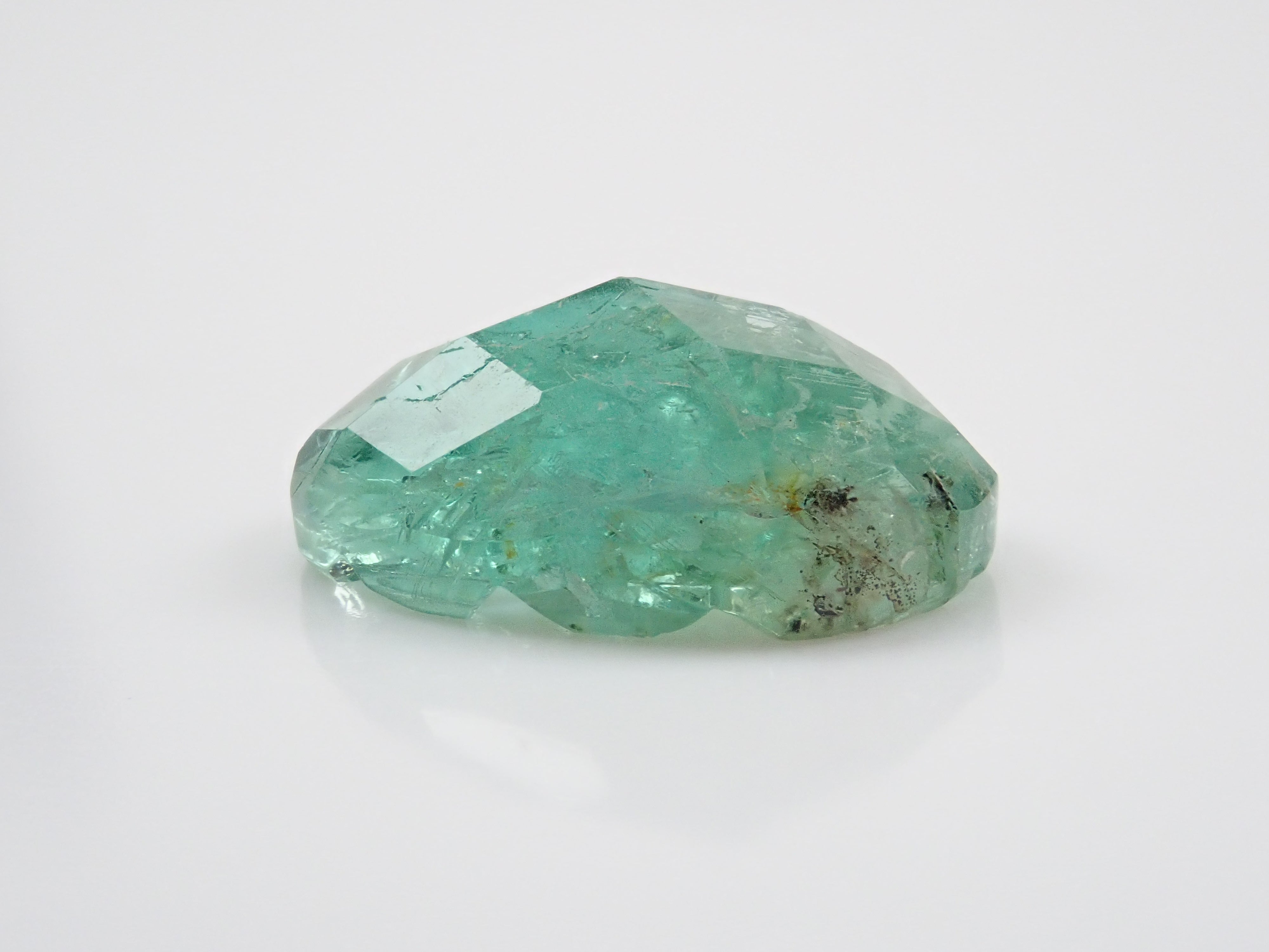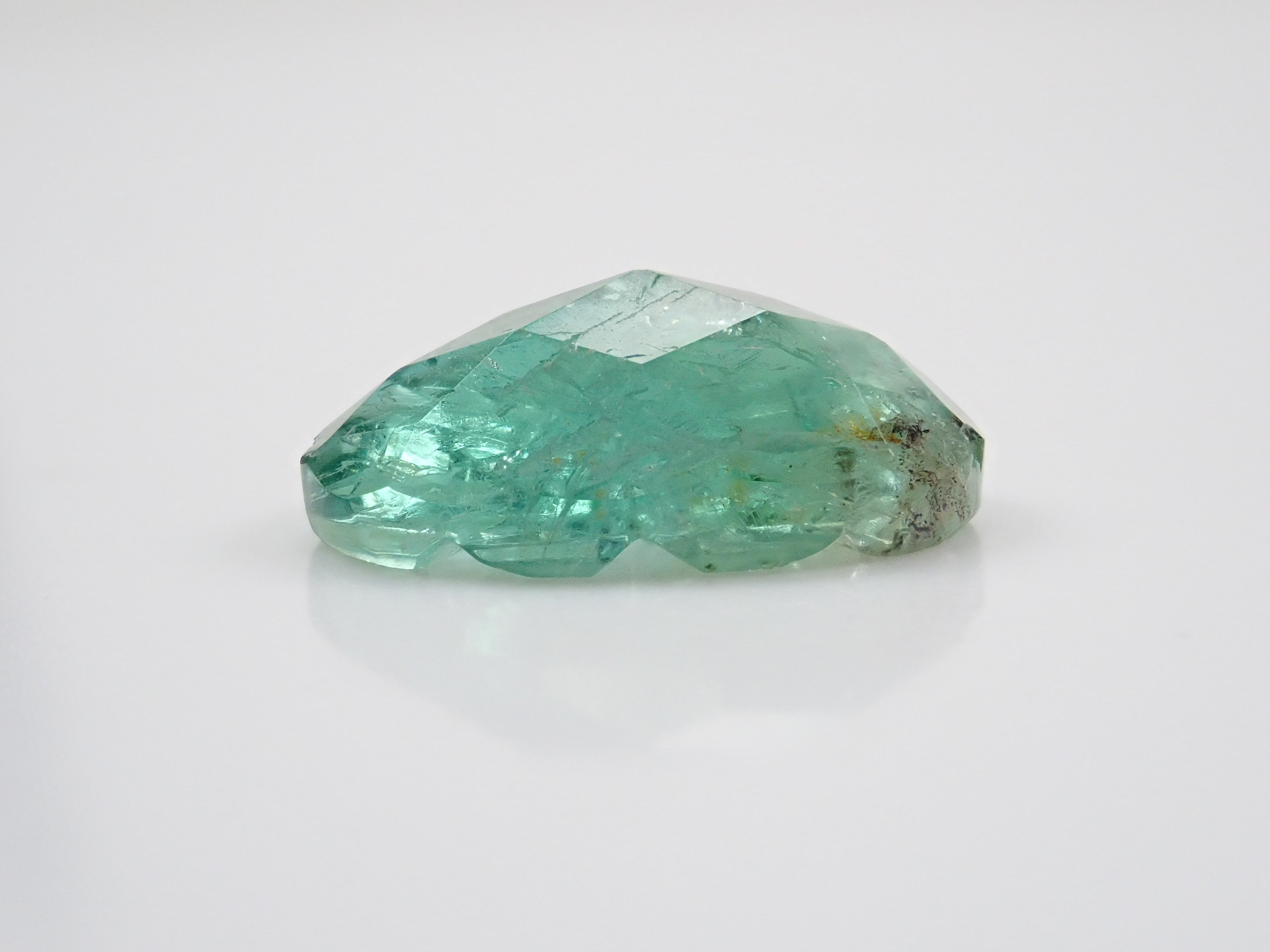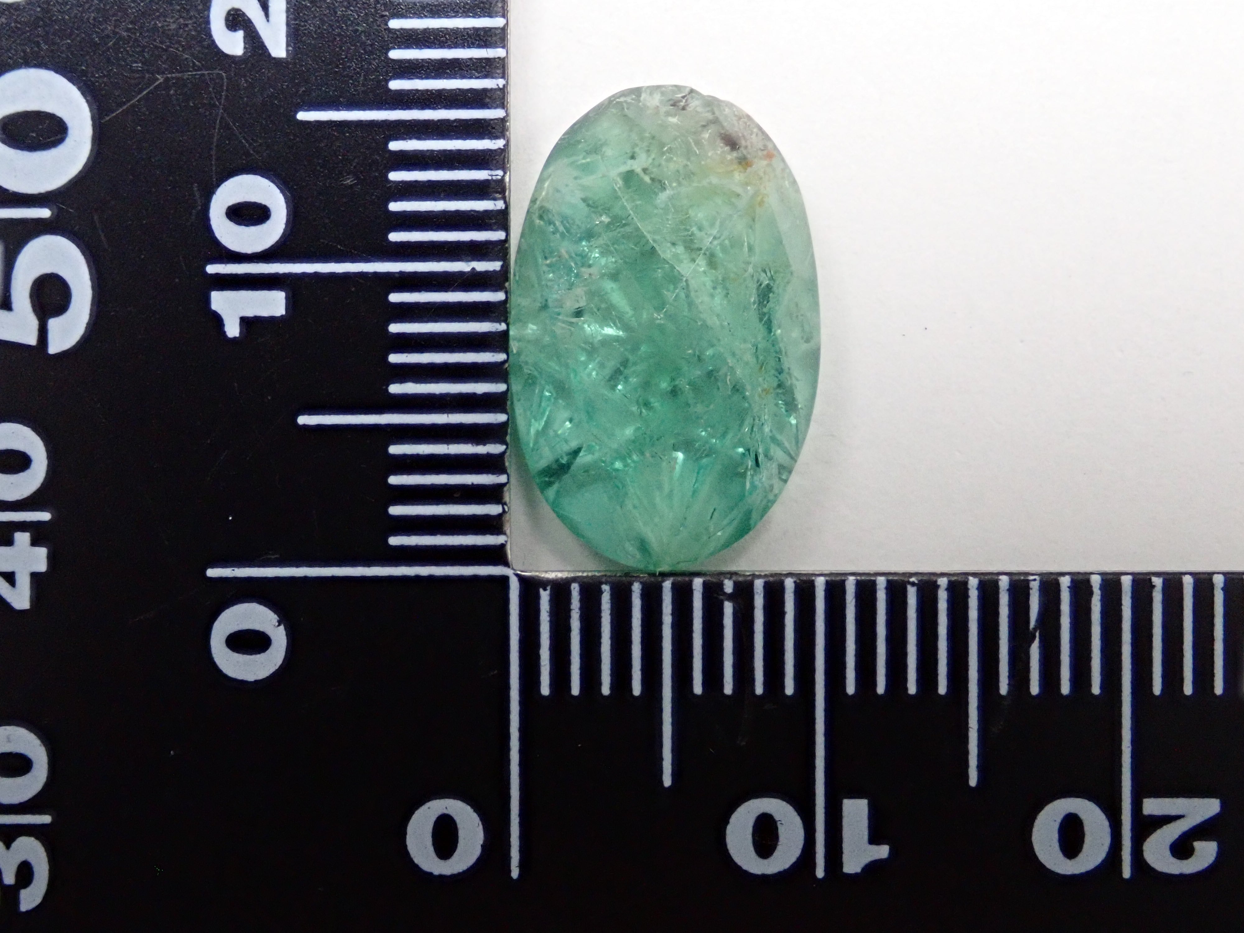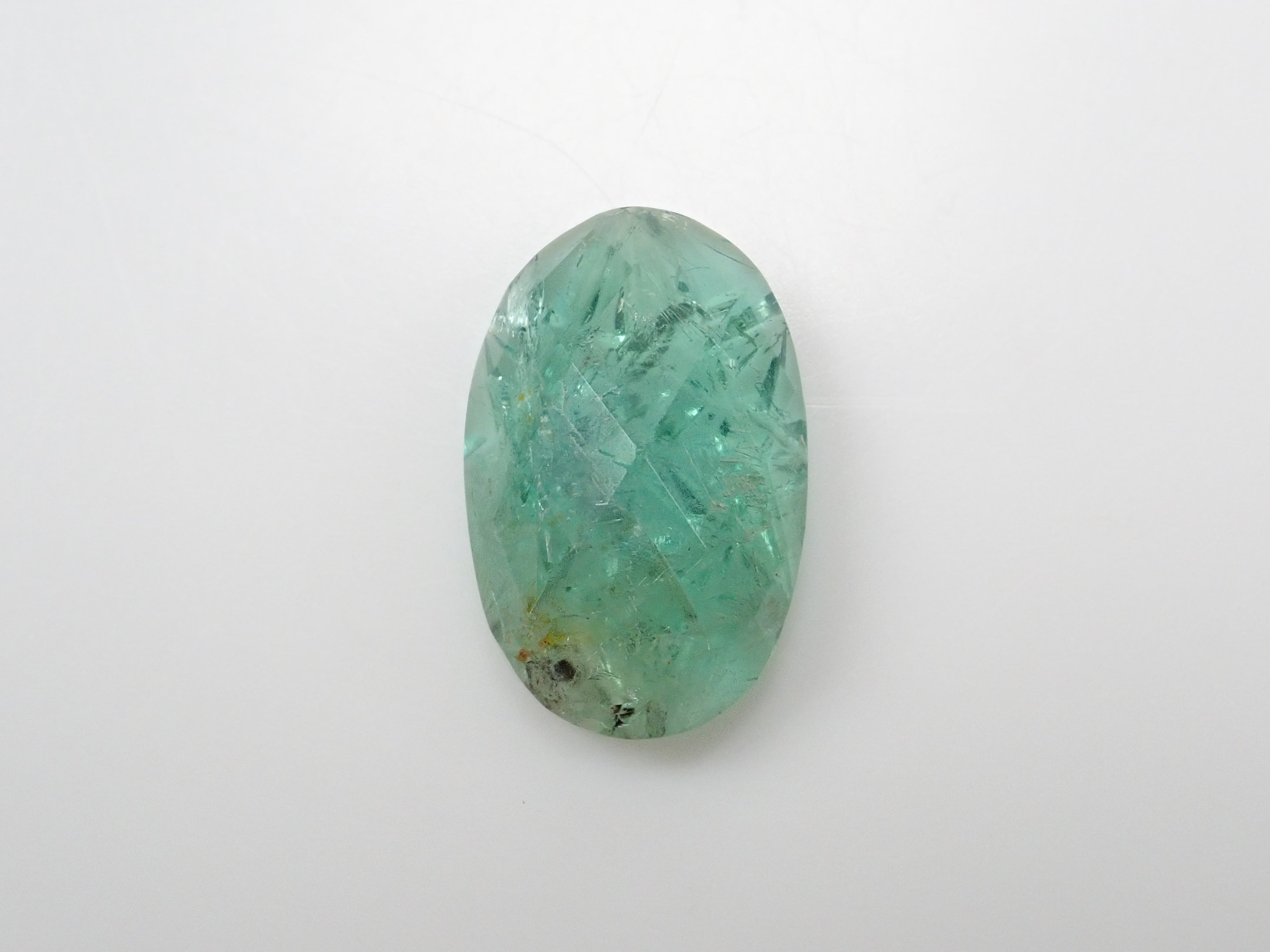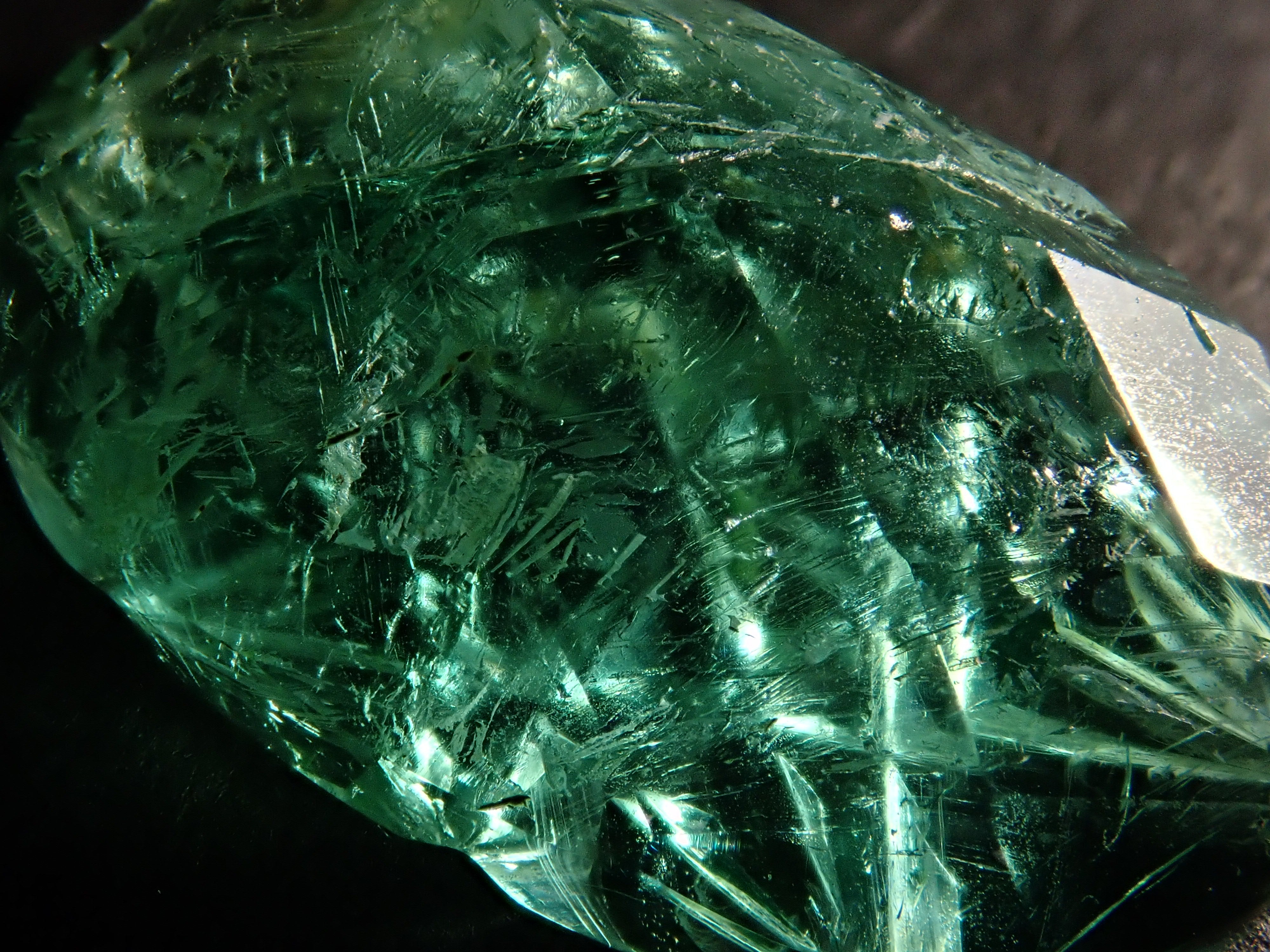 這是一塊鬆散的哥倫比亞螢石,由 Koshu Takaishi Kiriko 製作,由 Shimizu Kiseki 和 Yoichi Fukasawa 合作完成。當暴露在黑光下時,它會發出亮藍色螢光。這款甲州寶石切子切割由兩位大師創作:清水寶石的代表清水幸雄和珠寶工藝深澤的代表深澤洋一。清水先生負責刻面,深澤先生負責刻面。