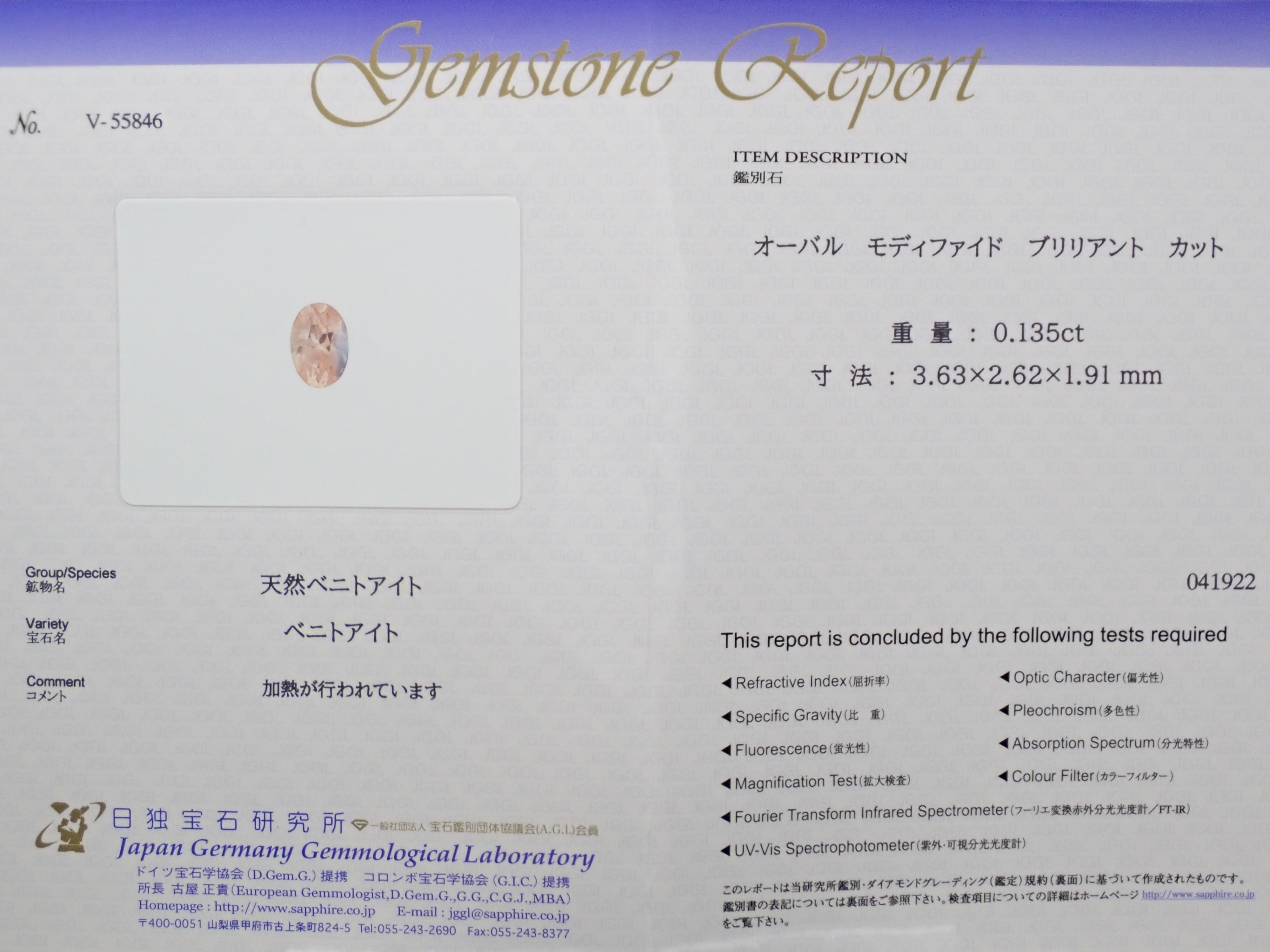 藍錐礦據說是美國三大稀有寶石之一。它是一種充滿寶石魅力的石頭,擁有鑽石般的強烈光澤和藍寶石般美麗的藍色。據說是1900年代在加州聖貝尼托河附近發現的,其特徵是光色散力強。顏色也稱為桃色藍錐礦,在藍錐礦中很少見。藍錐礦通常以其藍色而聞名,但這種藍錐礦是無色的,並且經過了熱處理。由於它在加熱過程中不太可能破裂或變成桃色,因此供應量較少,並且通常比藍色更有價值。即使在桃色系中,也能享受到淡淡的藍色調,這也是一種罕見的寬鬆單品。當暴露在黑光下時它會發出螢光。附有日德寶石研究所頒發的鑑定證書。