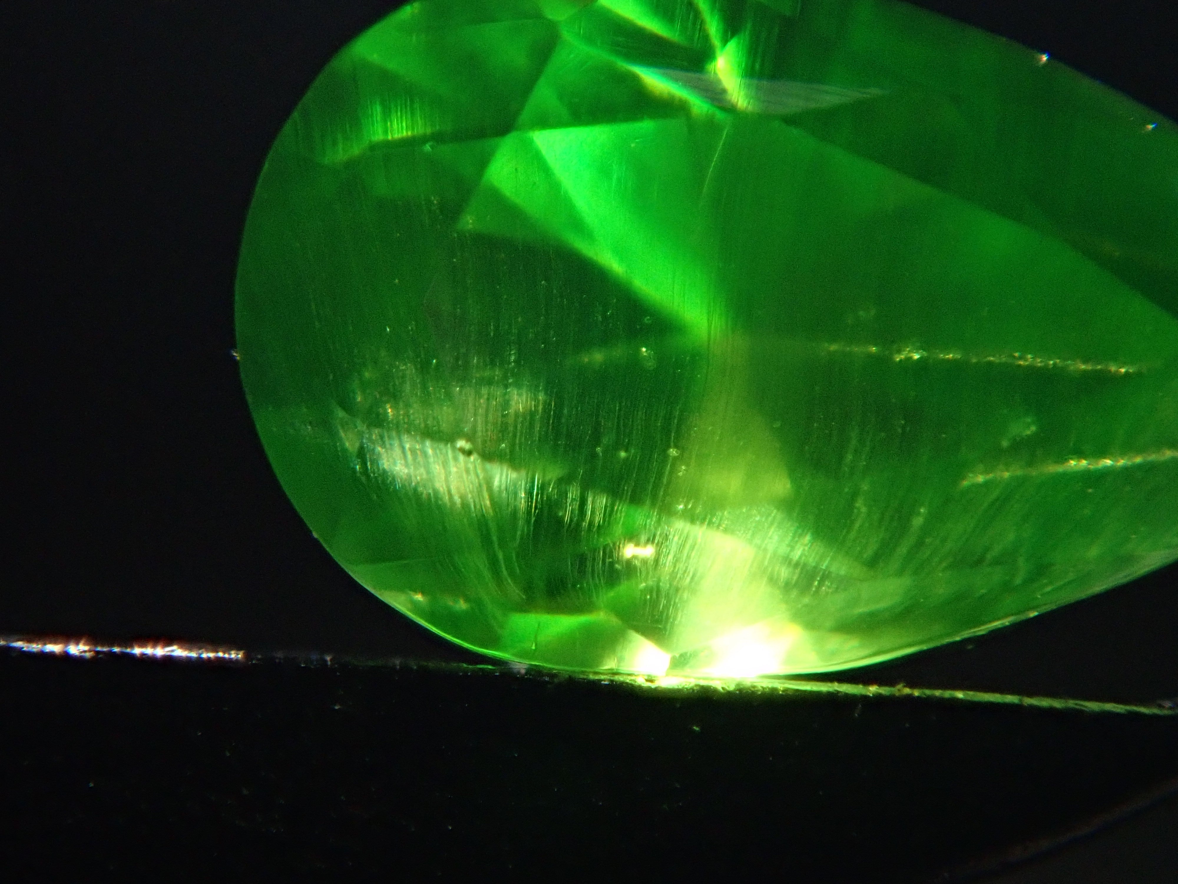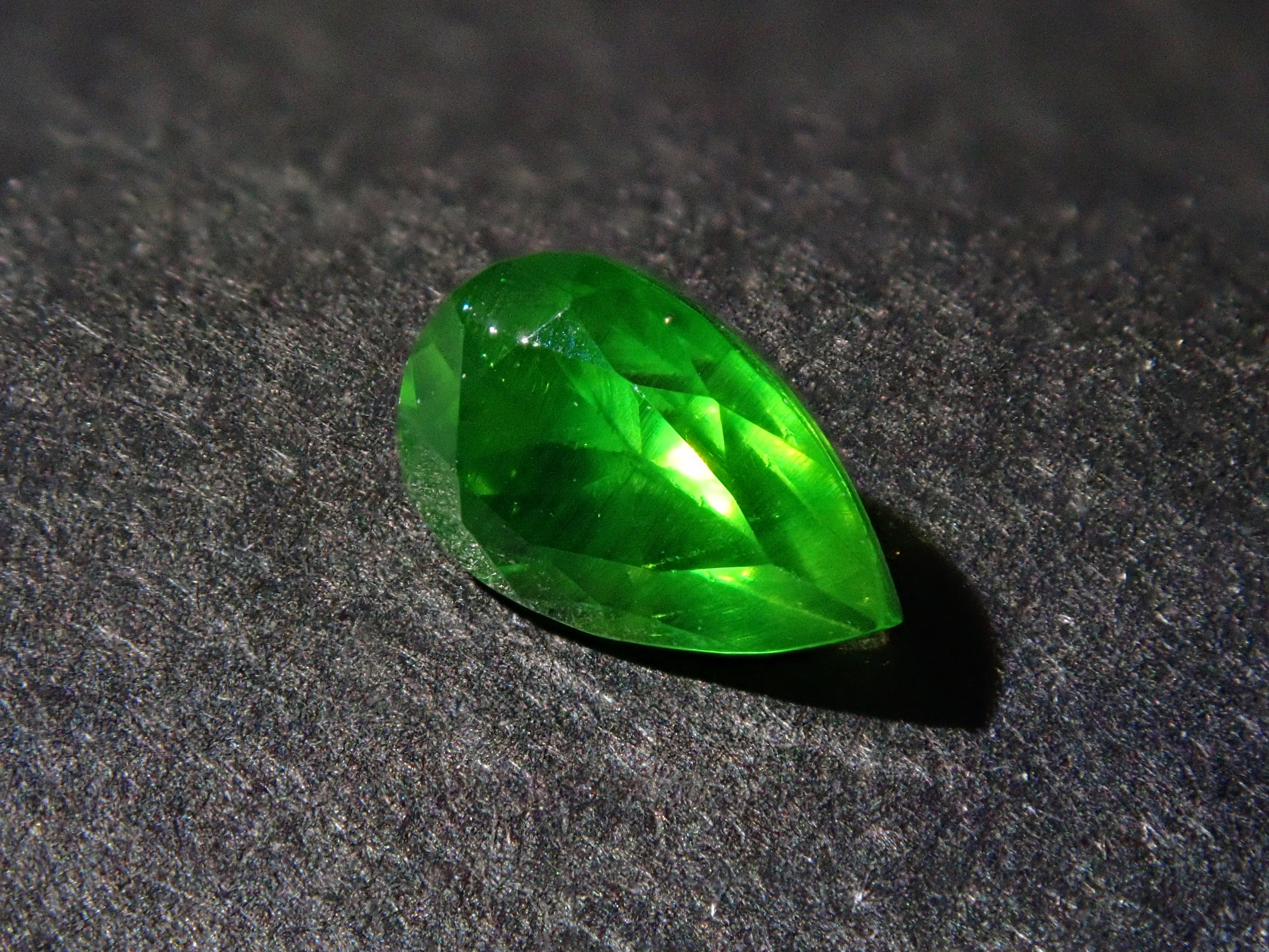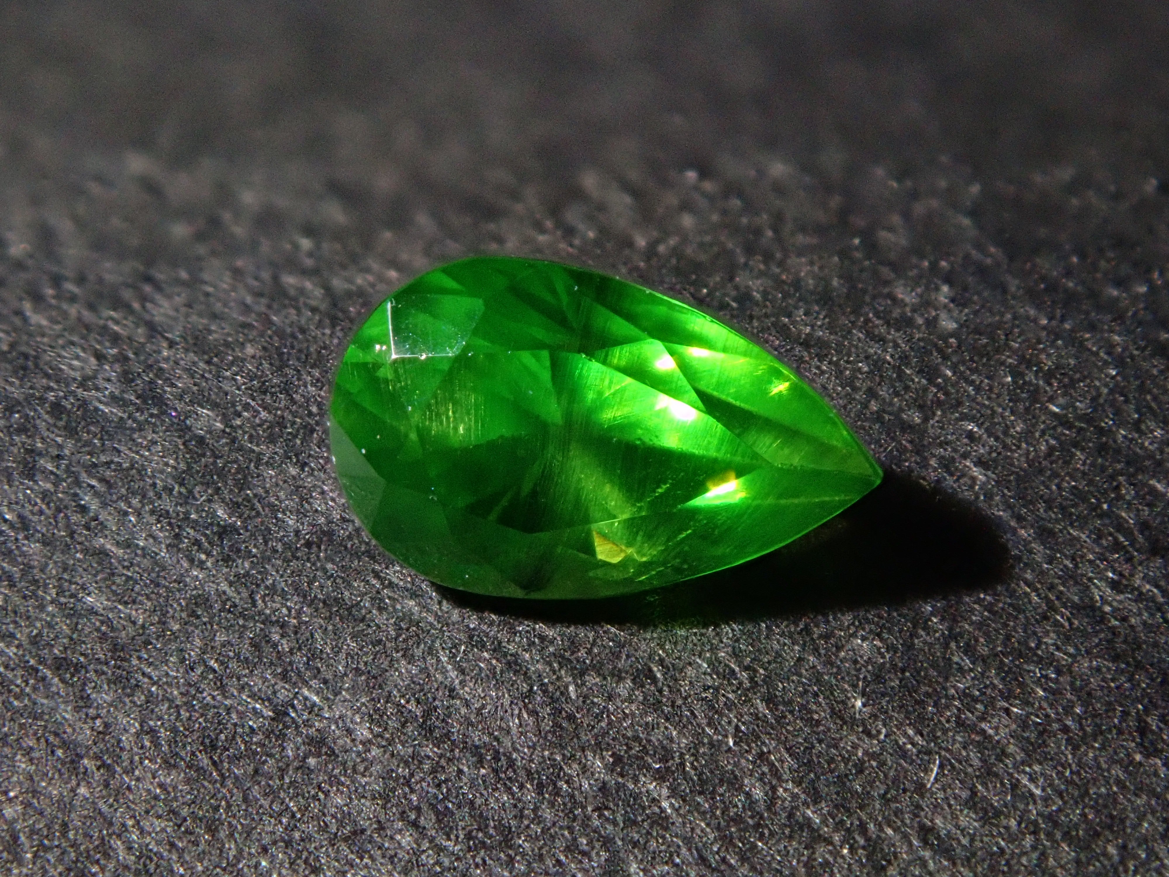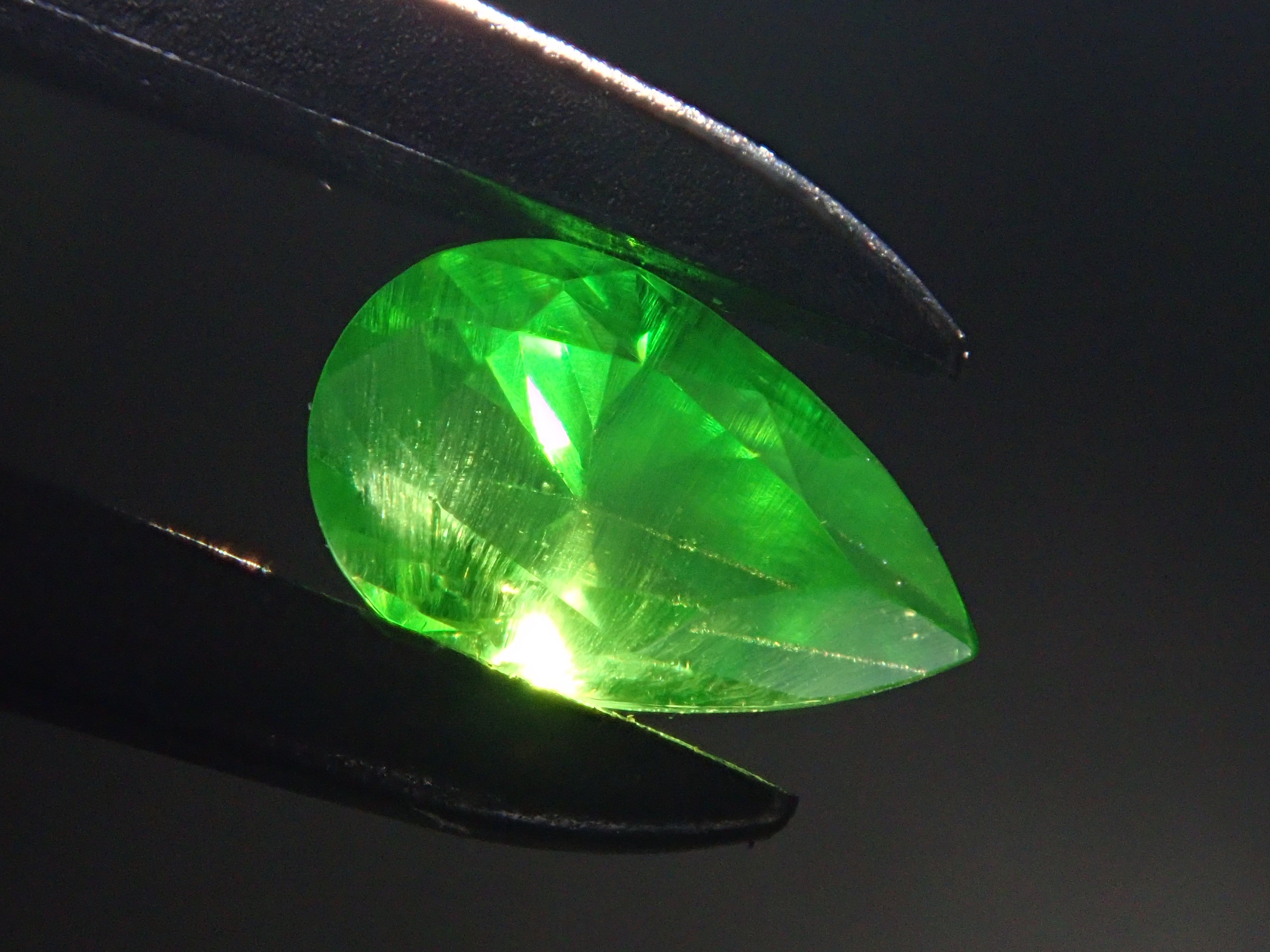 來自俄羅斯的深色翠榴石。這是一顆罕見的梨形切割俄羅斯翠榴石(馬尾石) 。這是一顆特別美麗、高品質的馬尾石裸石。