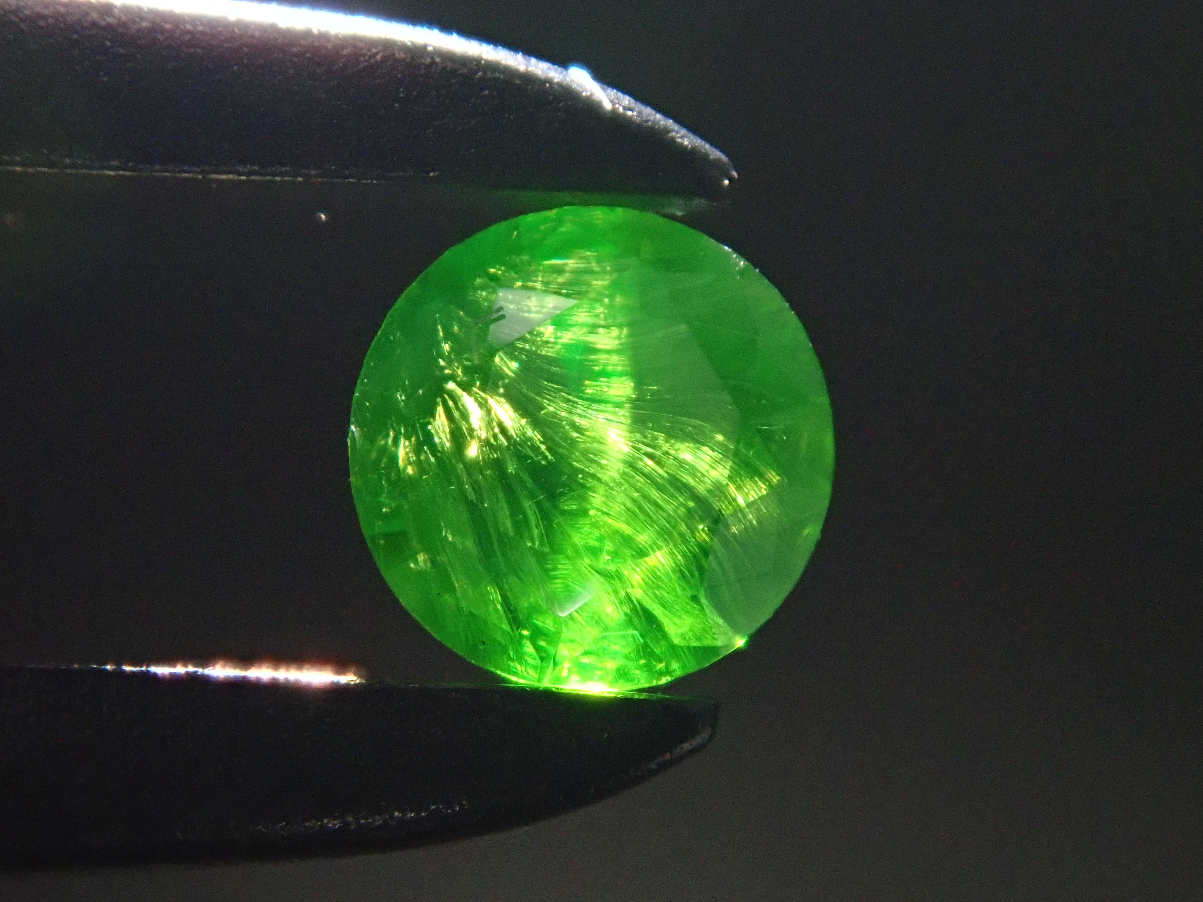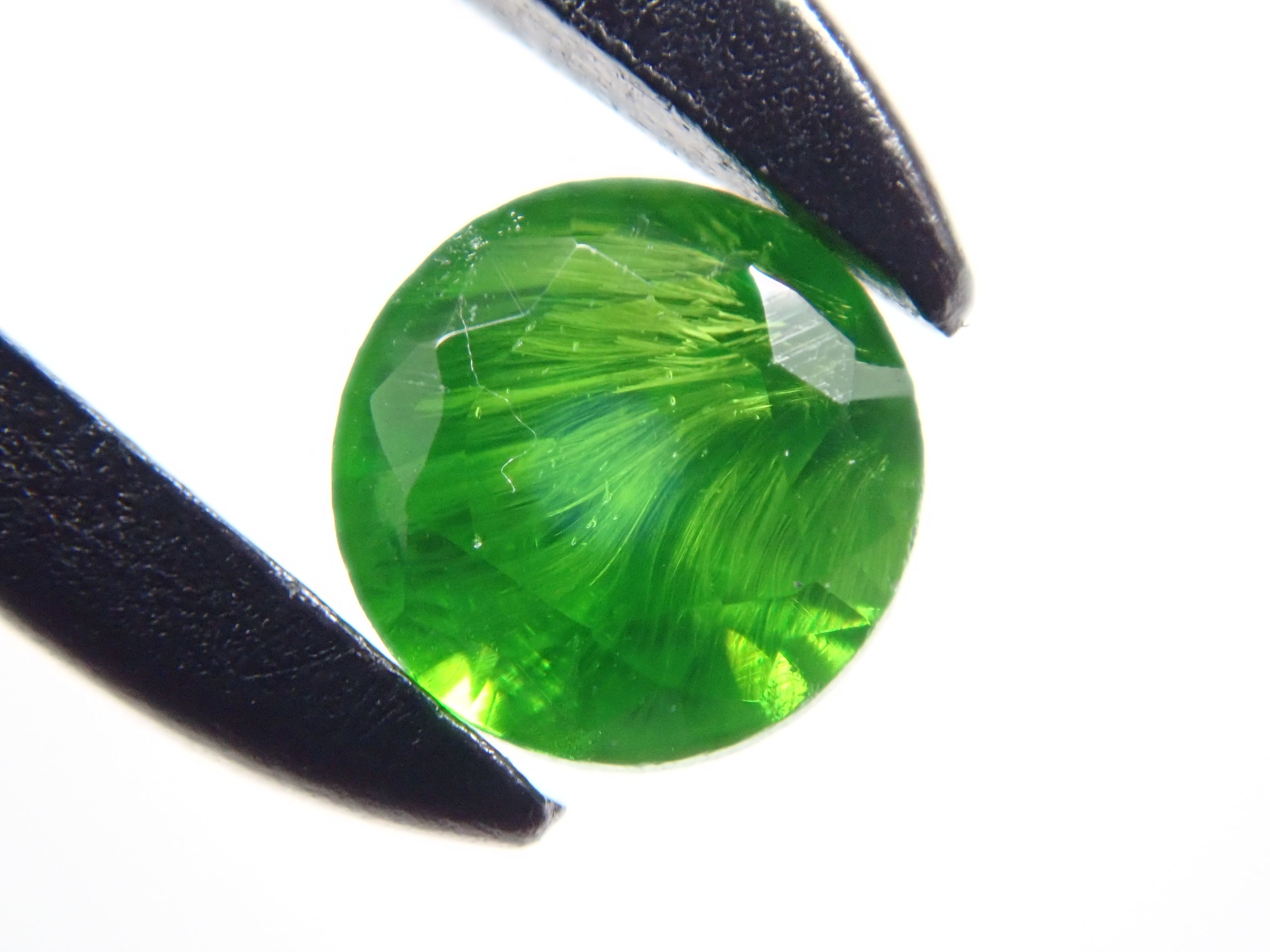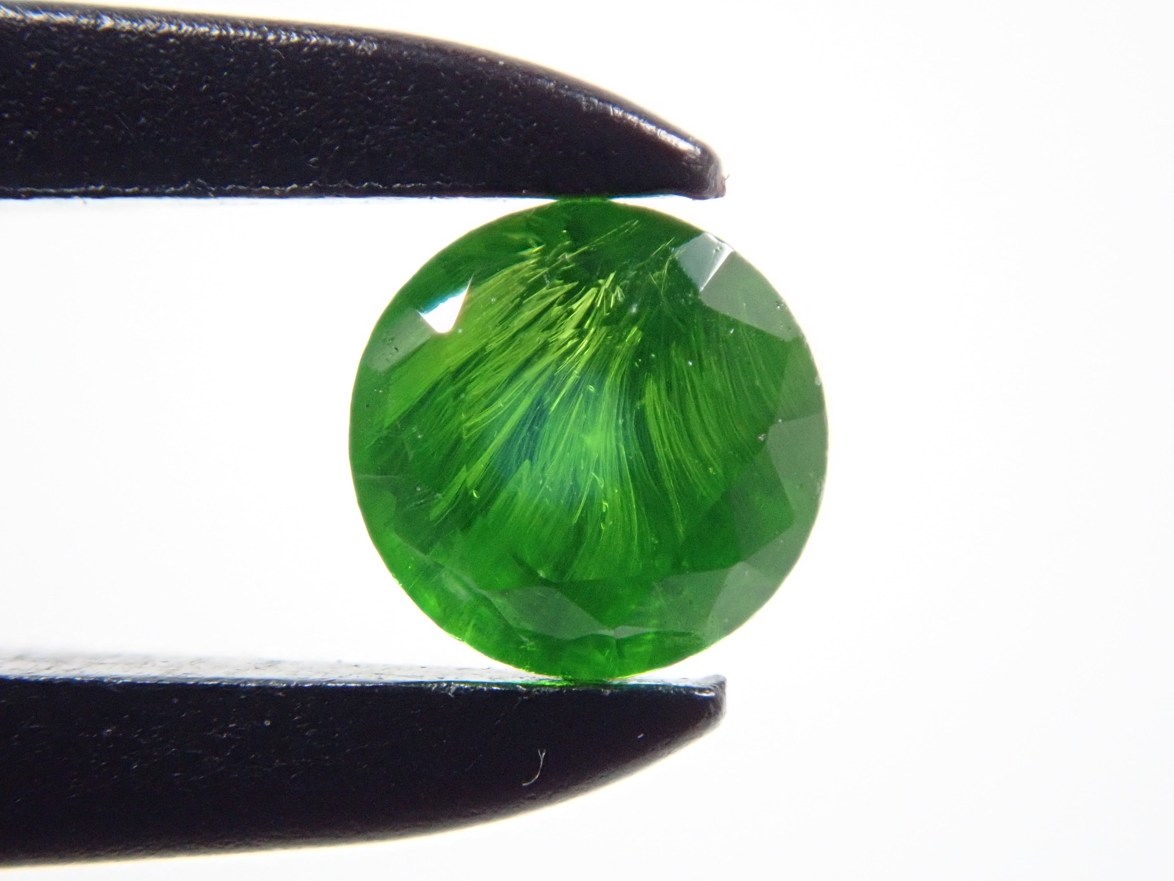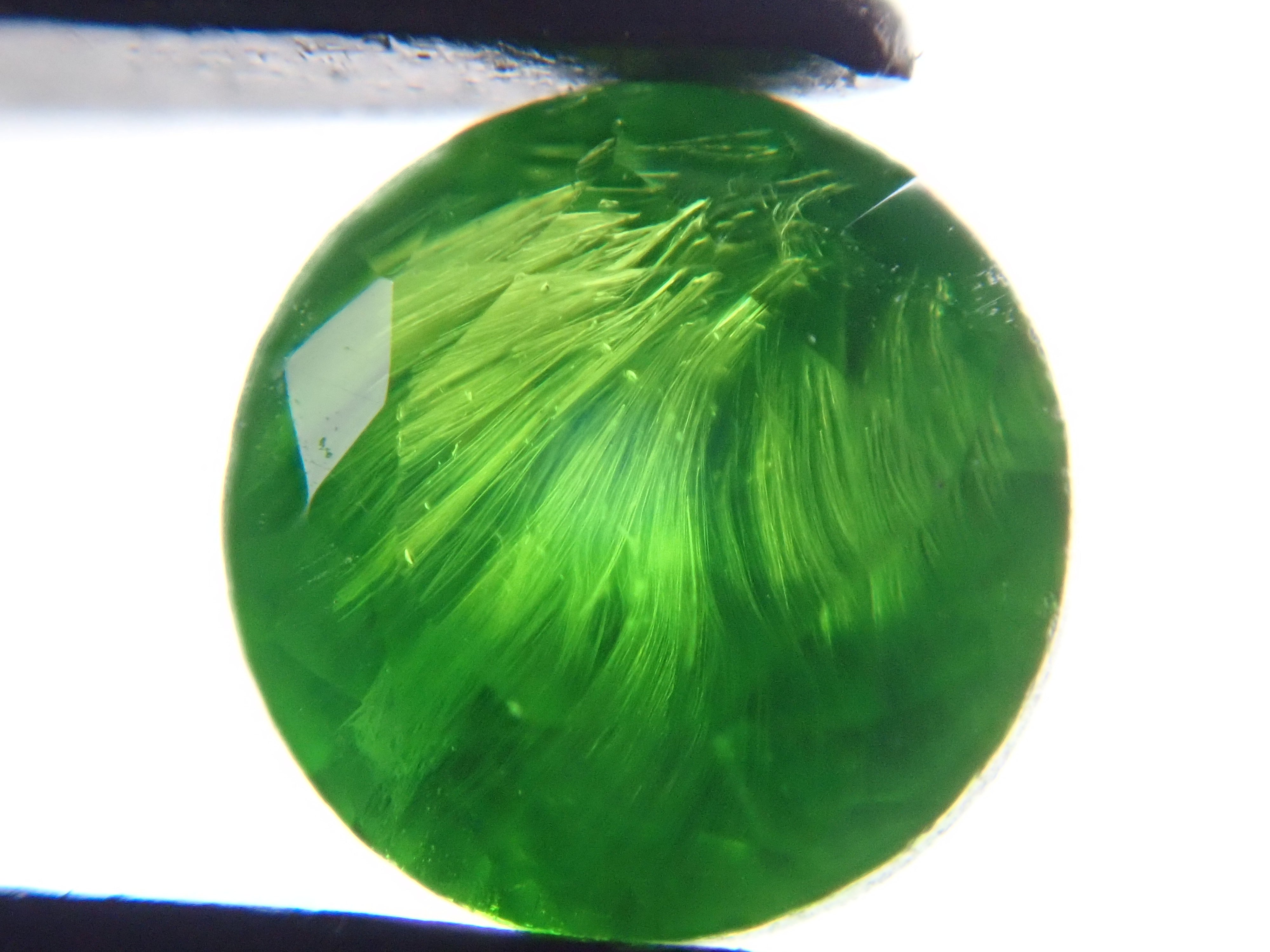 石榴石具有強烈的光色散和強烈的閃光。其中,這顆綠色的「濃綠榴石」是一種特別美麗且稀有的石榴石。這種類型稱為“馬尾”,內含物看起來像馬尾。馬尾的存在或不存在已透過顯微鏡檢查來確認。這是來自俄羅斯的稀有產品。 直徑3毫米的俄羅斯濃綠榴石,顏色深邃,讓您欣賞馬尾。