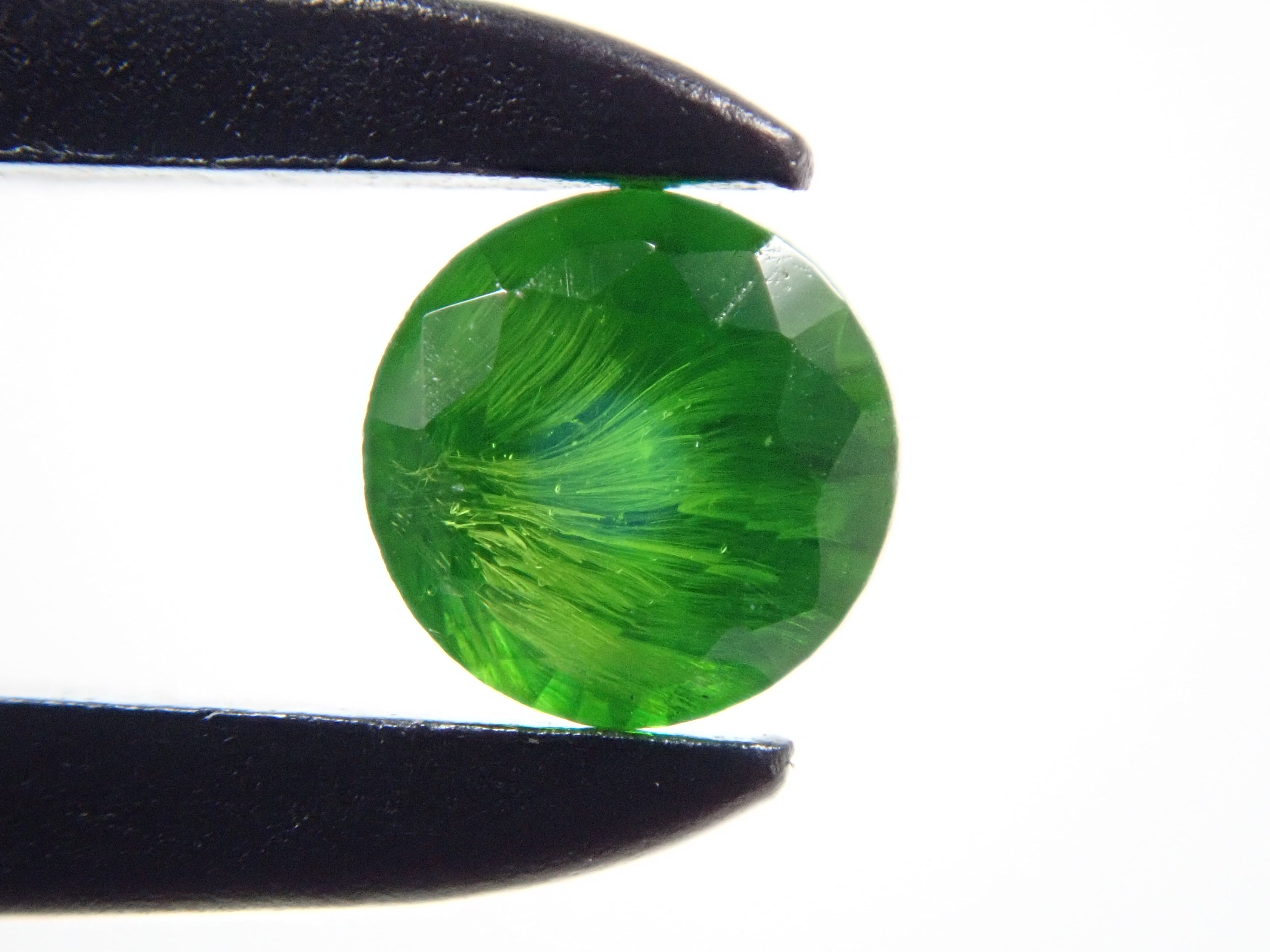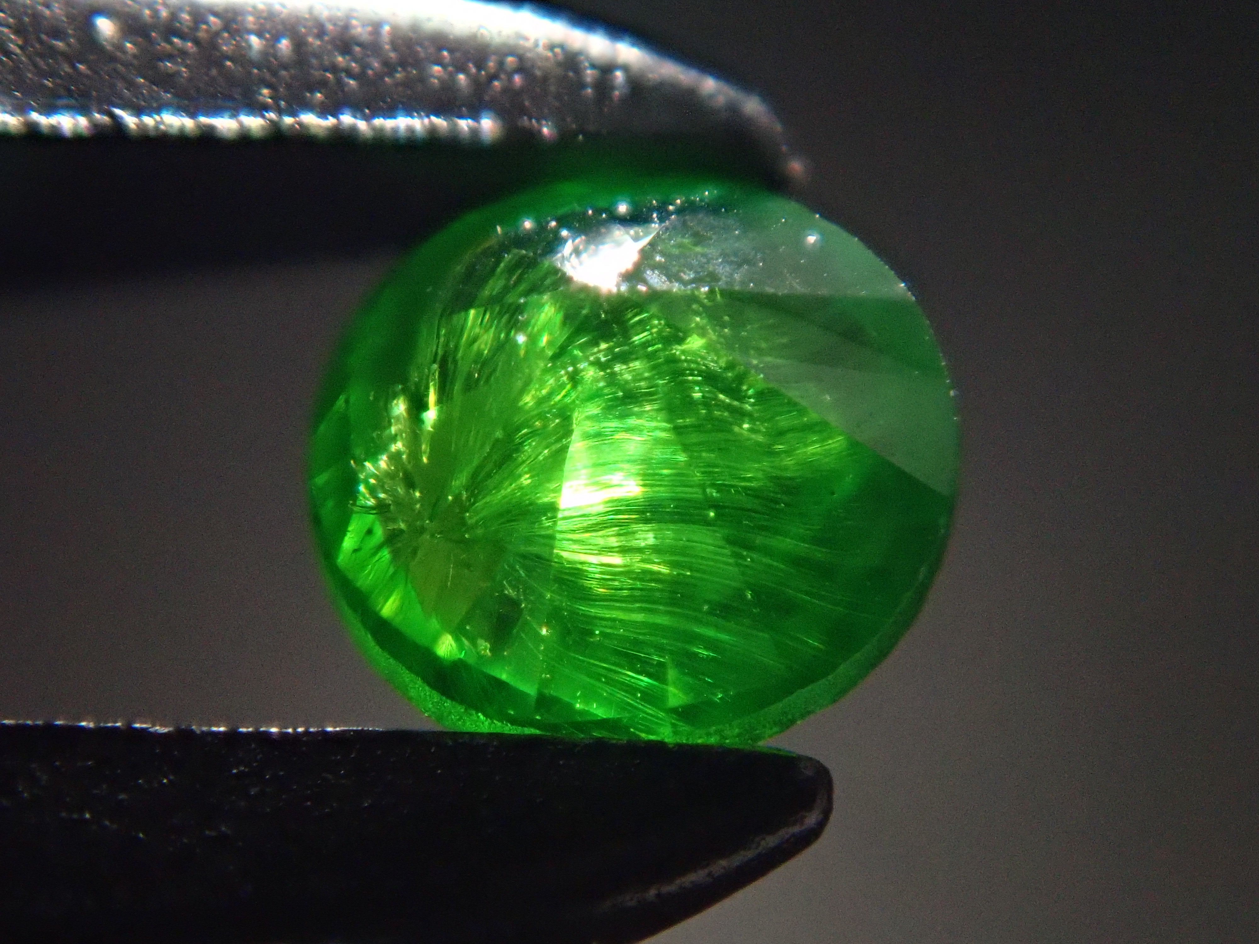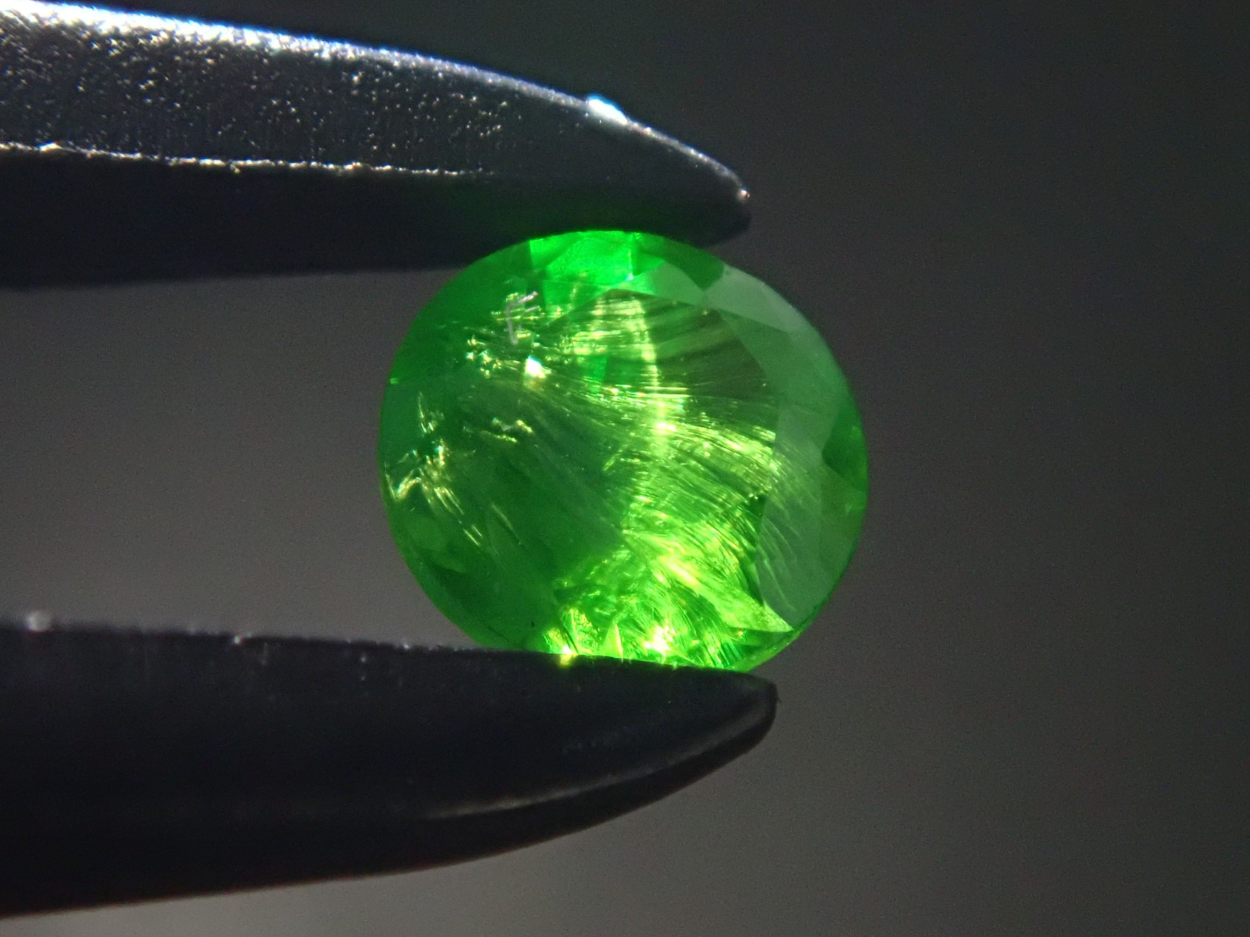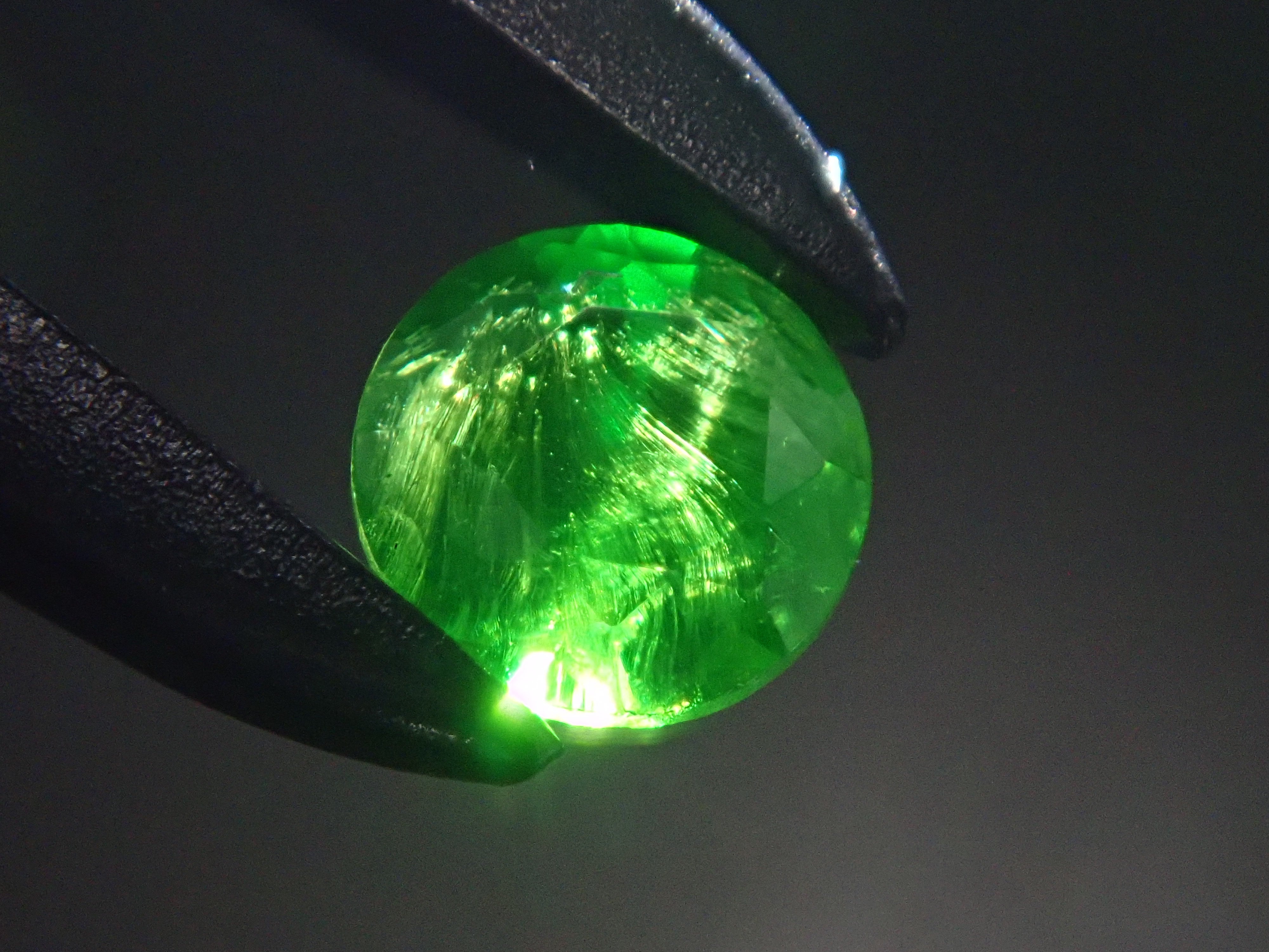 石榴石具有強烈的光色散和強烈的閃光。其中,這顆綠色的「濃綠榴石」是一種特別美麗且稀有的石榴石。這種類型稱為“馬尾”,內含物看起來像馬尾。馬尾的存在或不存在已透過顯微鏡檢查來確認。這是來自俄羅斯的稀有產品。 直徑3毫米的俄羅斯濃綠榴石,顏色深邃,讓您欣賞馬尾。