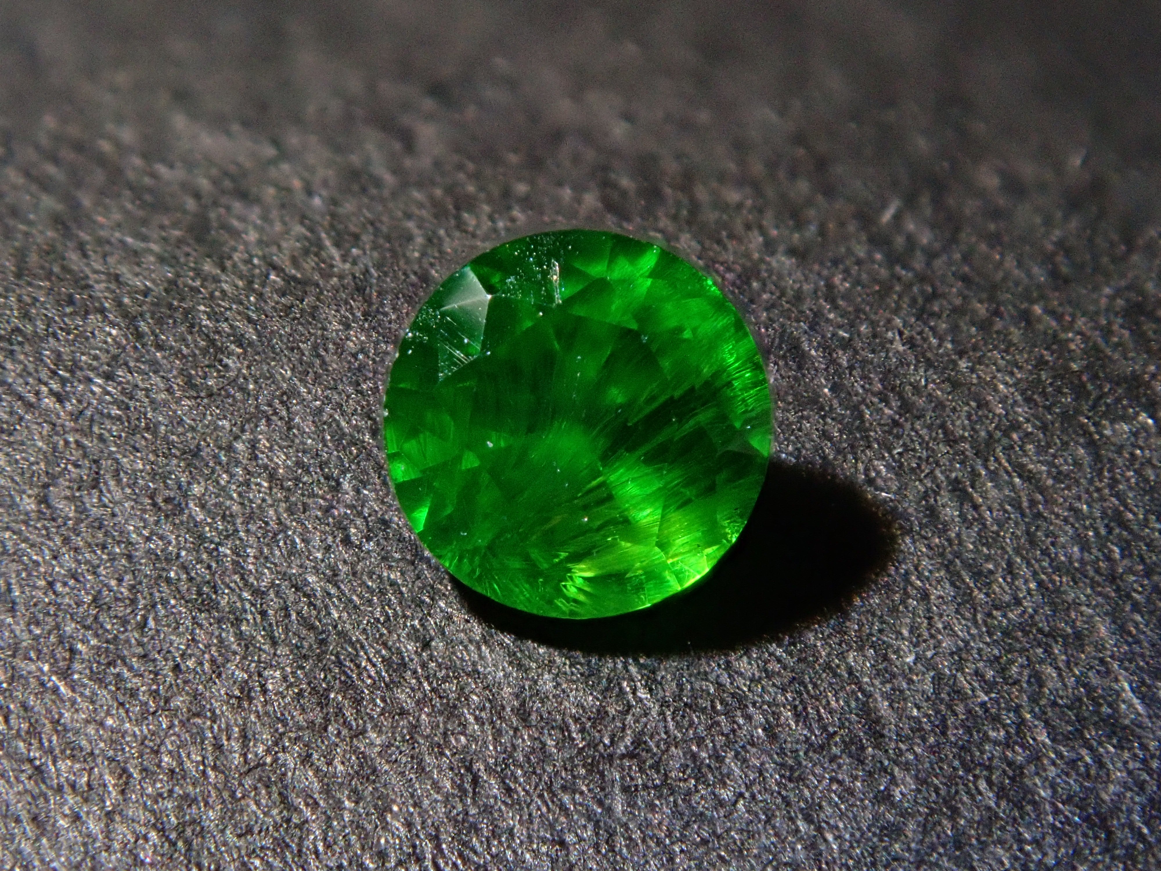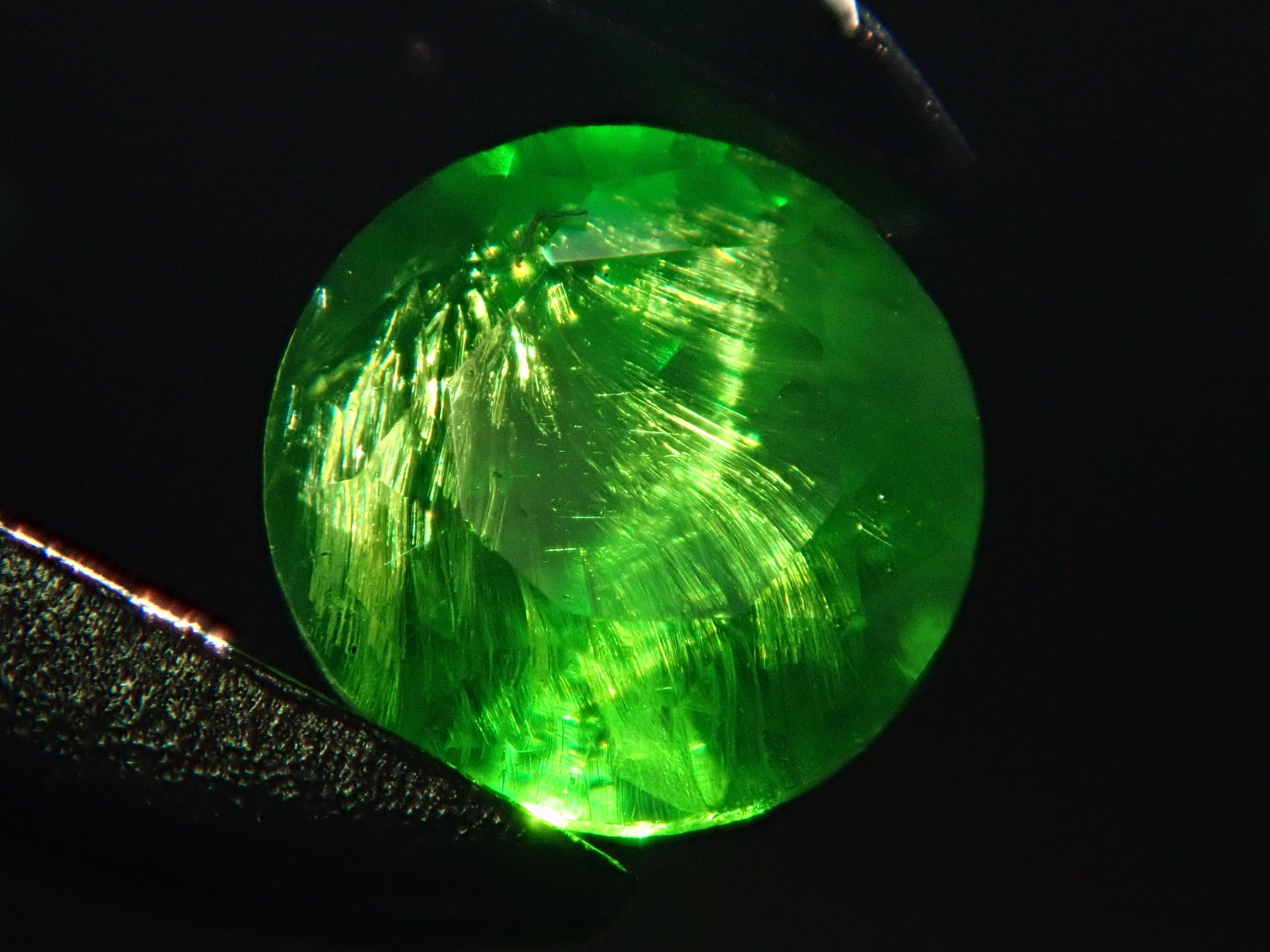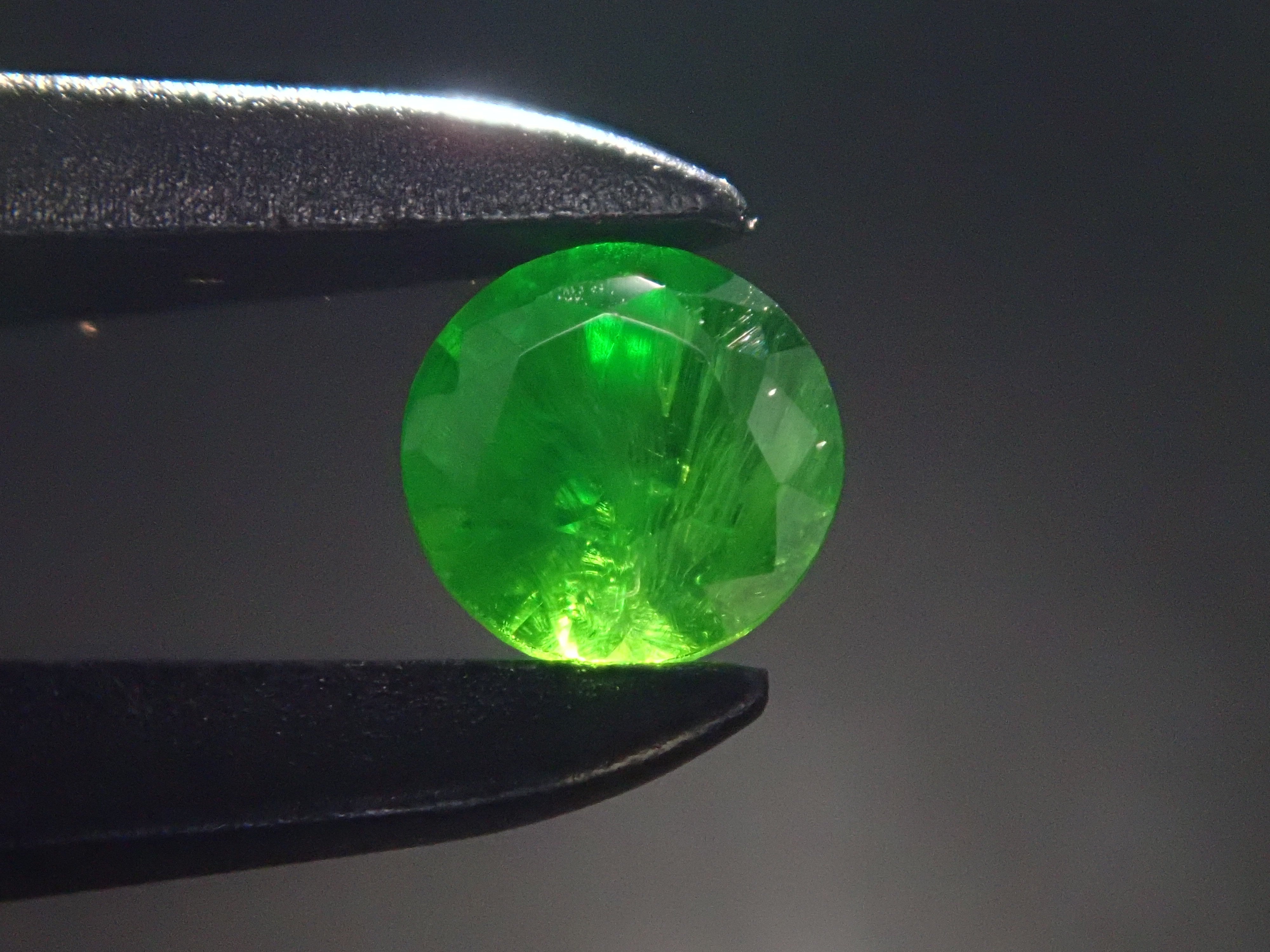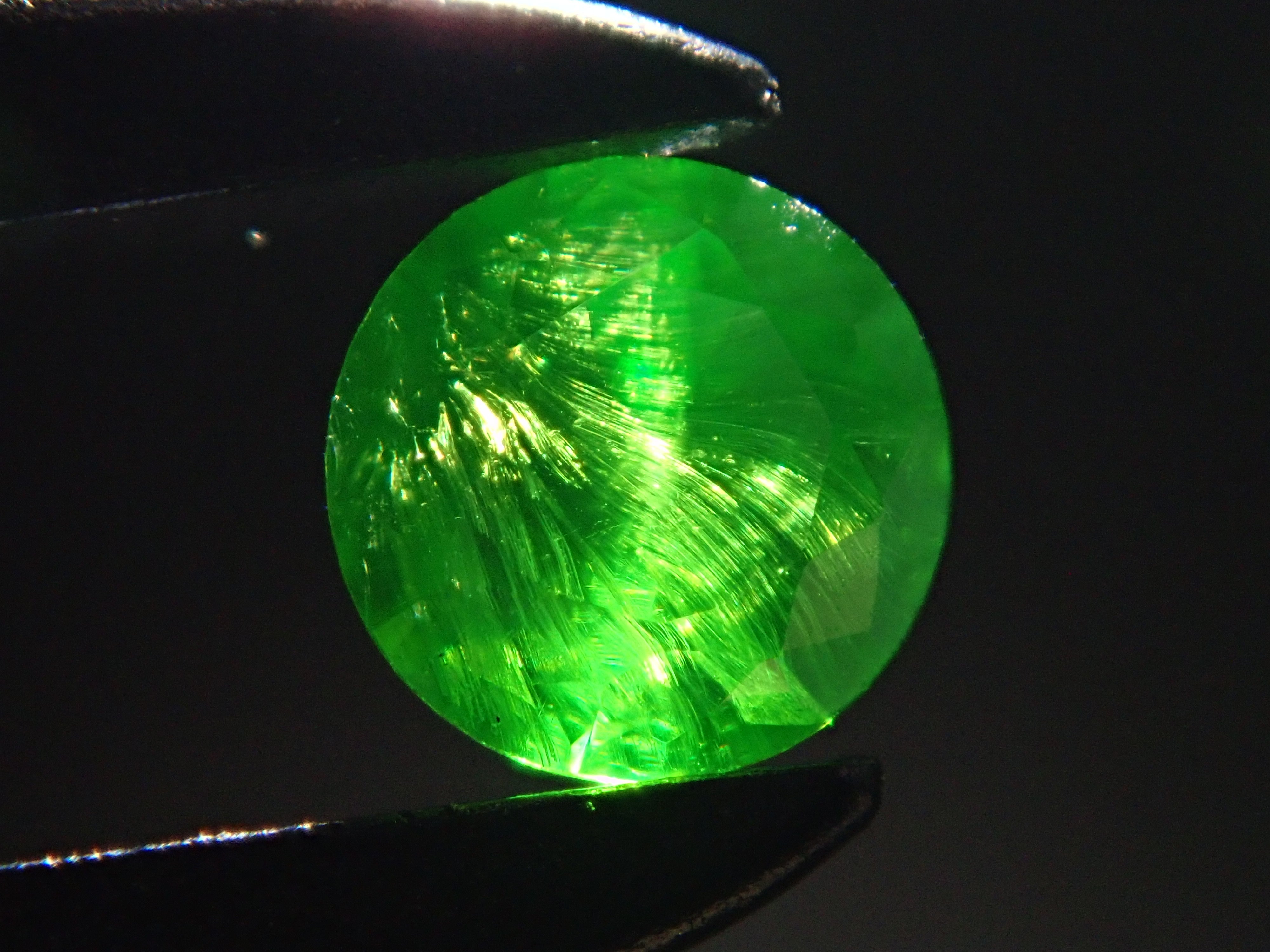石榴石具有強烈的光色散和強烈的閃光。其中,這顆綠色的「濃綠榴石」是一種特別美麗且稀有的石榴石。這種類型稱為“馬尾”,內含物看起來像馬尾。馬尾的存在或不存在已透過顯微鏡檢查來確認。這是來自俄羅斯的稀有產品。 直徑3毫米的俄羅斯濃綠榴石,顏色深邃,讓您欣賞馬尾。