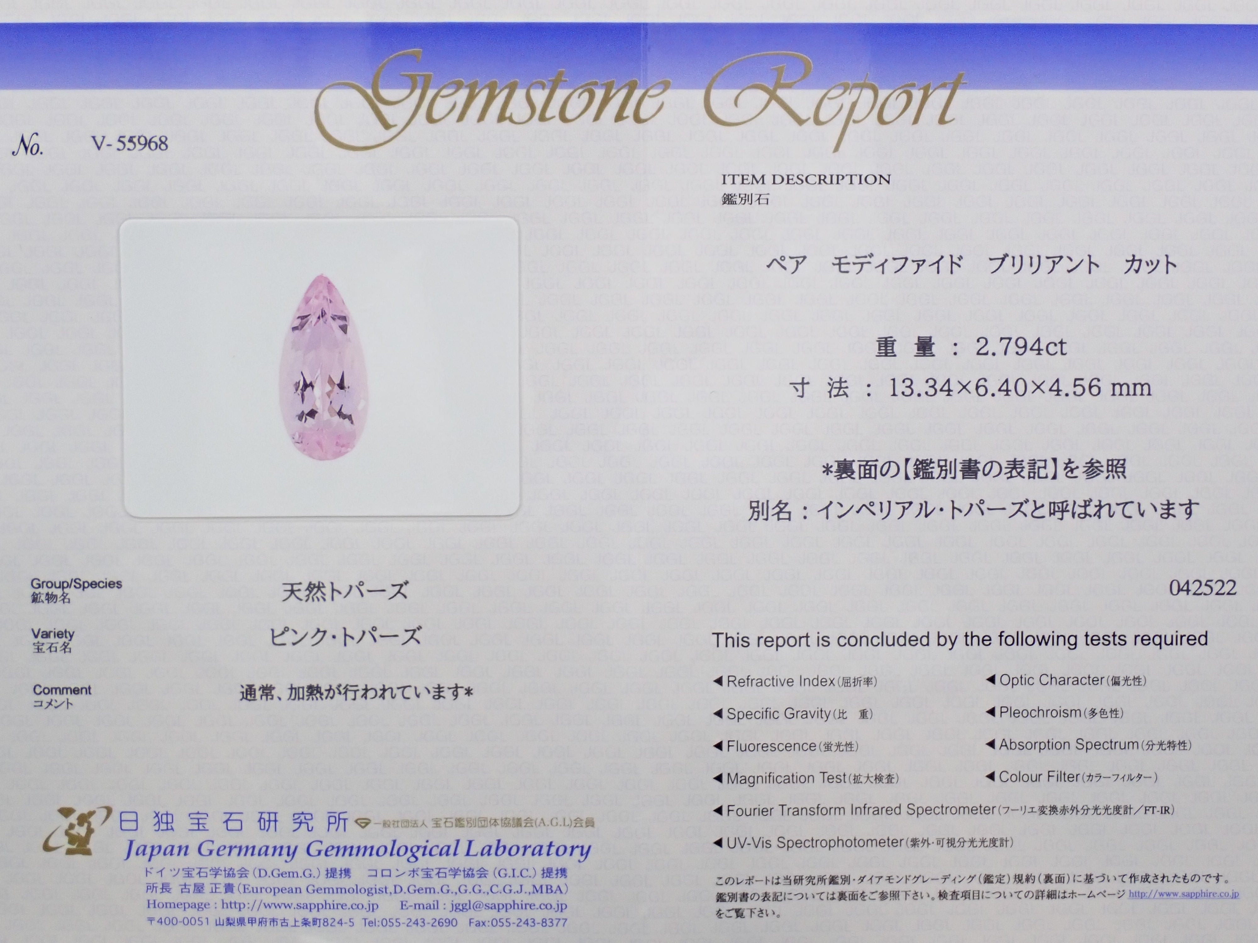 帝王托帕石被譽為托帕石中的極品。它以雪利酒般的金黃色澤而聞名,但偶爾也會發現類似這顆的粉紅色托帕石。這顆托帕石非常稀有,據說比帝王托帕石更珍貴。這顆托帕石是一顆高品質的粉紅色帝王托帕石,呈現深粉紅色。它附有日德寶石學院的鑑定證書。
