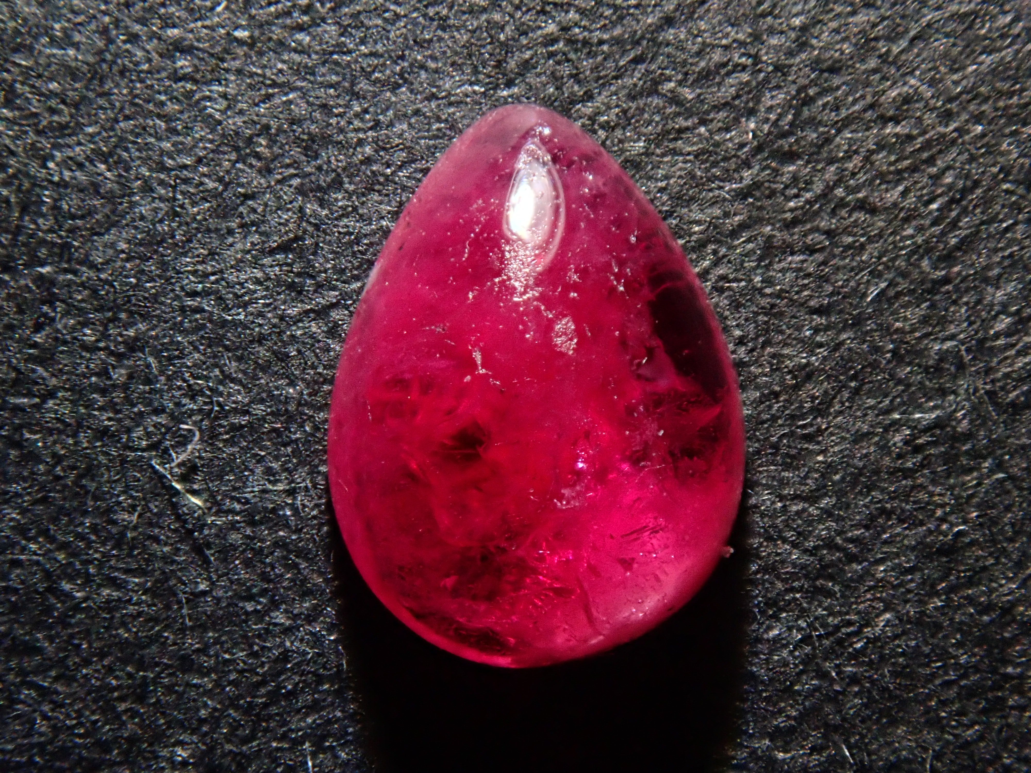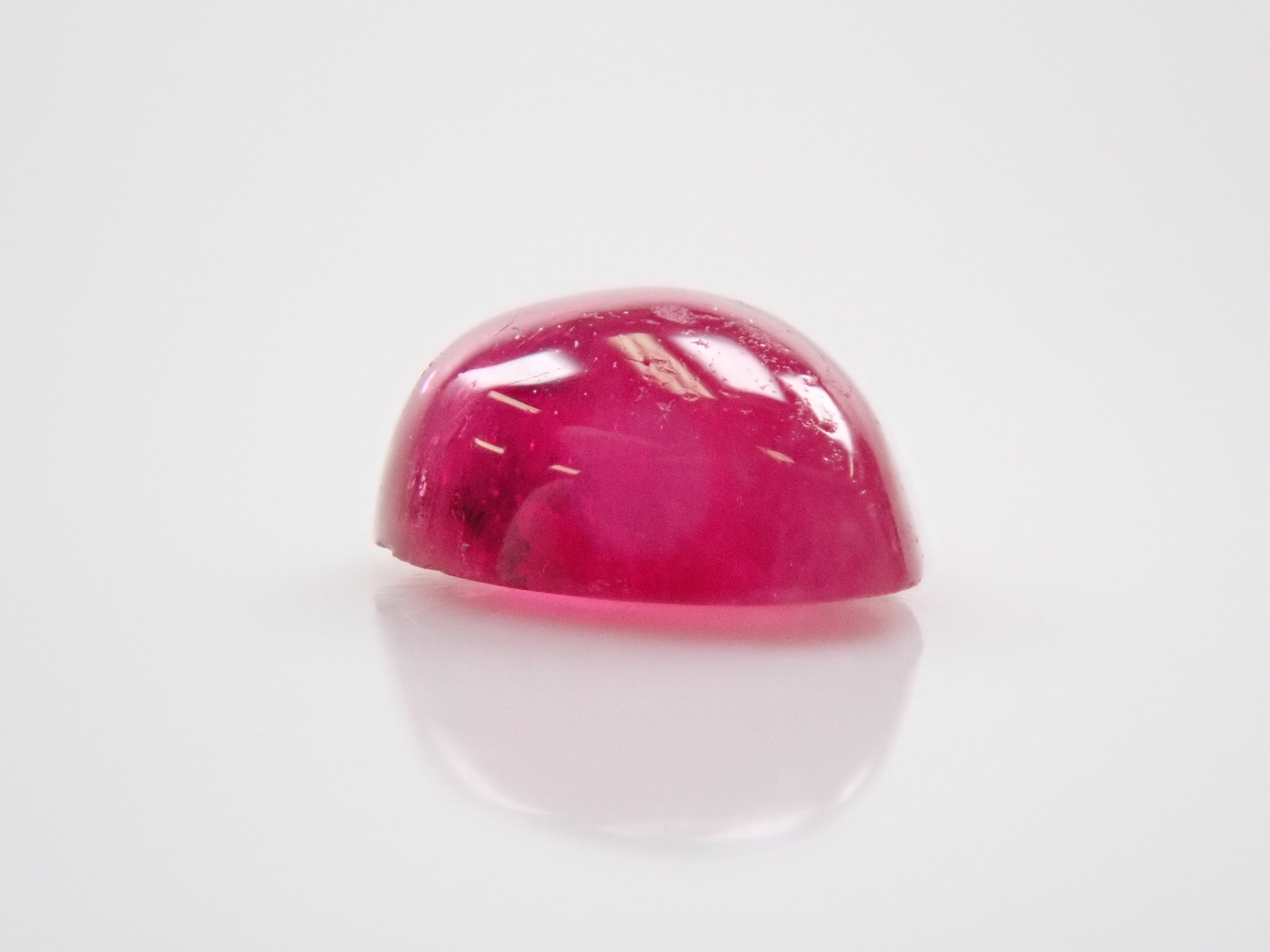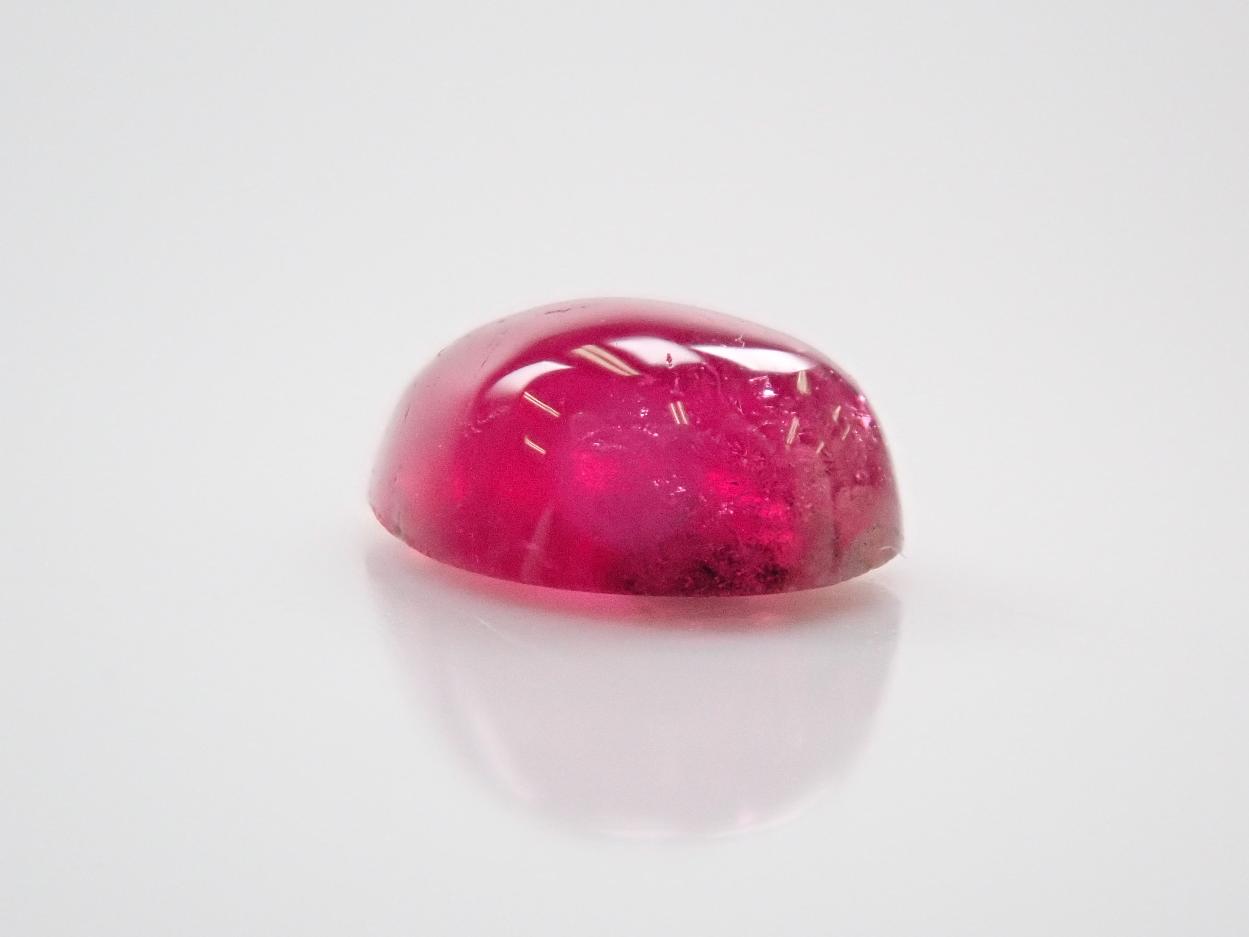 這是一種鬆散的梨形凸圓面切工,在紅色綠柱石中極為罕見。紅色綠柱石下面的白色物質是主岩。