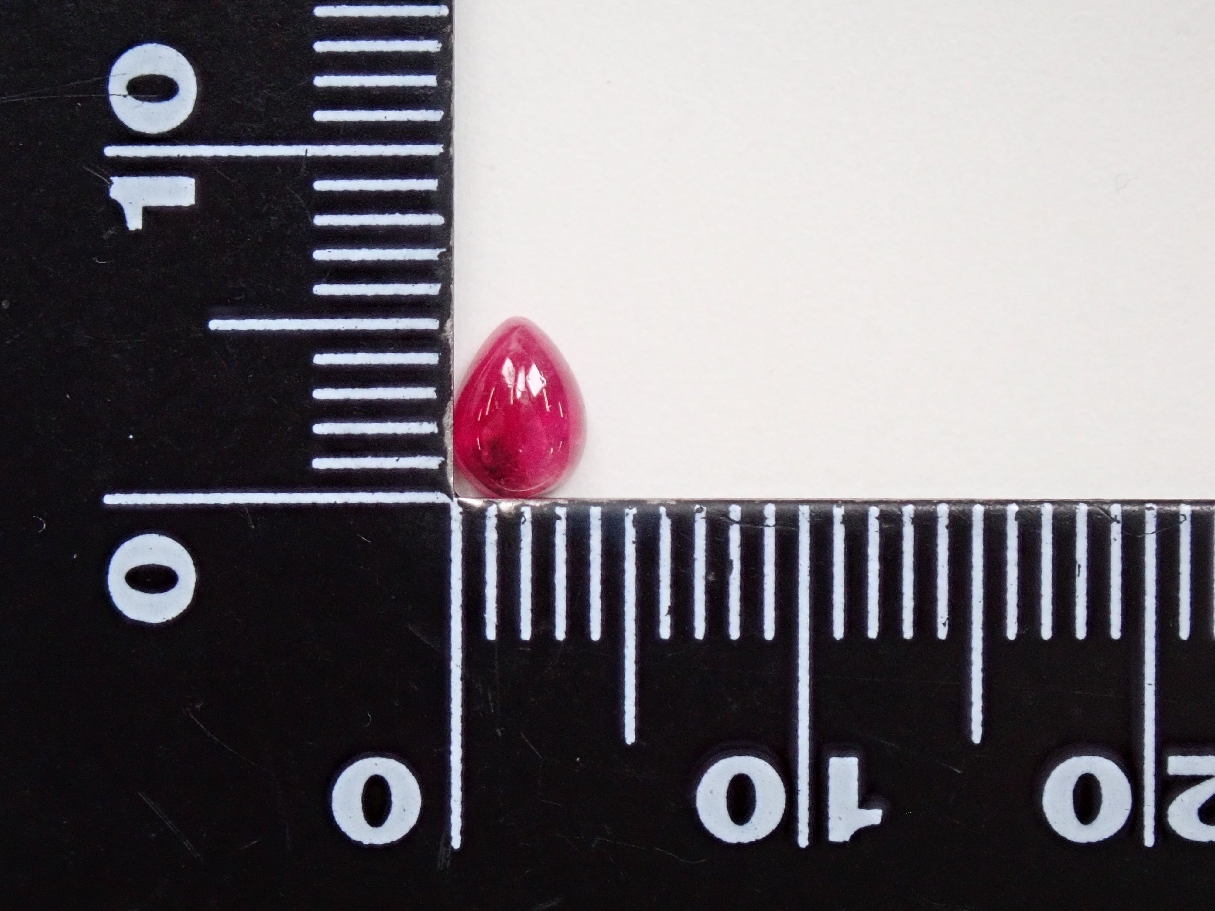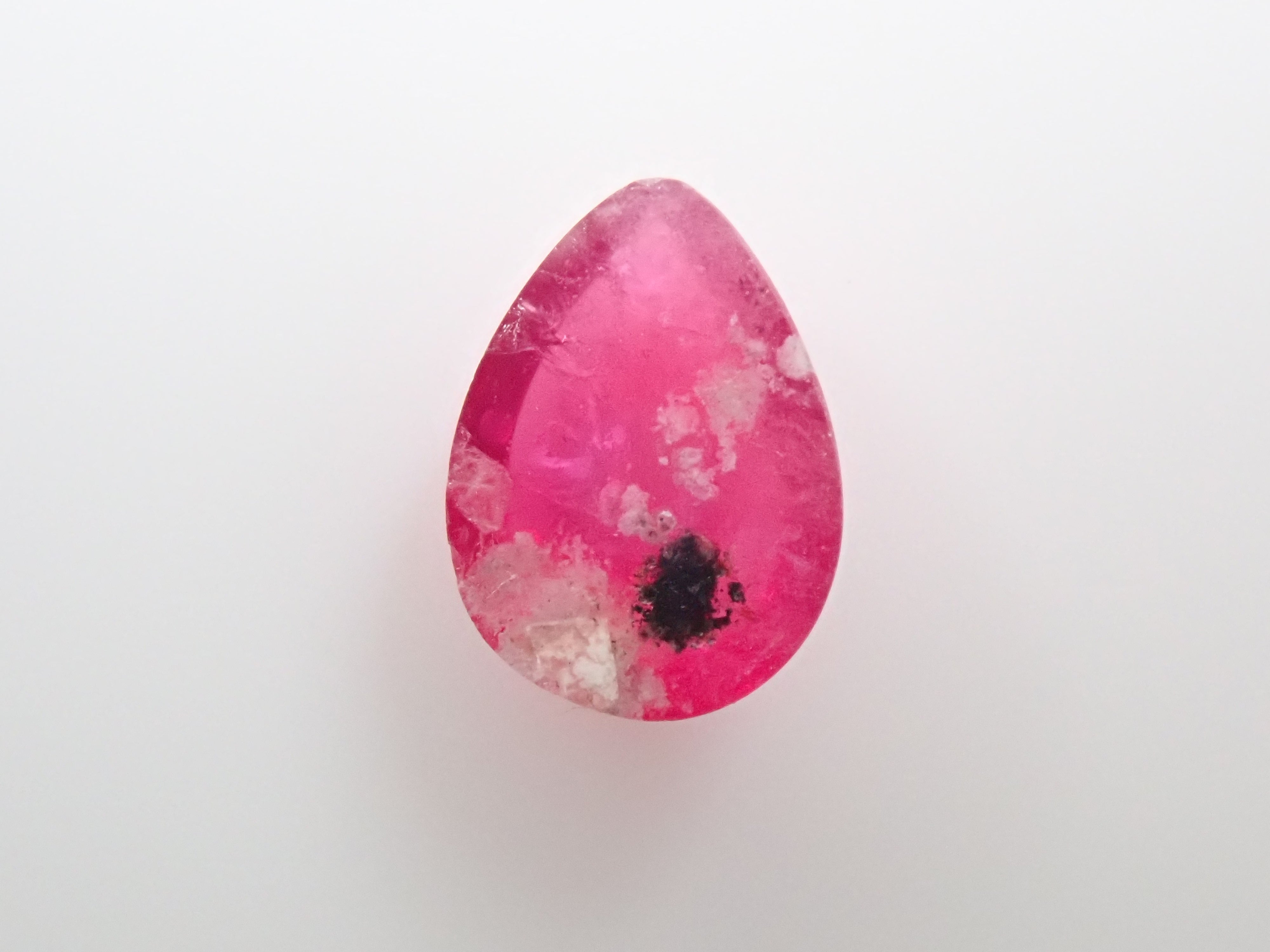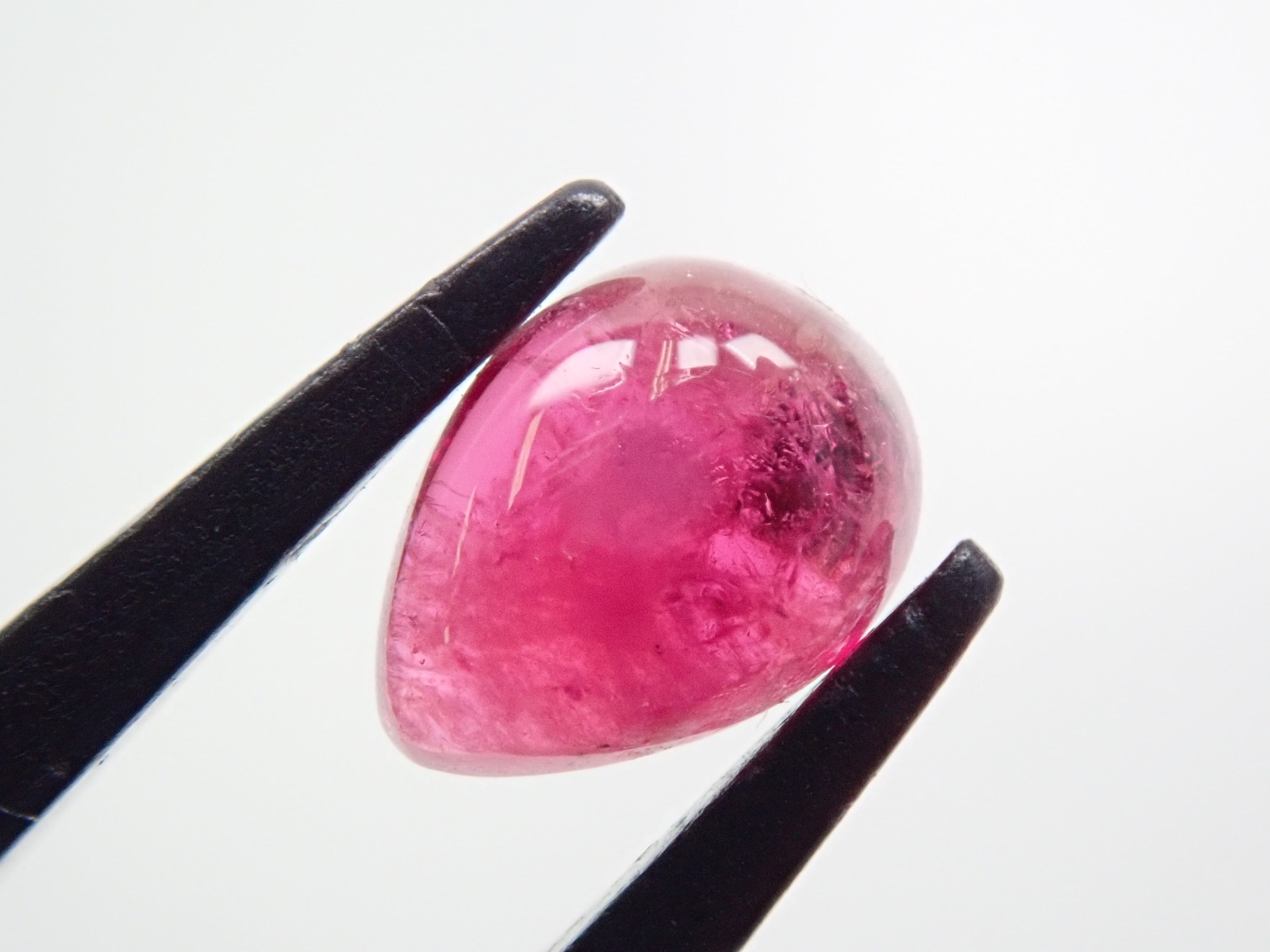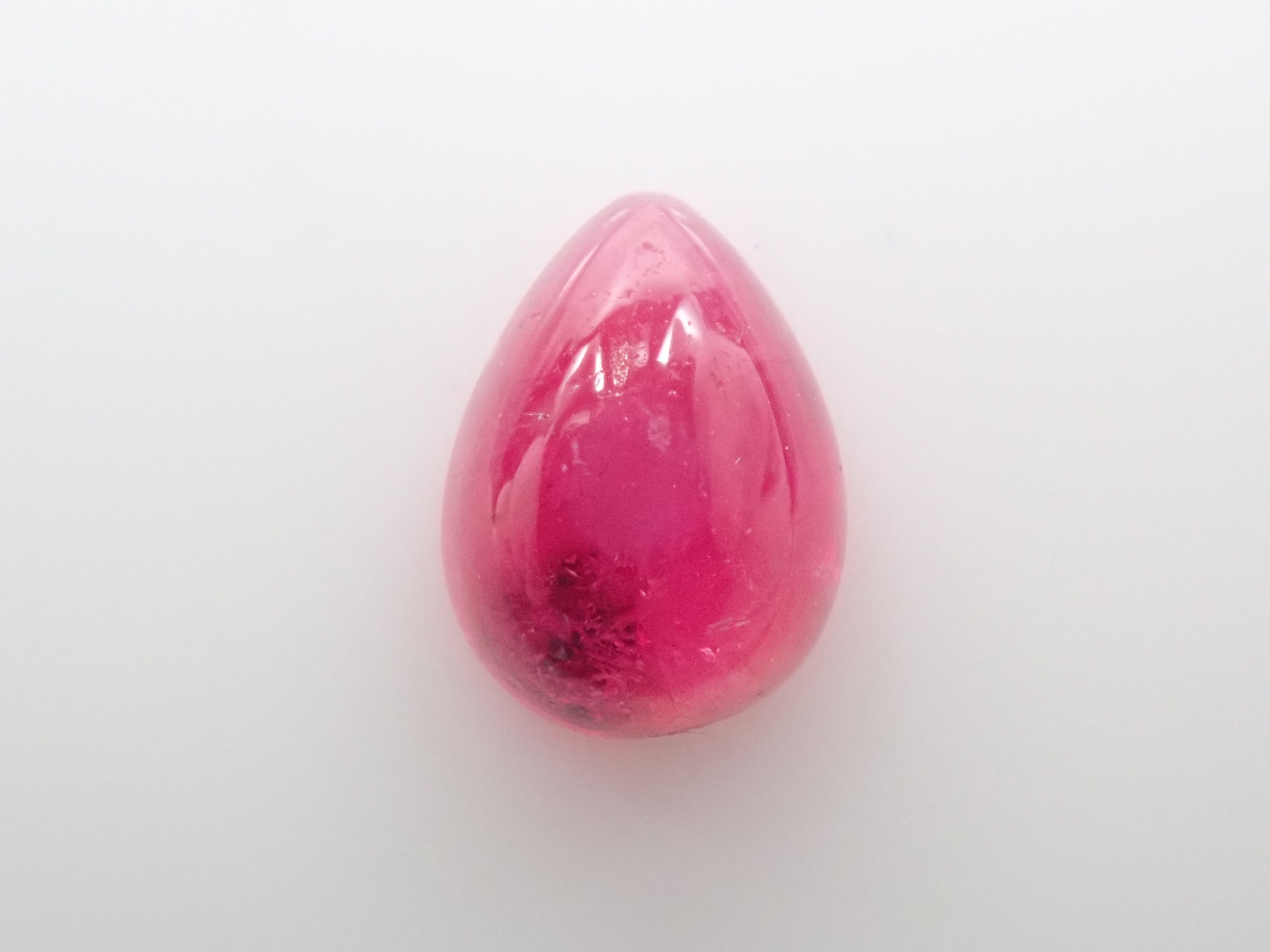 這是一種鬆散的梨形凸圓面切工,在紅色綠柱石中極為罕見。紅色綠柱石下面的白色物質是主岩。