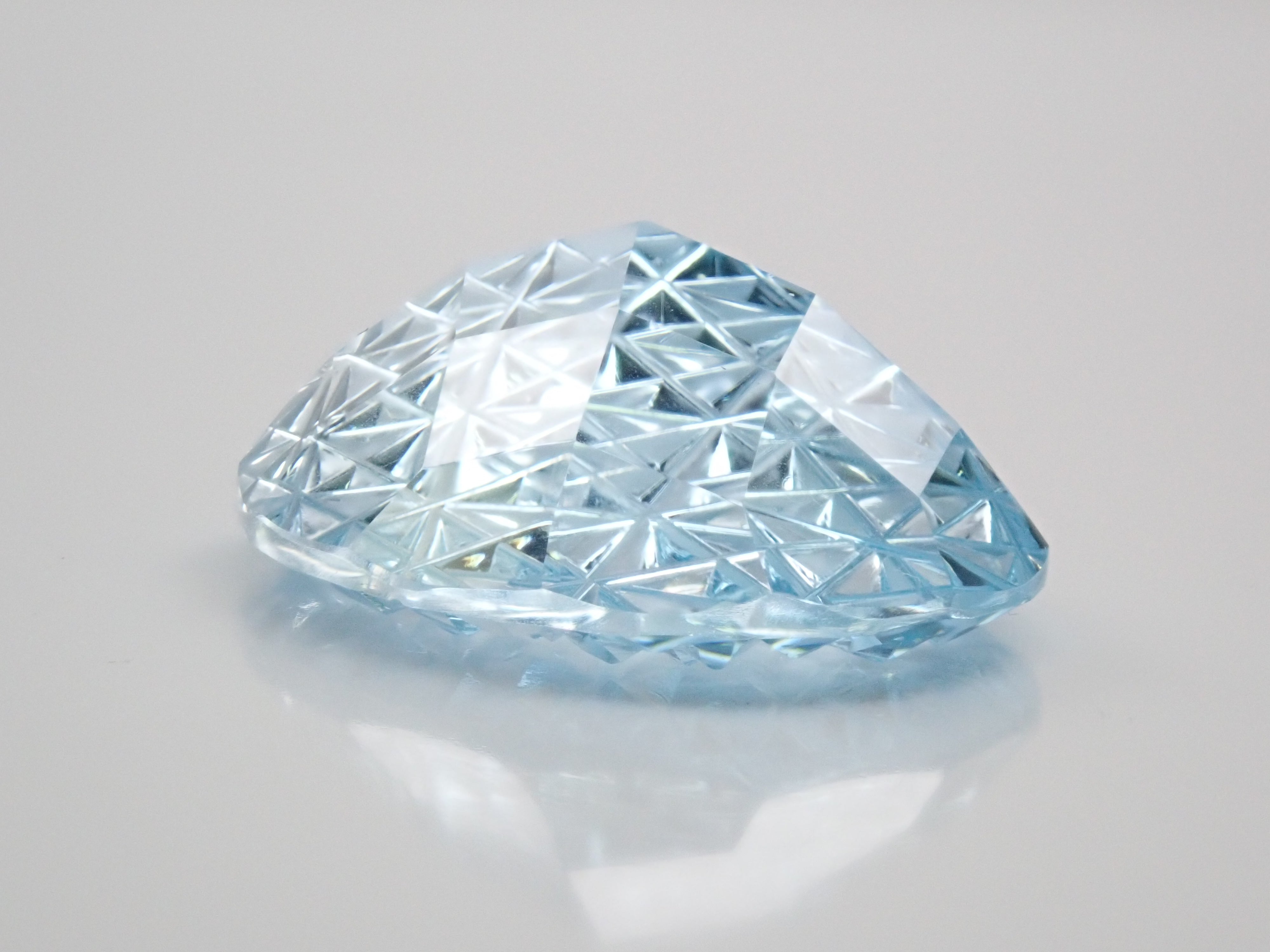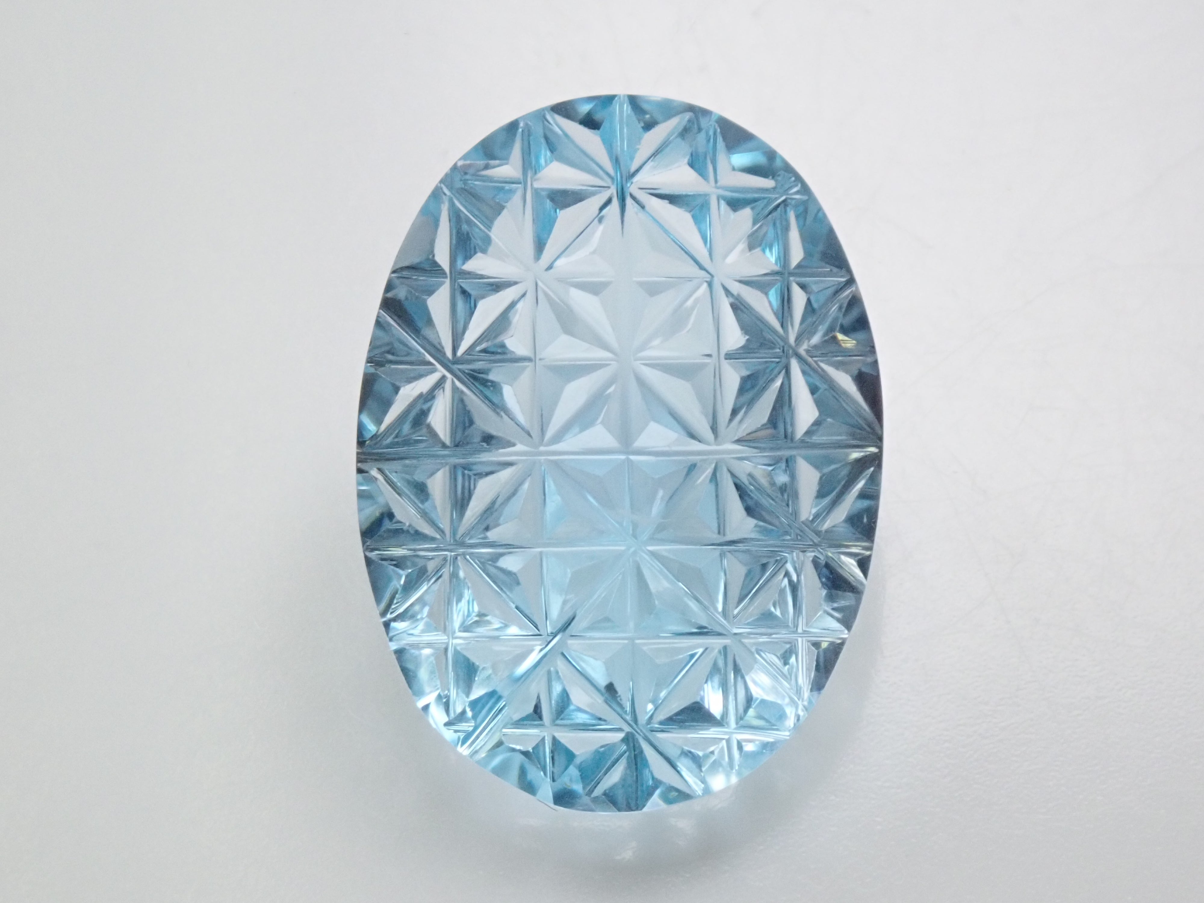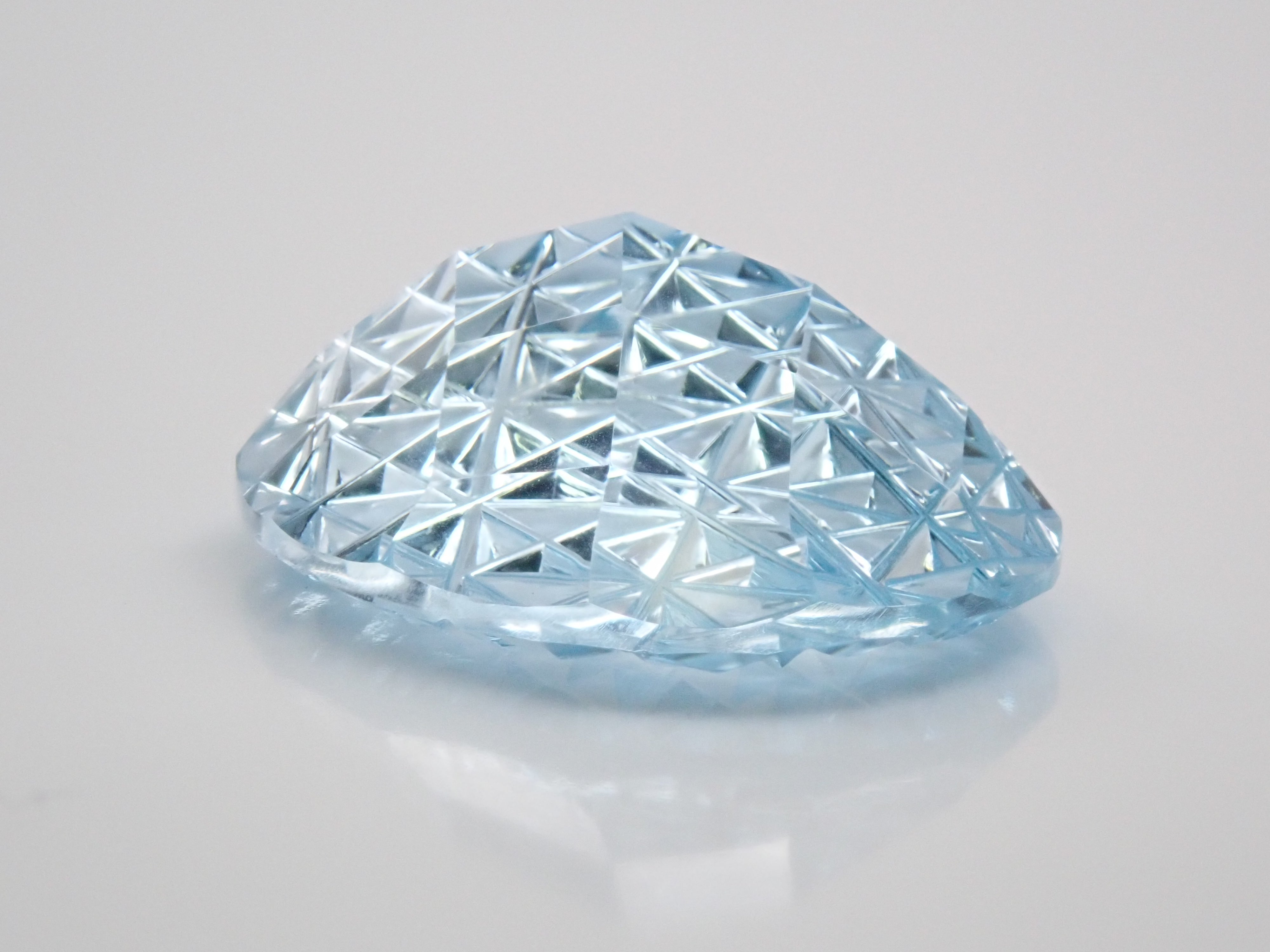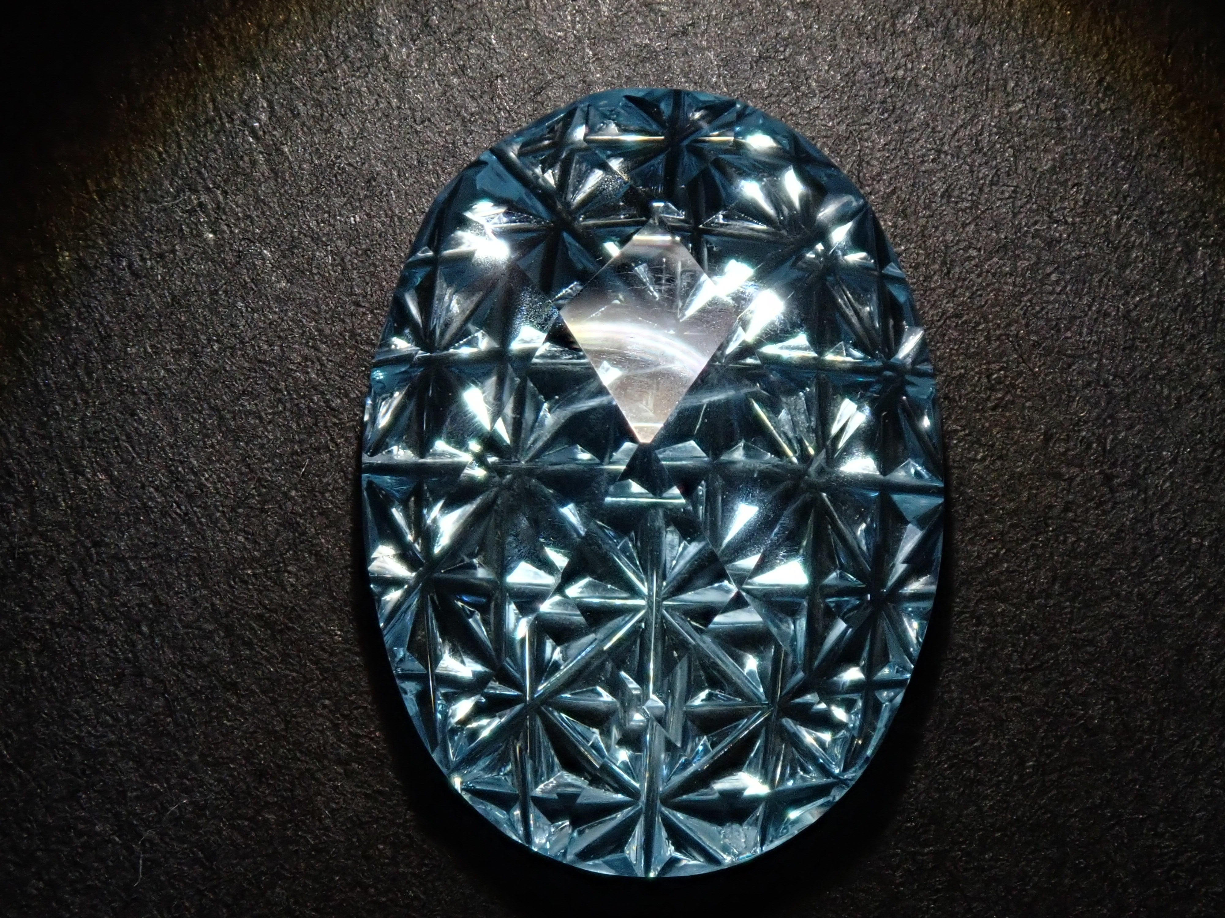 這是一顆來自甲州Kikkiko “Checker x Color”的藍色托帕石,由清水Kikki和深澤洋一聯手打造。這顆甲州Kikkiko的切割寶石由兩位大師級工匠打造,分別是清水Kikki的社長清水幸雄和深澤珠寶工藝的社長深澤洋一。清水負責刻面,深澤負責切割面。