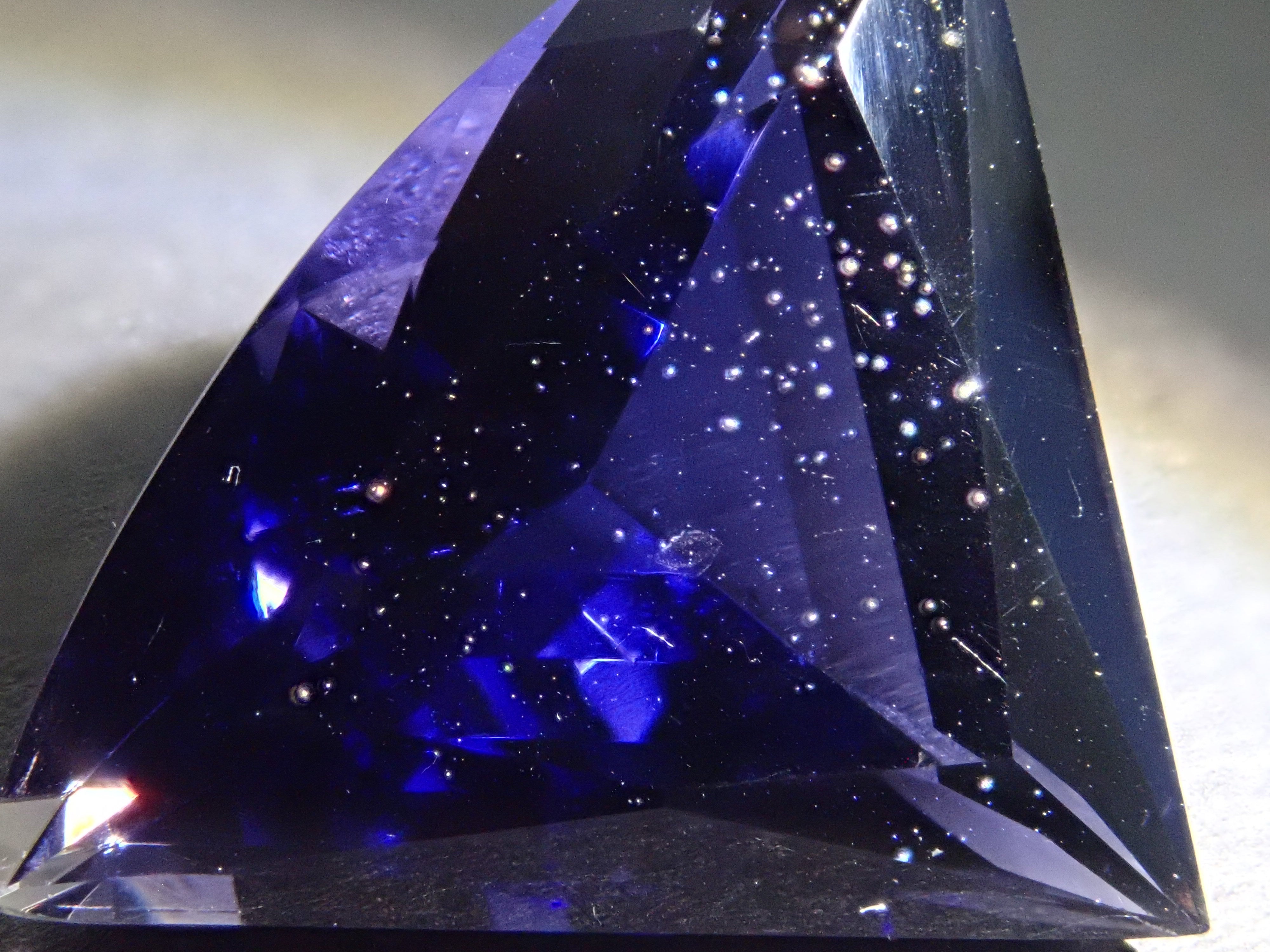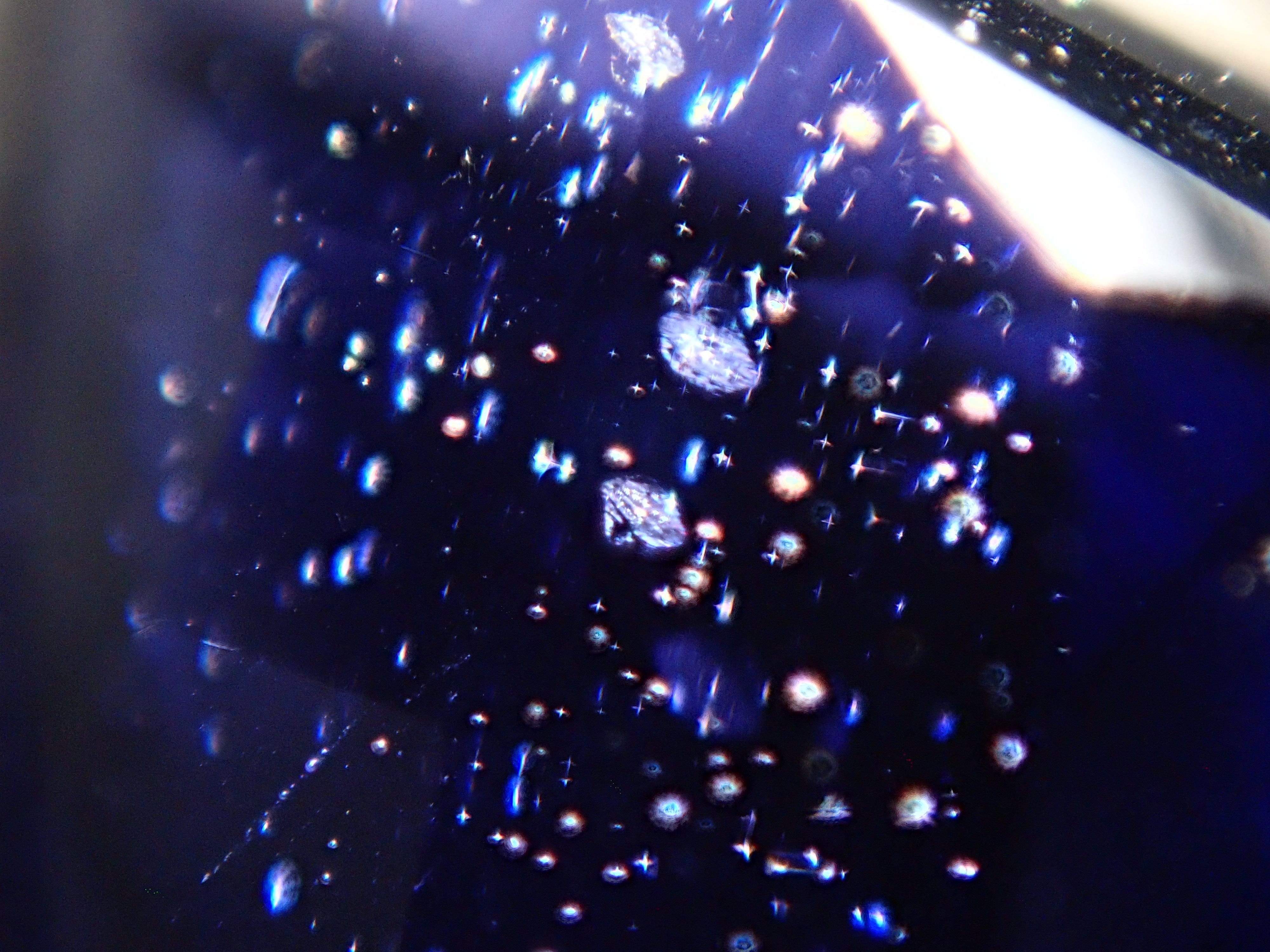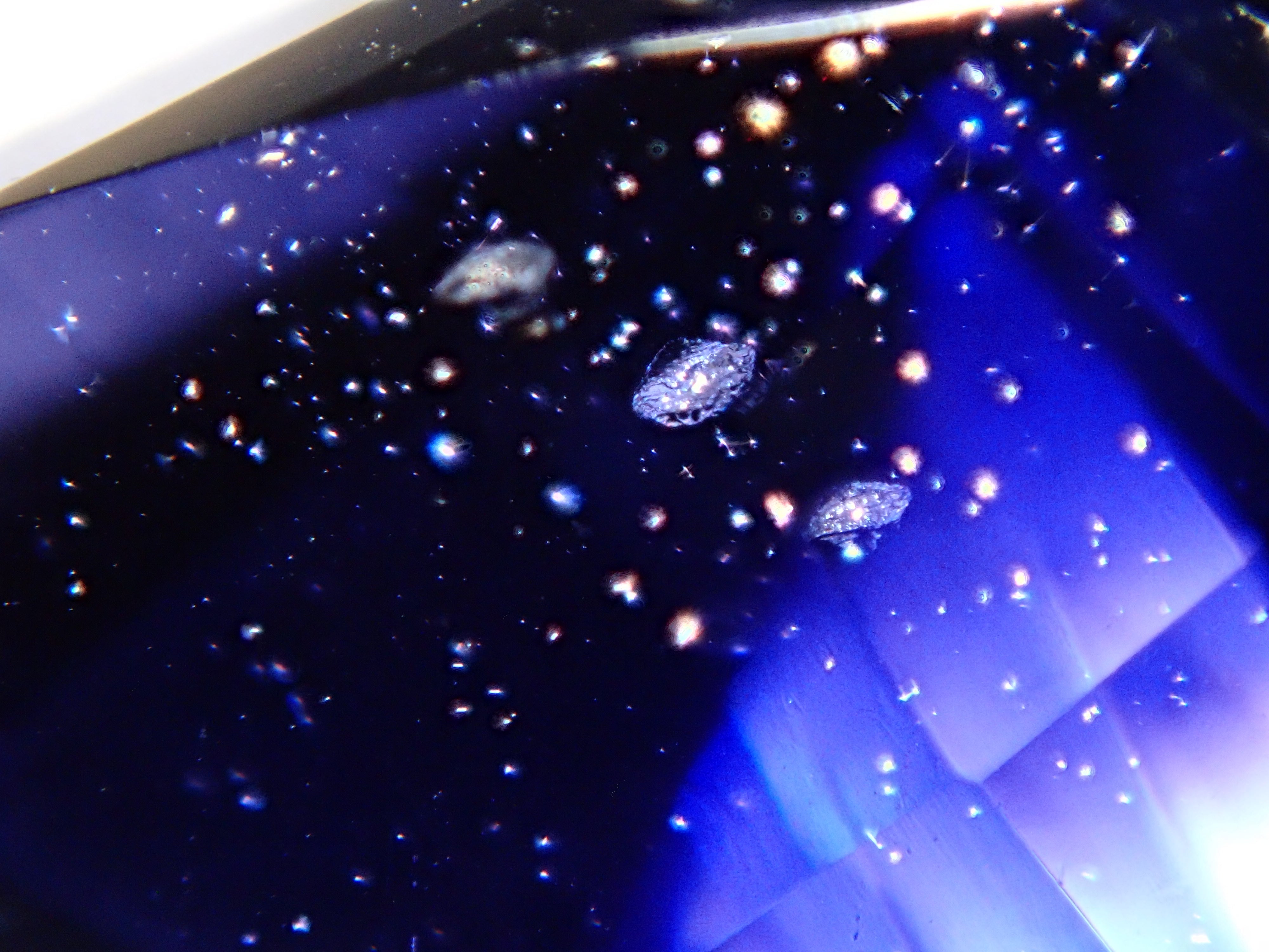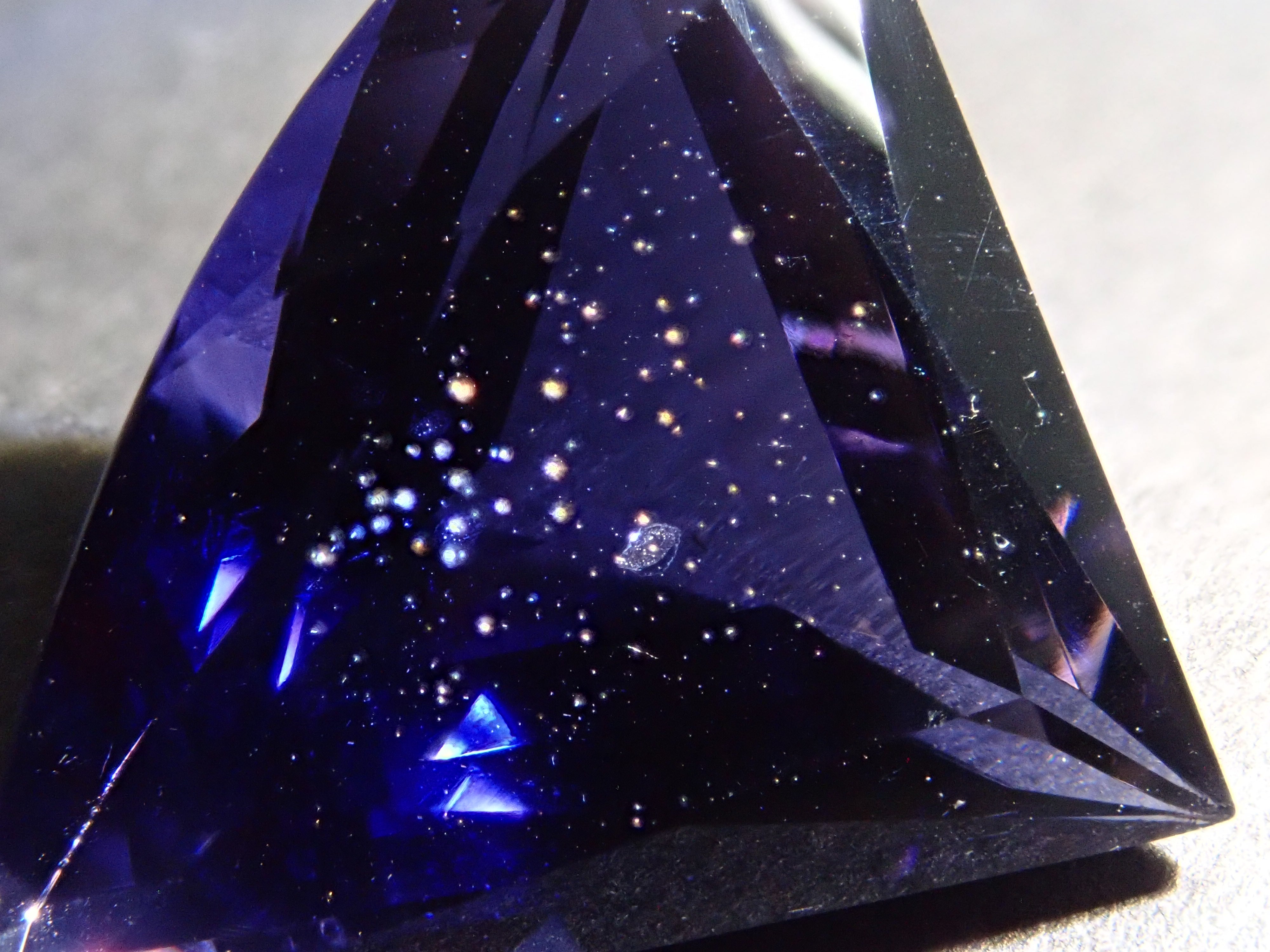 堇青石是一種美麗的深藍紫色,類似紫羅蘭花。它是一種多向色性寶石,從不同角度觀察時會呈現不同的顏色。從紫色、藍色到黃色的顏色變化,讓您感受到寶石的深邃魅力。這是一種堇青石,具有類似閃光的光學效應,稱為散光現象。它通常被稱為“堇青石日光石”或“漫金堇青石”。閃閃發光的藍紫色光芒,就像夜空中閃爍的星星。請盡情享受觸手可及的星空。我拍照時使用筆形手電筒。
