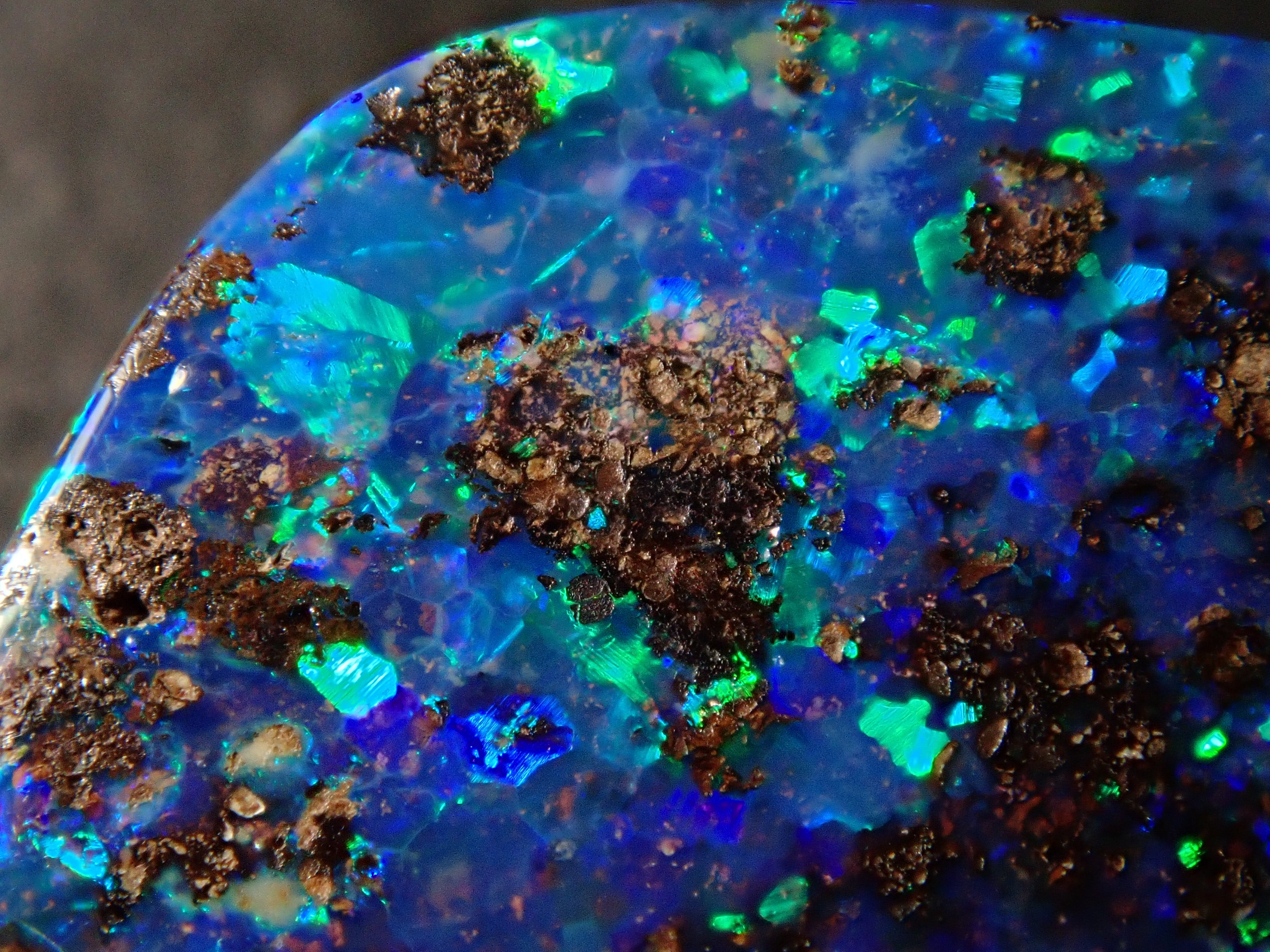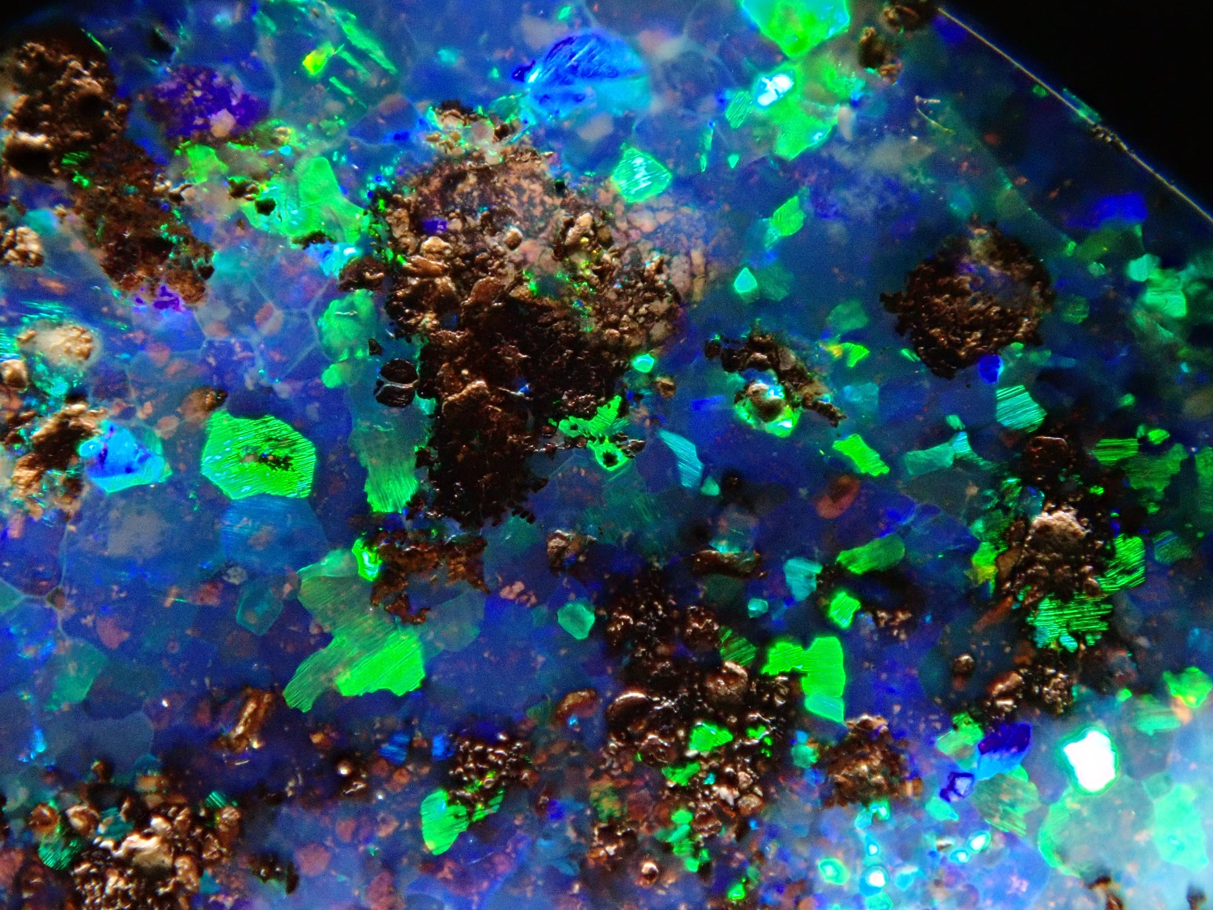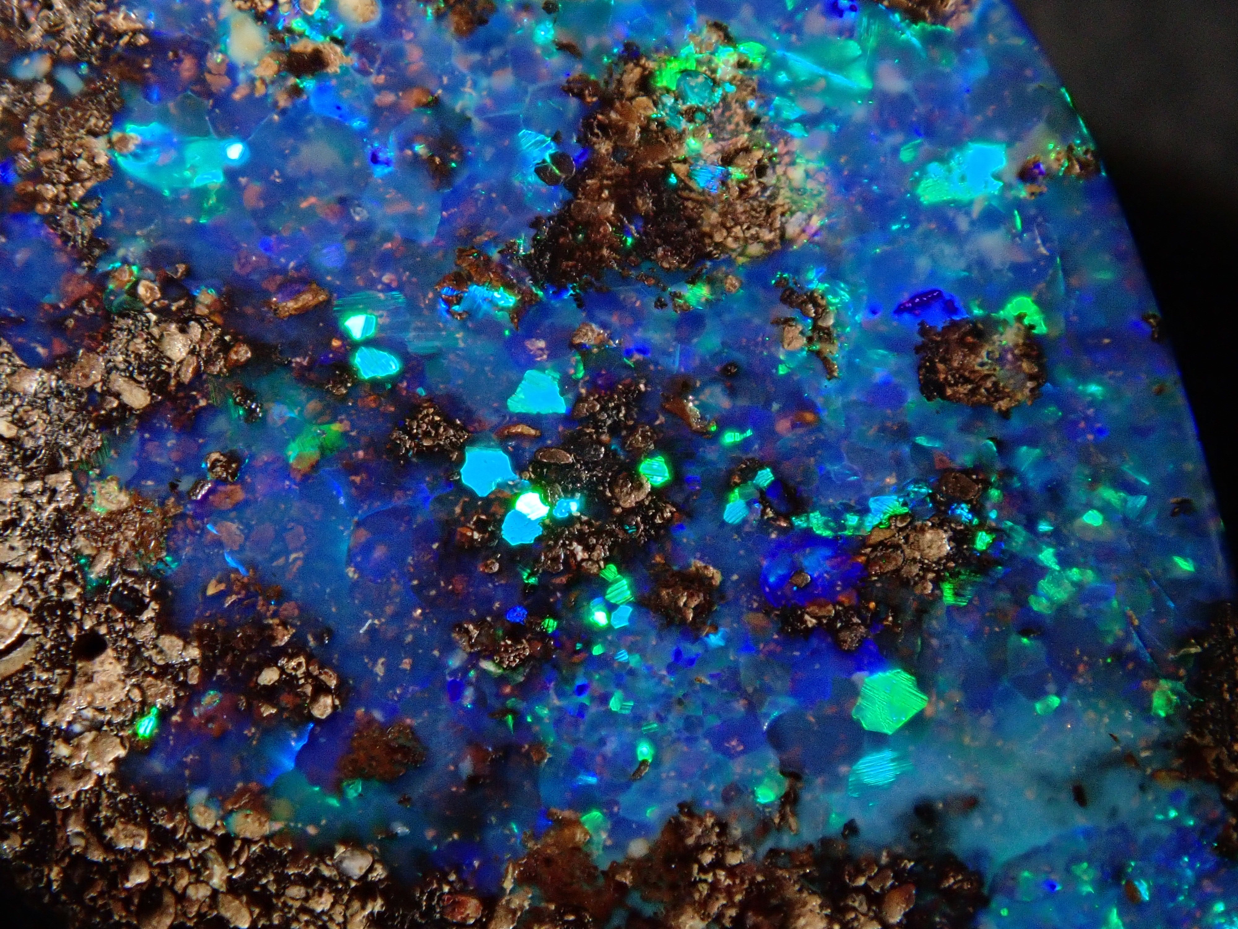 蛋白石是一種以虹彩光澤為特徵的寶石。蛋白石有幾種類型,但礫岩蛋白石是指仍附著於母岩的蛋白石。部分照片是用筆型電筒拍攝的。
