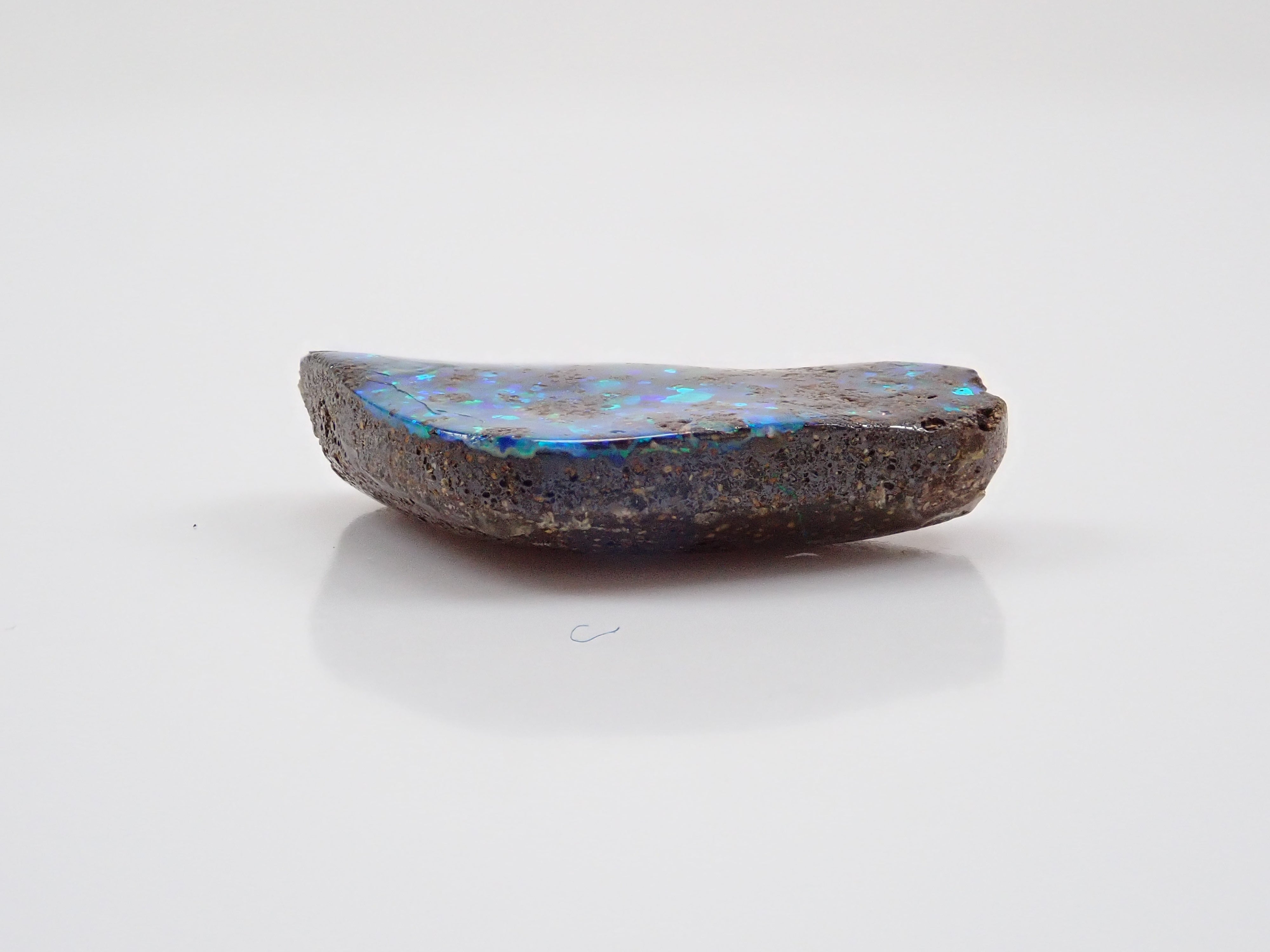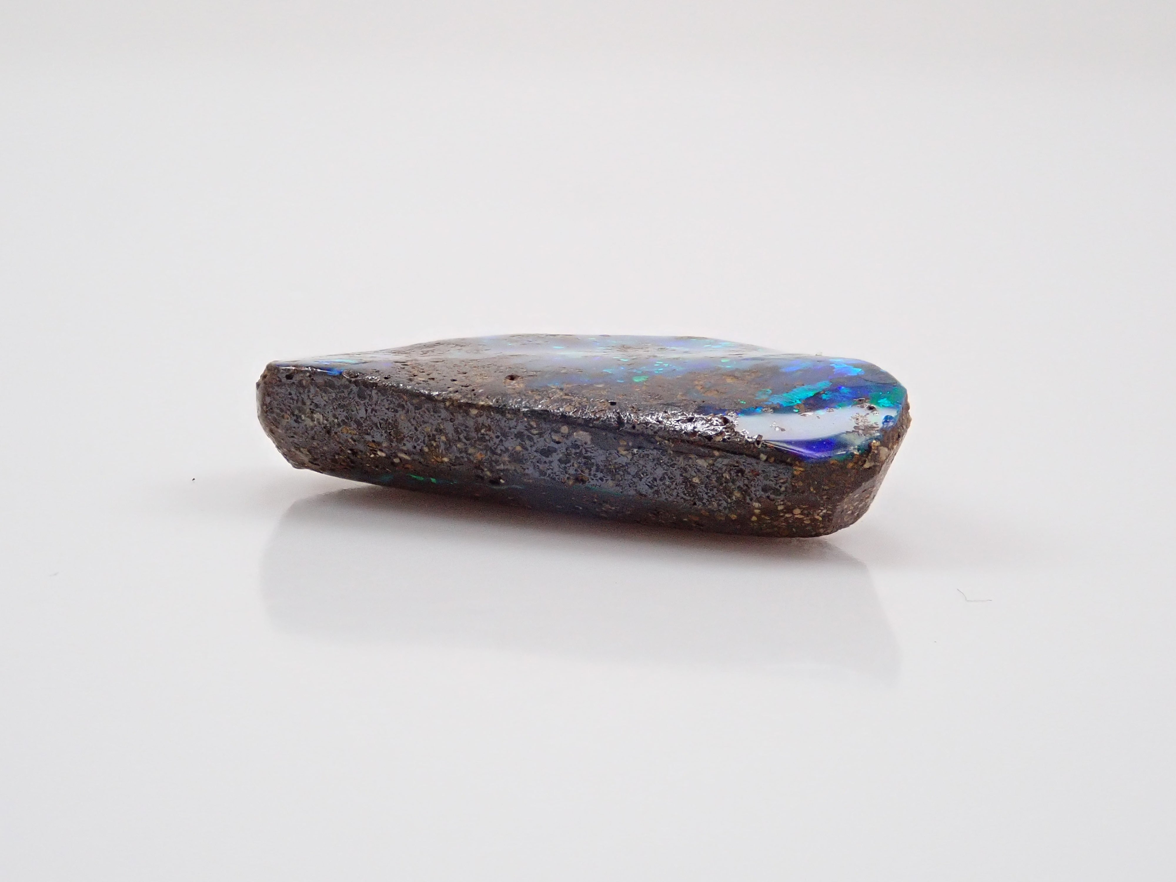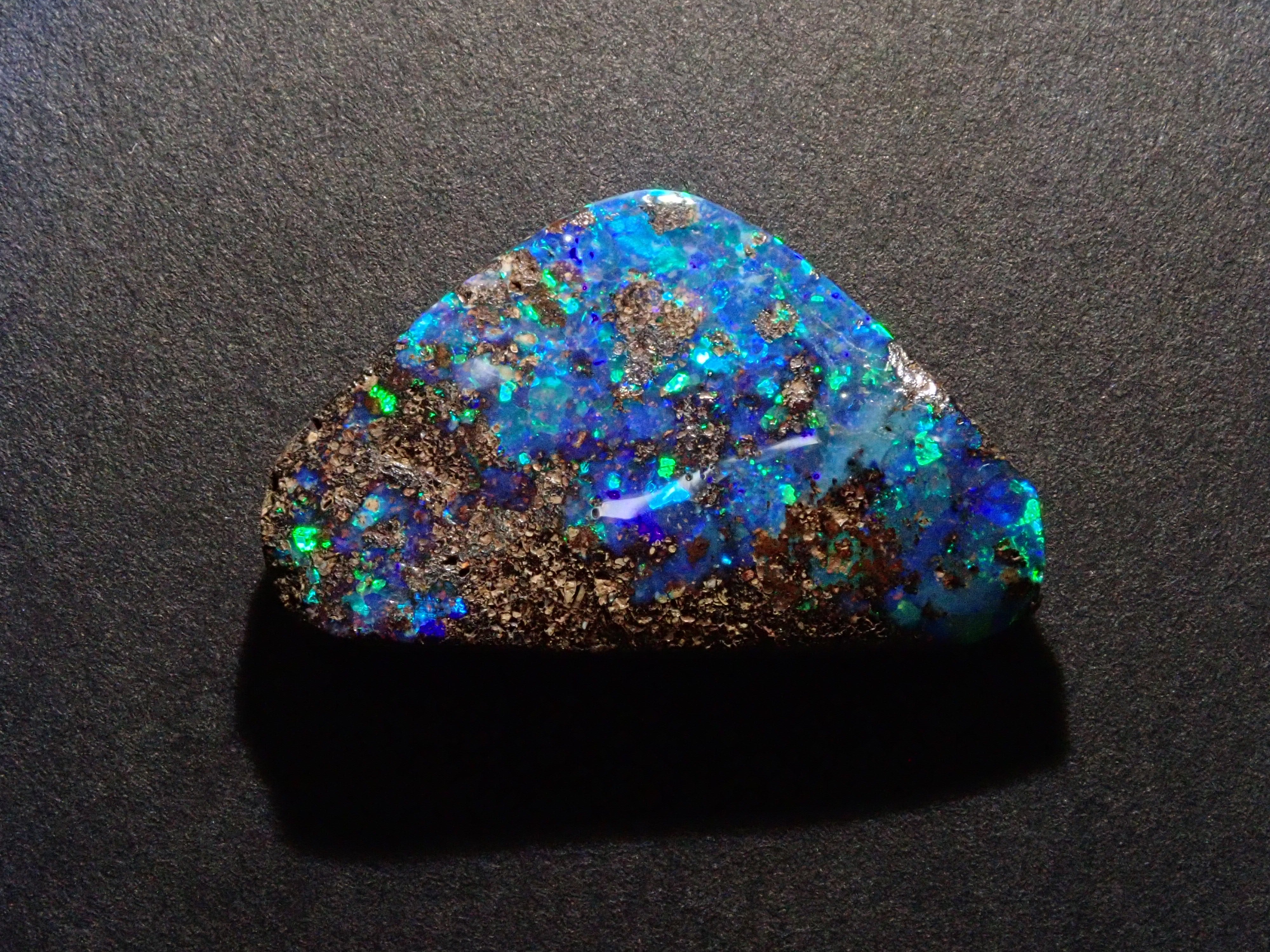 蛋白石是一種以虹彩光澤為特徵的寶石。蛋白石有幾種類型,但礫岩蛋白石是指仍附著於母岩的蛋白石。部分照片是用筆型電筒拍攝的。