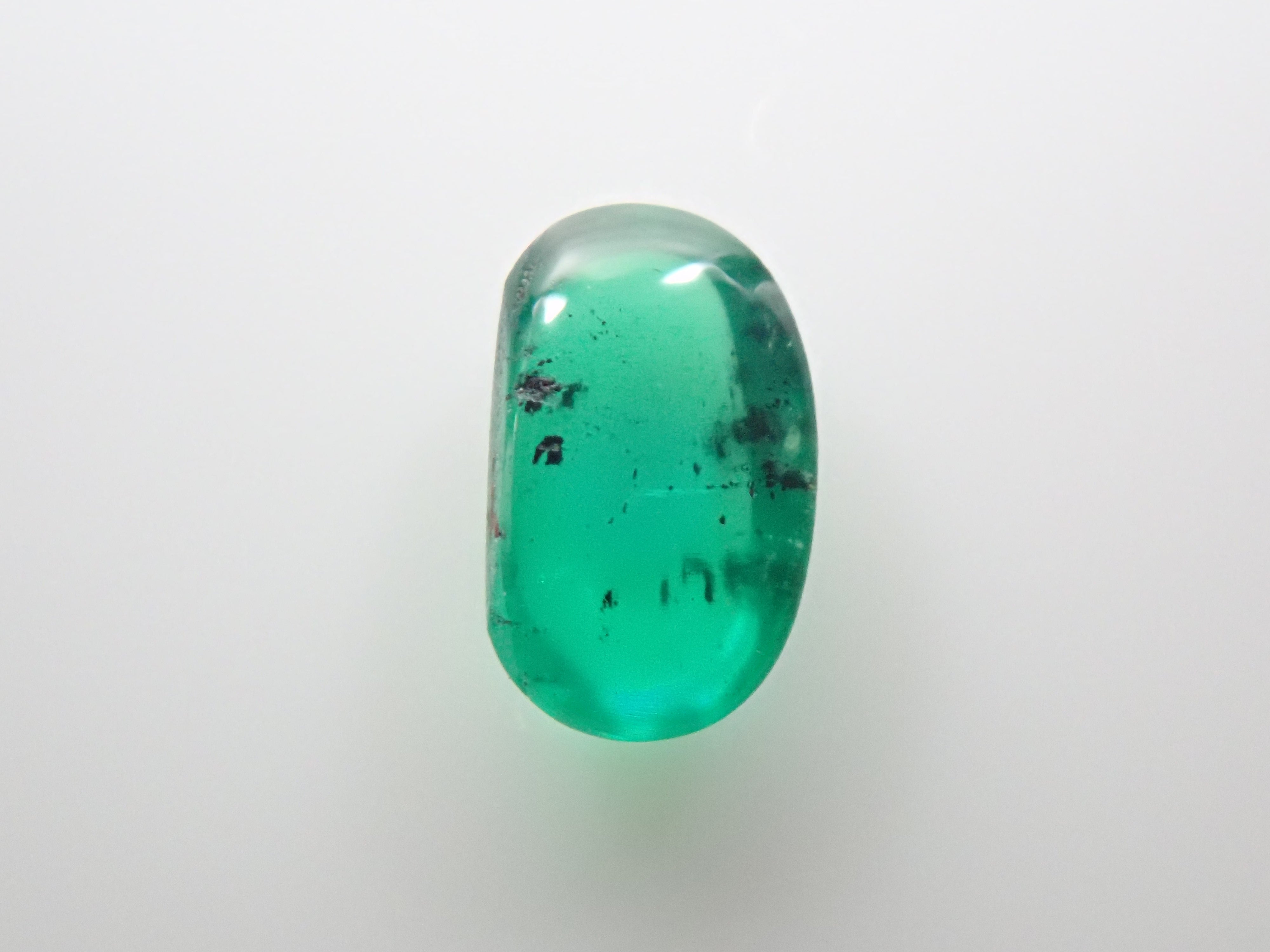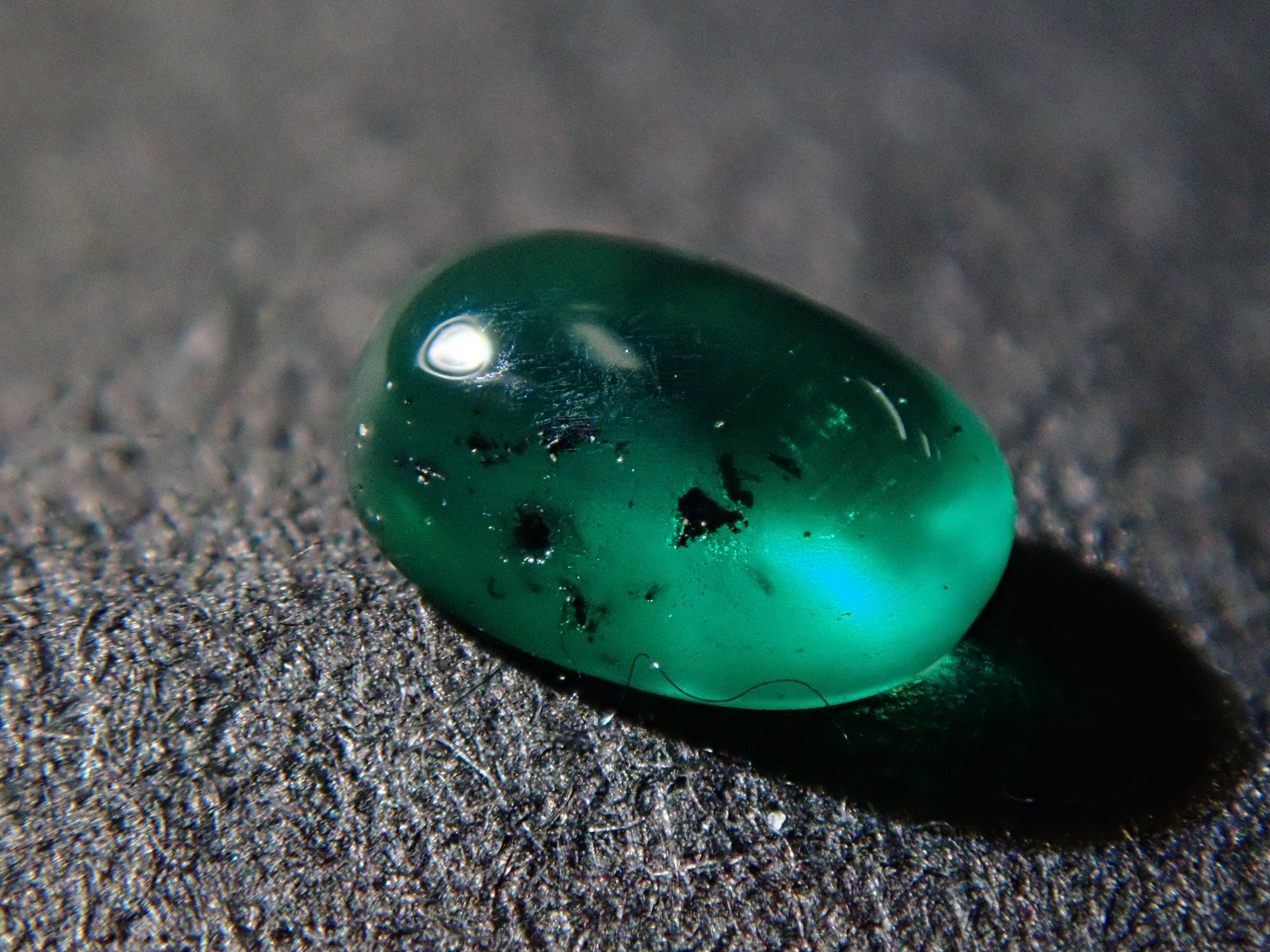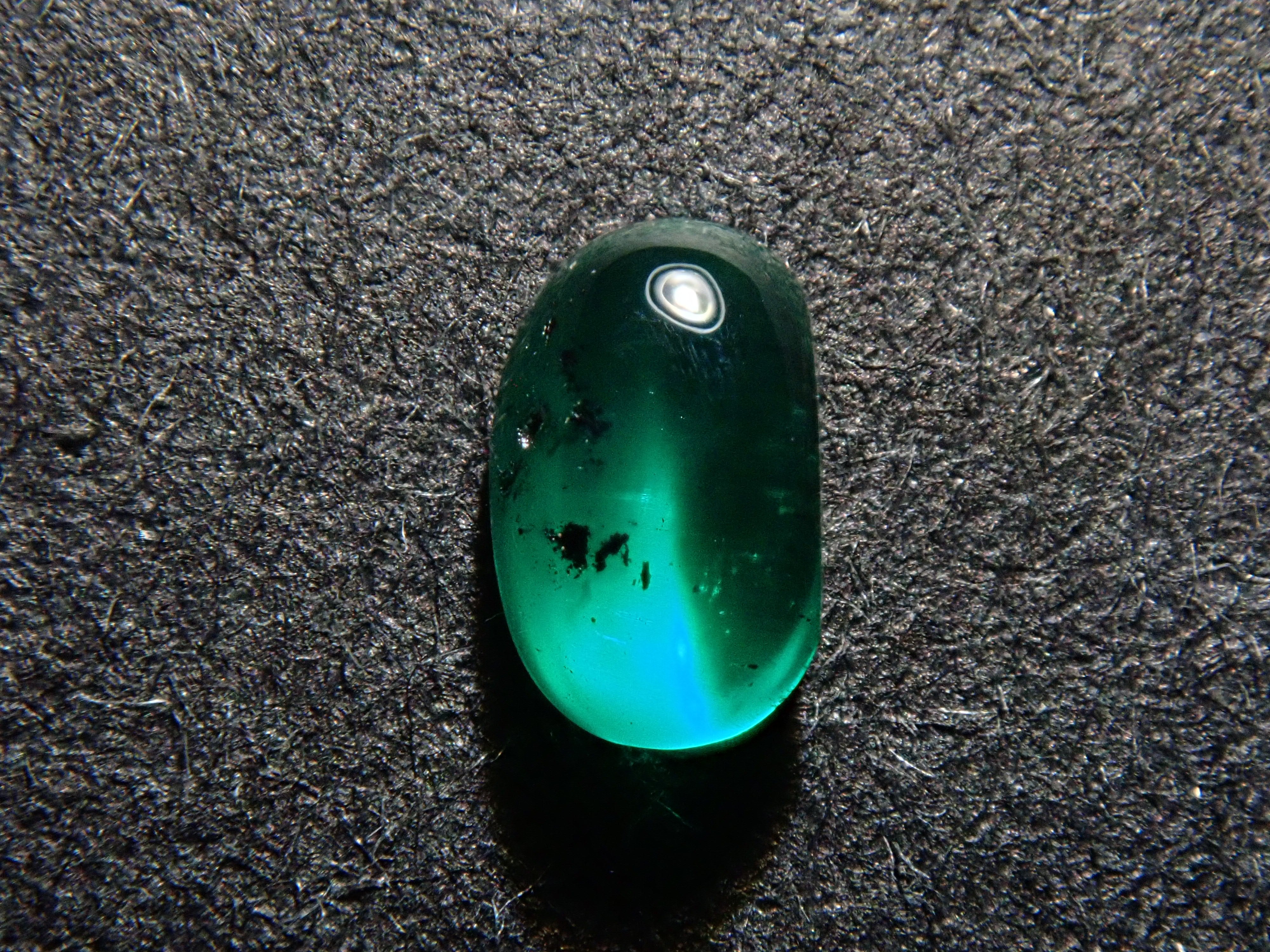 祖母綠是埃及豔後克莉奧佩特拉鍾愛的著名寶石。俗話說,「完美無瑕的祖母綠和完美無瑕的人一樣少」。因此,人們通常會用油處理祖母綠,使刮痕不那麼明顯。光線照射時,可以看到貓眼效果。這種兼具溫柔與清新的氣質,充滿魅力。照片是用筆型手電筒拍攝的。寶石背面基本未經打磨。在黑色背景下,用光線照射祖母綠,可以欣賞到貓眼般的效果。