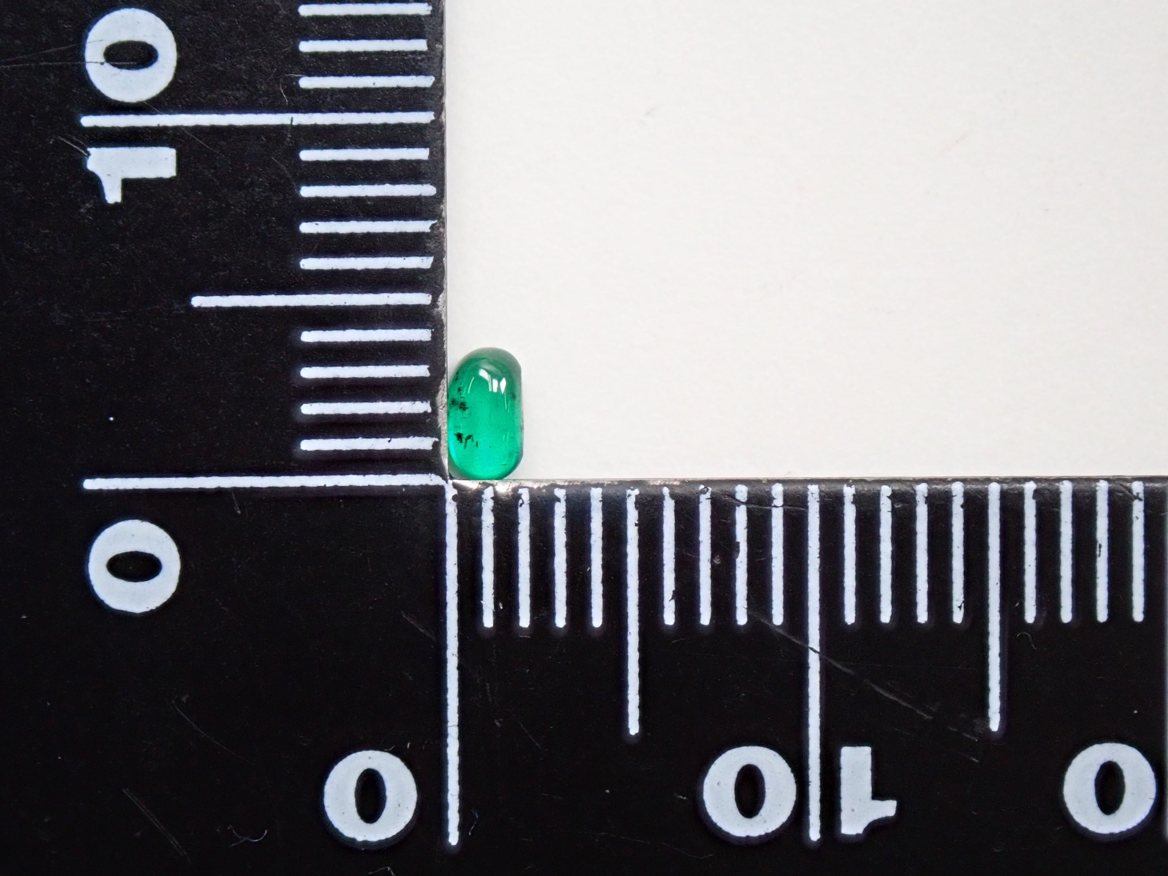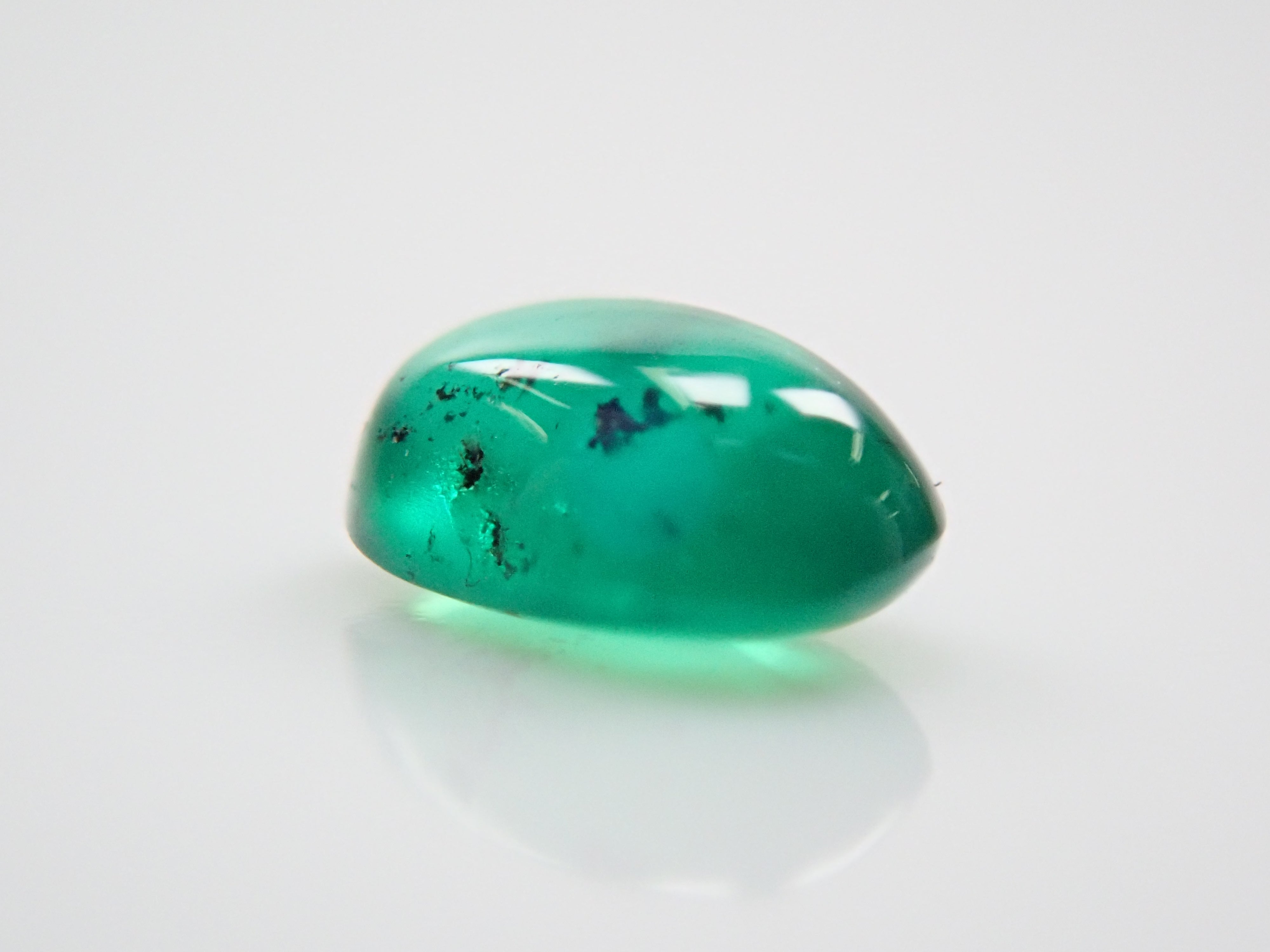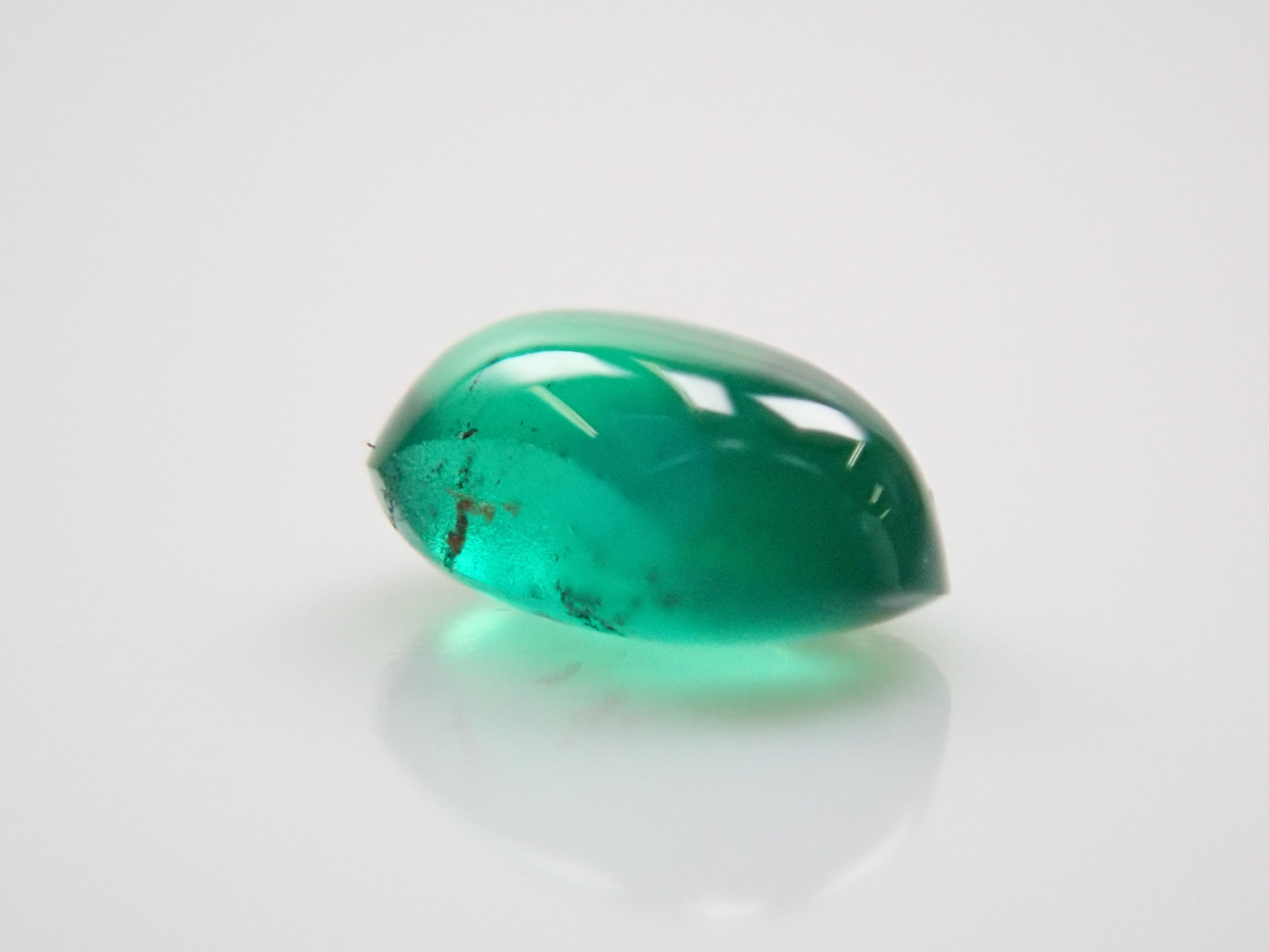 祖母綠是埃及豔後克莉奧佩特拉鍾愛的著名寶石。俗話說,「完美無瑕的祖母綠和完美無瑕的人一樣少」。因此,人們通常會用油處理祖母綠,使刮痕不那麼明顯。光線照射時,可以看到貓眼效果。這種兼具溫柔與清新的氣質,充滿魅力。照片是用筆型手電筒拍攝的。寶石背面基本未經打磨。在黑色背景下,用光線照射祖母綠,可以欣賞到貓眼般的效果。