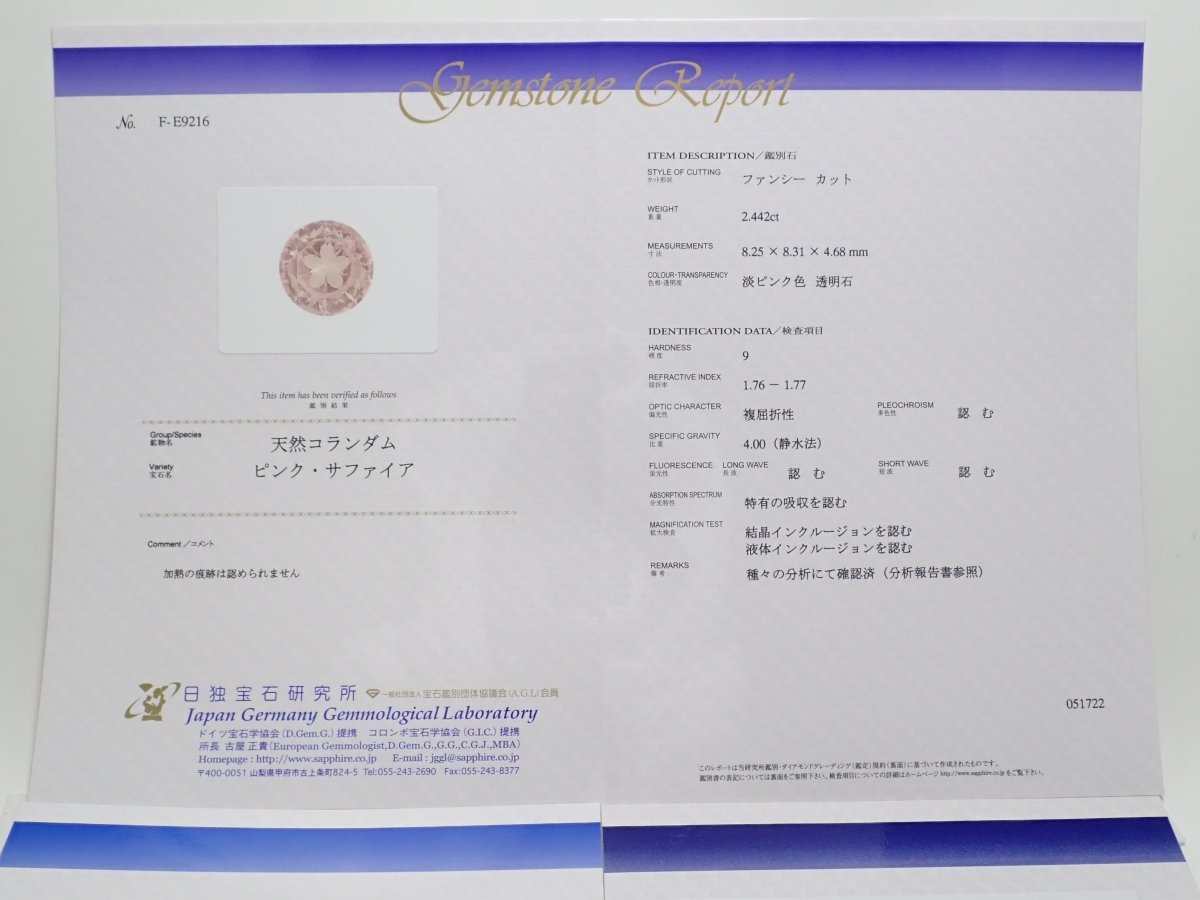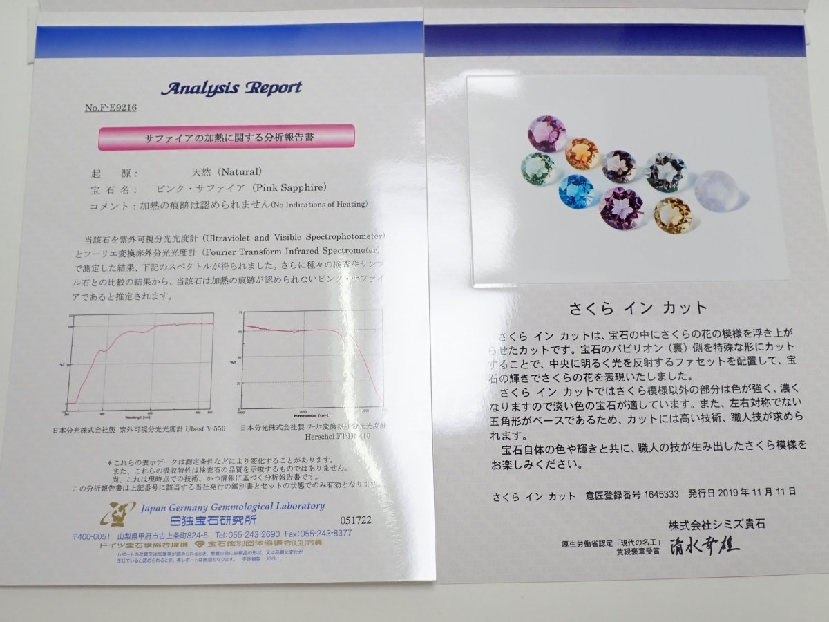 清水奇蹟的櫻花切割粉紅藍寶石散裝。罕見的未加熱粉紅色藍寶石,大尺寸 2 克拉。 櫻花切入。附贈日德寶石研究所出品的櫻花切工原版鑑定書。包括一個特殊的補丁。