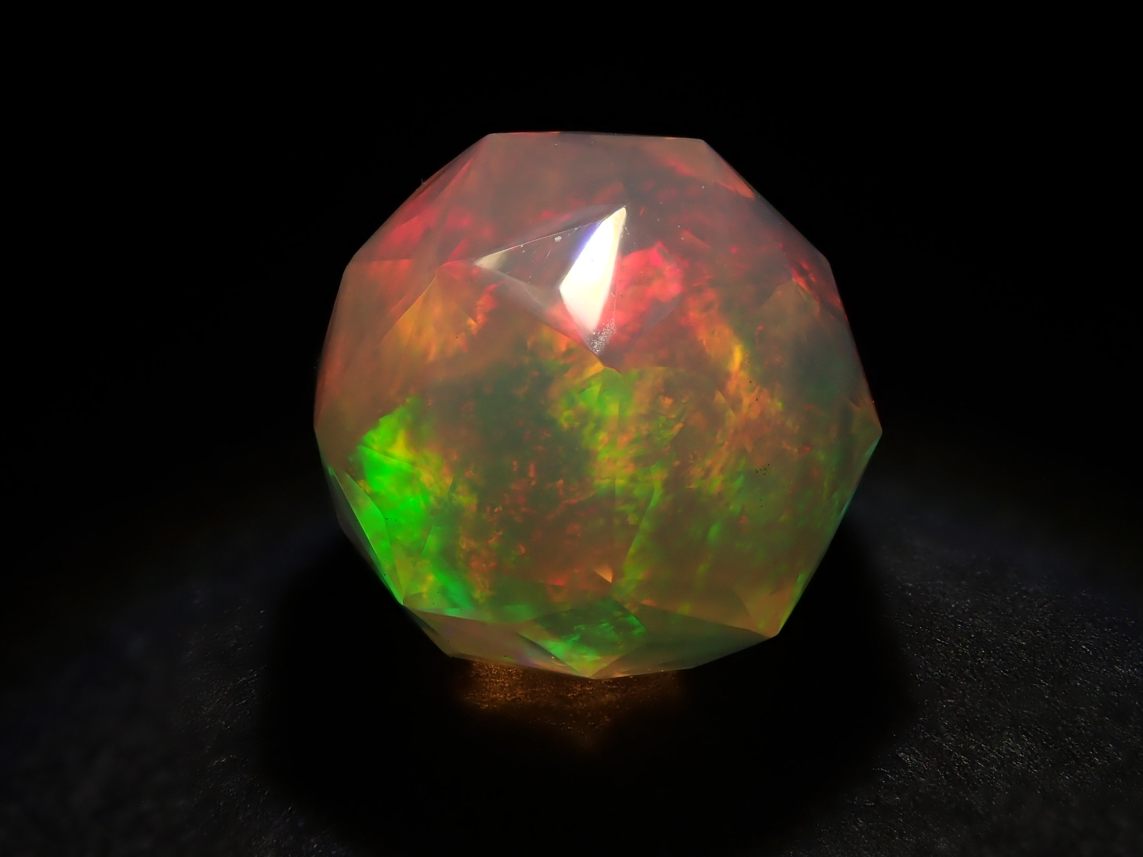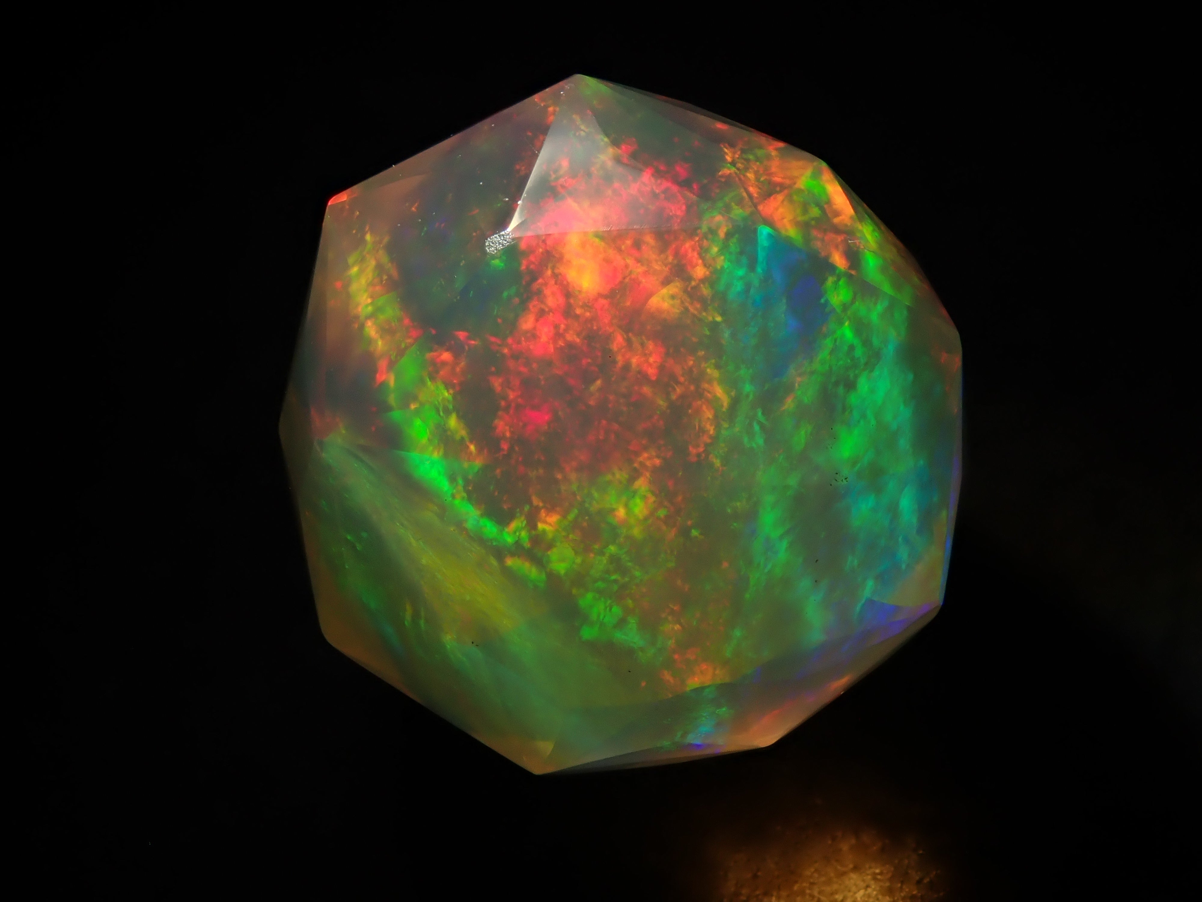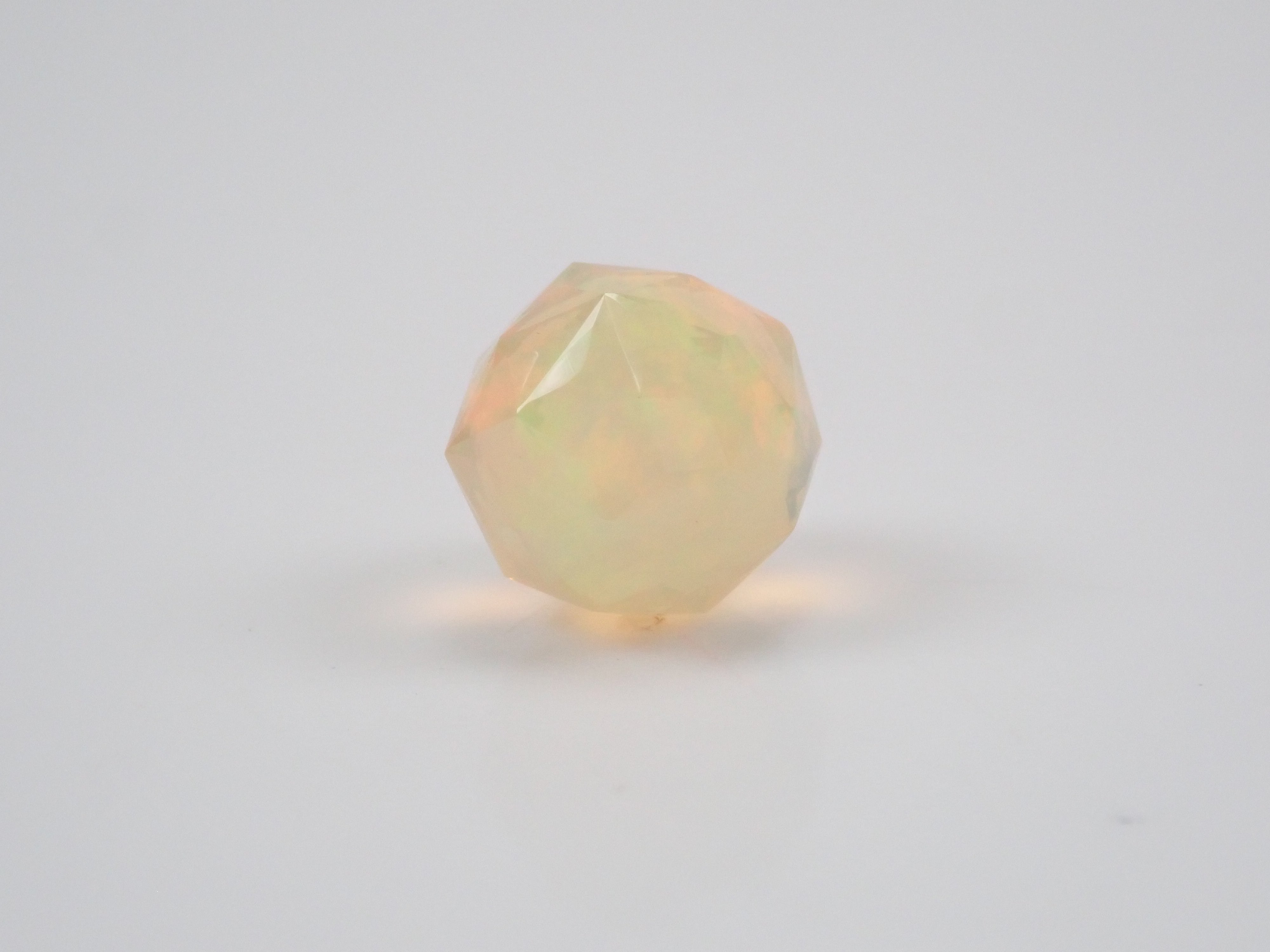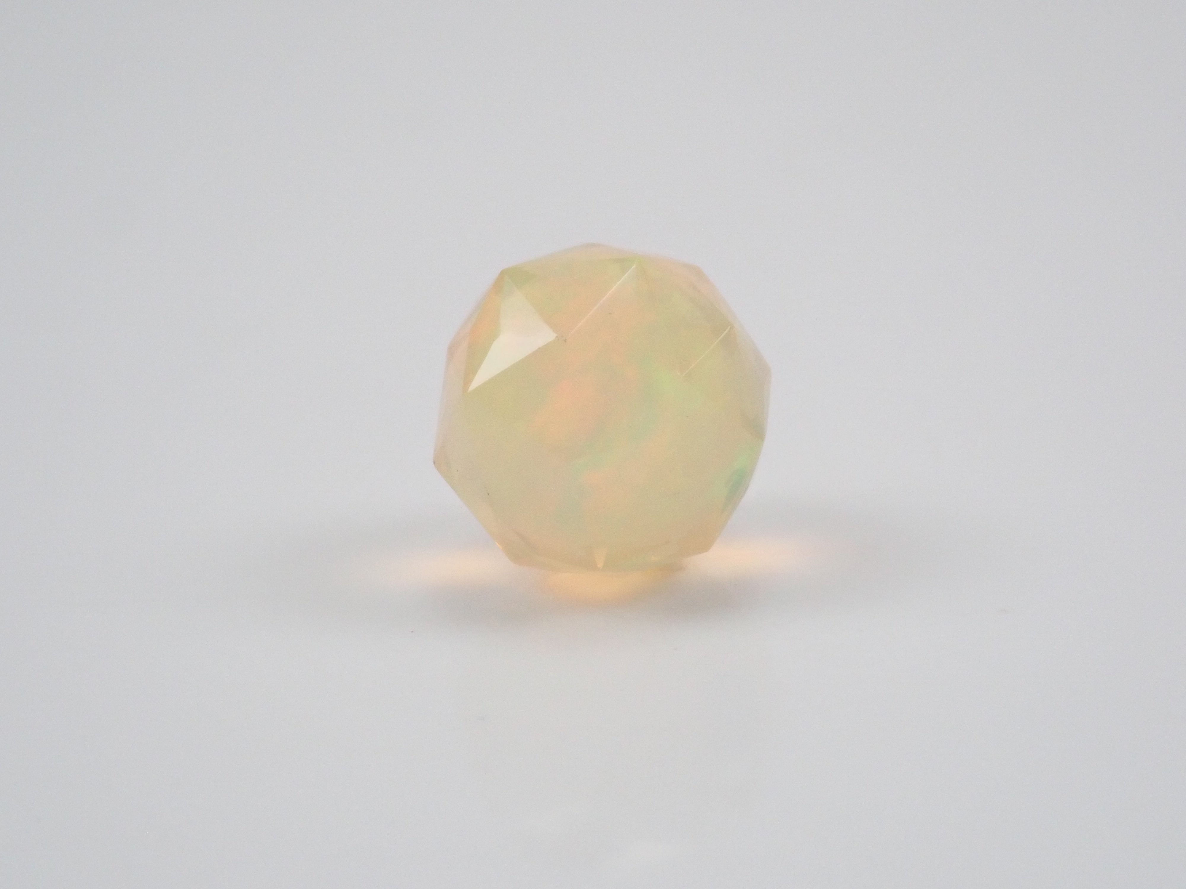 這就是KIKYO CUT,只有清水奇蹟的代表人物清水幸雄先生才能創造,他是世界上唯一能做到這一點的人。對於桔梗切割,首先,使用由 12 個正五邊形包圍的正十二面體作為基底,並向每個正五邊形的中心製作帶有脊線的五邊形切割。在此基礎上,進行進一步切割以建立總共 180 個面的多面體。這種切割需要經過許多令人畏懼的步驟和精細的工作才能完成,因其形狀而被稱為“風鈴草切割”。這是火蛋白石風鈴草切工,8.9 毫米。