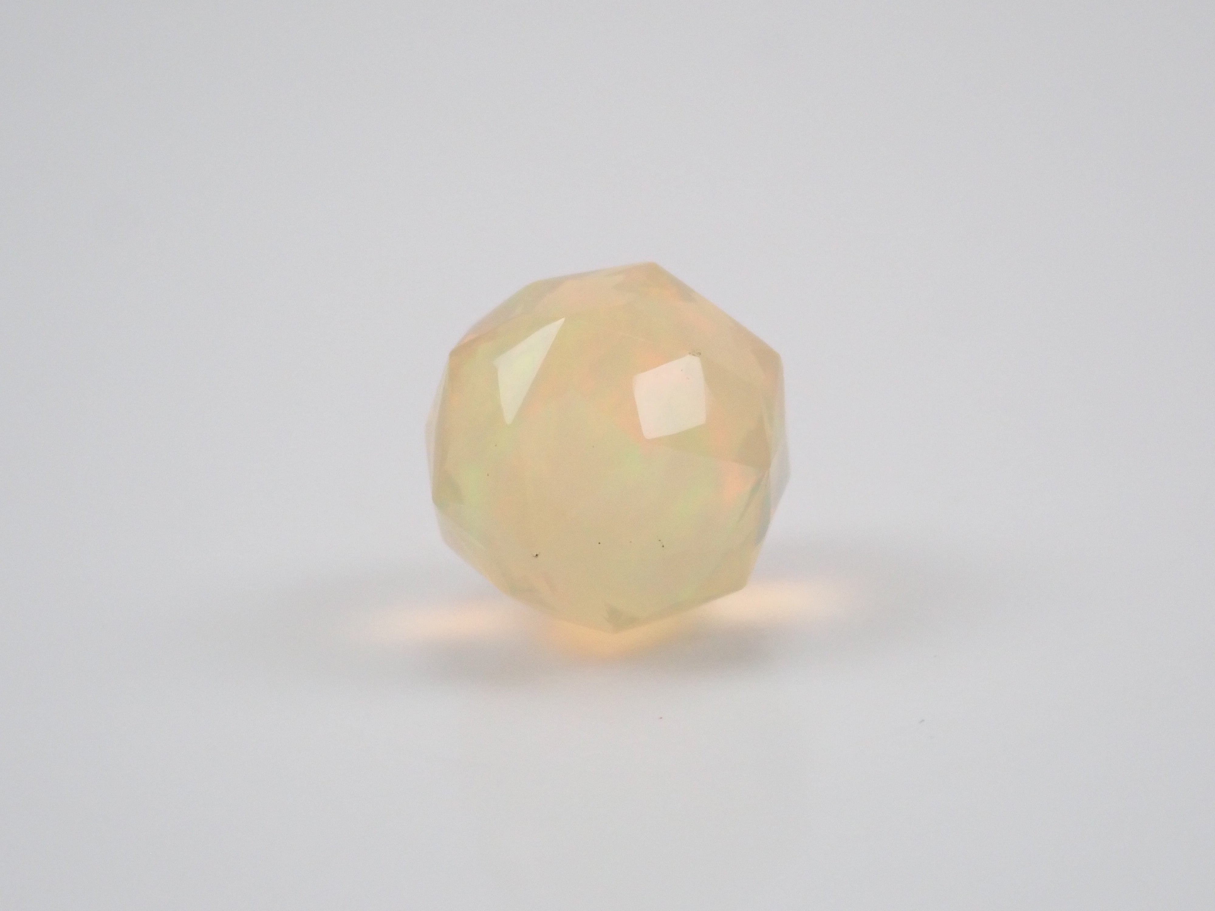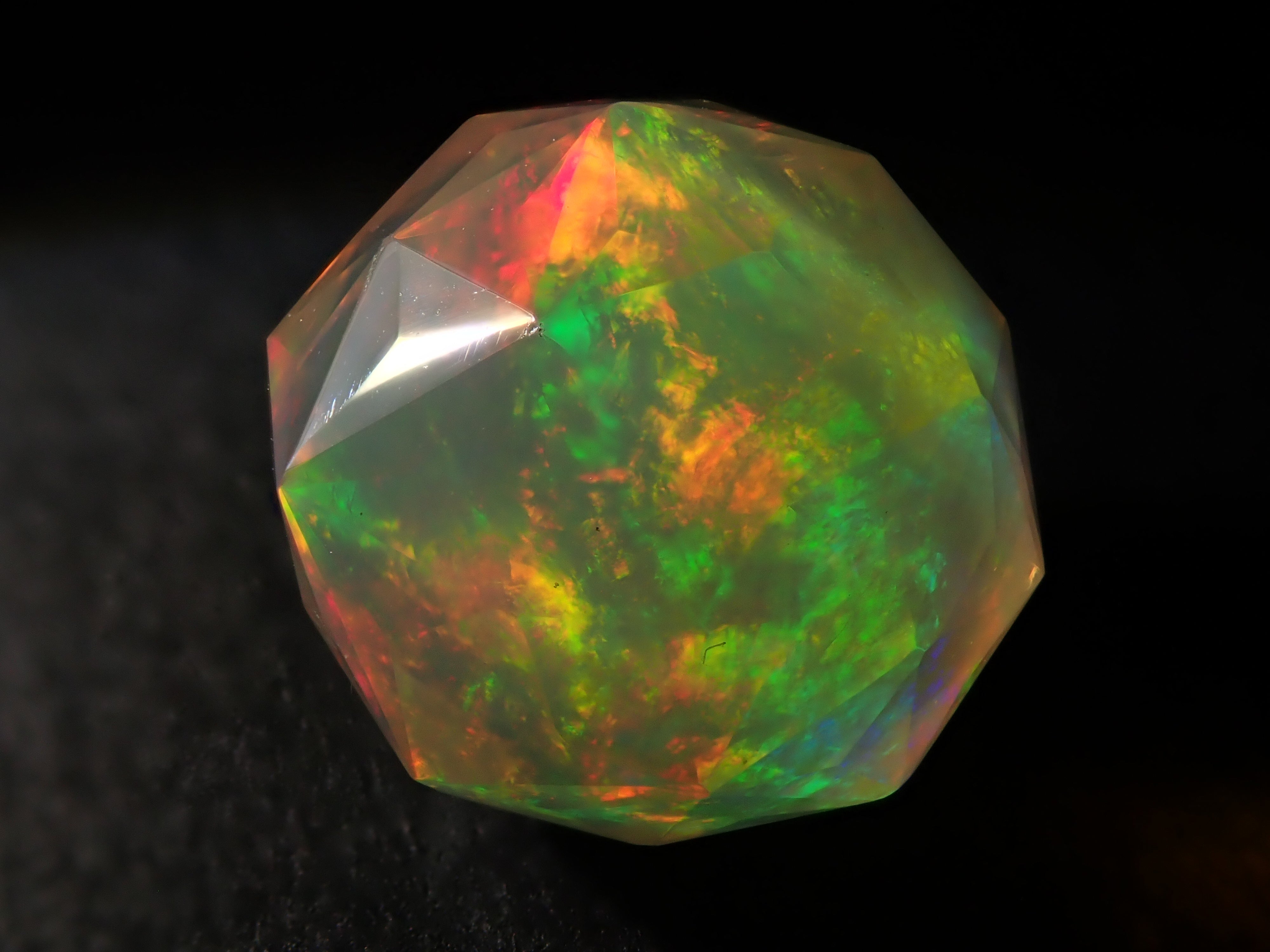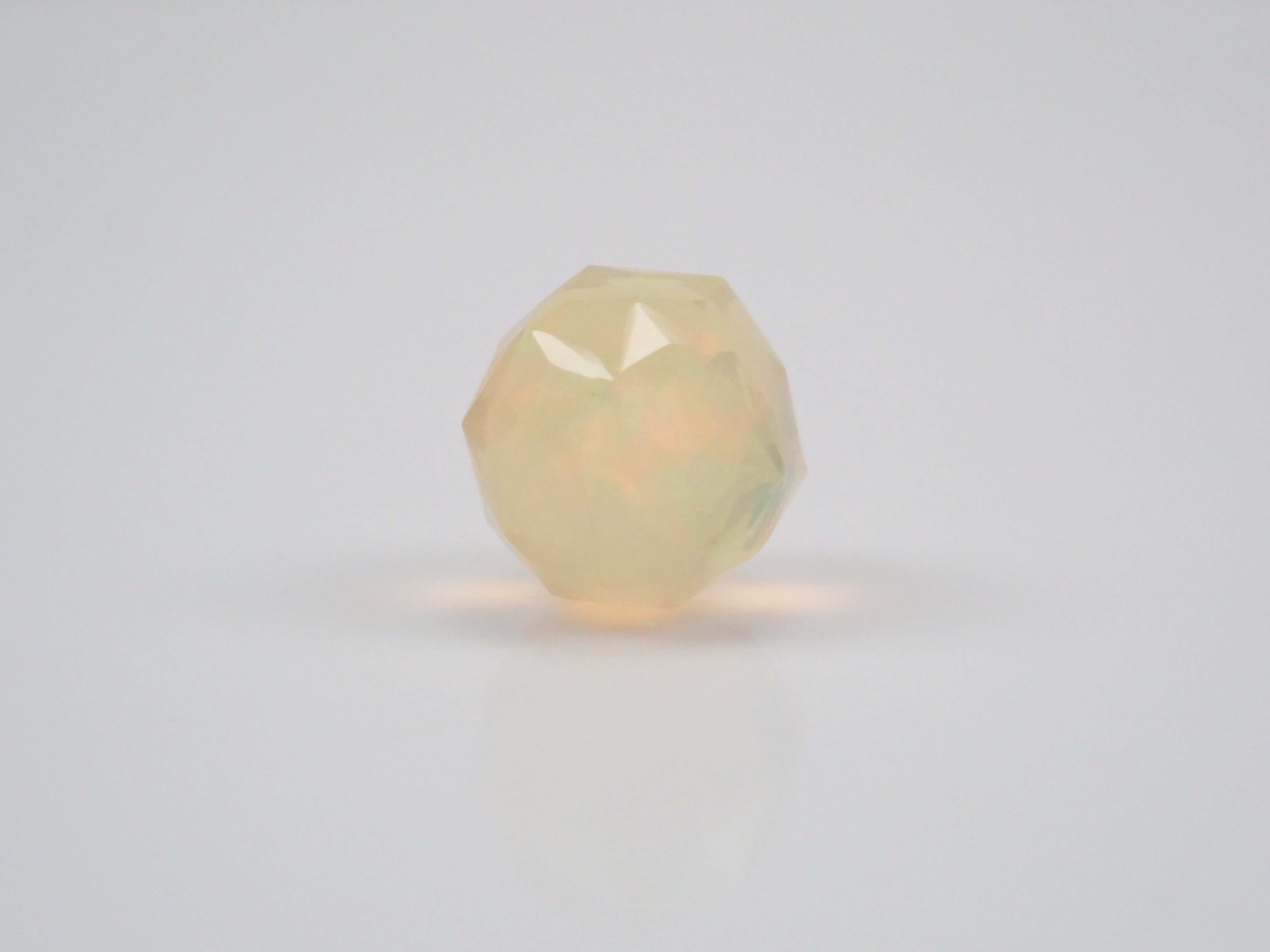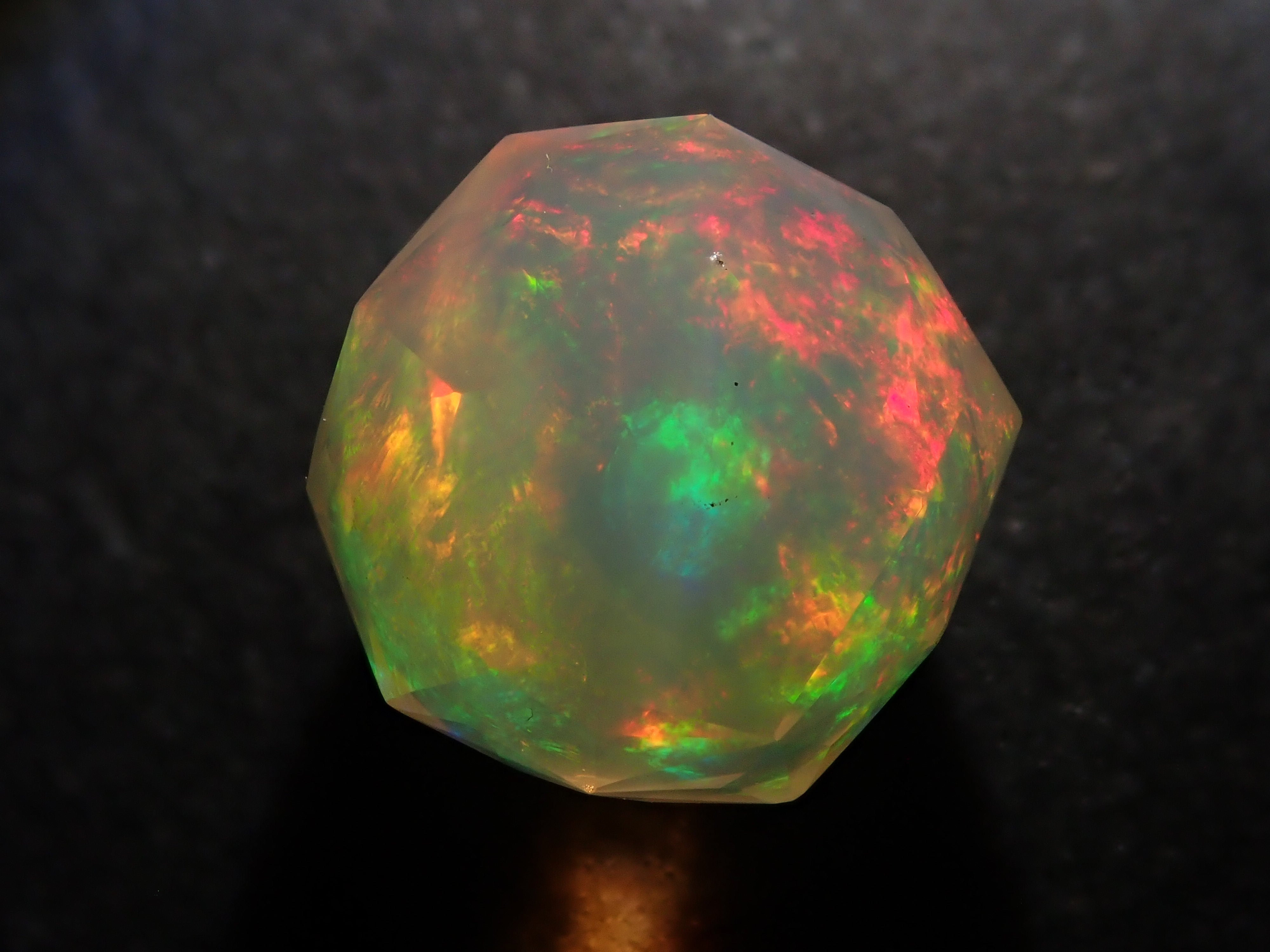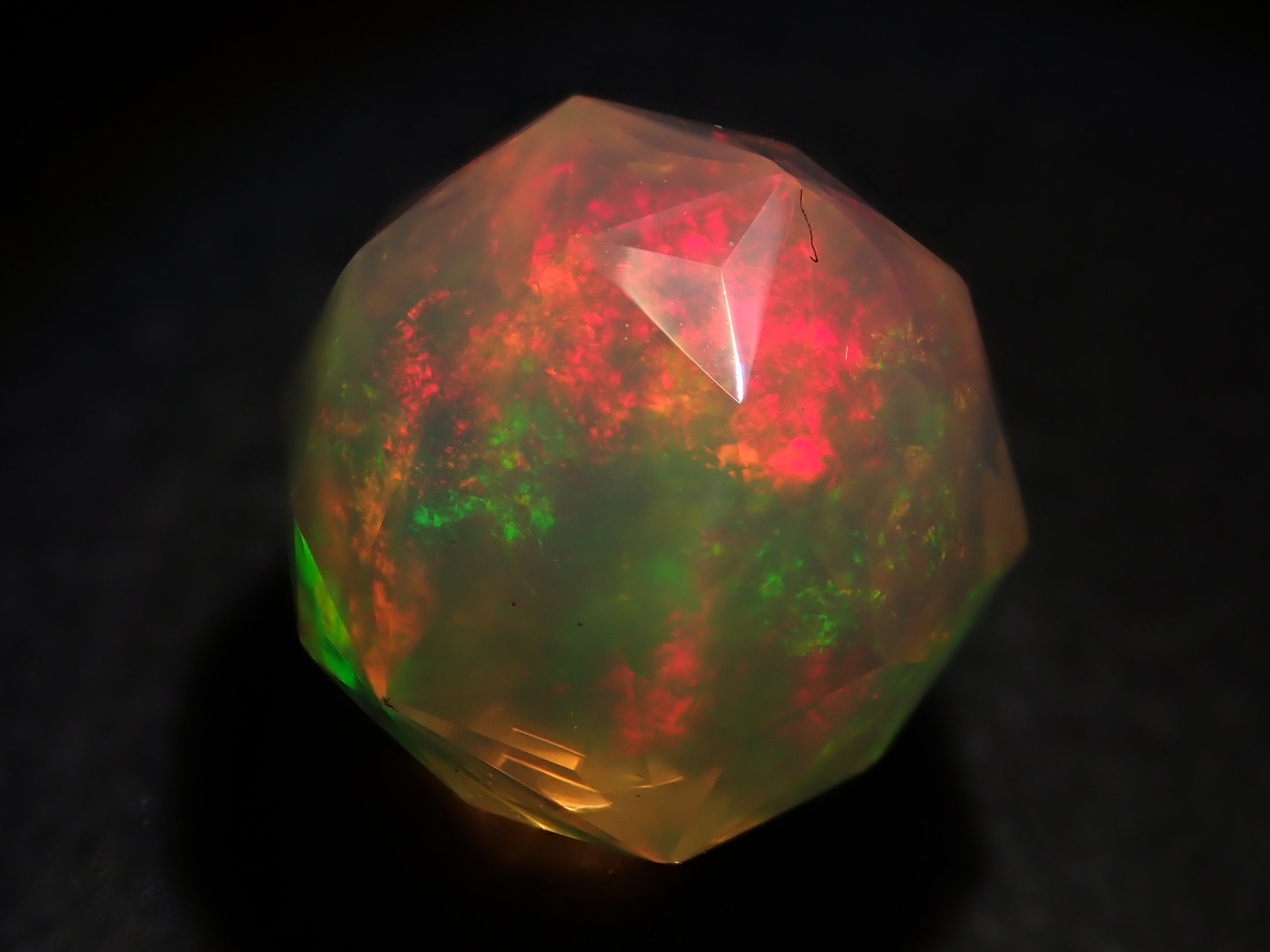這就是KIKYO CUT,只有清水奇蹟的代表人物清水幸雄先生才能創造,他是世界上唯一能做到這一點的人。對於桔梗切割,首先,使用由 12 個正五邊形包圍的正十二面體作為基底,並向每個正五邊形的中心製作帶有脊線的五邊形切割。在此基礎上,進行進一步切割以建立總共 180 個面的多面體。這種切割需要經過許多令人畏懼的步驟和精細的工作才能完成,因其形狀而被稱為“風鈴草切割”。這是火蛋白石風鈴草切工,8.9 毫米。