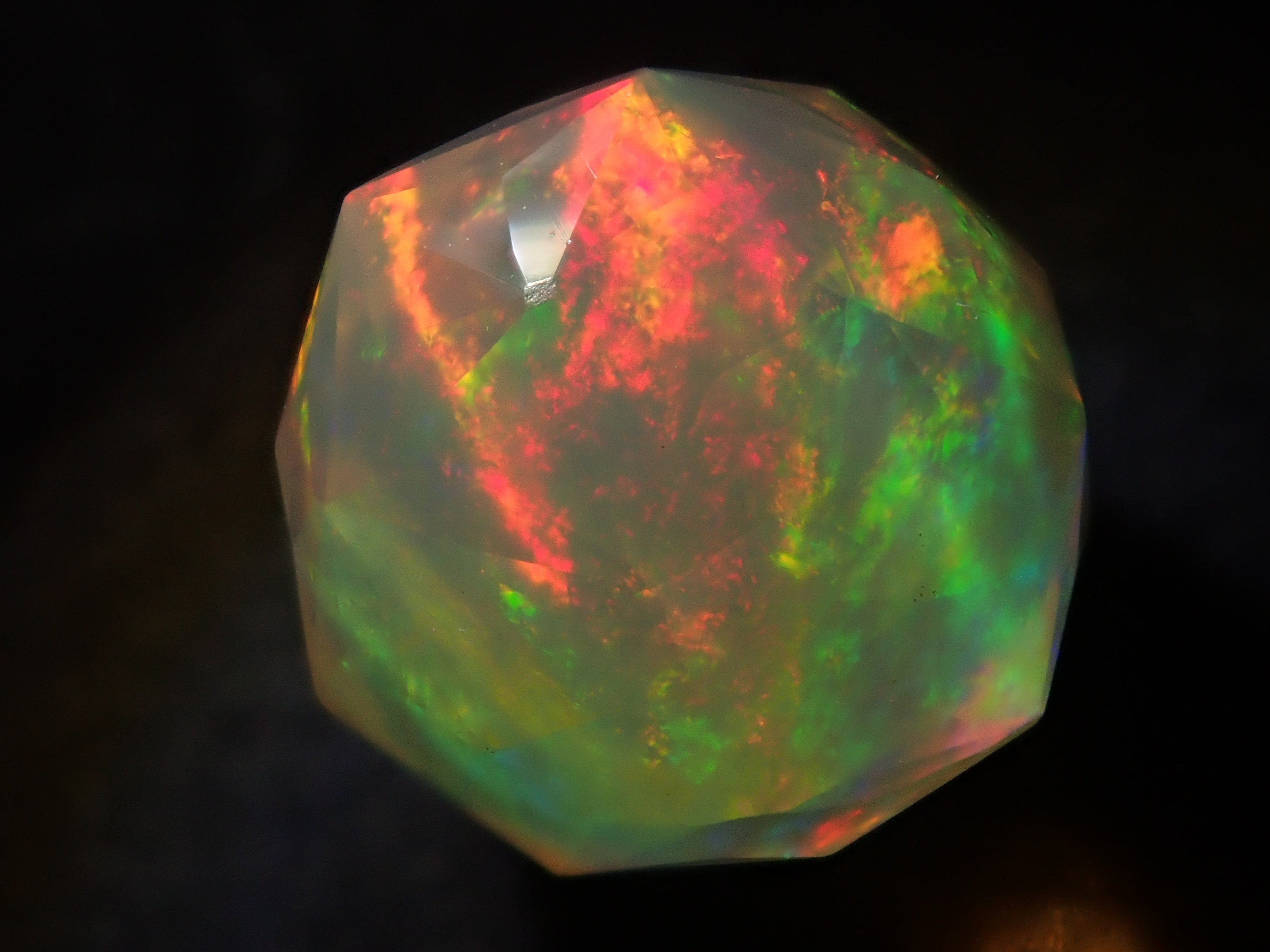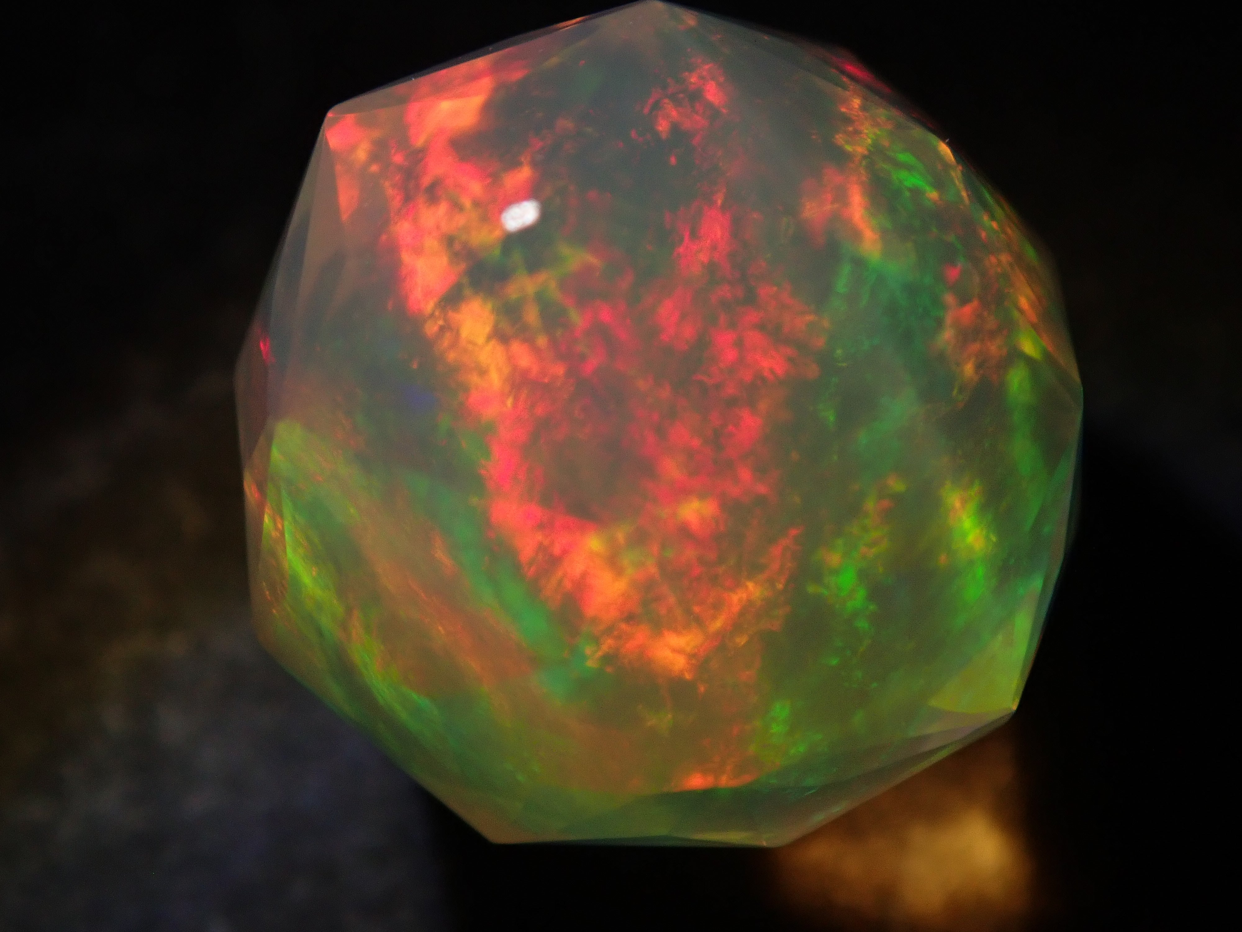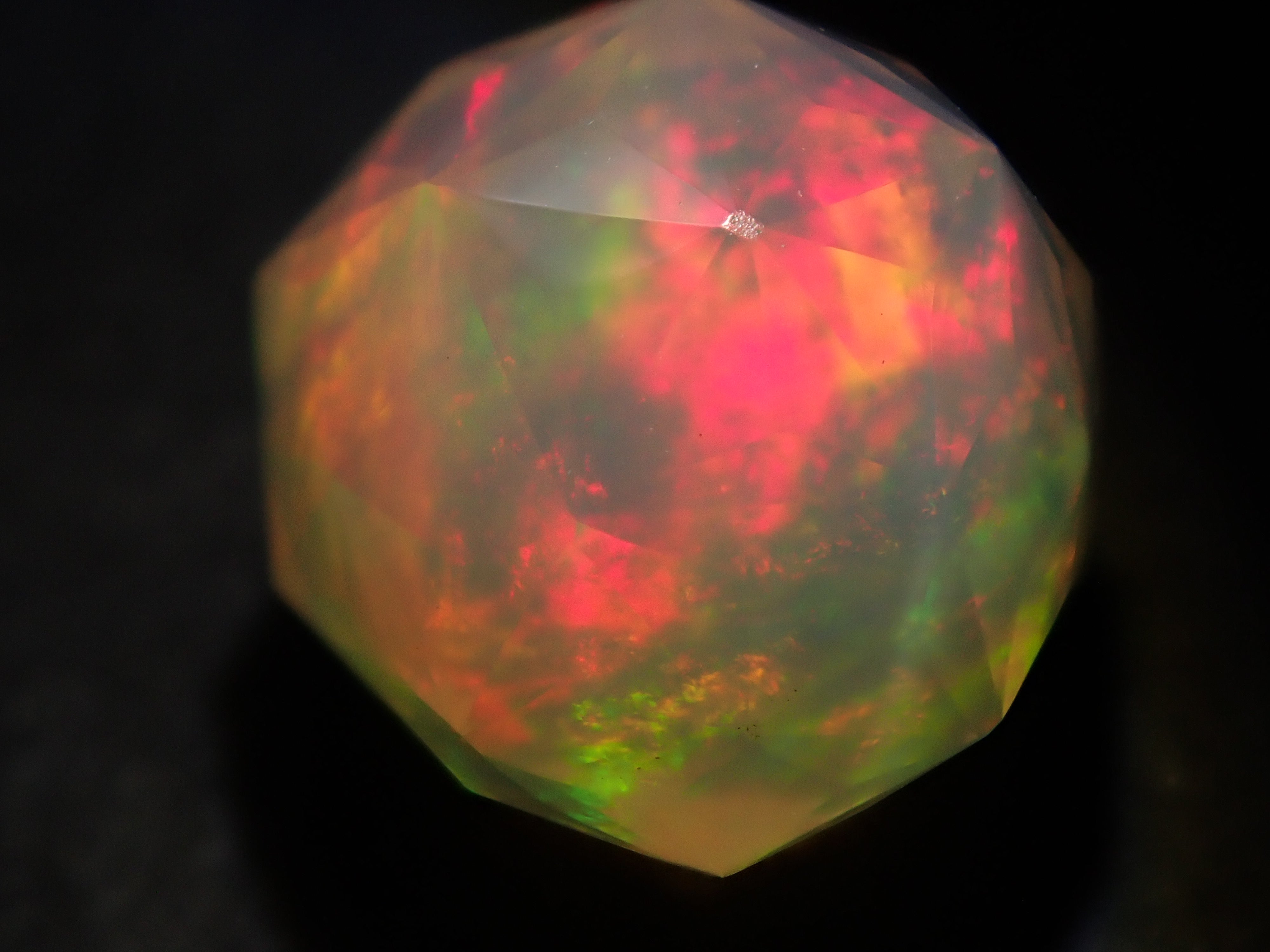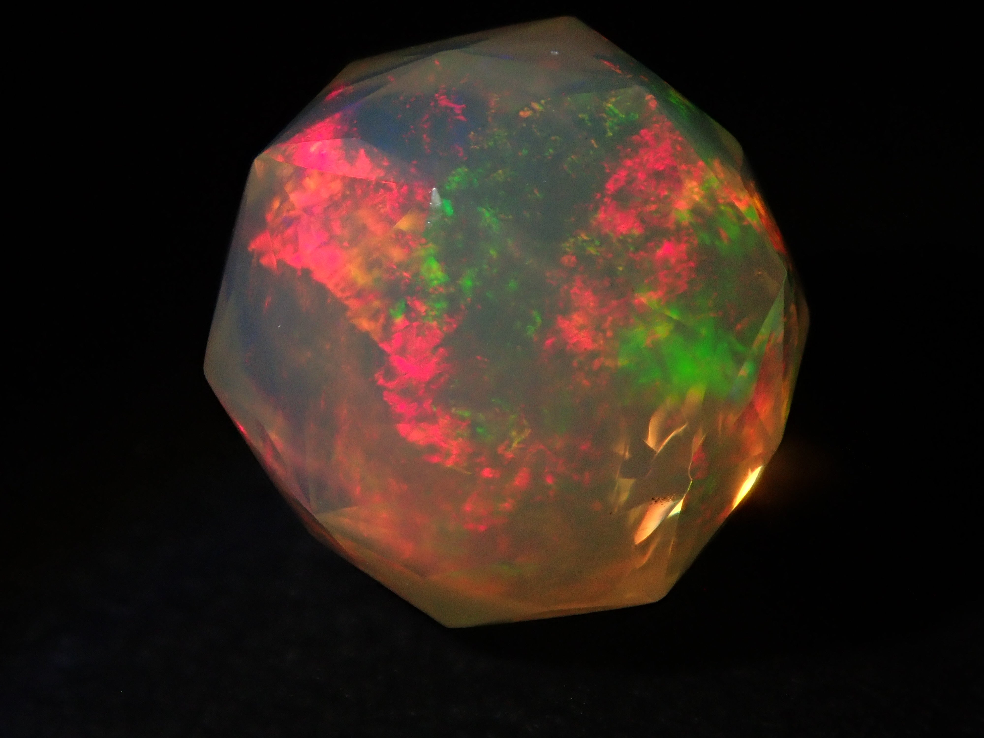 這就是KIKYO CUT,只有清水奇蹟的代表人物清水幸雄先生才能創造,他是世界上唯一能做到這一點的人。對於桔梗切割,首先,使用由 12 個正五邊形包圍的正十二面體作為基底,並向每個正五邊形的中心製作帶有脊線的五邊形切割。在此基礎上,進行進一步切割以建立總共 180 個面的多面體。這種切割需要經過許多令人畏懼的步驟和精細的工作才能完成,因其形狀而被稱為“風鈴草切割”。這是火蛋白石風鈴草切工,8.9 毫米。