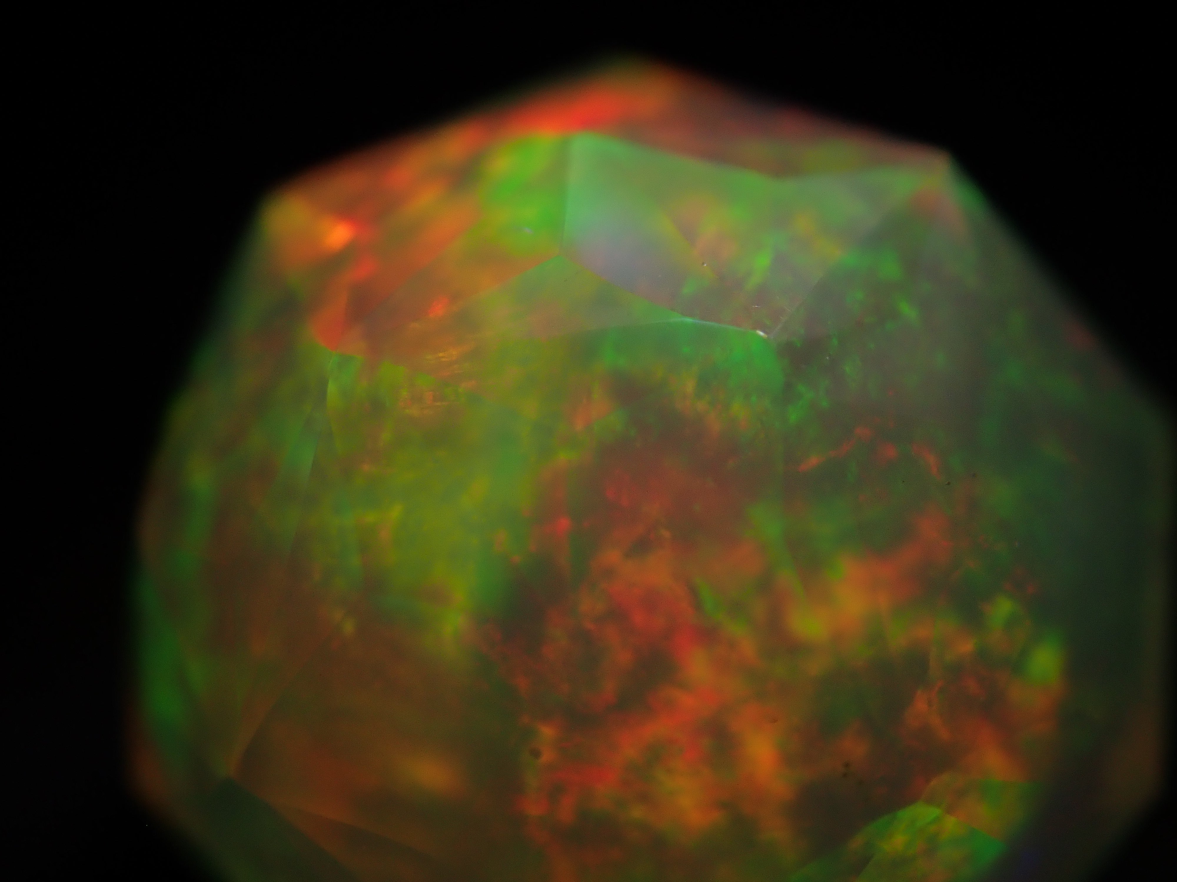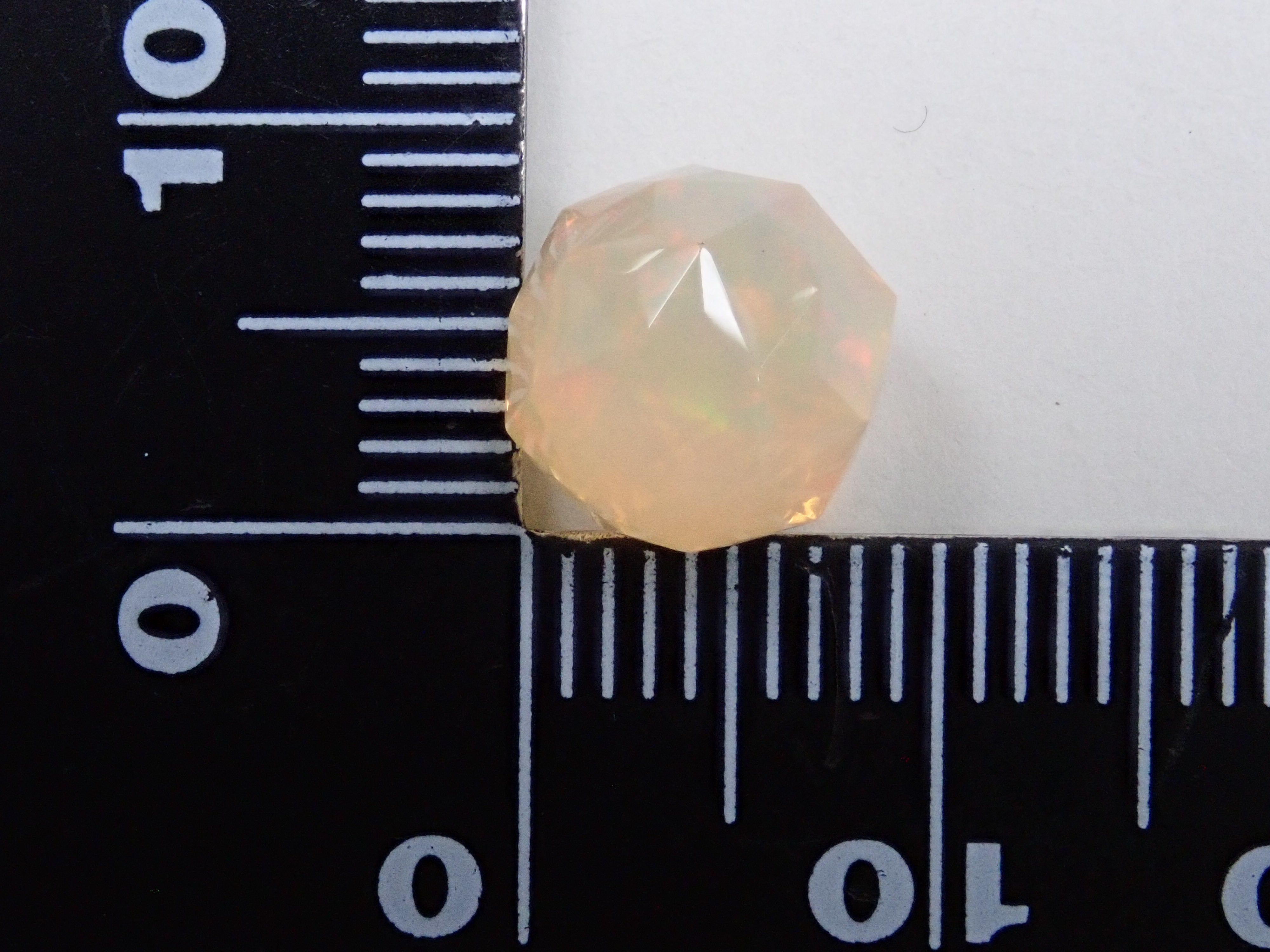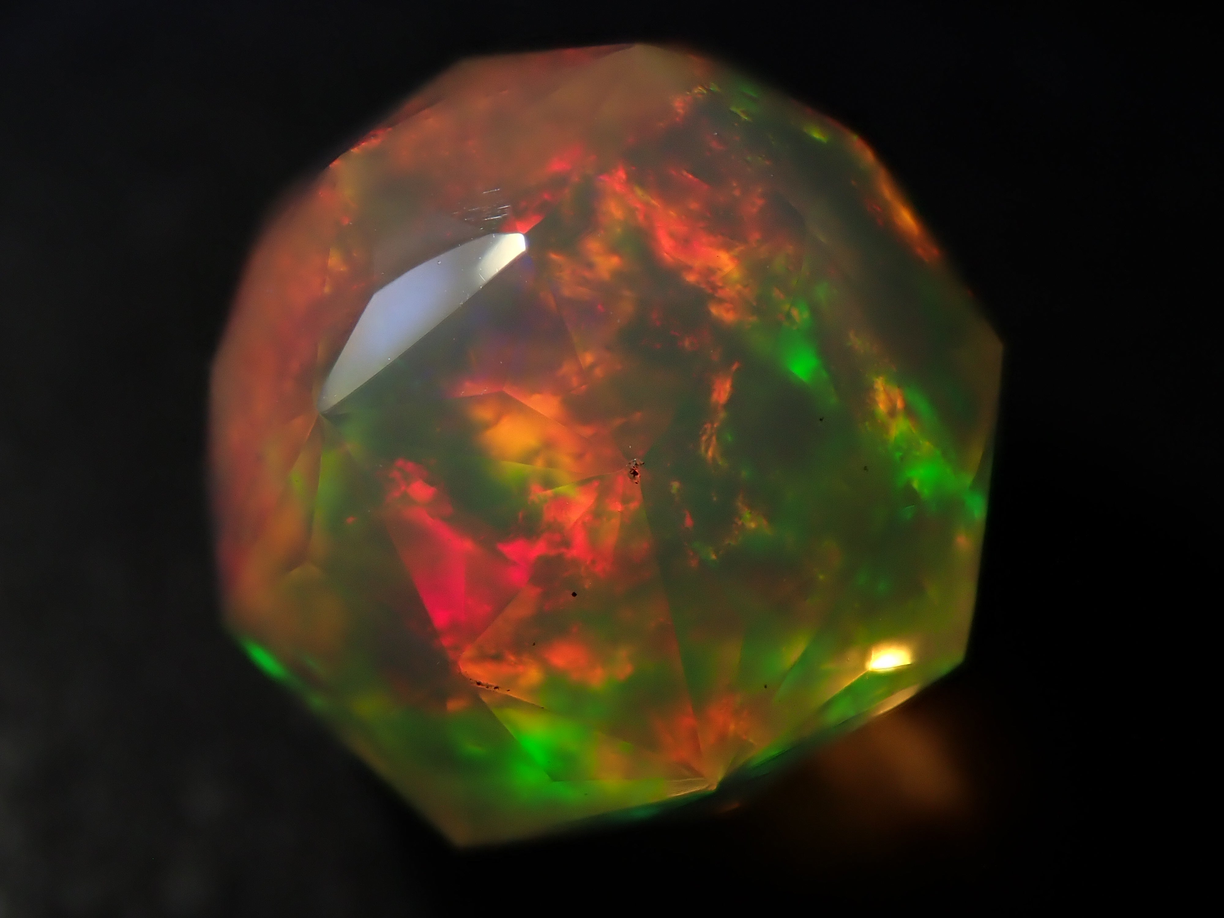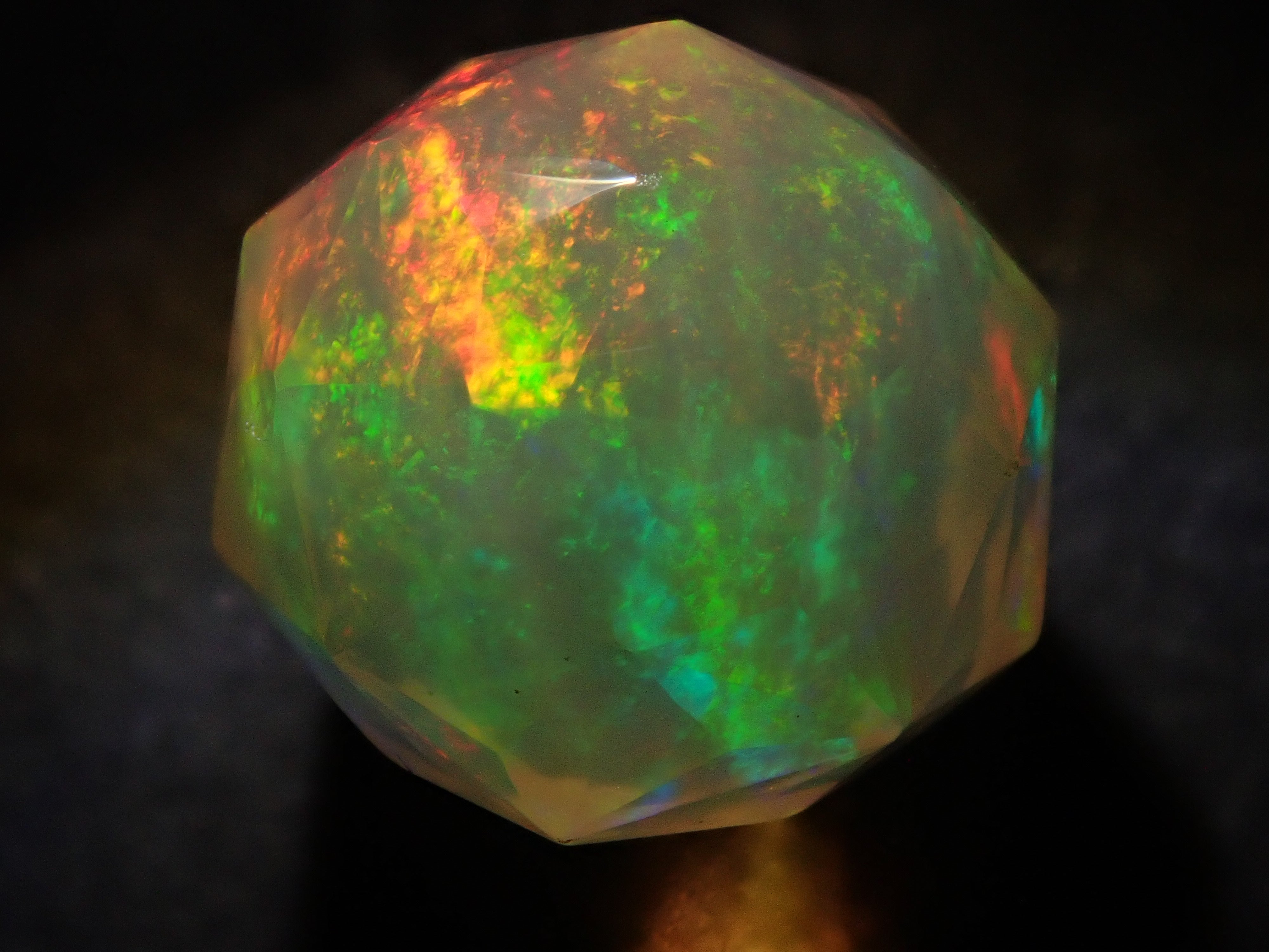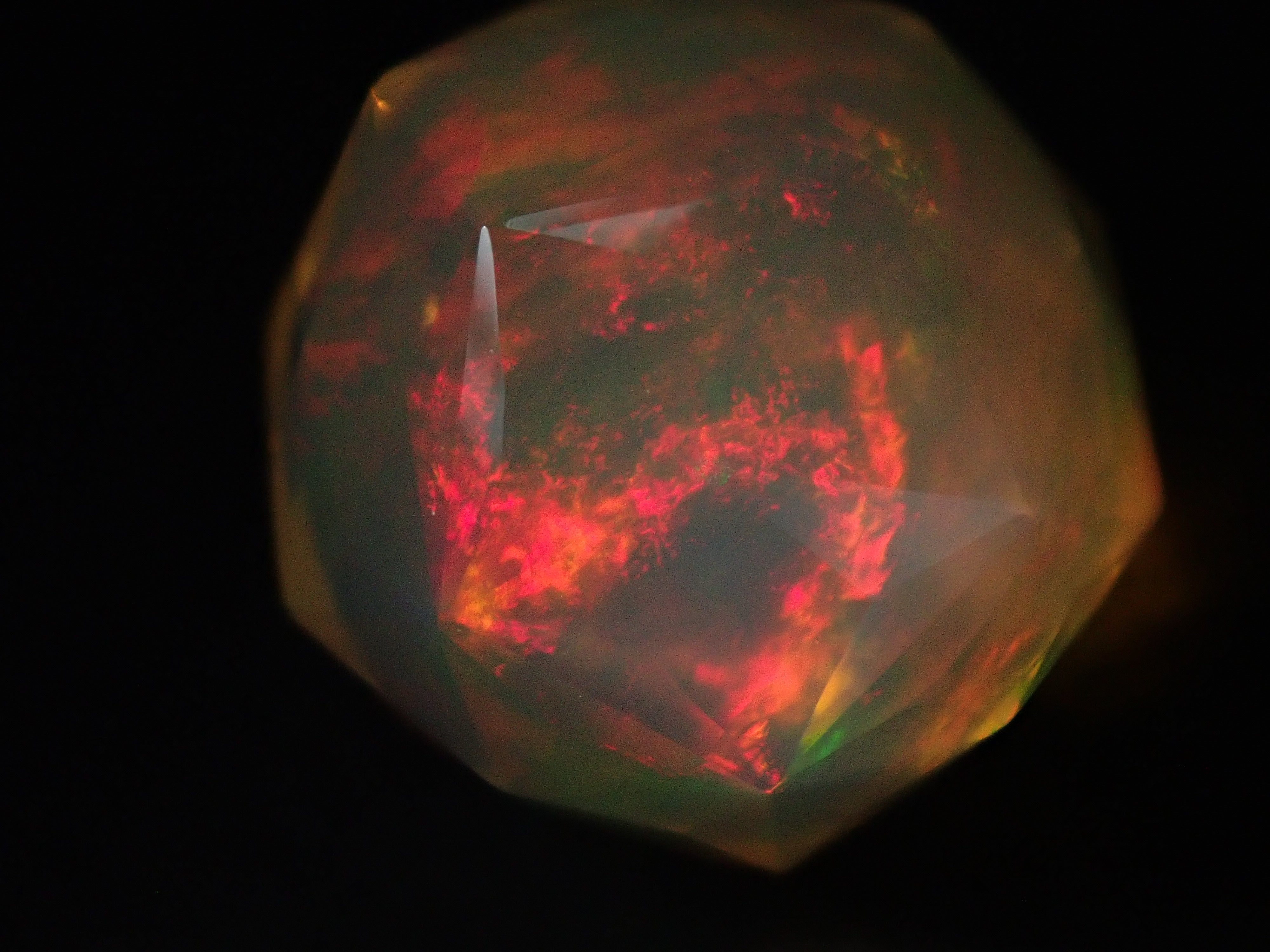 這就是KIKYO CUT,只有清水奇蹟的代表人物清水幸雄先生才能創造,他是世界上唯一能做到這一點的人。對於桔梗切割,首先,使用由 12 個正五邊形包圍的正十二面體作為基底,並向每個正五邊形的中心製作帶有脊線的五邊形切割。在此基礎上,進行進一步切割以建立總共 180 個面的多面體。這種切割需要經過許多令人畏懼的步驟和精細的工作才能完成,因其形狀而被稱為“風鈴草切割”。這是火蛋白石風鈴草切工,8.9 毫米。