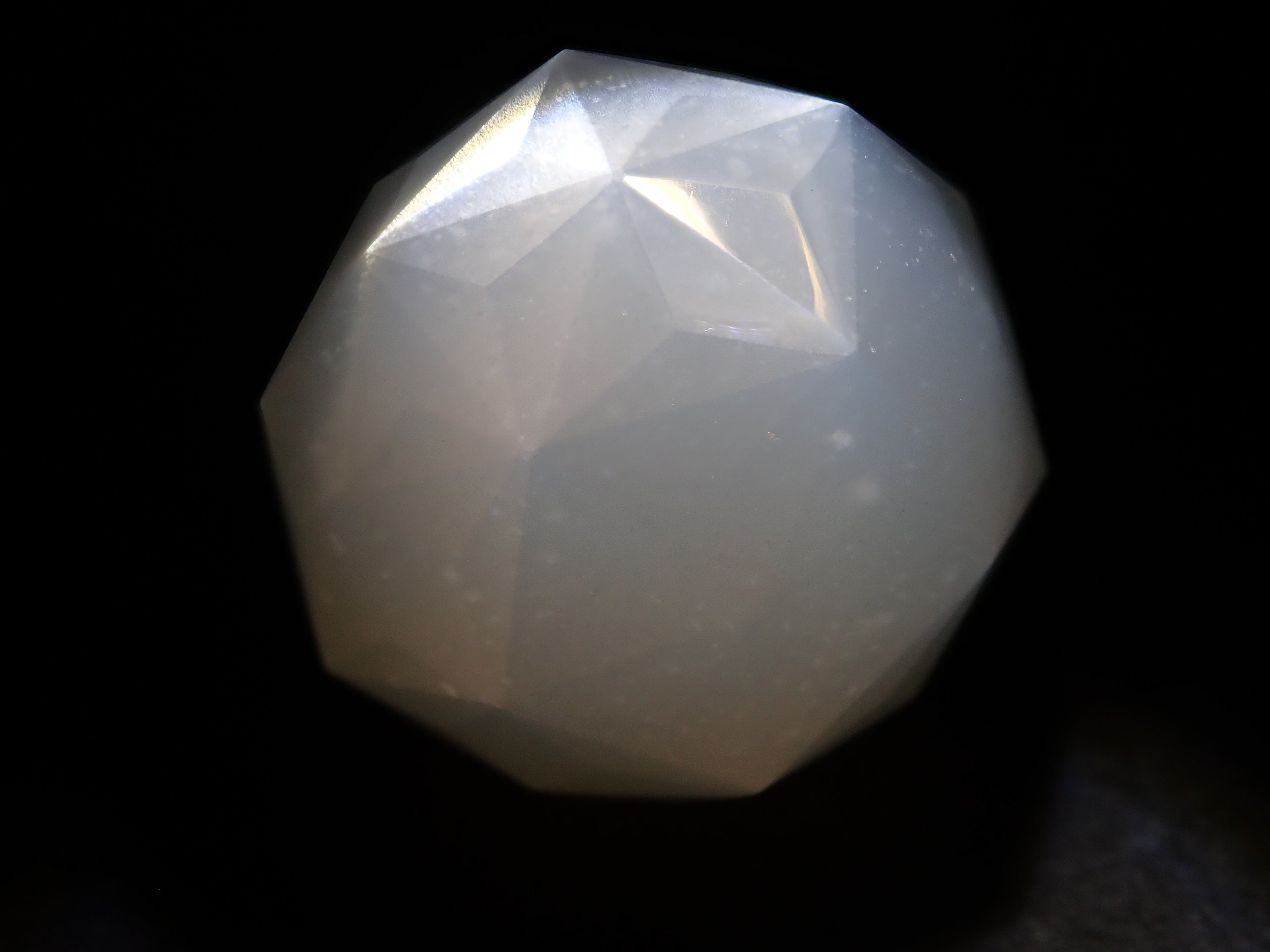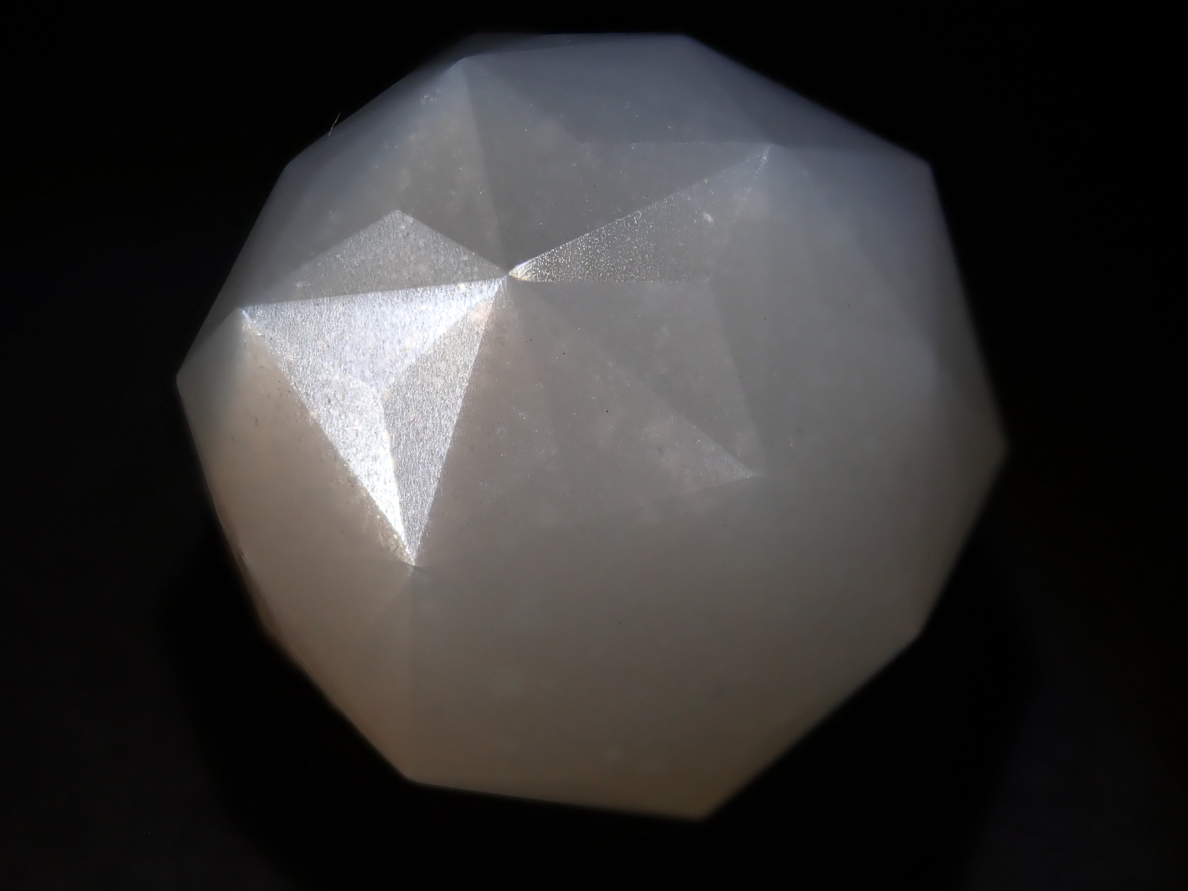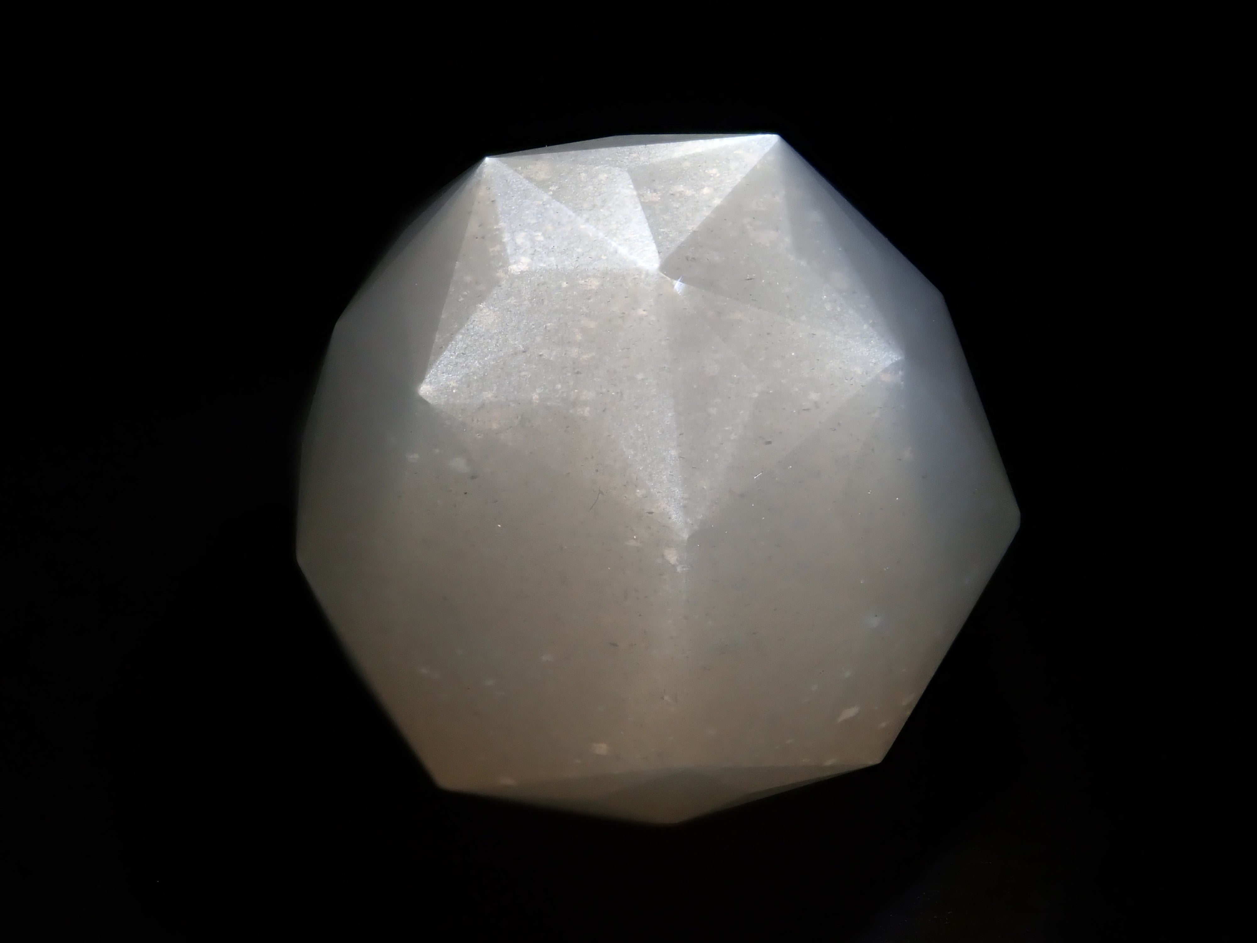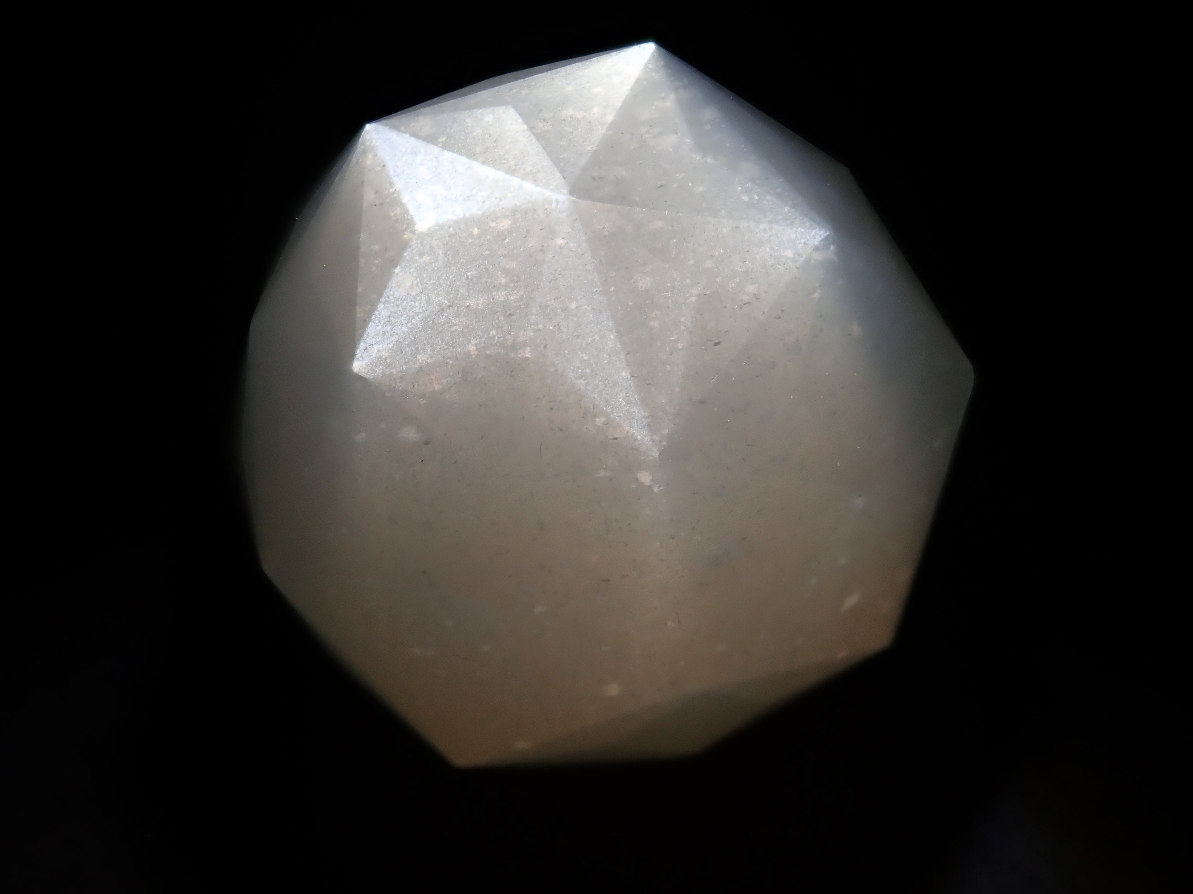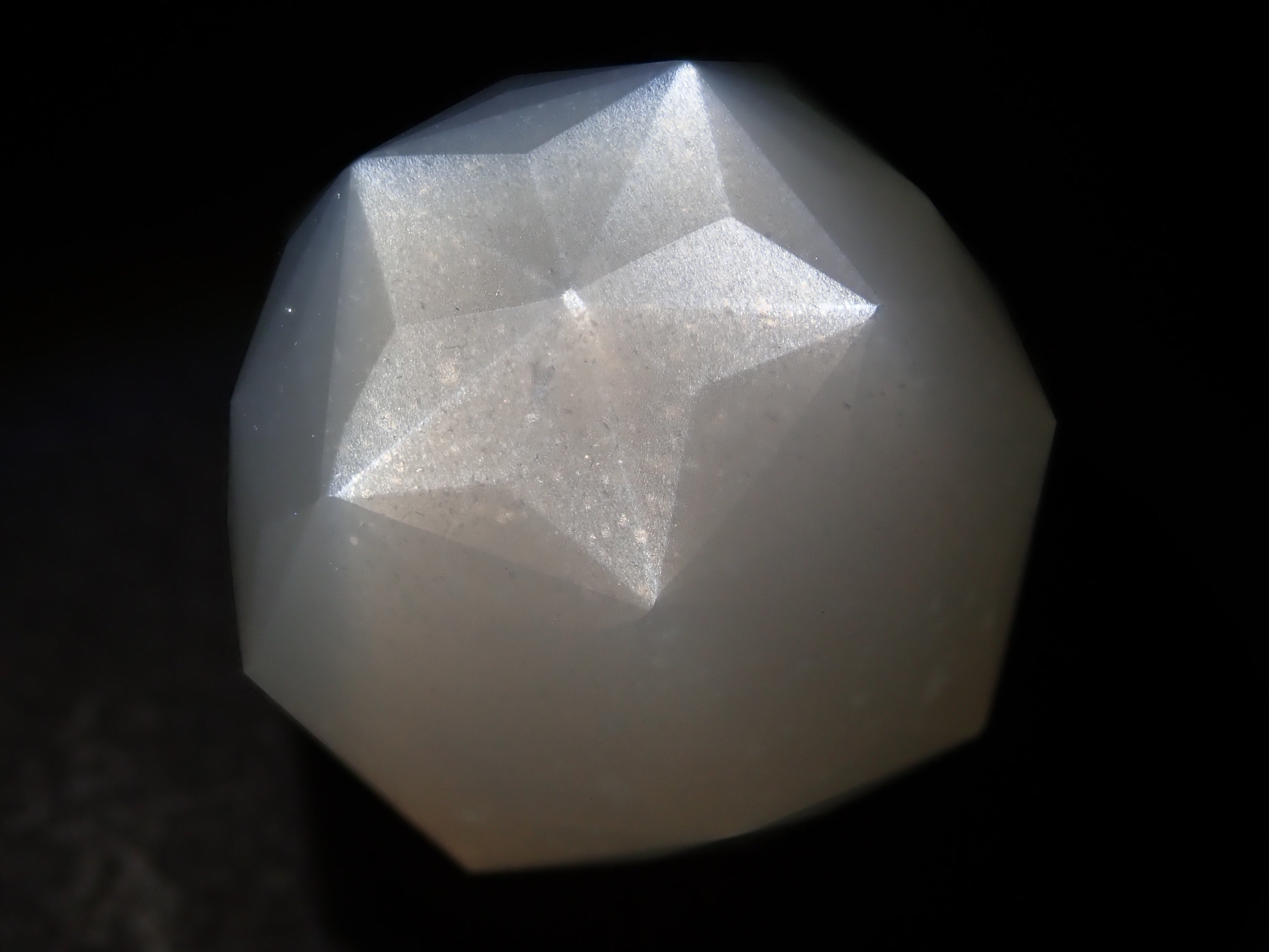 一顆看起來像聚光燈的月光石在中間閃閃發光。這種類似月光的明亮光學效果是月光石的標誌。照片是使用筆燈拍攝的。這就是KIKYO CUT,只有清水奇蹟的代表人物清水幸雄先生才能創造,他是世界上唯一能做到這一點的人。對於桔梗切割,首先,使用由 12 個正五邊形包圍的正十二面體作為基底,並向每個正五邊形的中心製作帶有脊線的五邊形切割。在此基礎上,進行進一步切割以建立總共 180 個面的多面體。這種切割需要經過許多令人畏懼的步驟和精細的工作才能完成,因其形狀而被稱為“風鈴草切割”。這是一顆白色月光石風鈴草形切工,16.7 毫米。包括一個特殊的補丁。