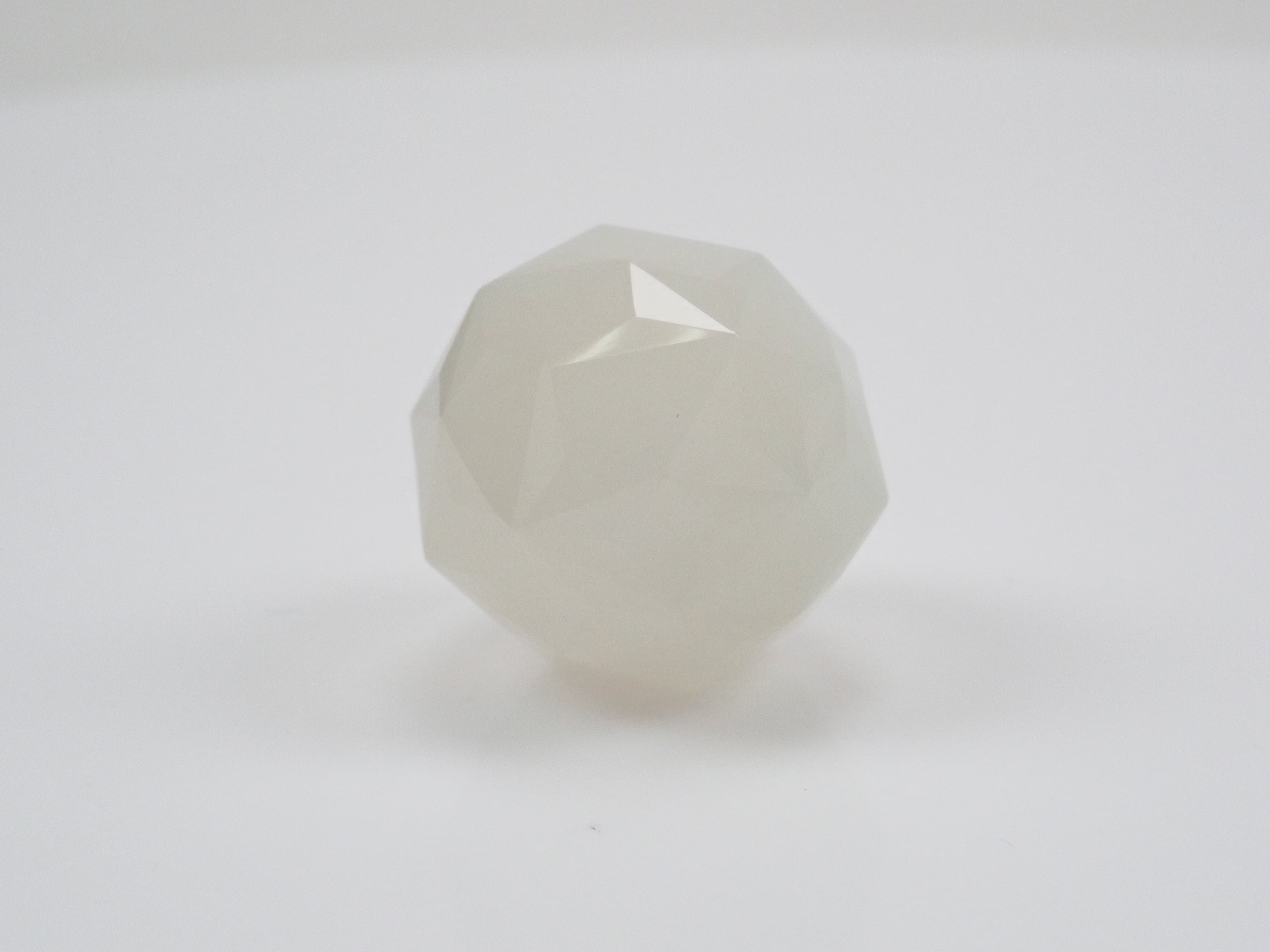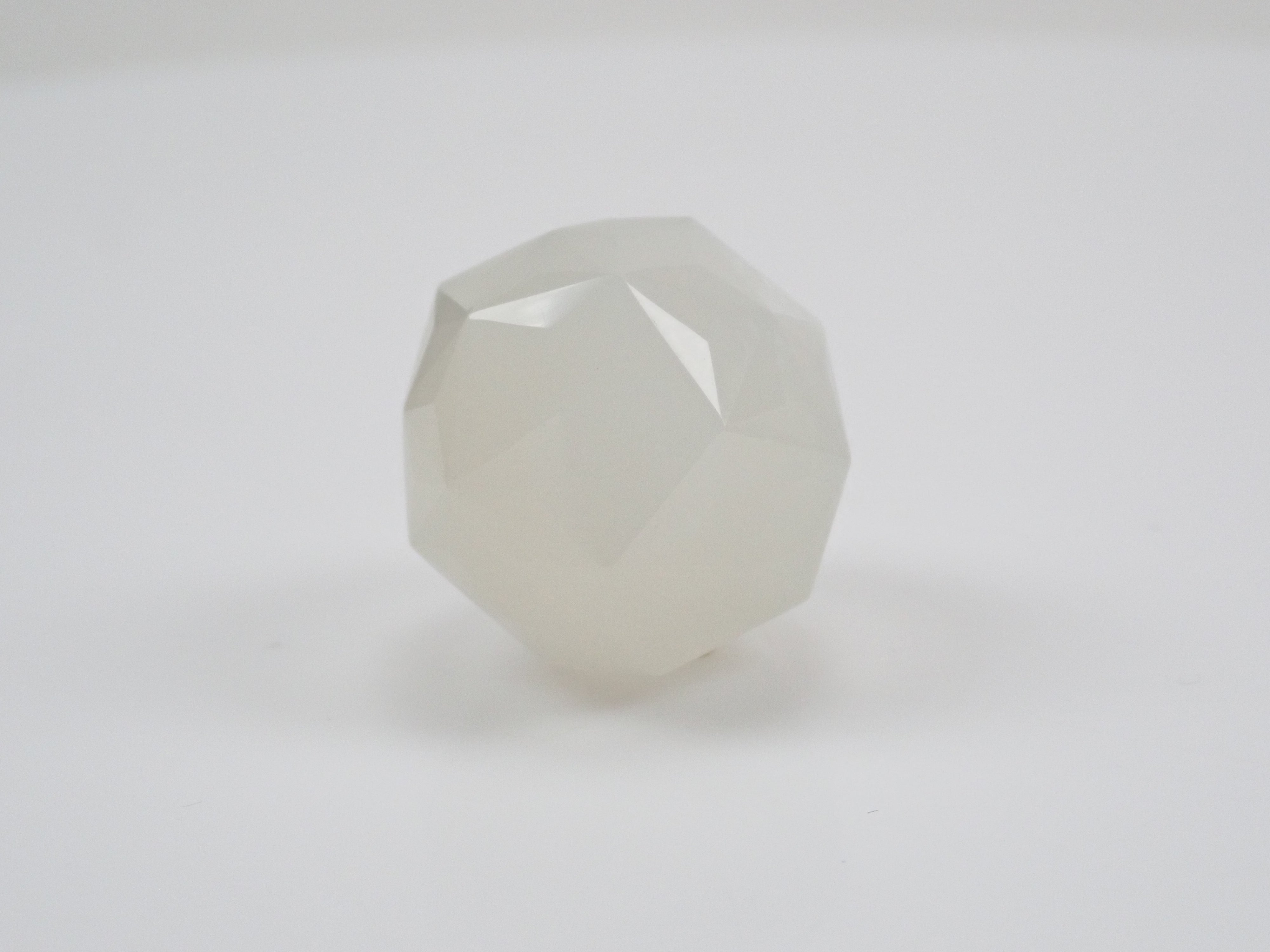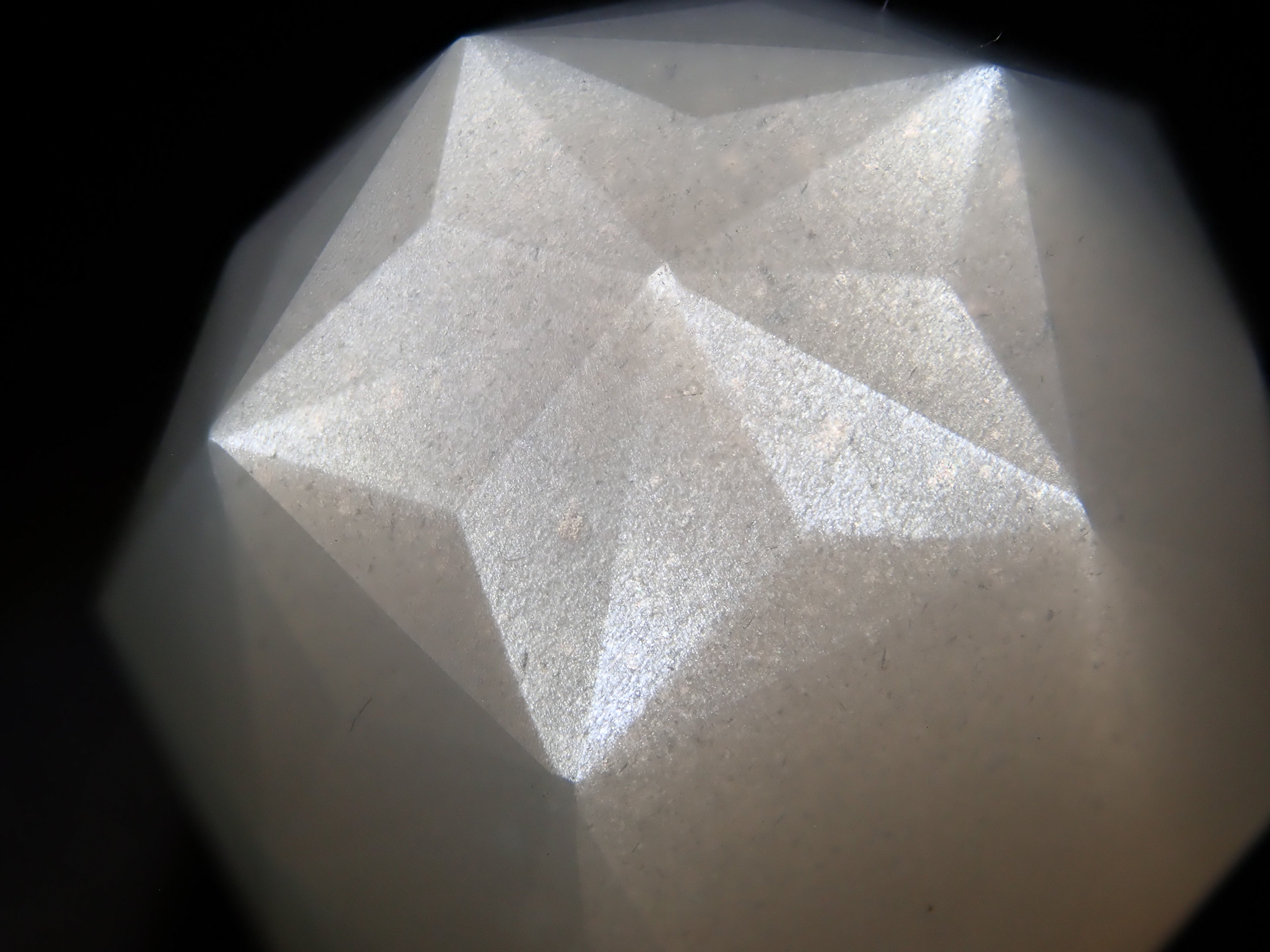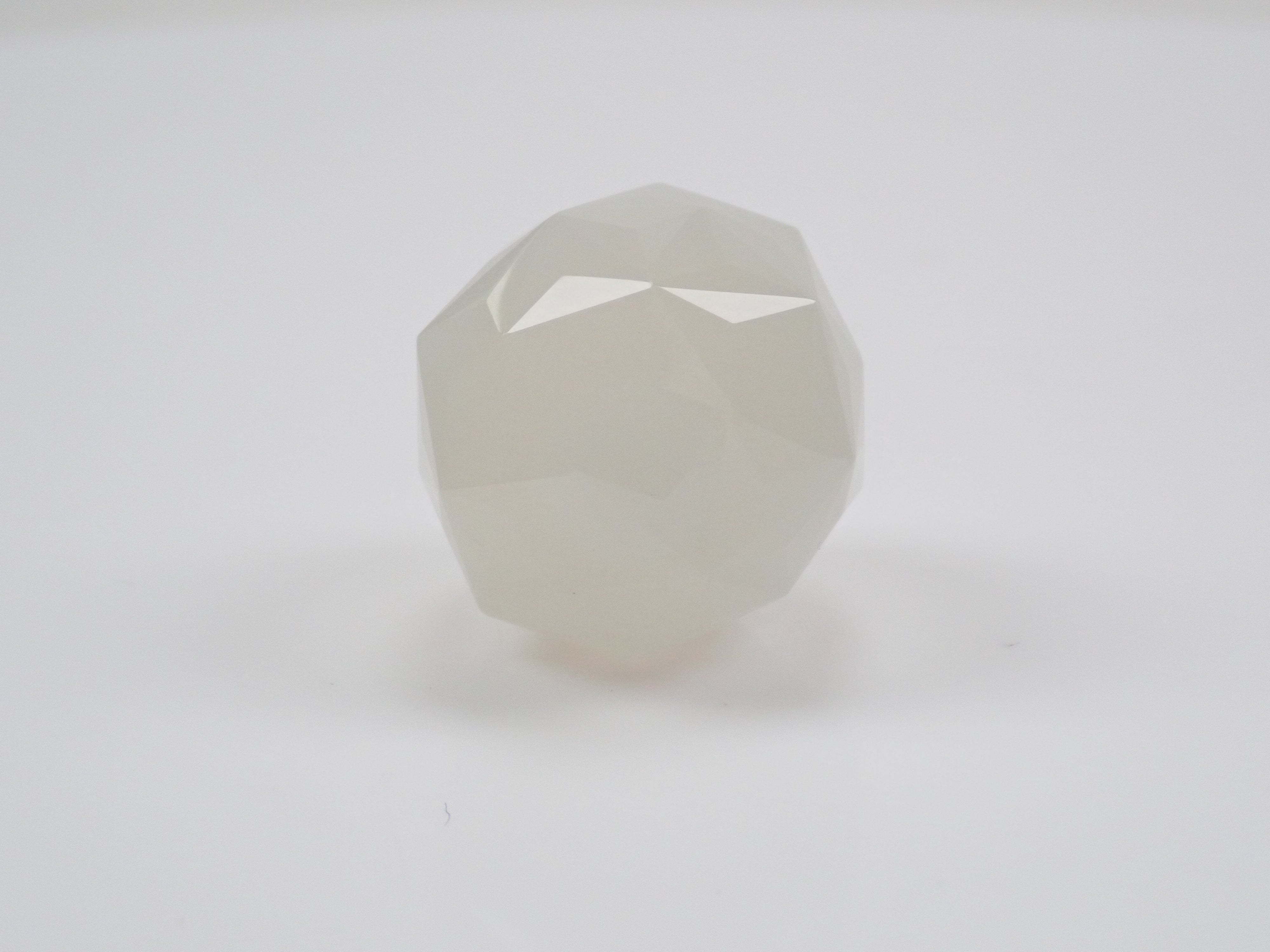 一顆看起來像聚光燈的月光石在中間閃閃發光。這種類似月光的明亮光學效果是月光石的標誌。照片是使用筆燈拍攝的。這就是KIKYO CUT,只有清水奇蹟的代表人物清水幸雄先生才能創造,他是世界上唯一能做到這一點的人。對於桔梗切割,首先,使用由 12 個正五邊形包圍的正十二面體作為基底,並向每個正五邊形的中心製作帶有脊線的五邊形切割。在此基礎上,進行進一步切割以建立總共 180 個面的多面體。這種切割需要經過許多令人畏懼的步驟和精細的工作才能完成,因其形狀而被稱為“風鈴草切割”。這是一顆白色月光石風鈴草形切工,16.7 毫米。包括一個特殊的補丁。