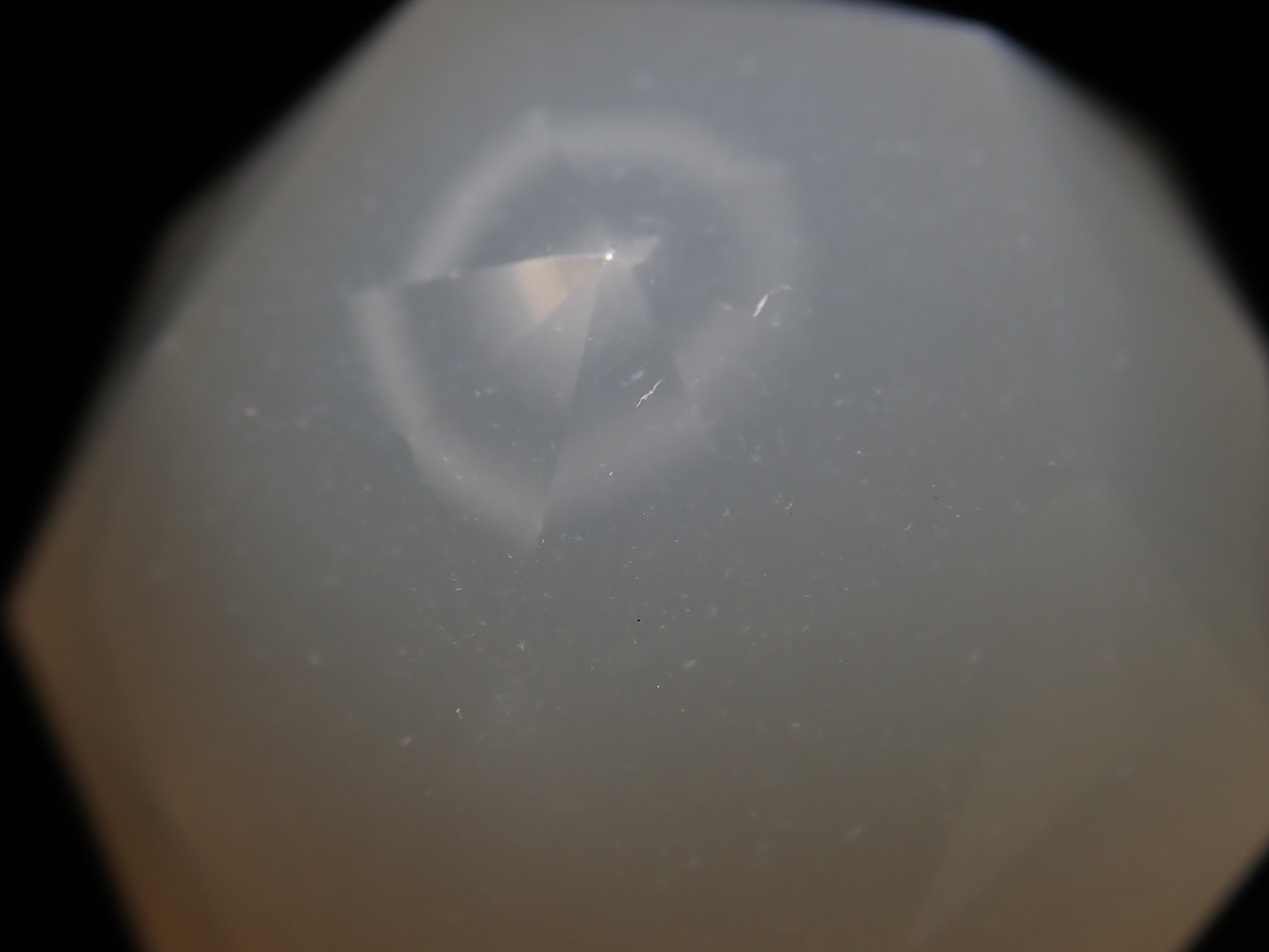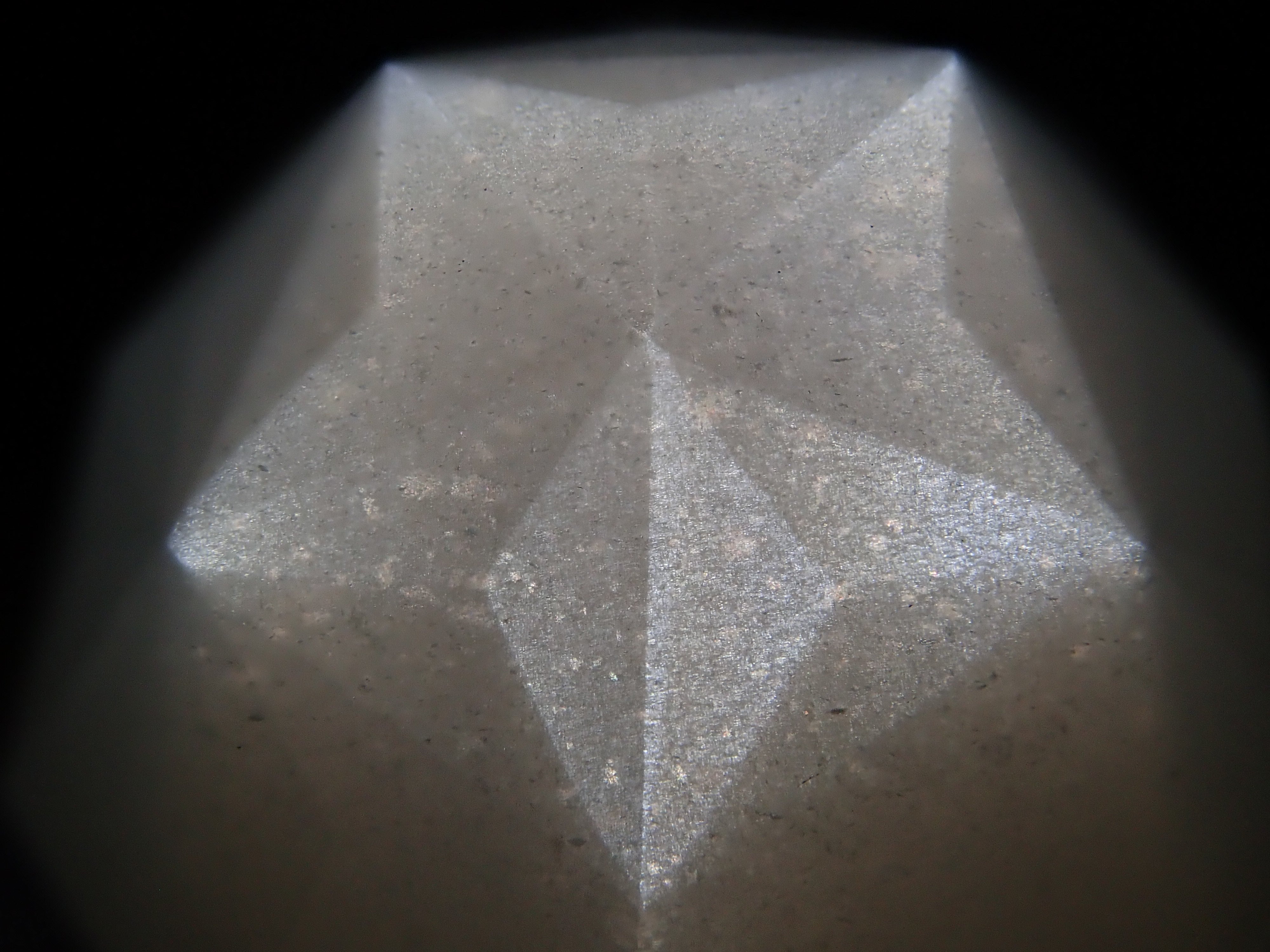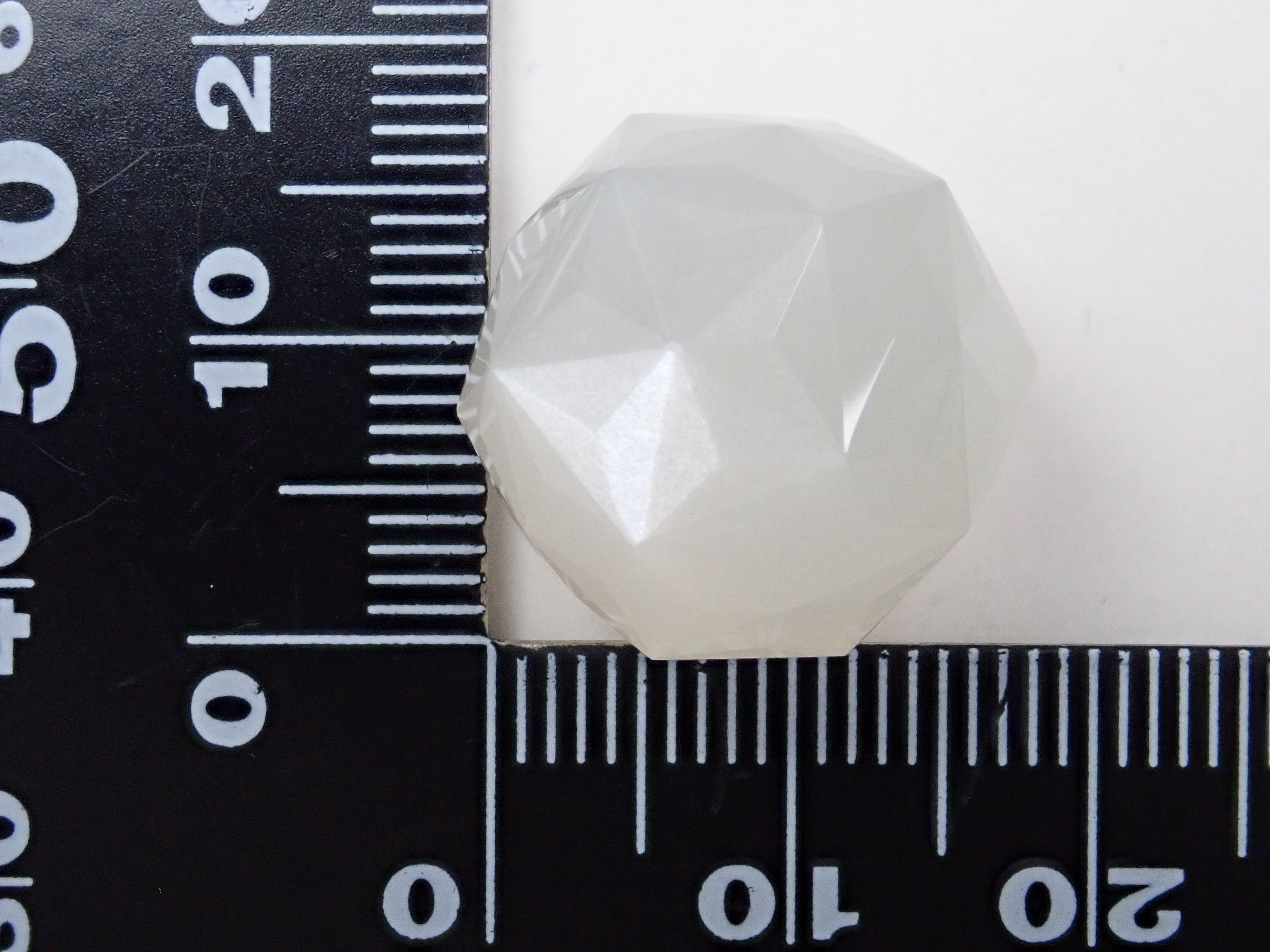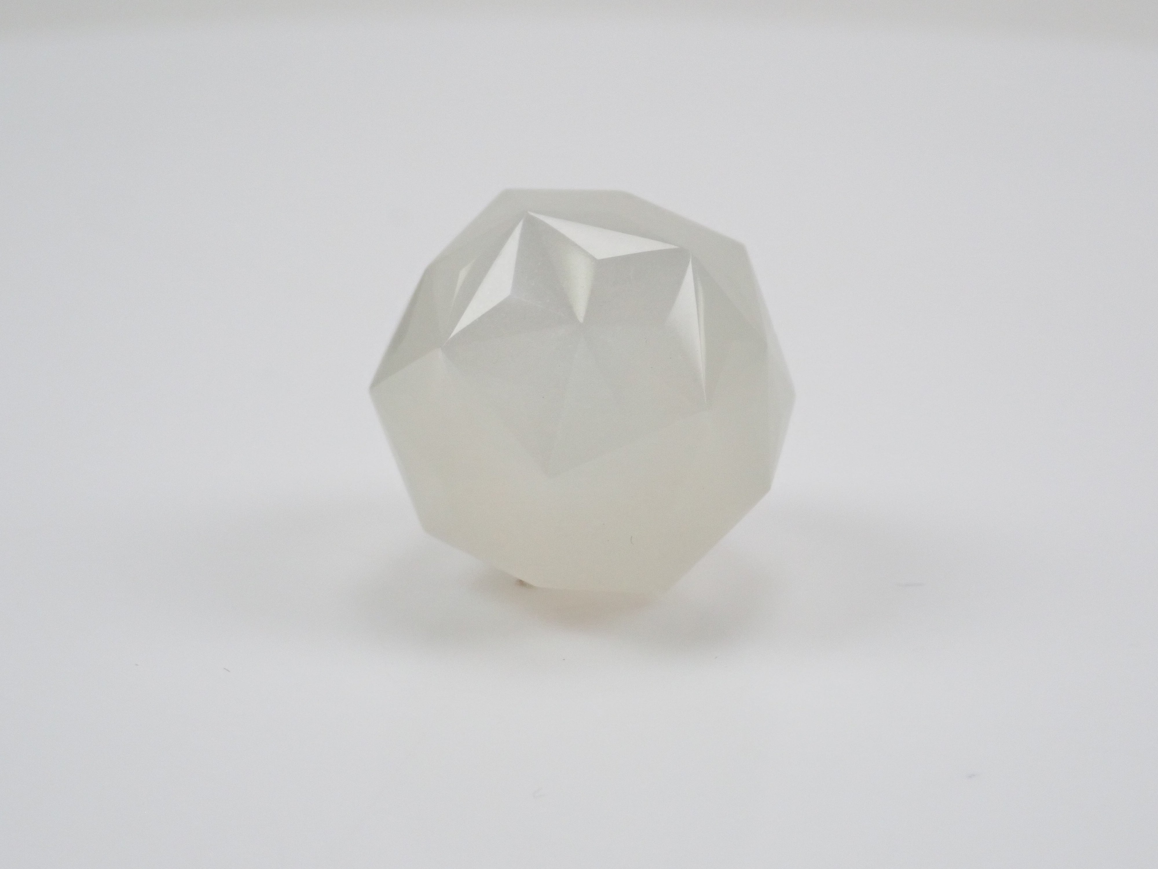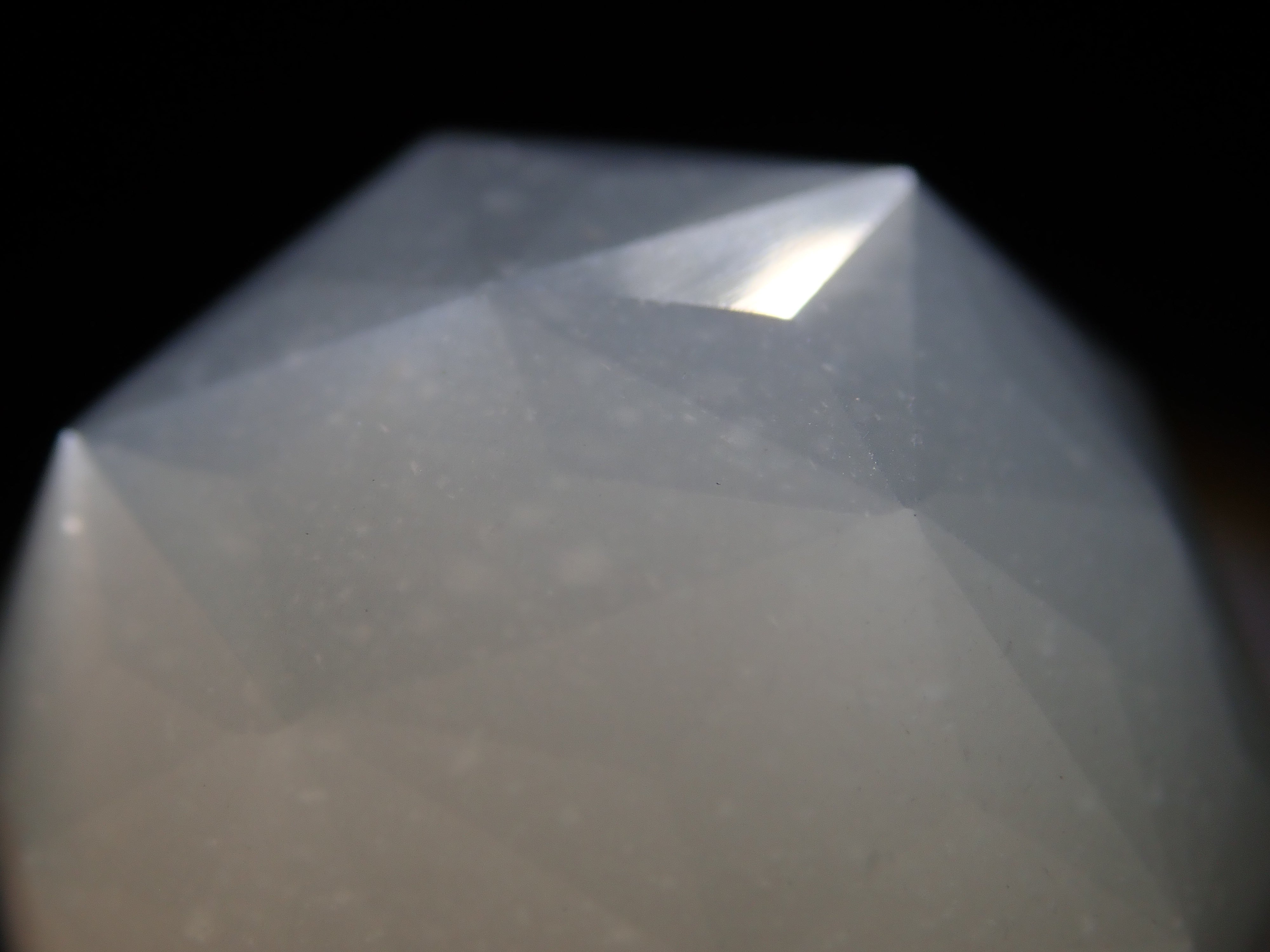 一顆看起來像聚光燈的月光石在中間閃閃發光。這種類似月光的明亮光學效果是月光石的標誌。照片是使用筆燈拍攝的。這就是KIKYO CUT,只有清水奇蹟的代表人物清水幸雄先生才能創造,他是世界上唯一能做到這一點的人。對於桔梗切割,首先,使用由 12 個正五邊形包圍的正十二面體作為基底,並向每個正五邊形的中心製作帶有脊線的五邊形切割。在此基礎上,進行進一步切割以建立總共 180 個面的多面體。這種切割需要經過許多令人畏懼的步驟和精細的工作才能完成,因其形狀而被稱為“風鈴草切割”。這是一顆白色月光石風鈴草形切工,16.7 毫米。包括一個特殊的補丁。