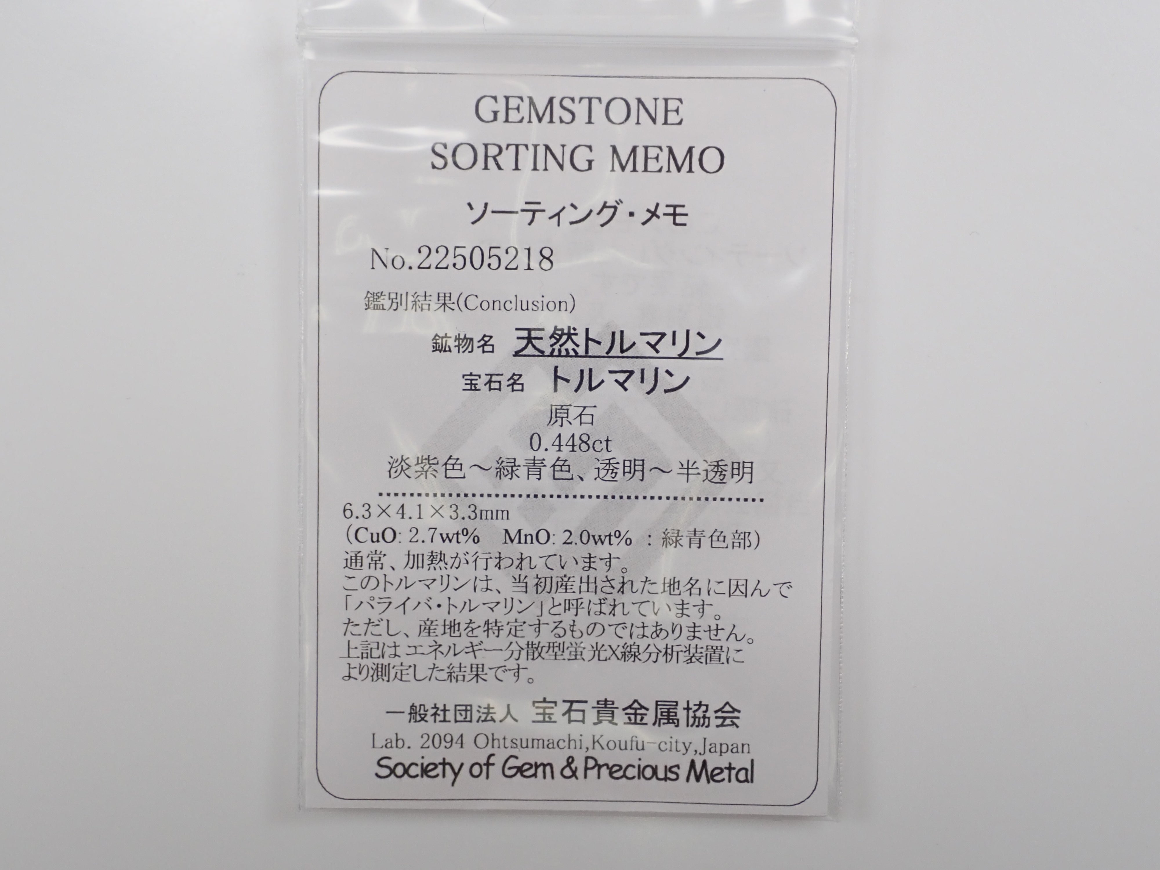 帕拉伊巴碧璽有著不同於大海的藍色或天空的藍色的精緻色彩。它在日本的定義是“含有銅的藍色到綠色碧璽(無論產地)。”它是一種非常受歡迎的寶石。來自巴西(巴塔利亞礦場)的帕拉伊巴碧璽,含 CuO:2.7%,MnO:2.0%。這是購買用於鬆散拋光的高透明度帕拉伊巴碧璽原石。包括來自珠寶和貴金屬協會的分類資訊。