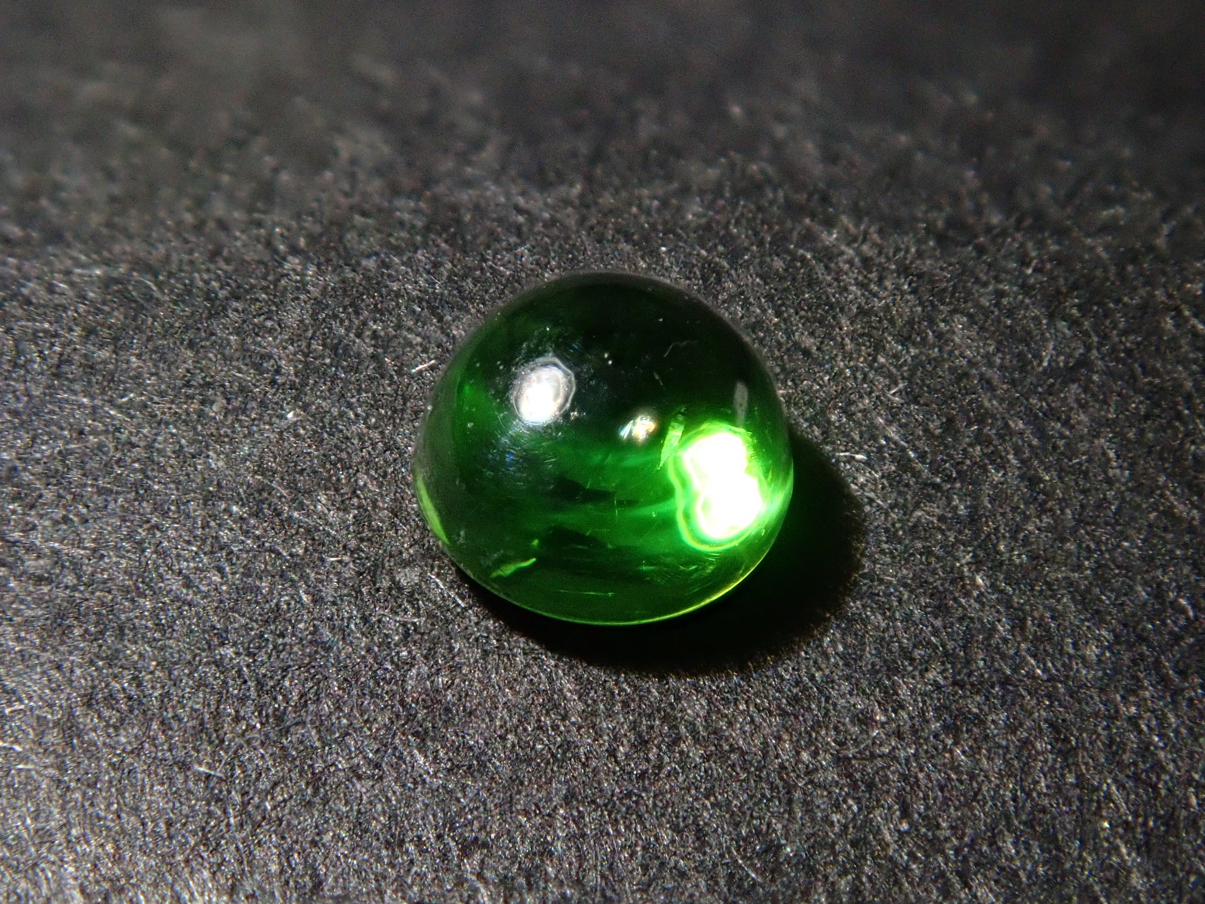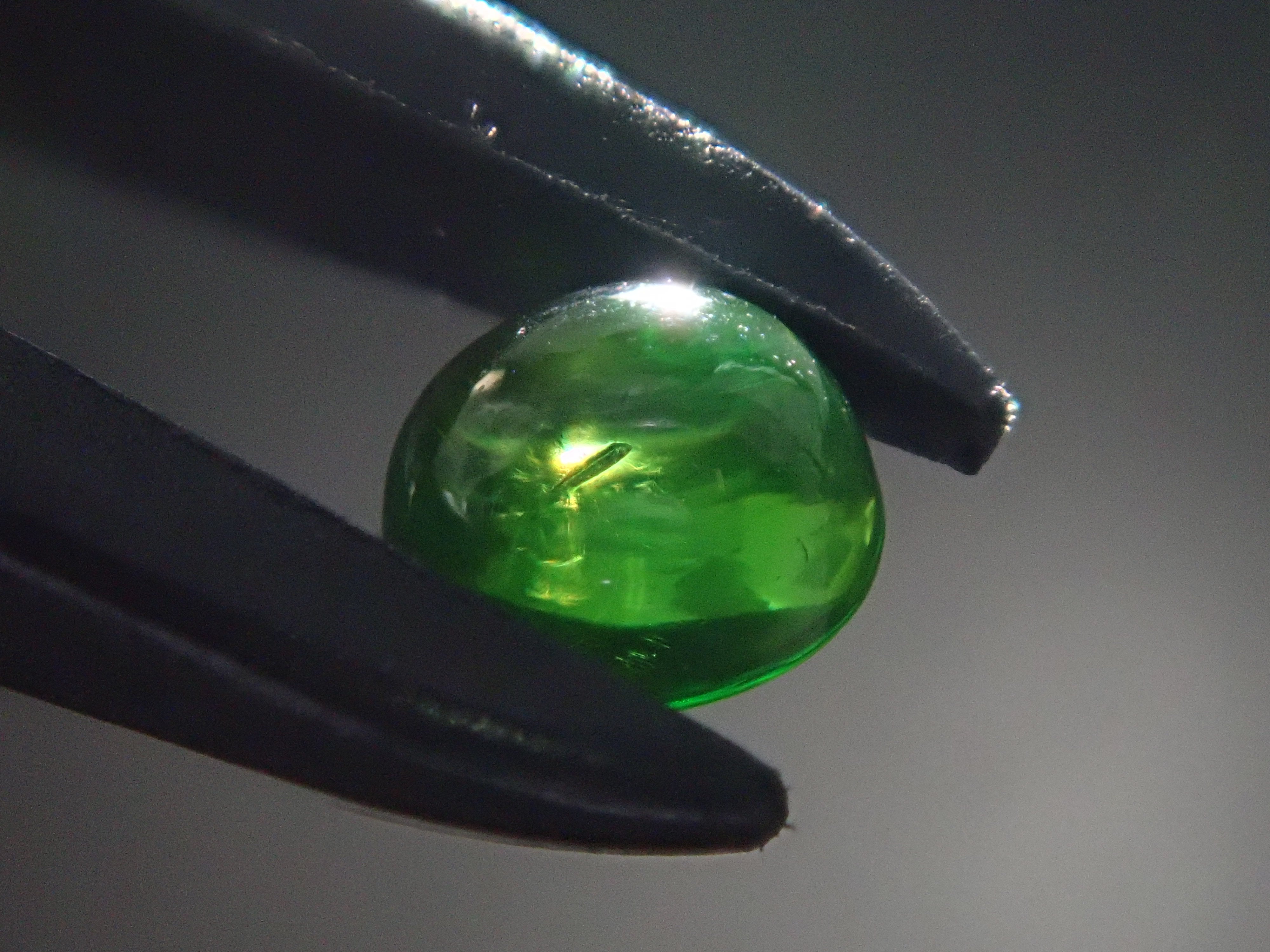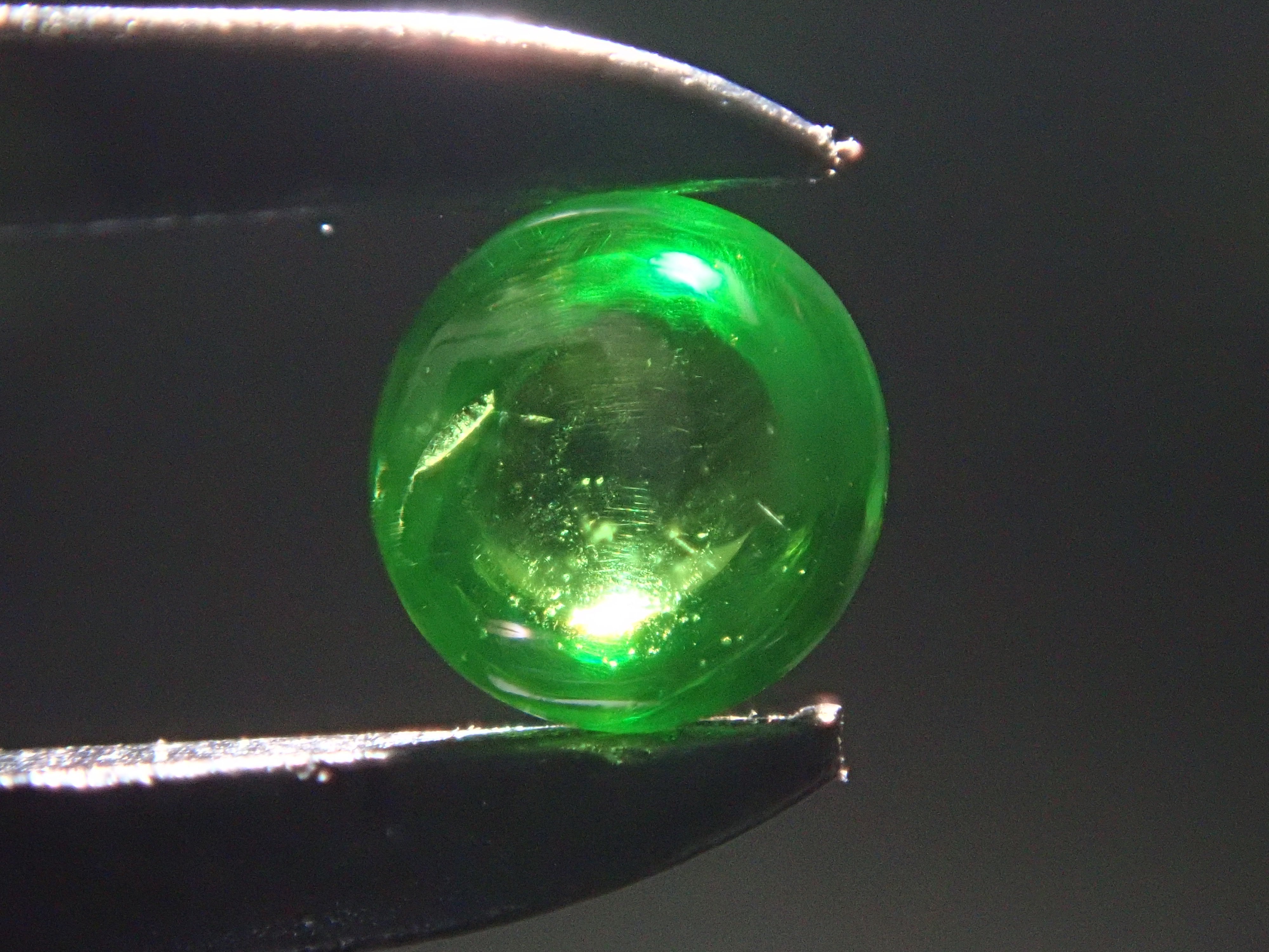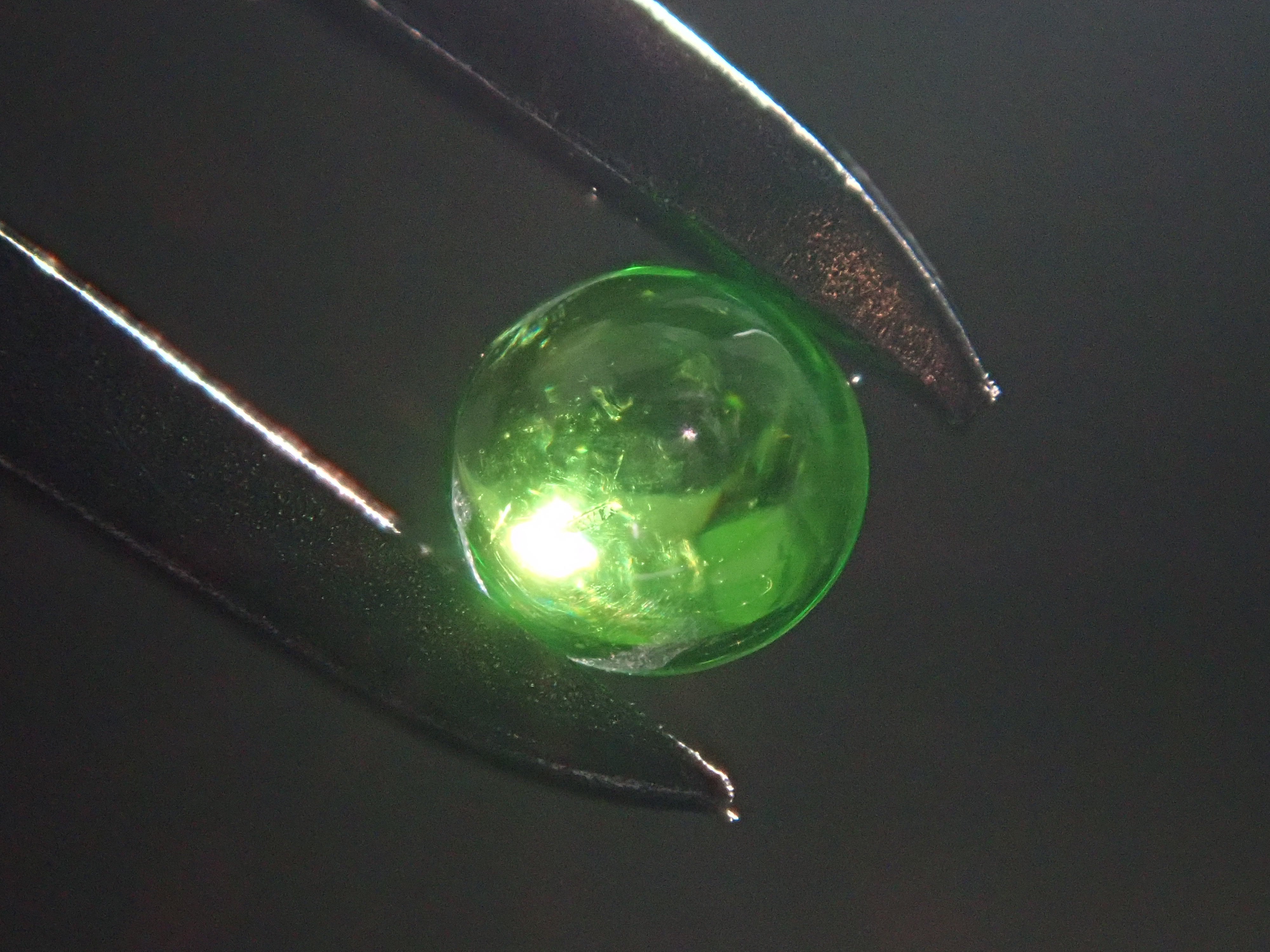 石榴石色散性強,光彩奪目,光芒四射。其中,這顆綠色的「翠綠榴石」特別美麗罕見。它含有形似馬尾的馬尾狀內含物,同樣罕見,產自俄羅斯。照片拍攝時使用了筆型手電筒。寶石背面基本未拋光。已以顯微鏡檢查確認是否有馬尾狀內含物。這是一顆直徑2.9毫米的圓形切割裸石。