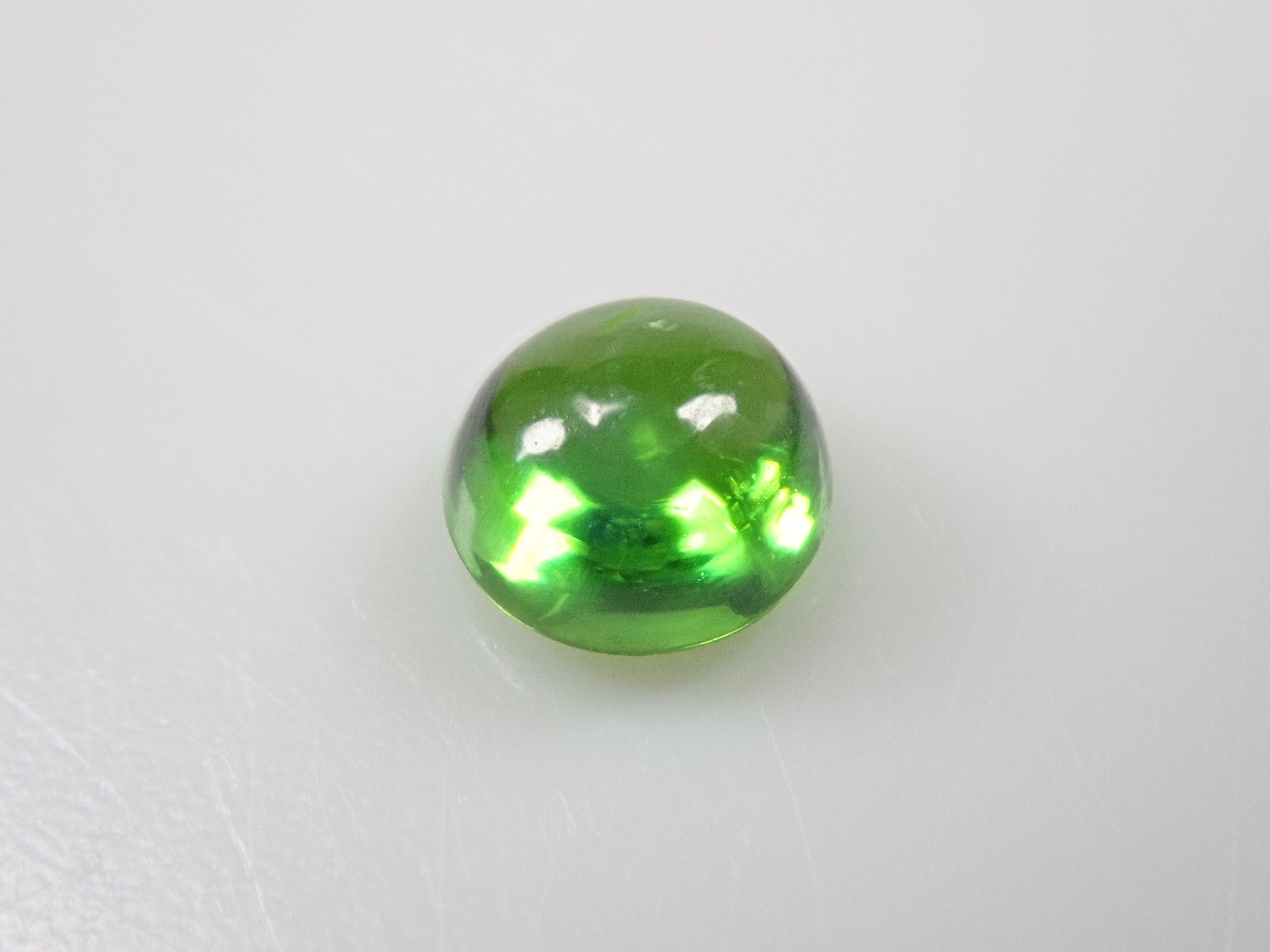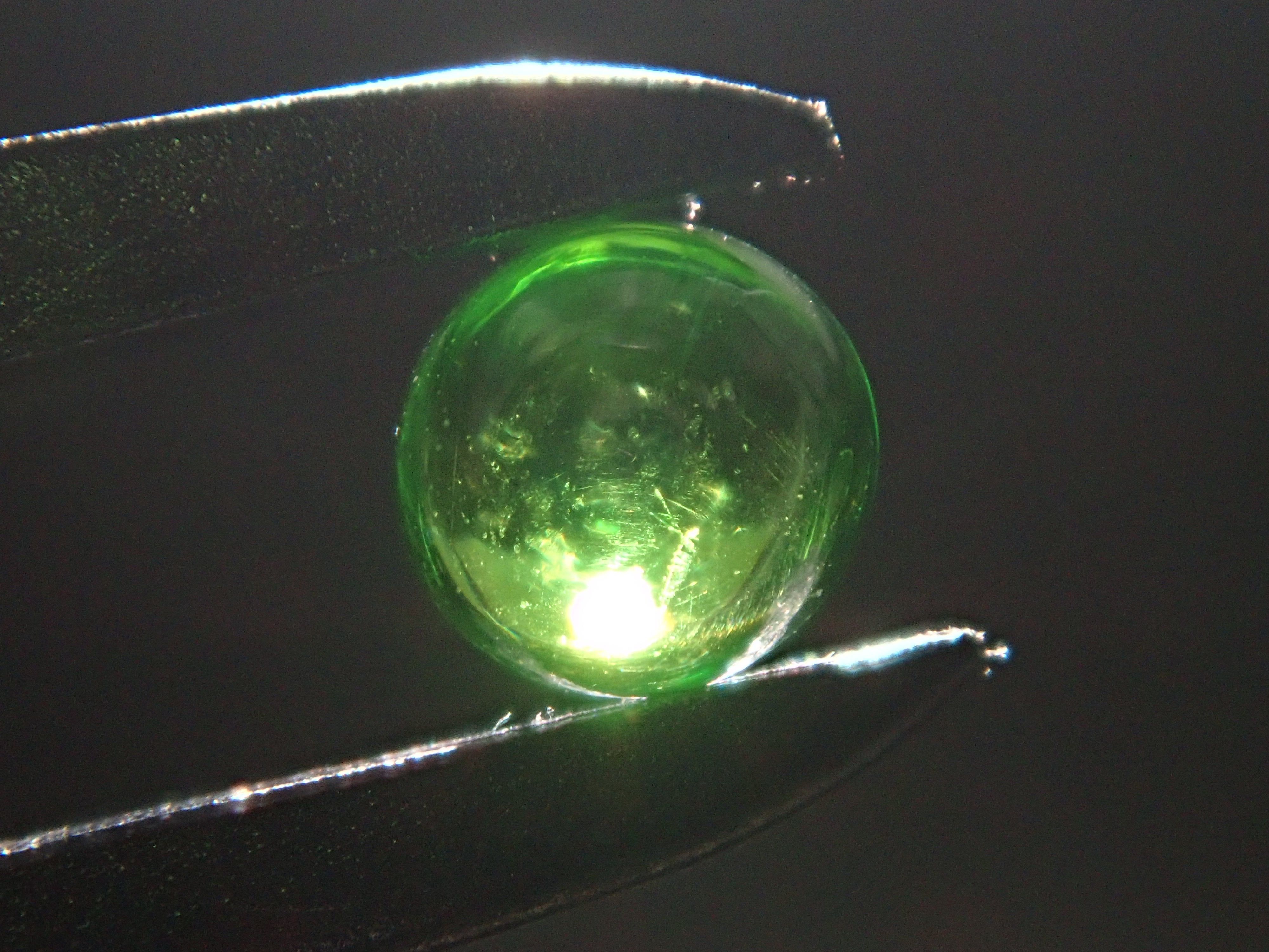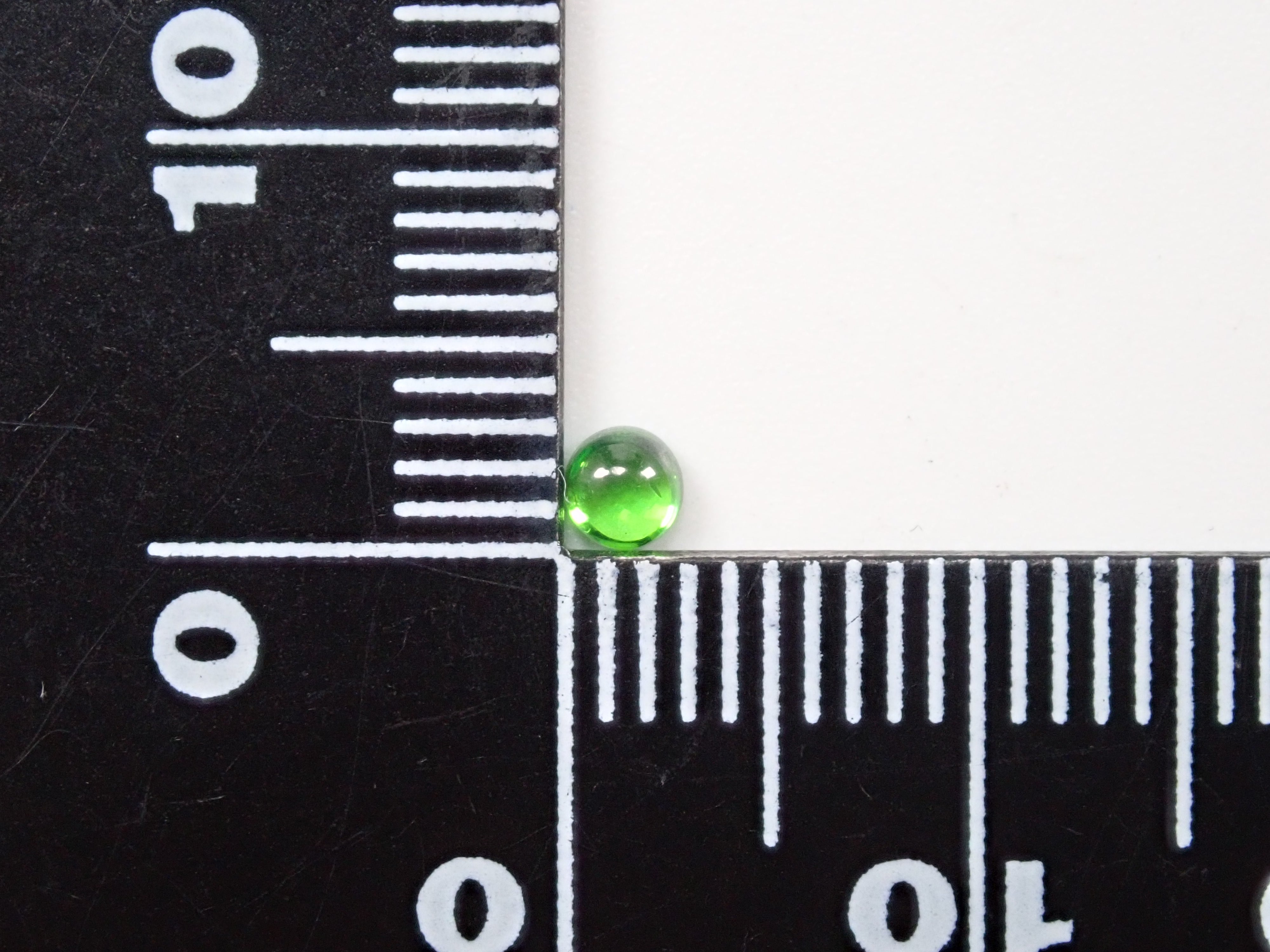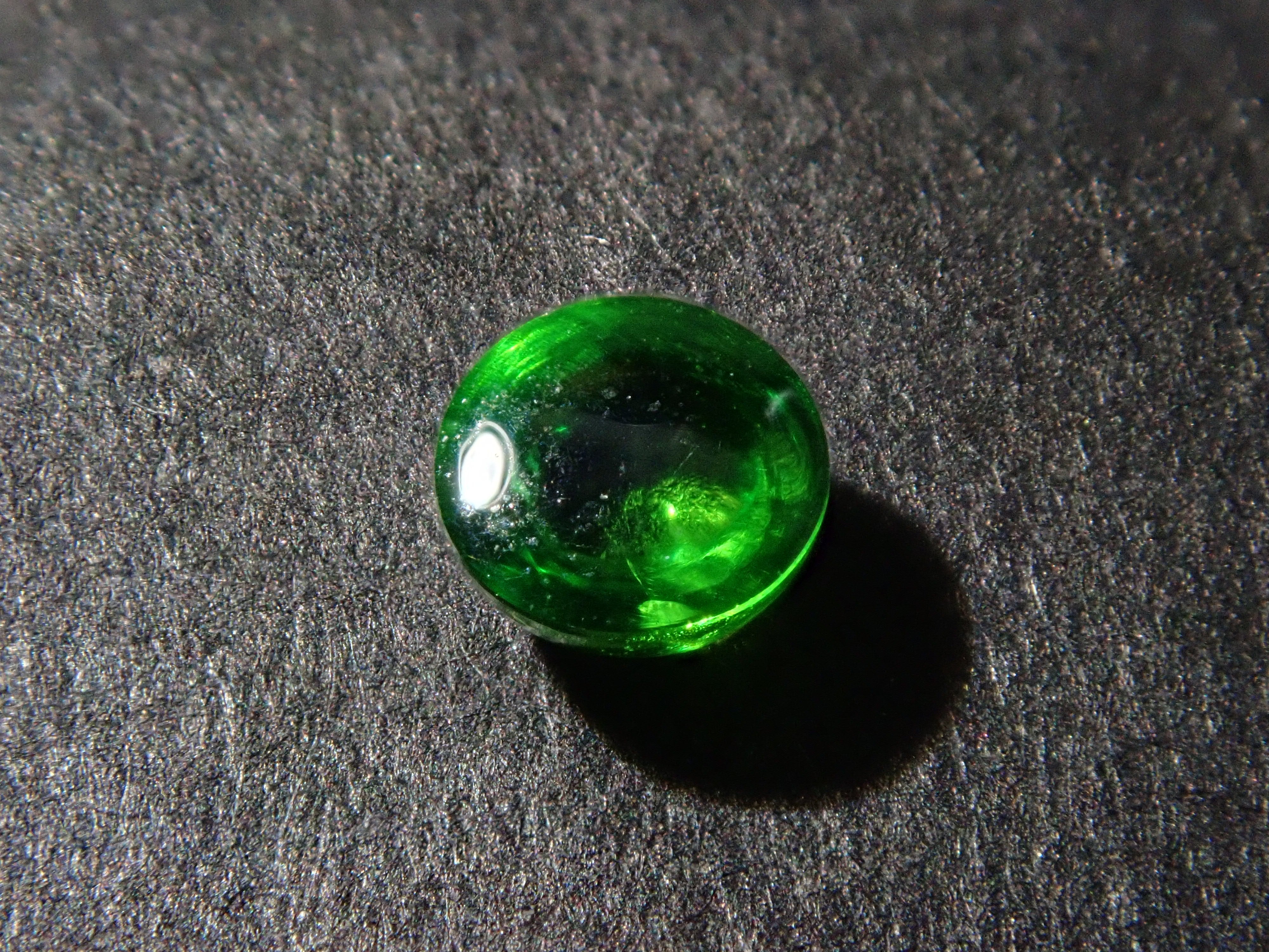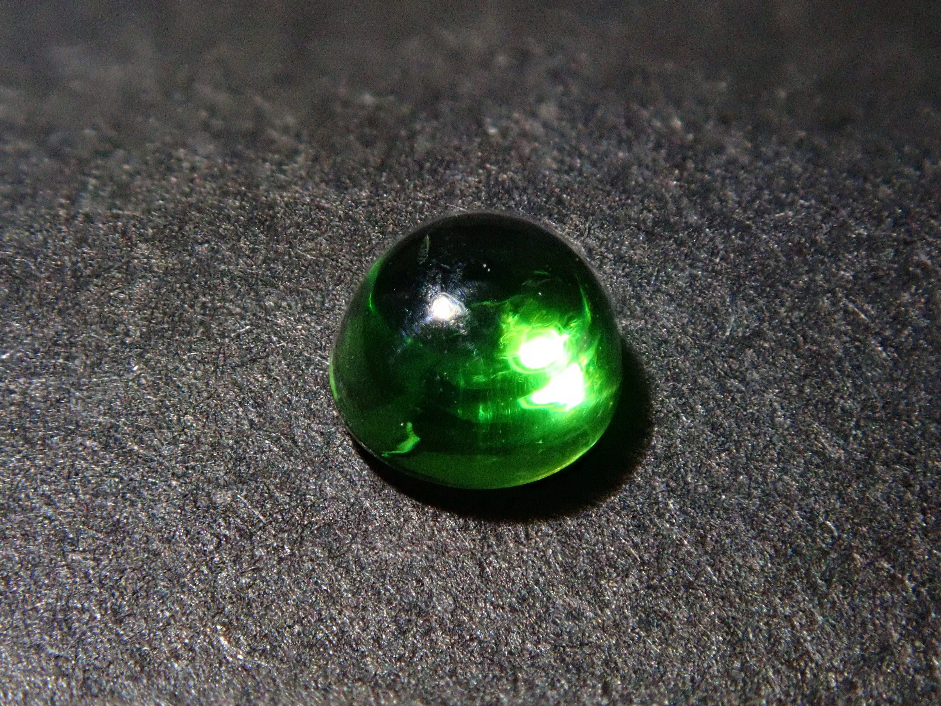 石榴石色散性強,光彩奪目,光芒四射。其中,這顆綠色的「翠綠榴石」特別美麗罕見。它含有形似馬尾的馬尾狀內含物,同樣罕見,產自俄羅斯。照片拍攝時使用了筆型手電筒。寶石背面基本未拋光。已以顯微鏡檢查確認是否有馬尾狀內含物。這是一顆直徑2.9毫米的圓形切割裸石。