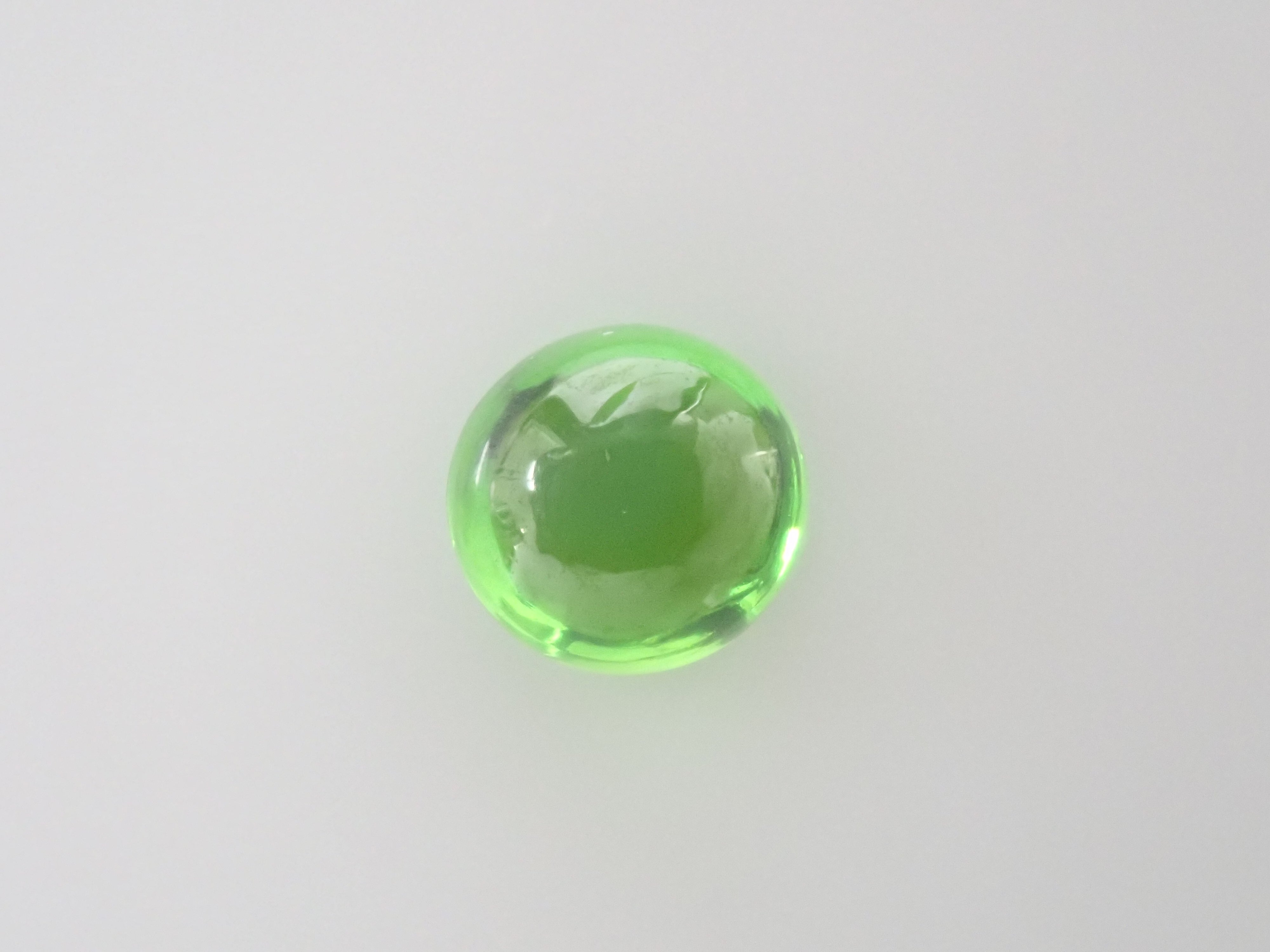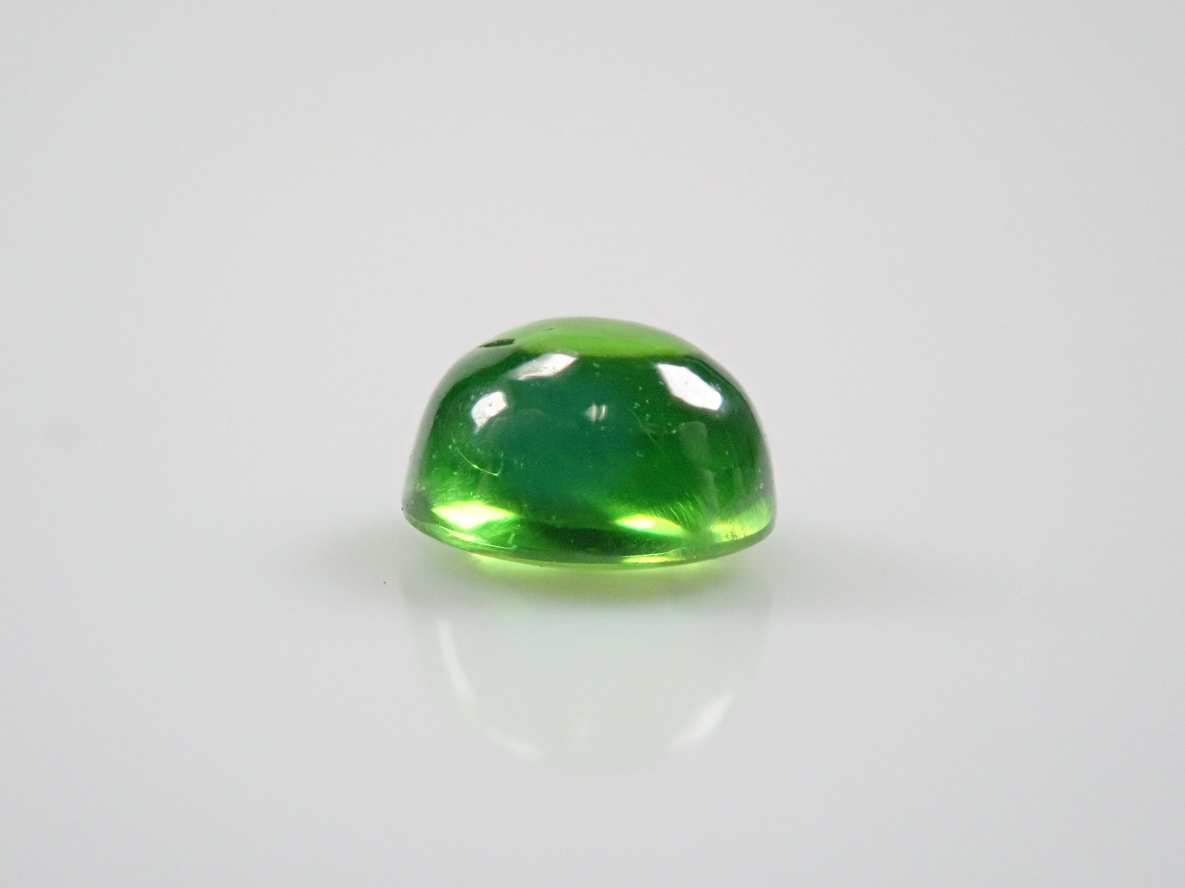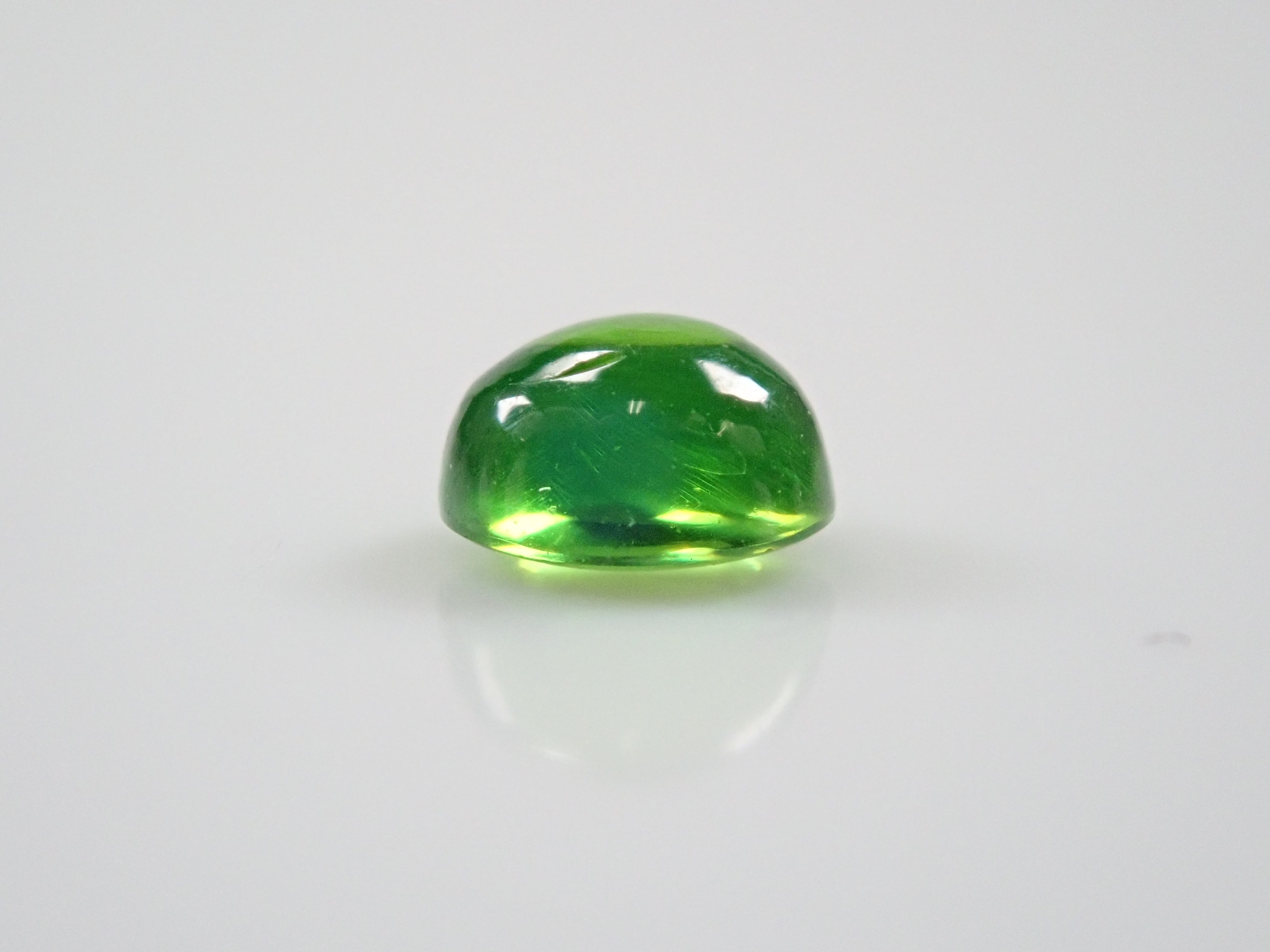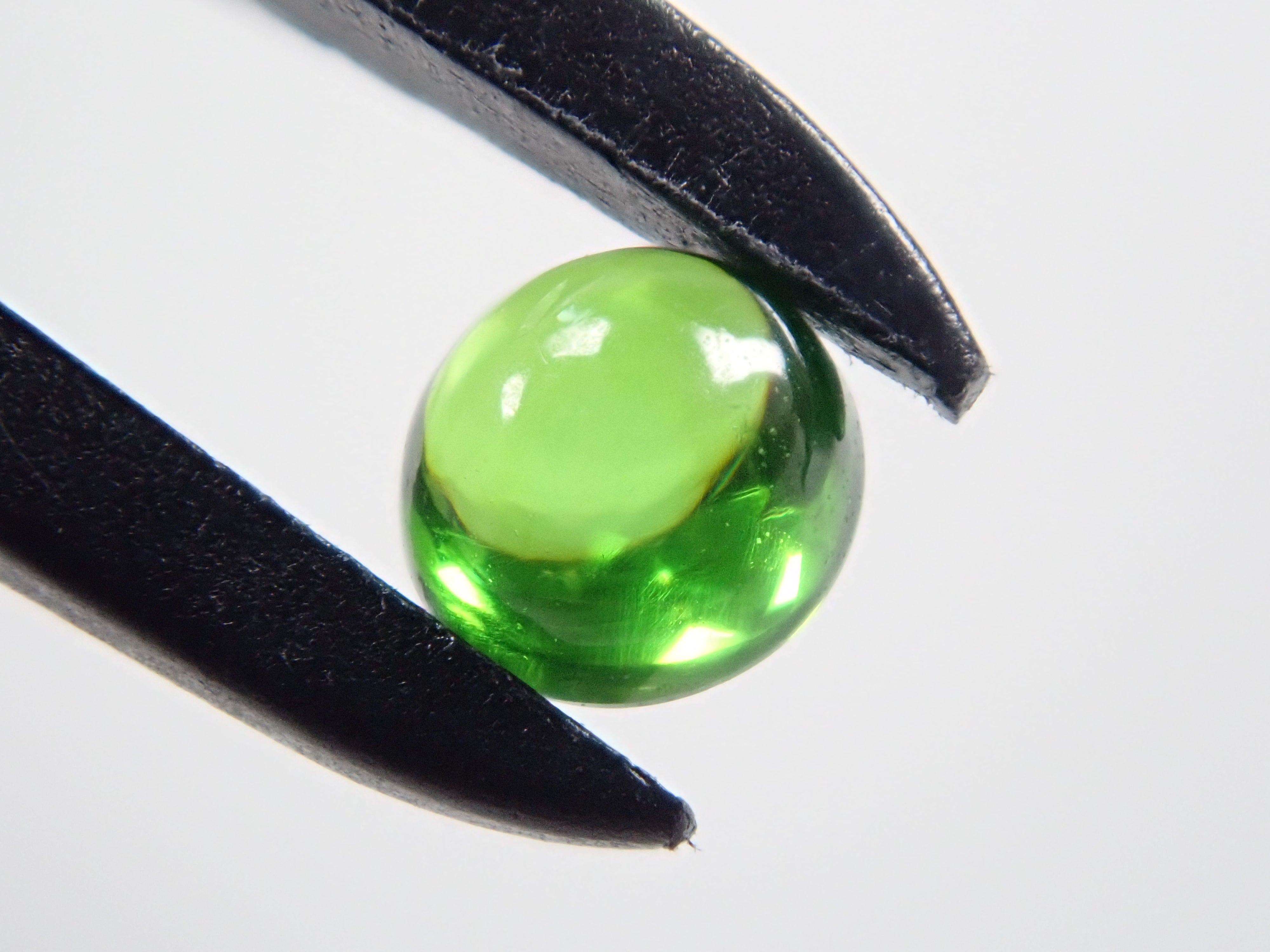 石榴石色散性強,光彩奪目,光芒四射。其中,這顆綠色的「翠綠榴石」特別美麗罕見。它含有形似馬尾的馬尾狀內含物,同樣罕見,產自俄羅斯。照片拍攝時使用了筆型手電筒。寶石背面基本未拋光。已以顯微鏡檢查確認是否有馬尾狀內含物。這是一顆直徑2.9毫米的圓形切割裸石。
