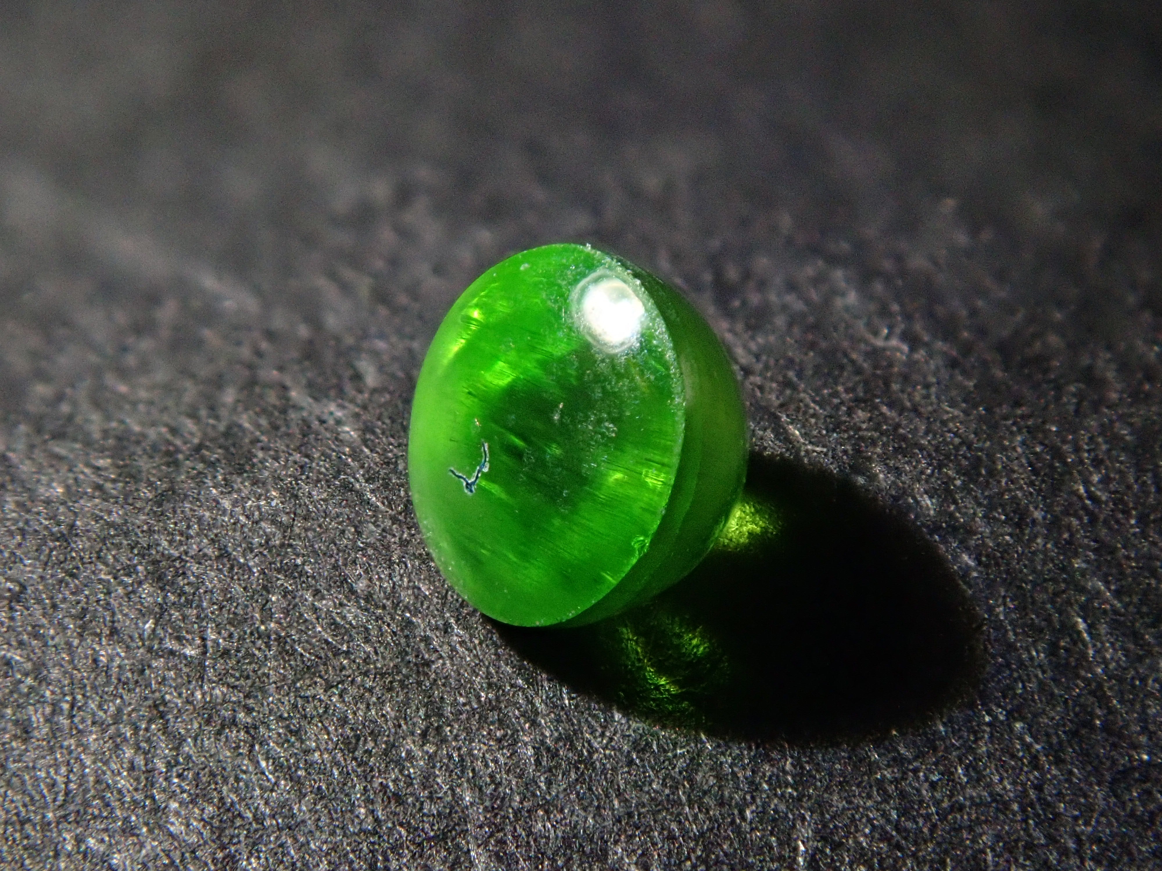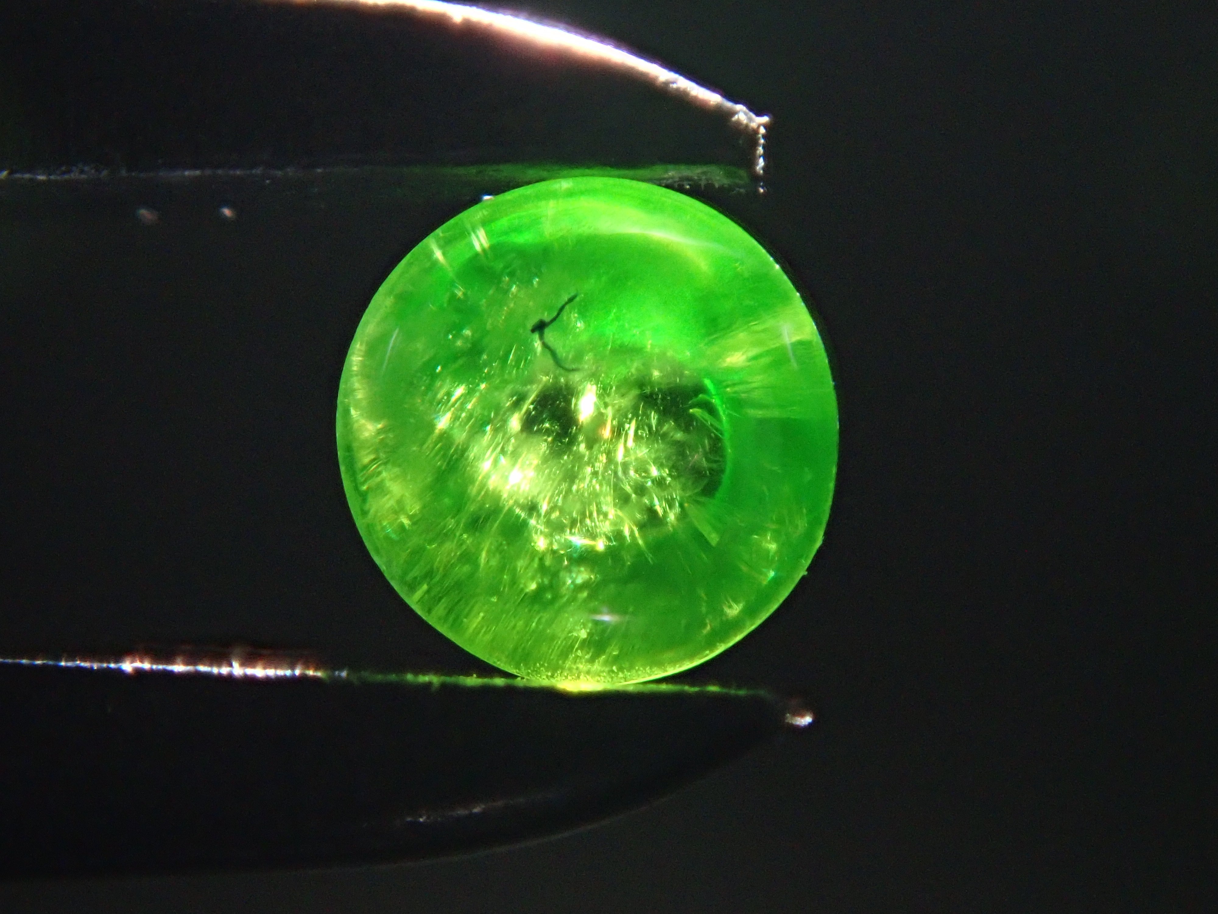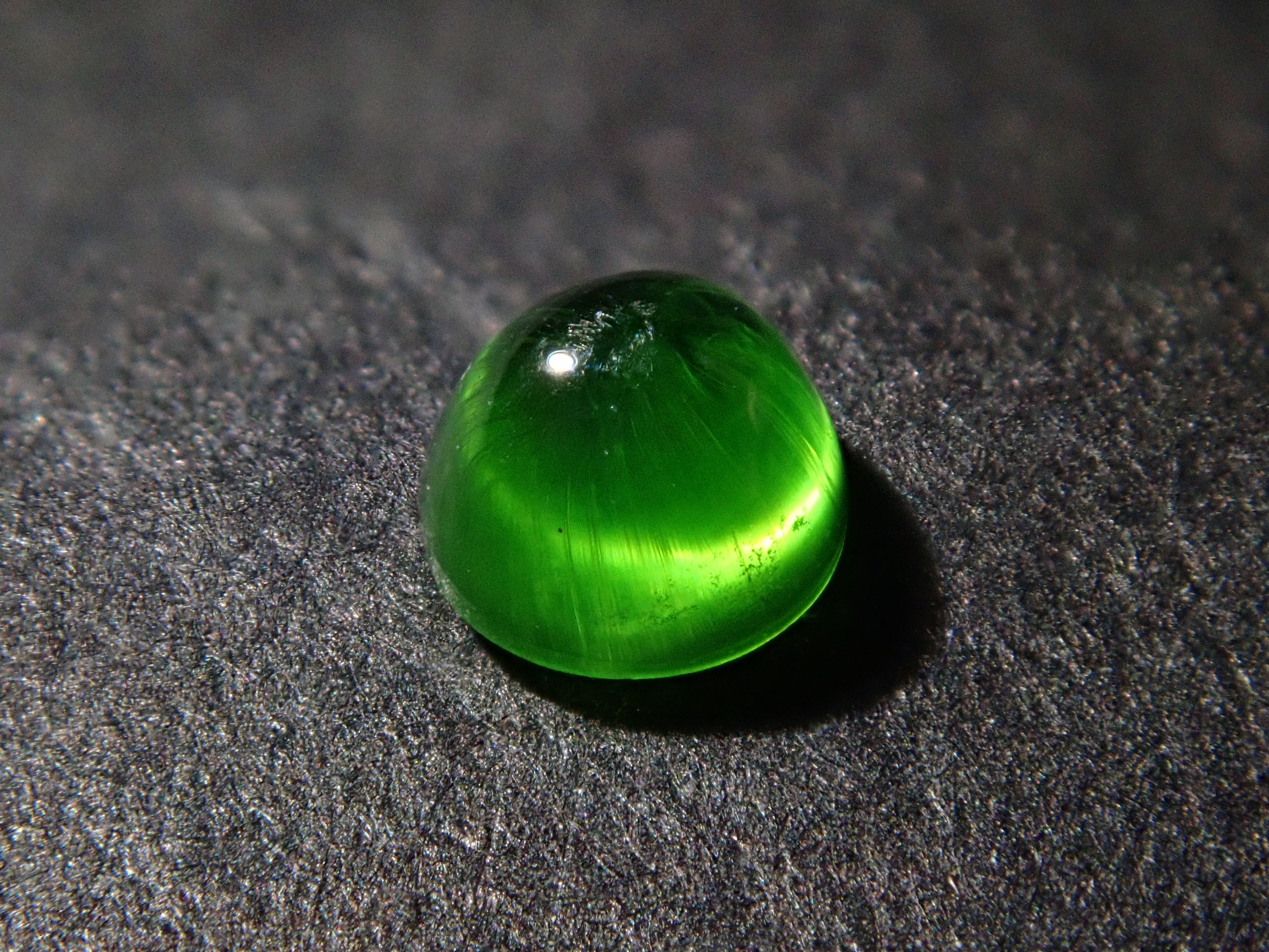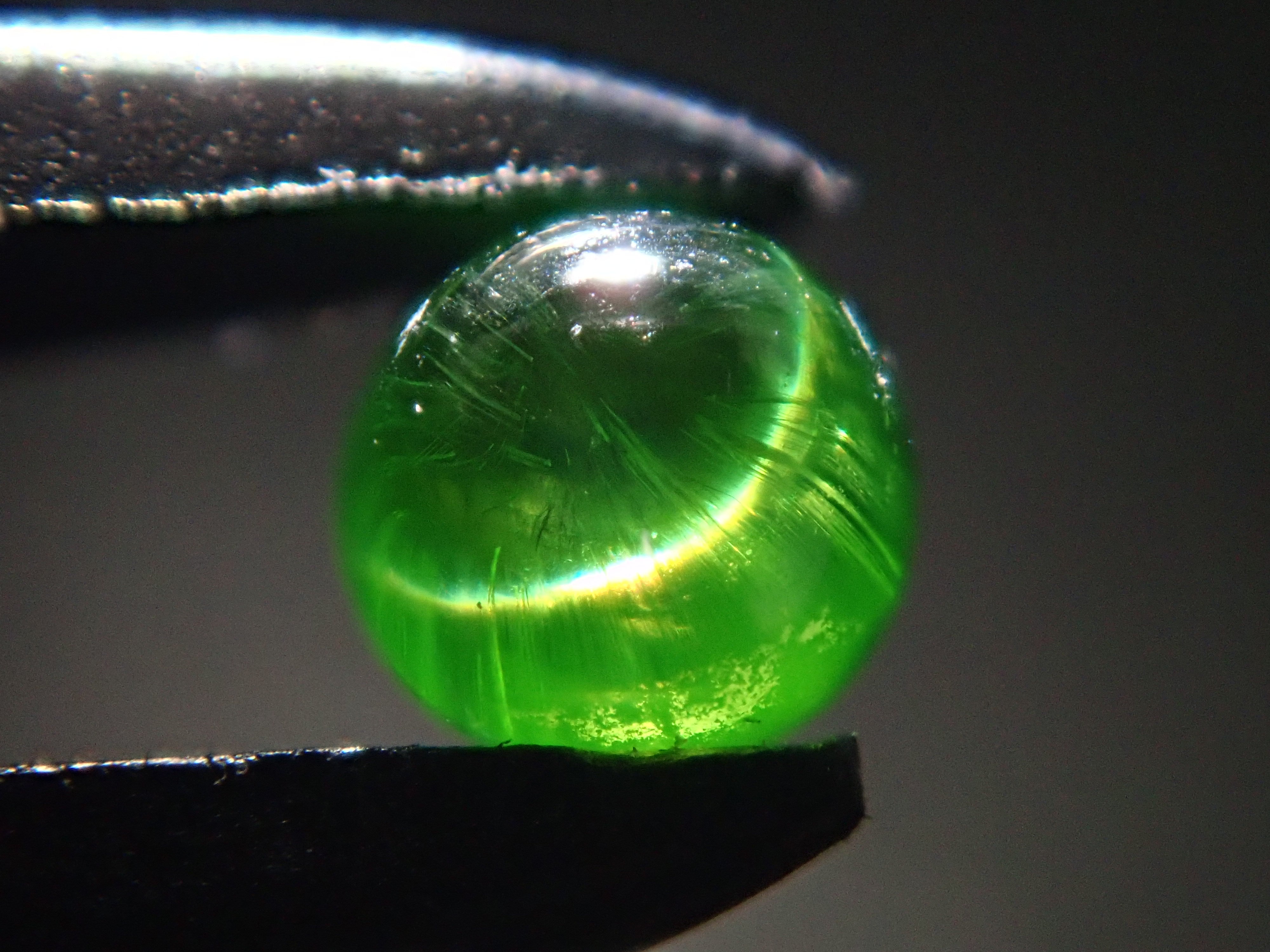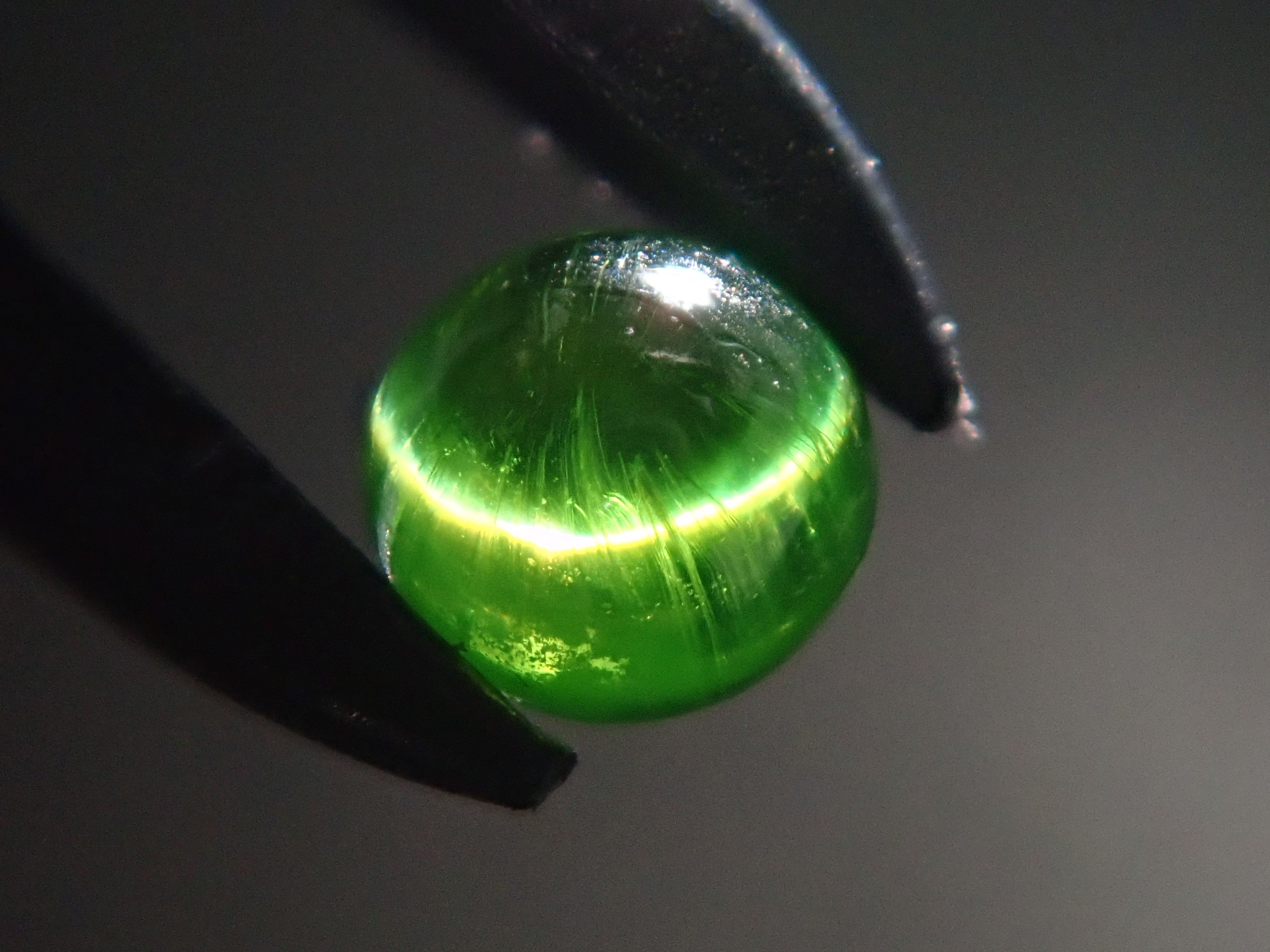 石榴石具有強烈的光色散和強烈的閃光。其中,這顆綠色的「濃綠榴石」是一種特別美麗且稀有的石榴石。這種類型的內含物被稱為“馬尾”,看起來像馬尾巴,甚至有貓眼效果。而且,這在俄羅斯也是很少見的。筆燈用於攝影。石頭的背面基本上是未拋光的。透過顯微鏡檢查證實了馬尾草的存在。