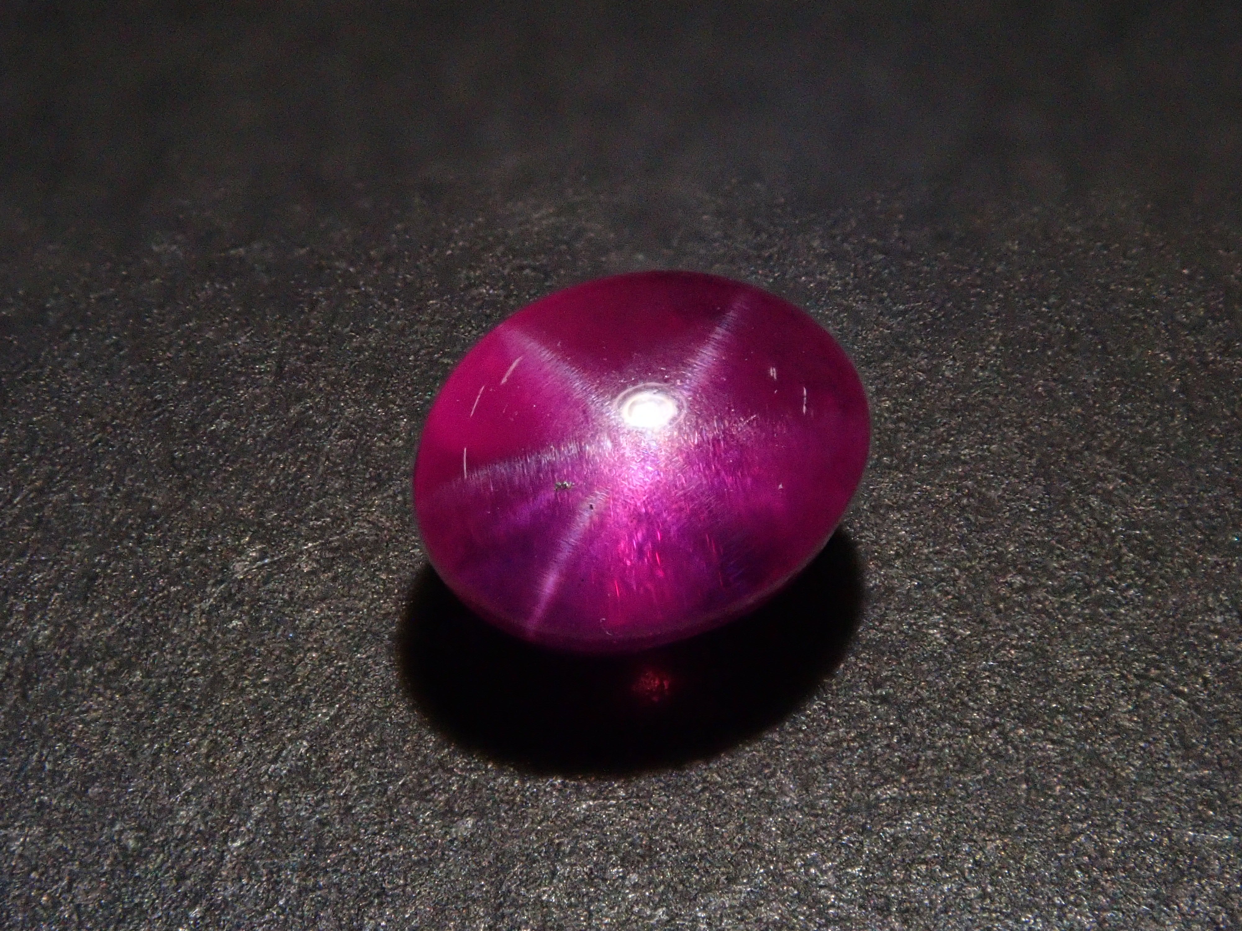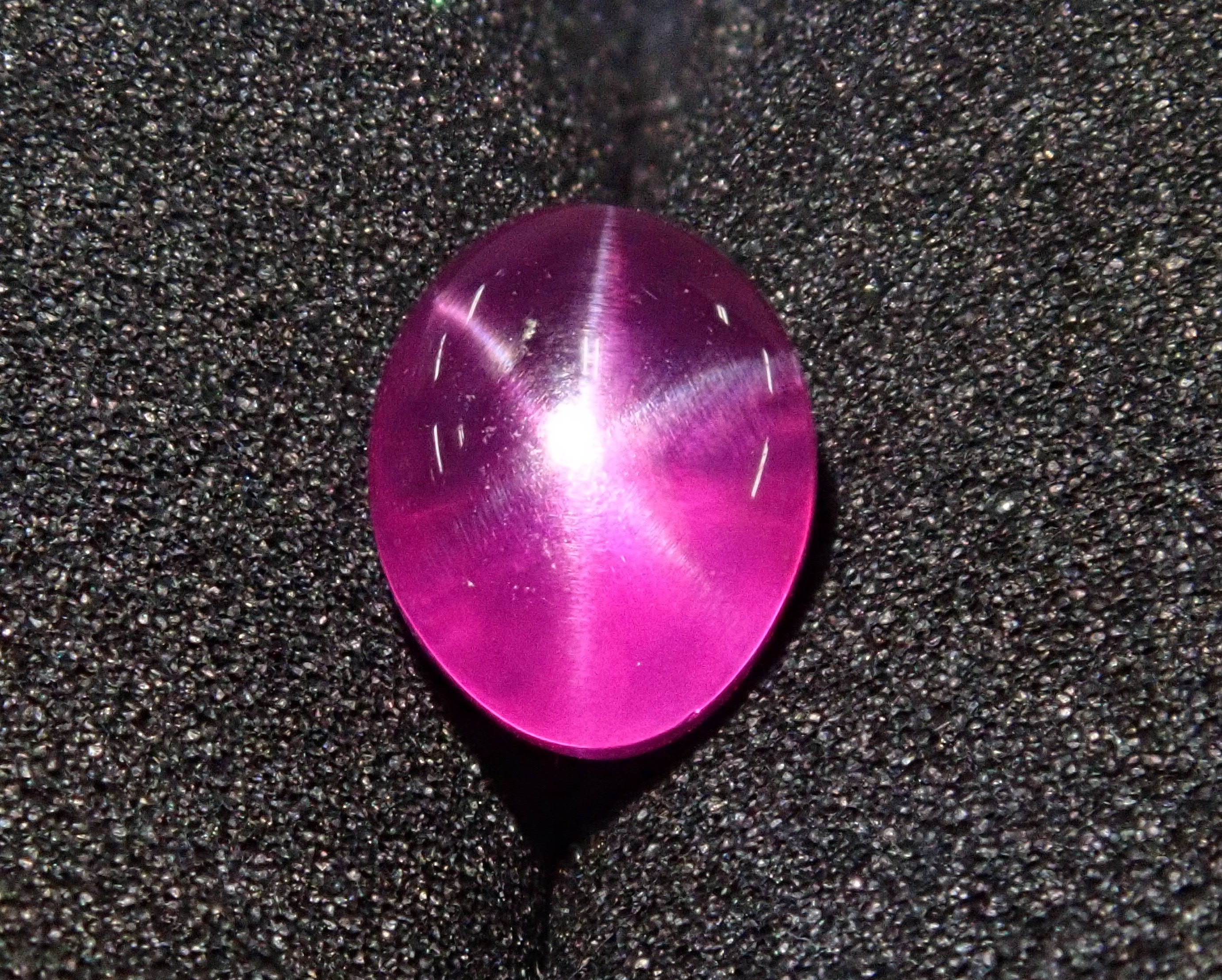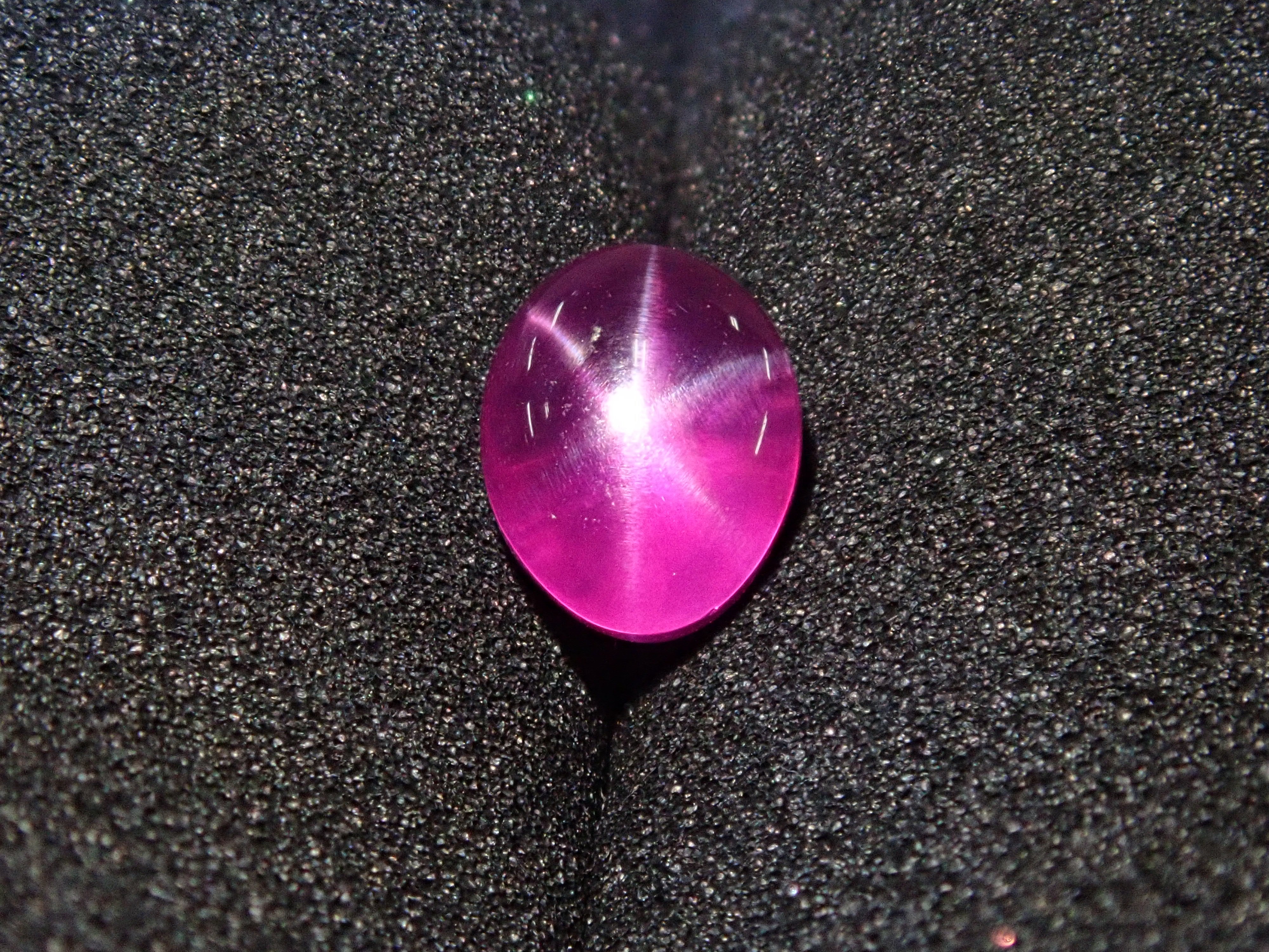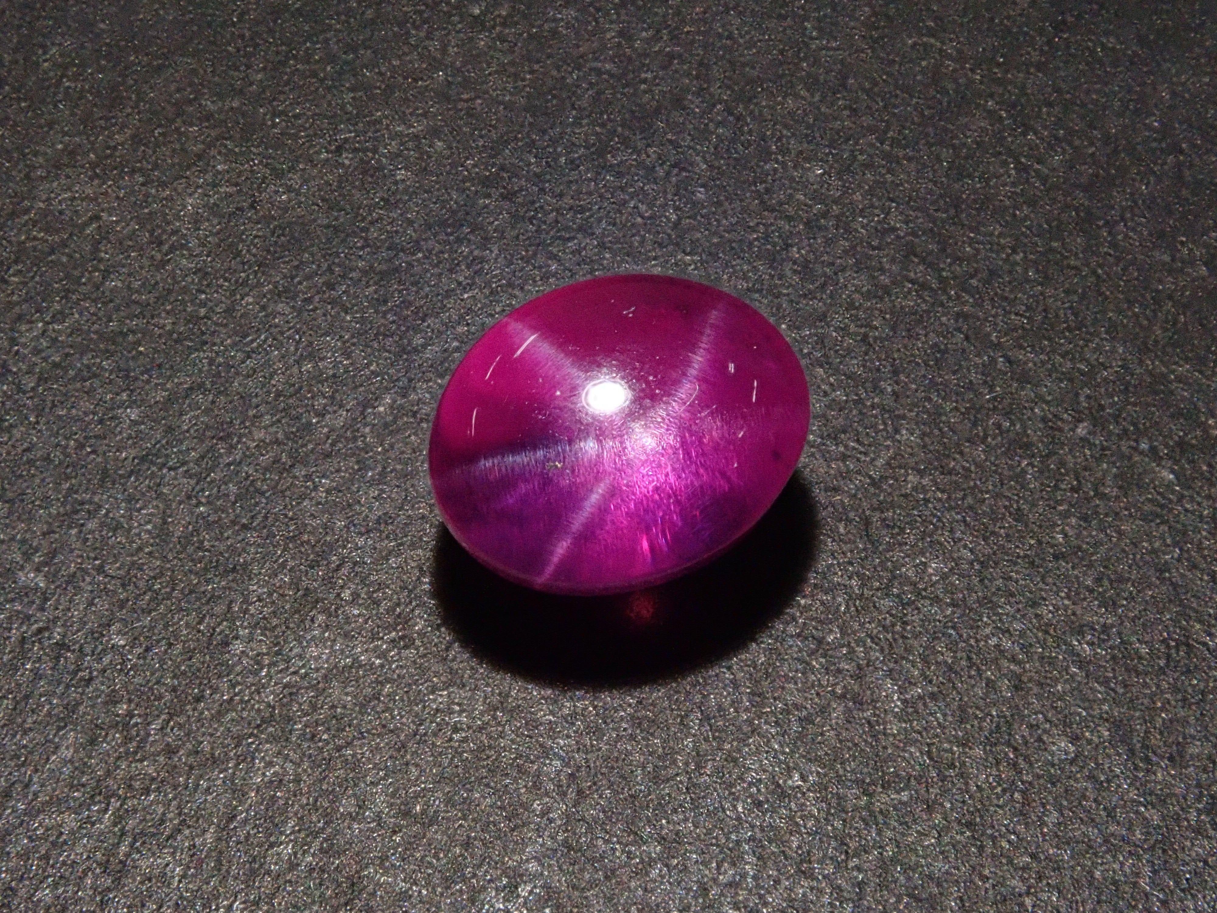 紅寶石自古以來就被視為寶石而受到推崇。指紅剛玉。紅寶石是僅次於鑽石的第二硬寶石,硬度為9,是一種堅韌、穩定且易於護理的寶石。這是一種帶有星光效果的紅寶石,用筆電筒拍攝。石頭的背面基本上是未拋光的。這是產自緬甸的罕見未加熱星光紅寶石。