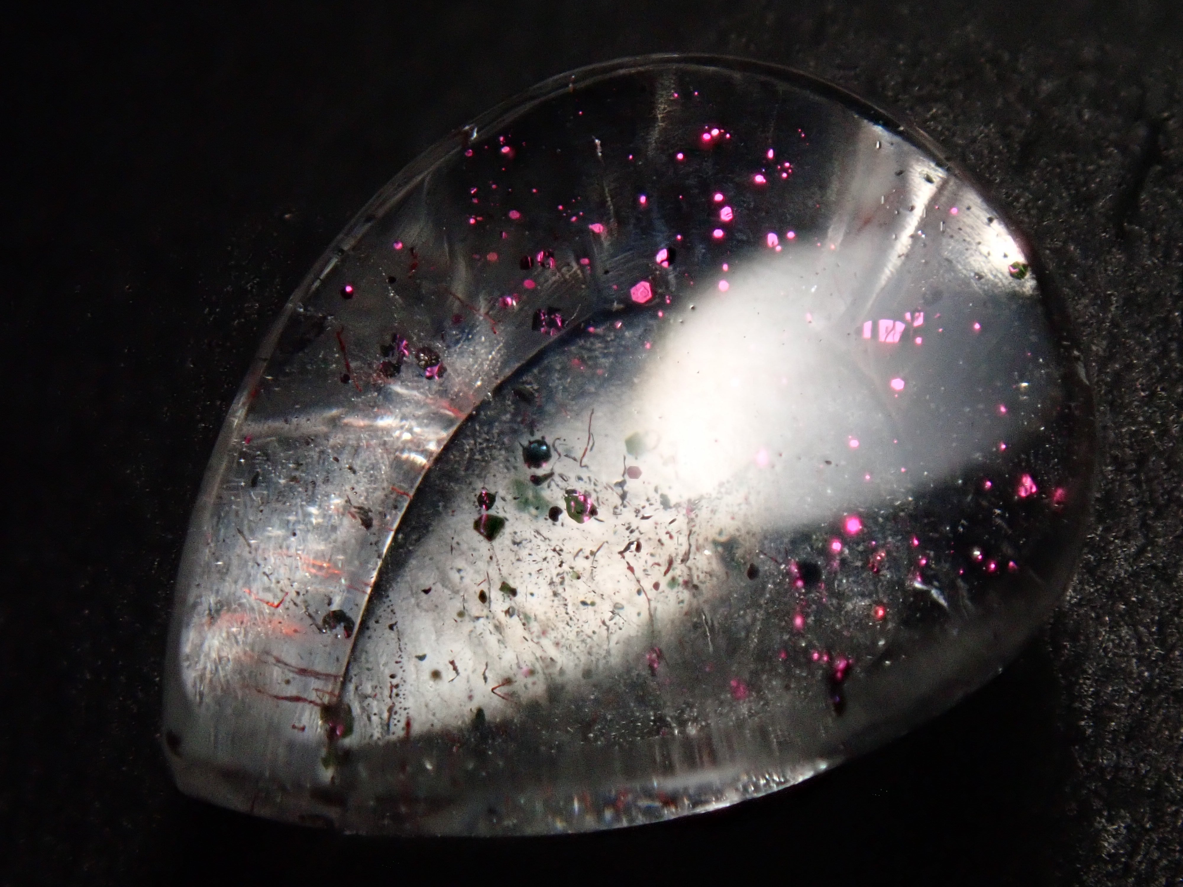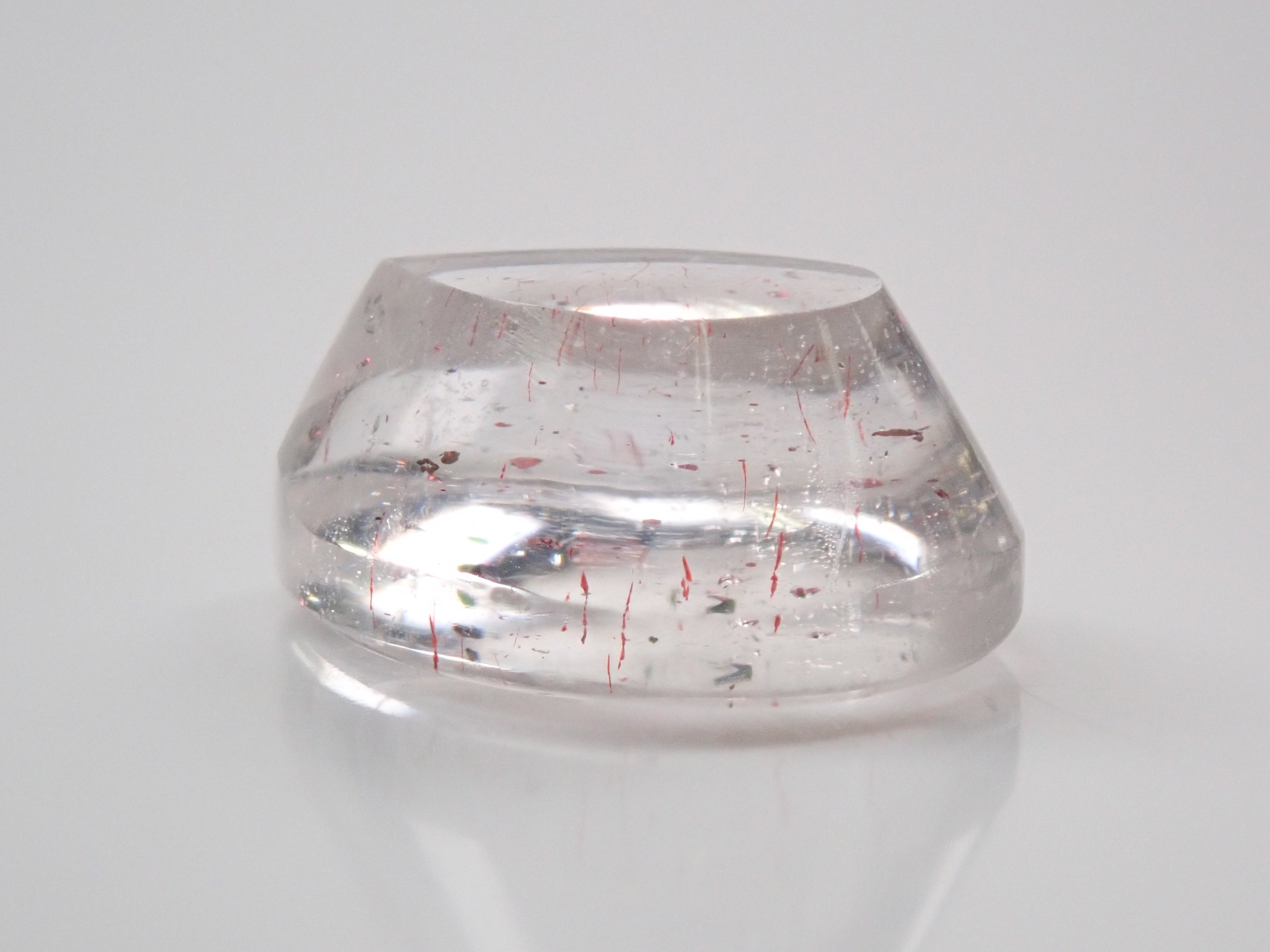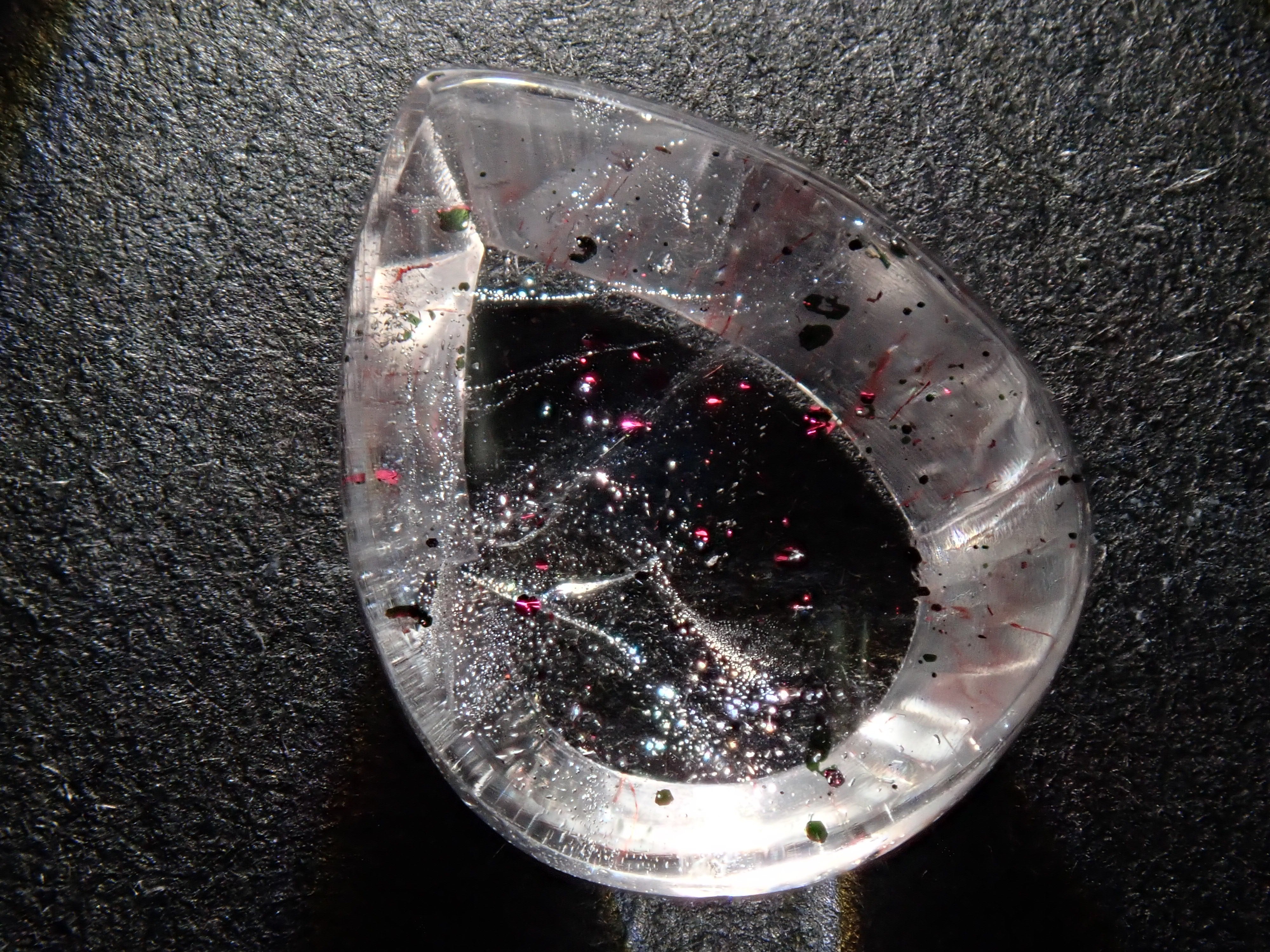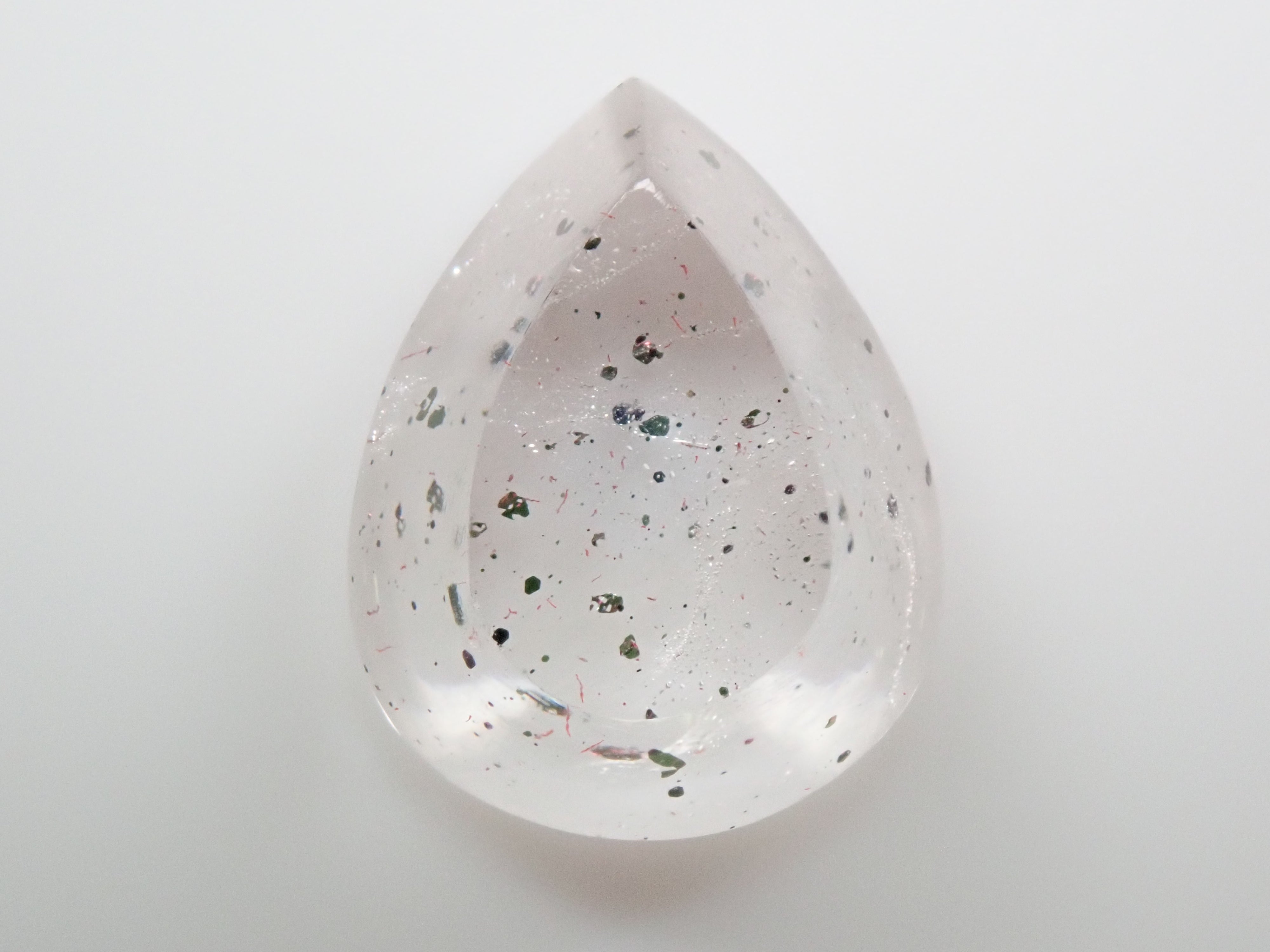石英,日文稱為“水晶”,在日本是一種常見的寶石,但它也是一種深奧的寶石,擁有眾多種類,包括紫水晶和黃水晶。這種形狀像紅色花瓣的水晶被稱為「小叮噹石英」或「粉紅火石英」。照片是用筆形電筒拍攝的,以便清晰地顯示內部內含物的狀態。