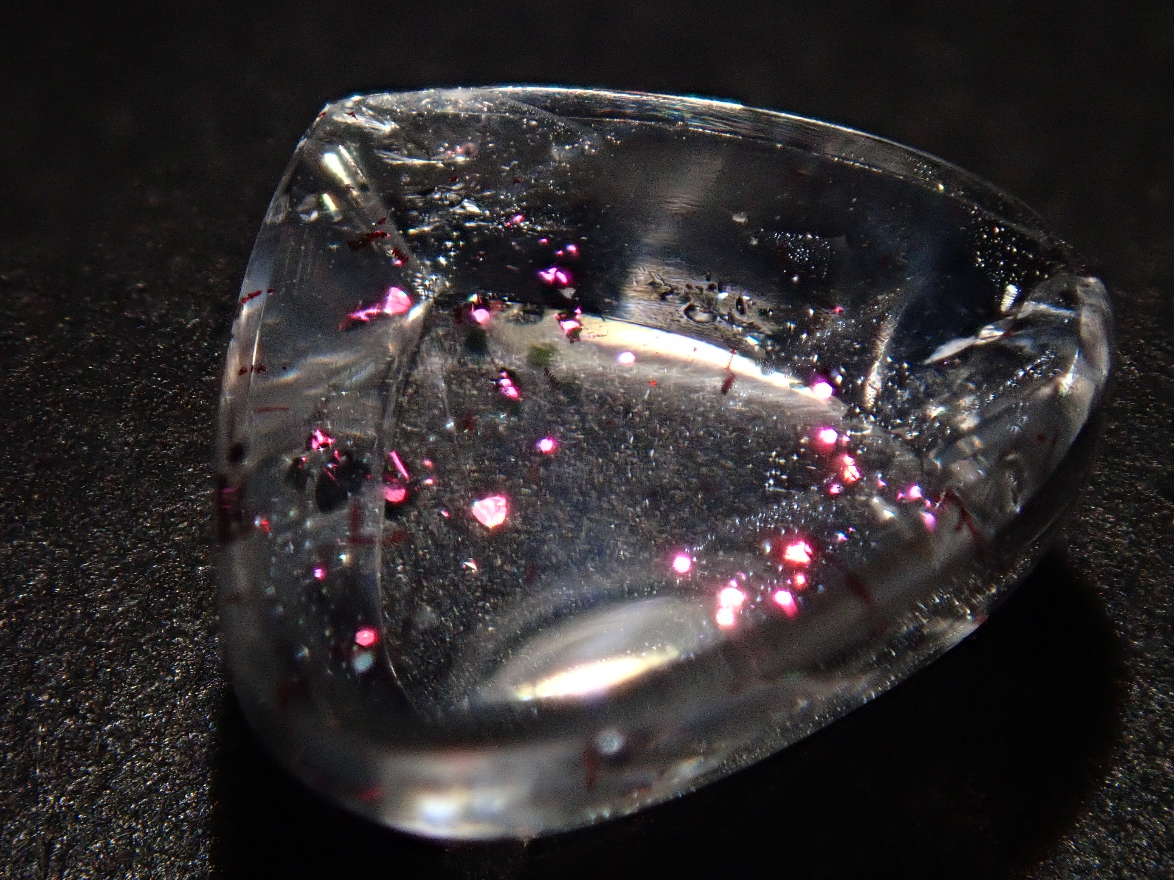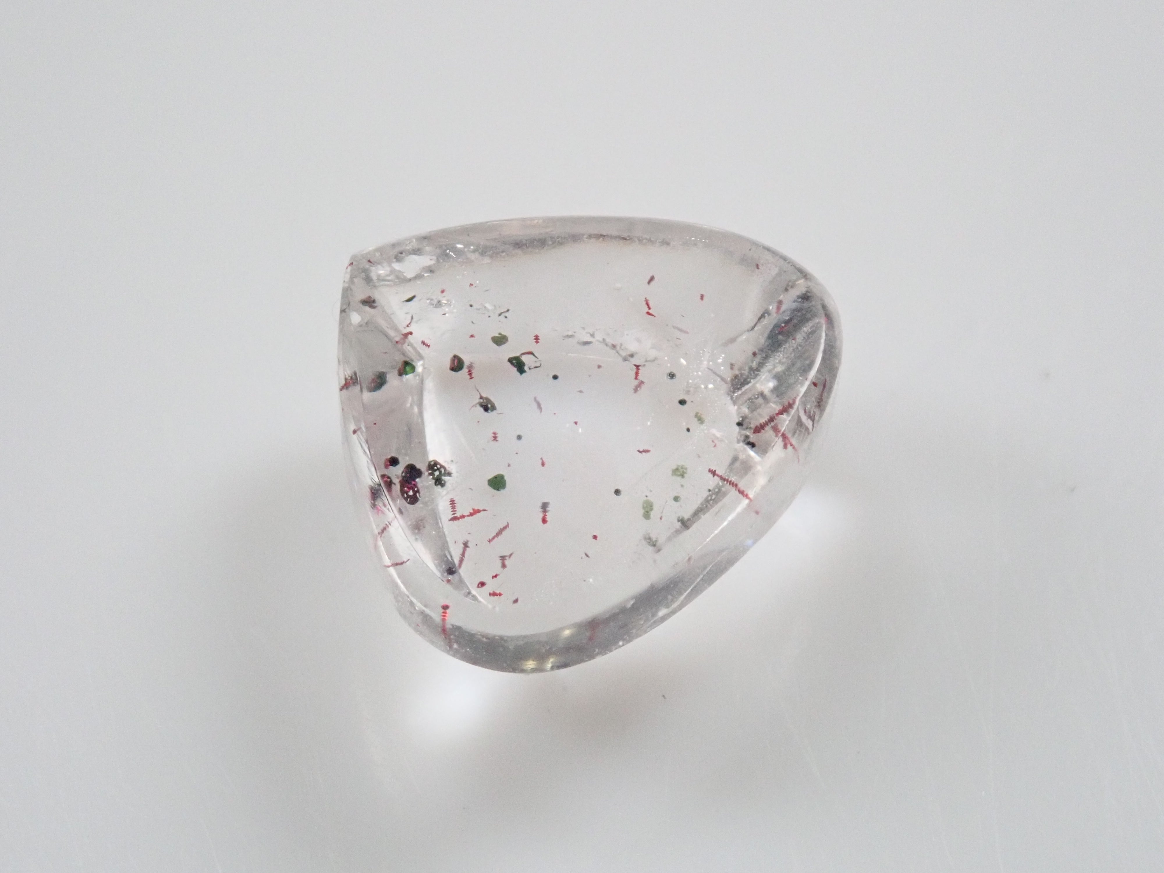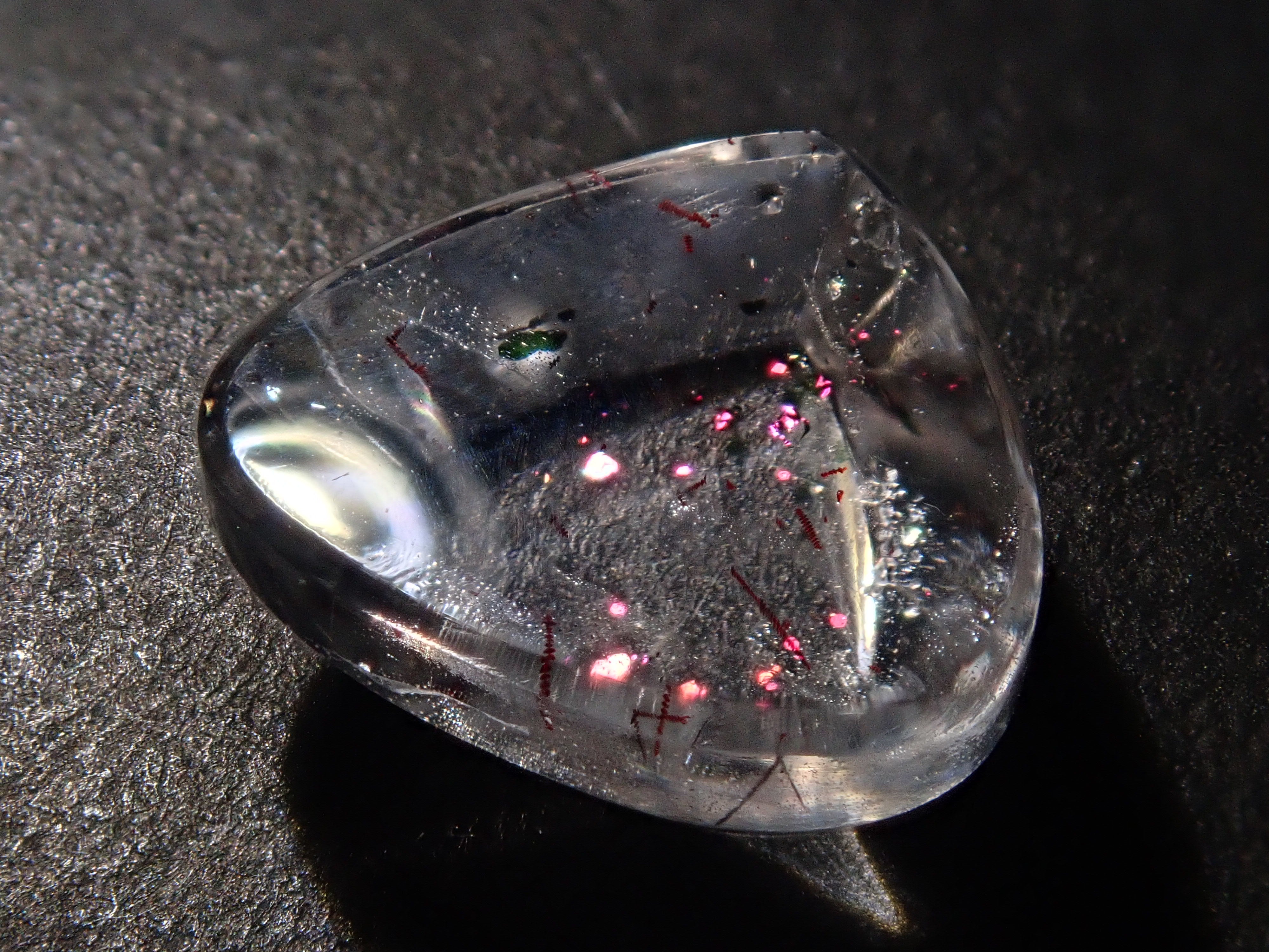 石英在日文中稱為水晶。它是一種在日本非常熟悉的石頭,但它也是一種深寶石,有紫水晶和黃水晶等多種類型。這種晶體看起來像暴風雪般的紅色花朵,被稱為小叮噹石英或粉紅火石英。為了清楚地顯示裡麵包裹體的樣子,我用了筆電筒拍照。這是一塊精心挑選的散裝小叮噹石英,透明度特別高,可以欣賞到它的紅色光芒。