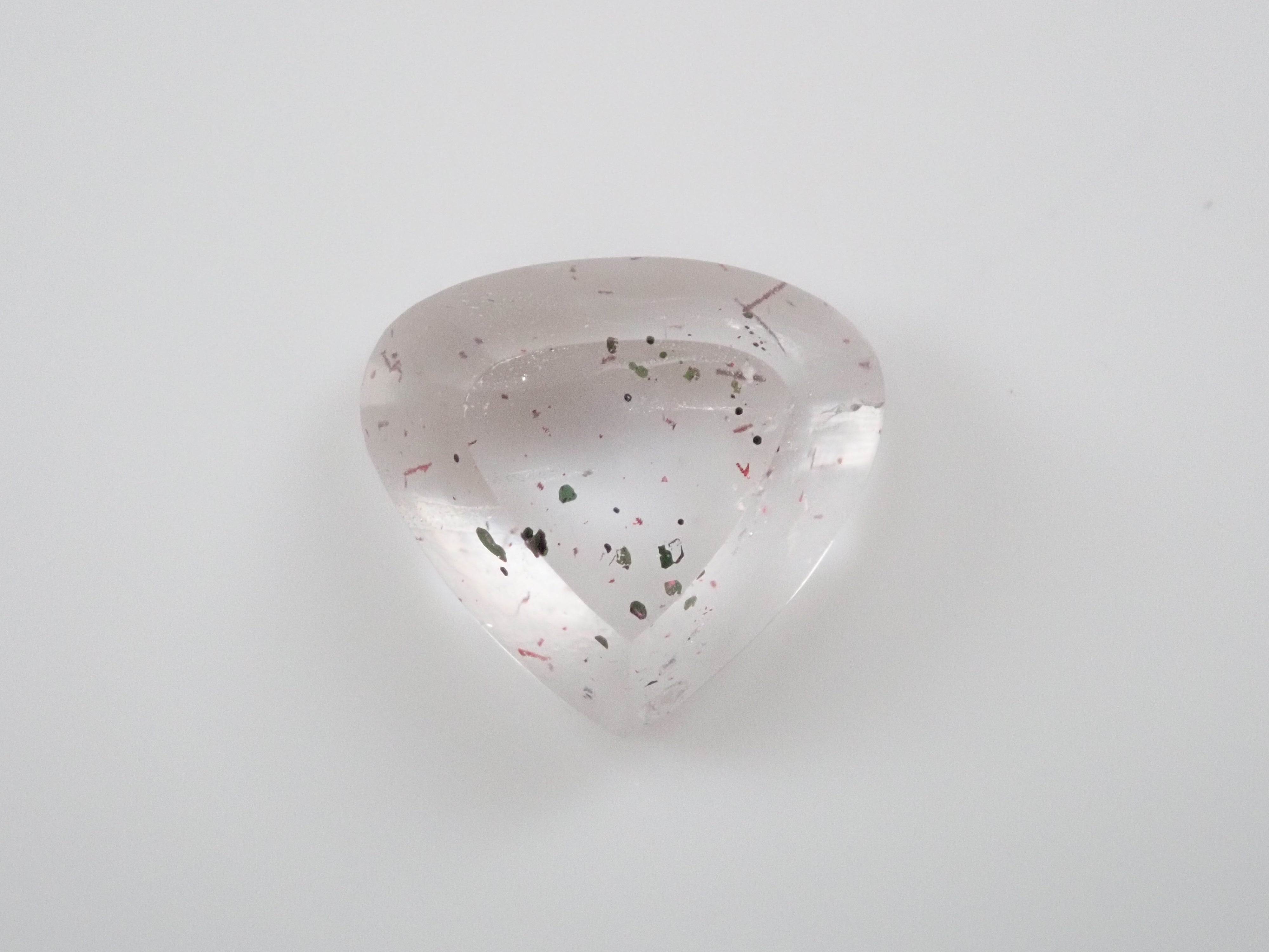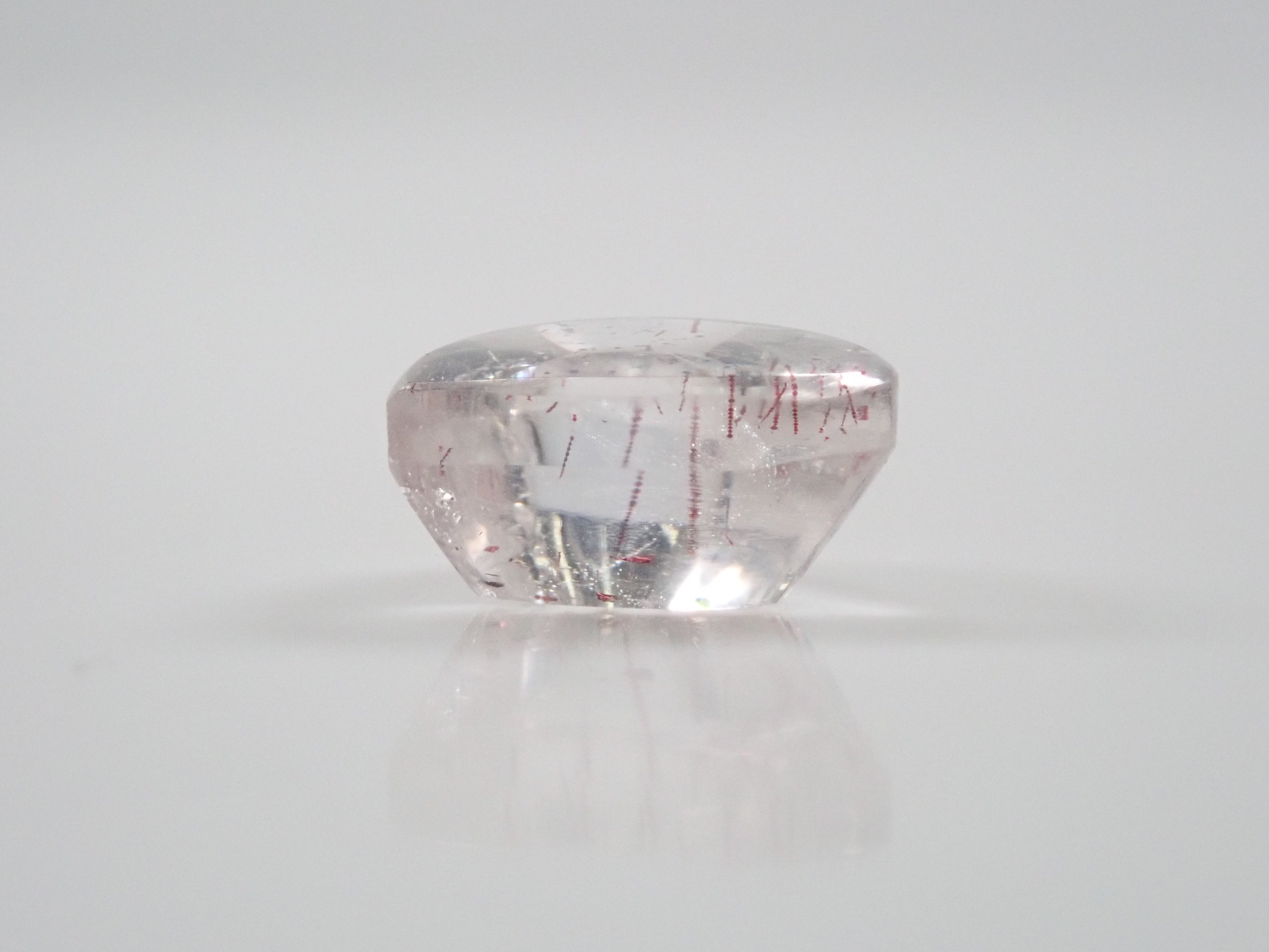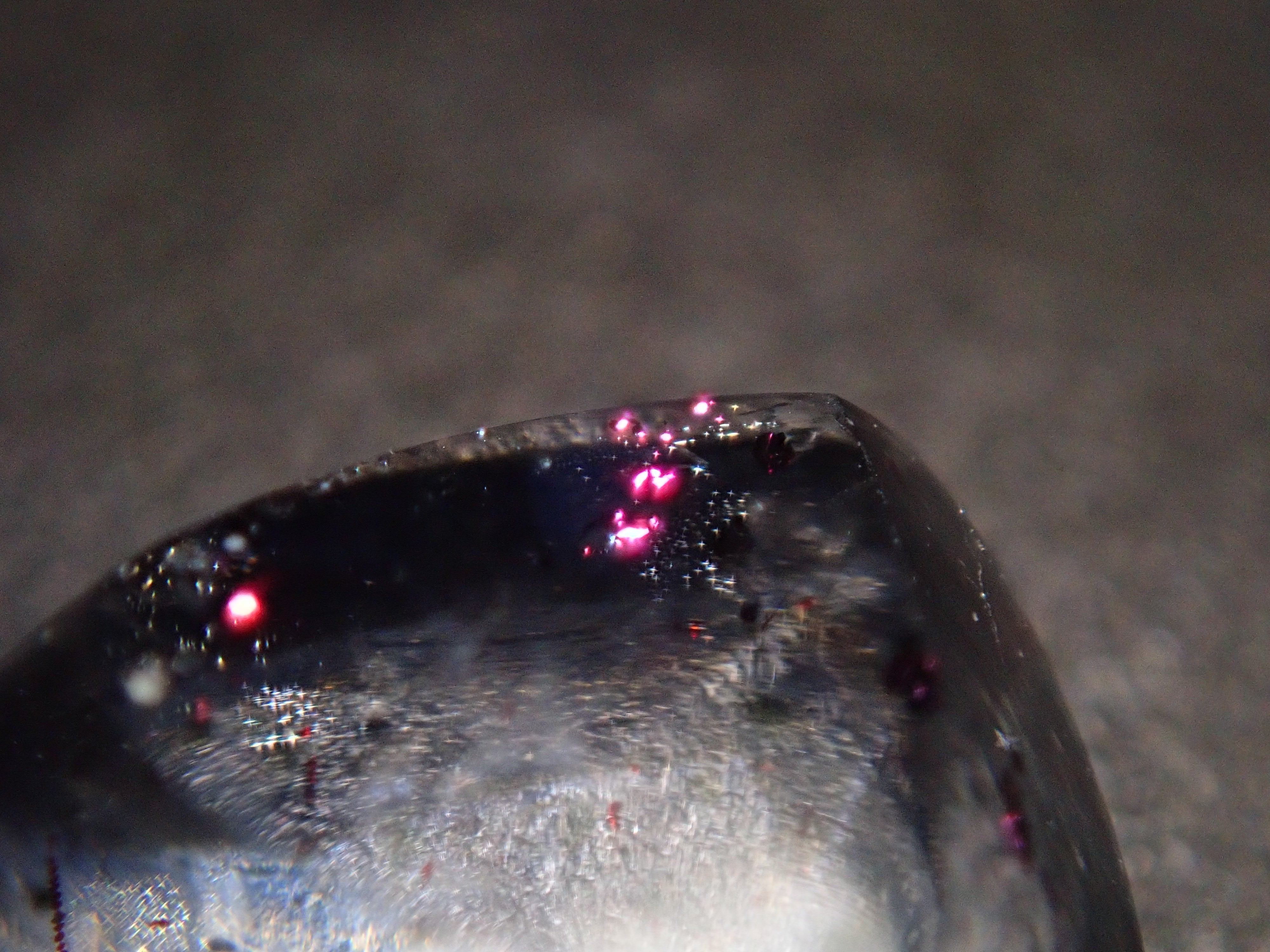 石英在日文中稱為水晶。它是一種在日本非常熟悉的石頭,但它也是一種深寶石,有紫水晶和黃水晶等多種類型。這種晶體看起來像暴風雪般的紅色花朵,被稱為小叮噹石英或粉紅火石英。為了清楚地顯示裡麵包裹體的樣子,我用了筆電筒拍照。這是一塊精心挑選的散裝小叮噹石英,透明度特別高,可以欣賞到它的紅色光芒。