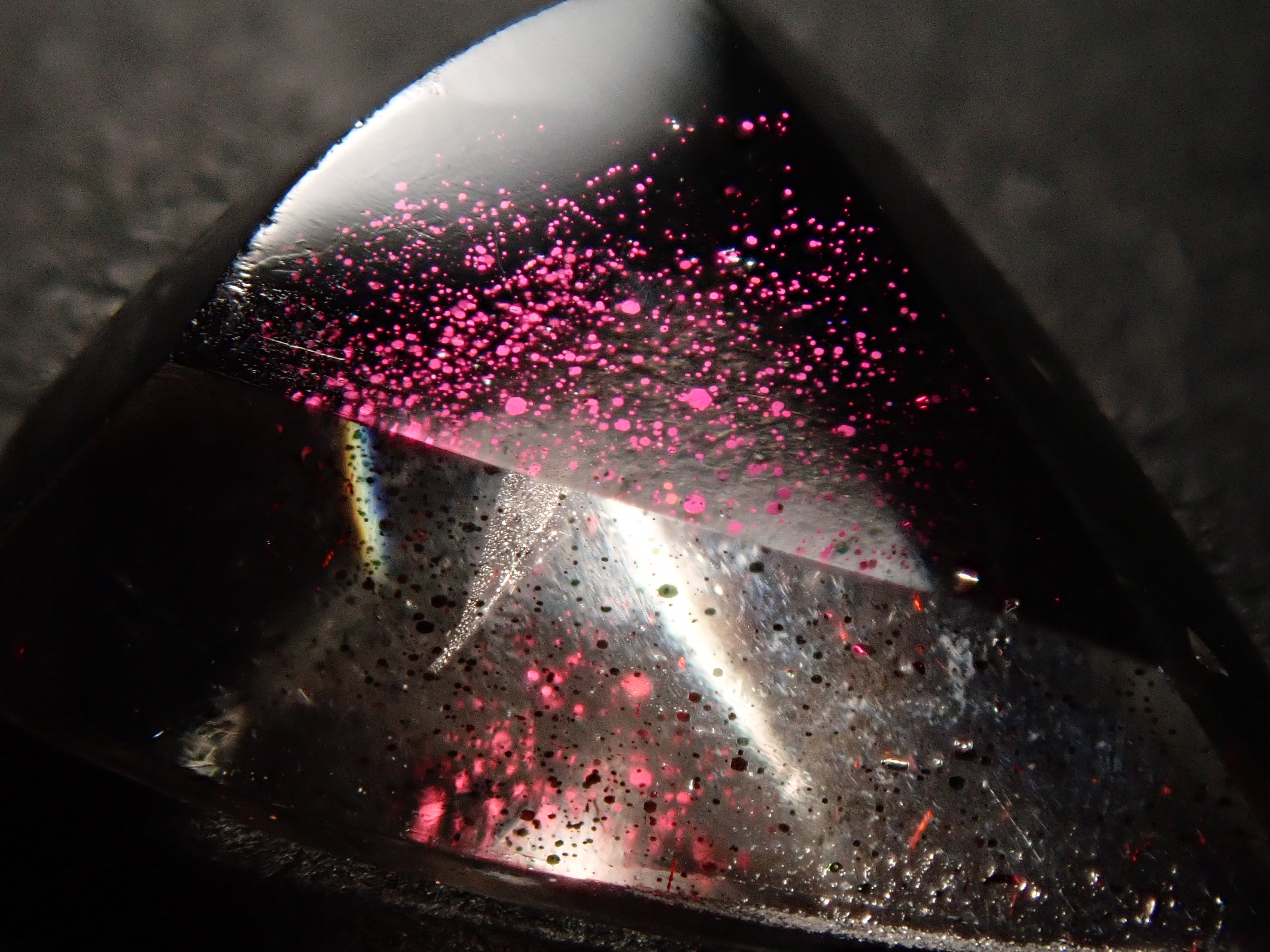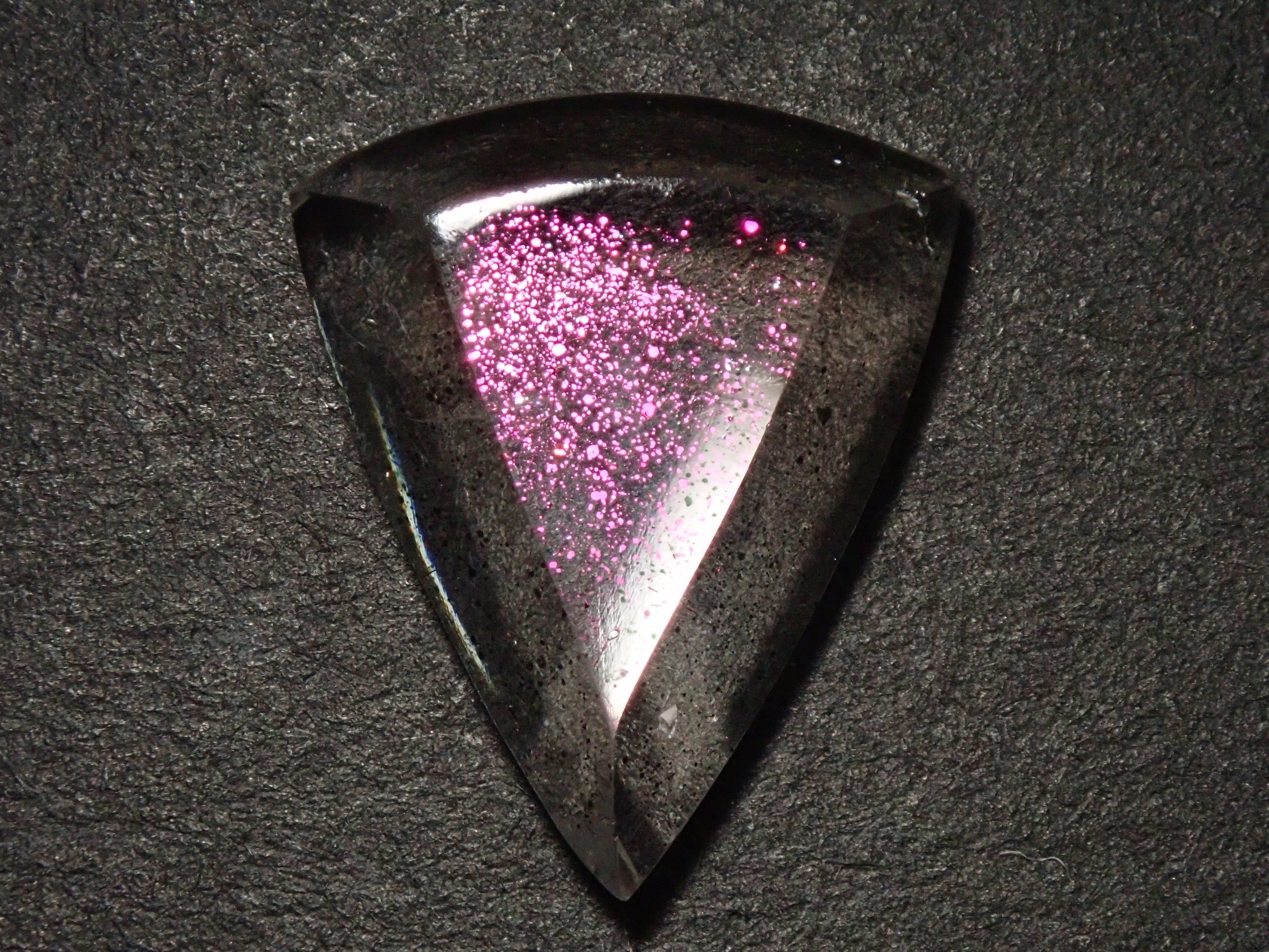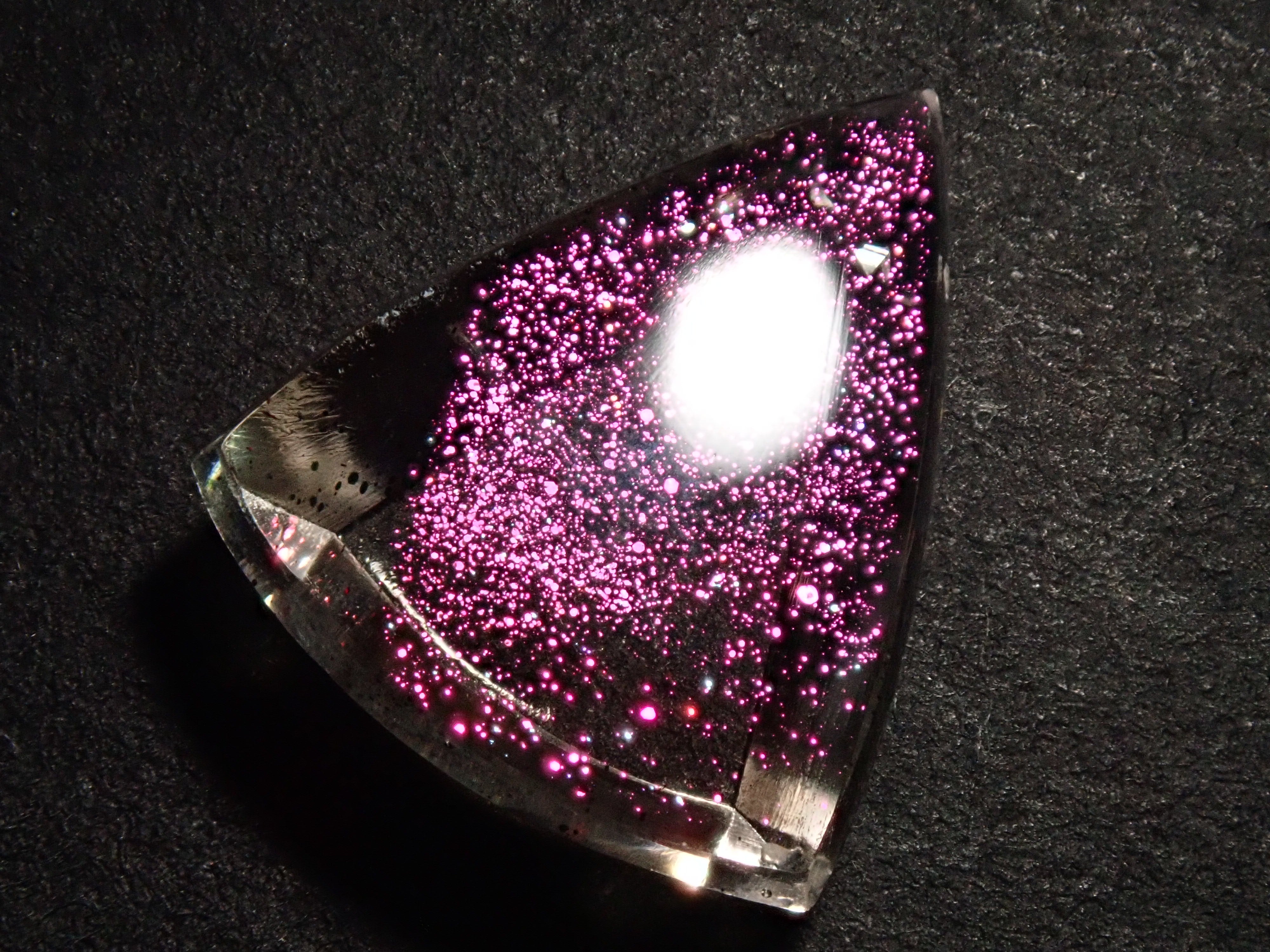 石英在日文中稱為水晶。它是一種在日本非常熟悉的石頭,但它也是一種深寶石,有紫水晶和黃水晶等多種類型。這種晶體看起來像暴風雪般的紅色花朵,被稱為小叮噹石英或粉紅火石英。為了清楚地顯示裡麵包裹體的樣子,我用了筆電筒拍照。