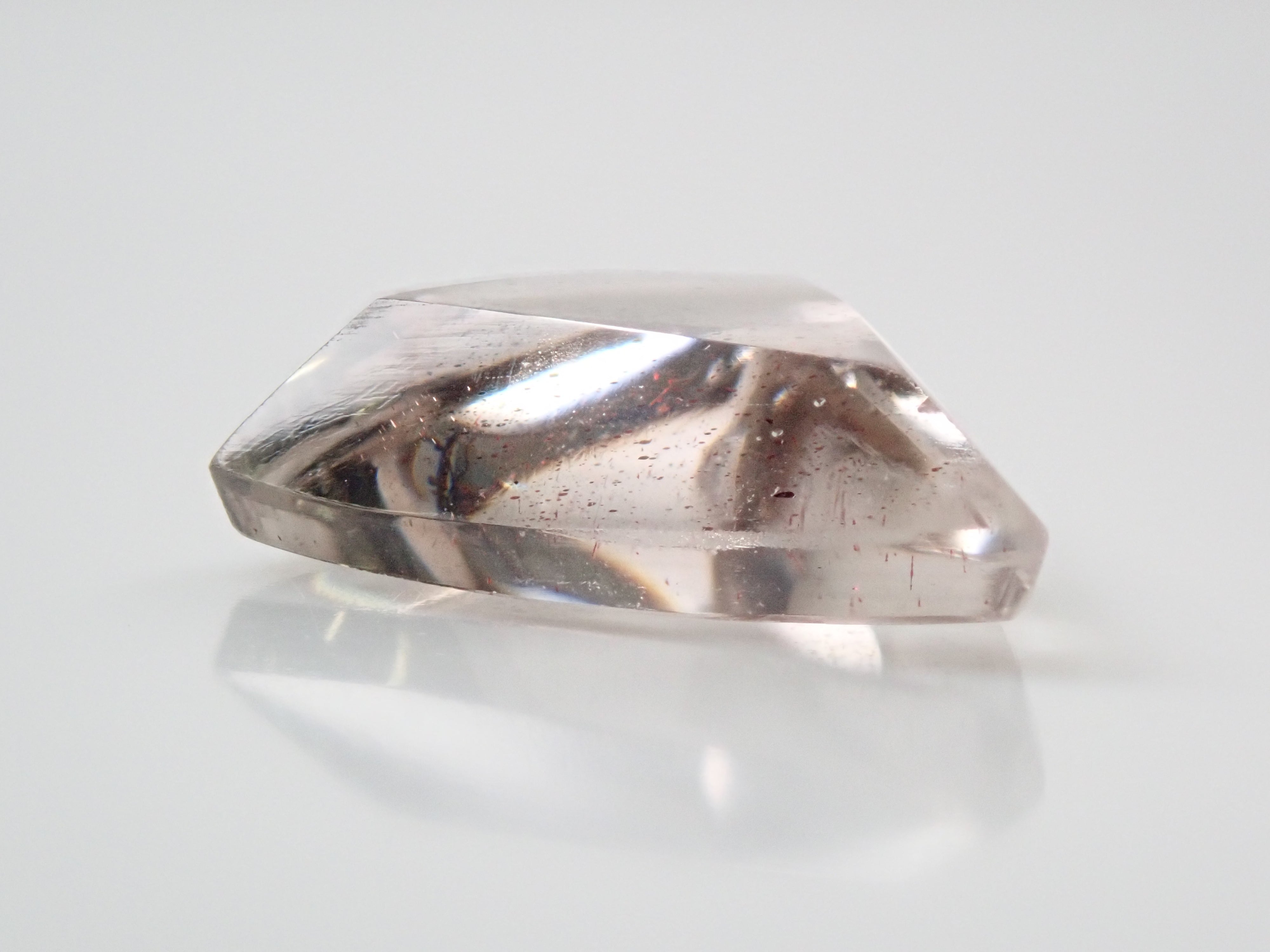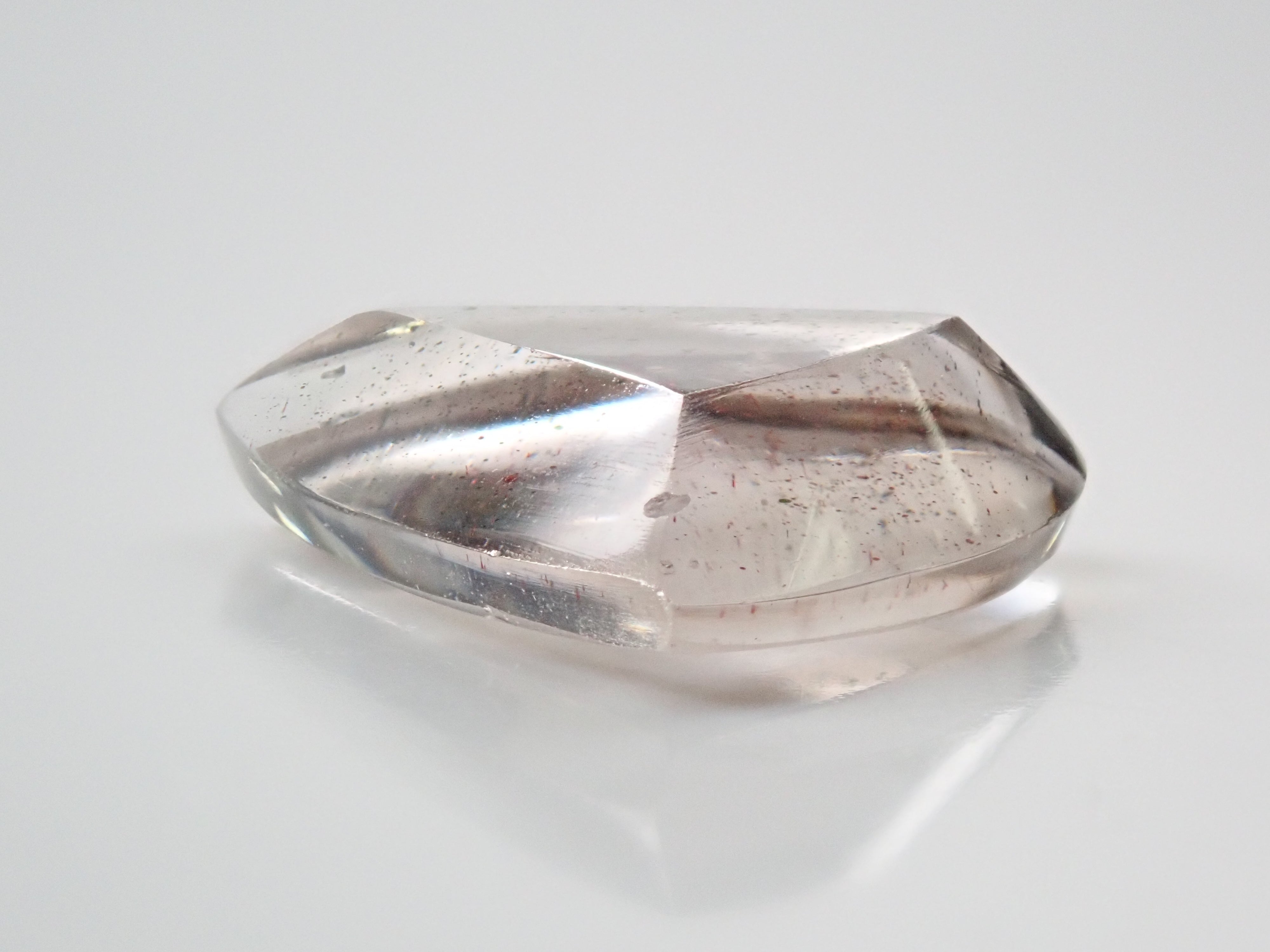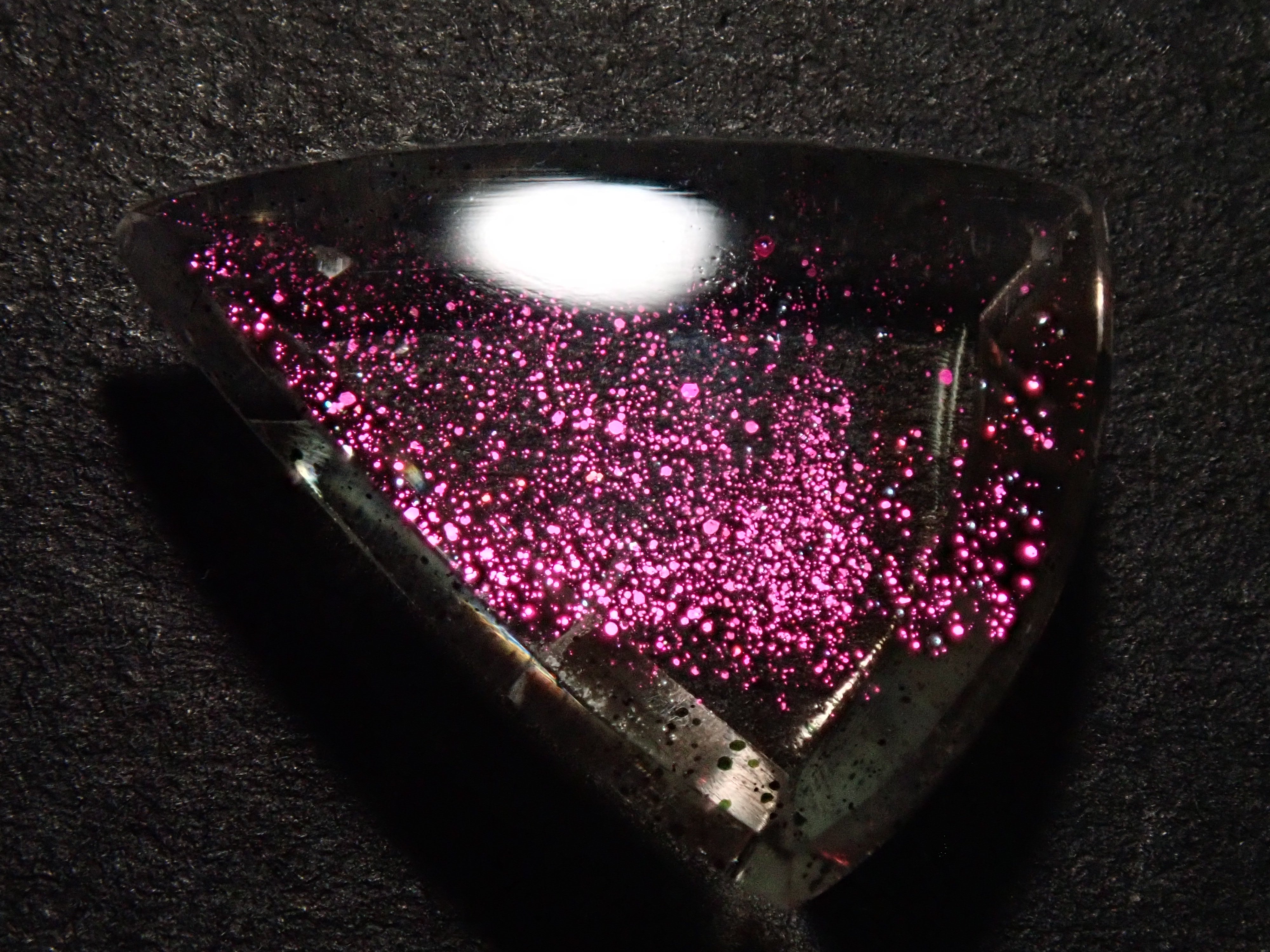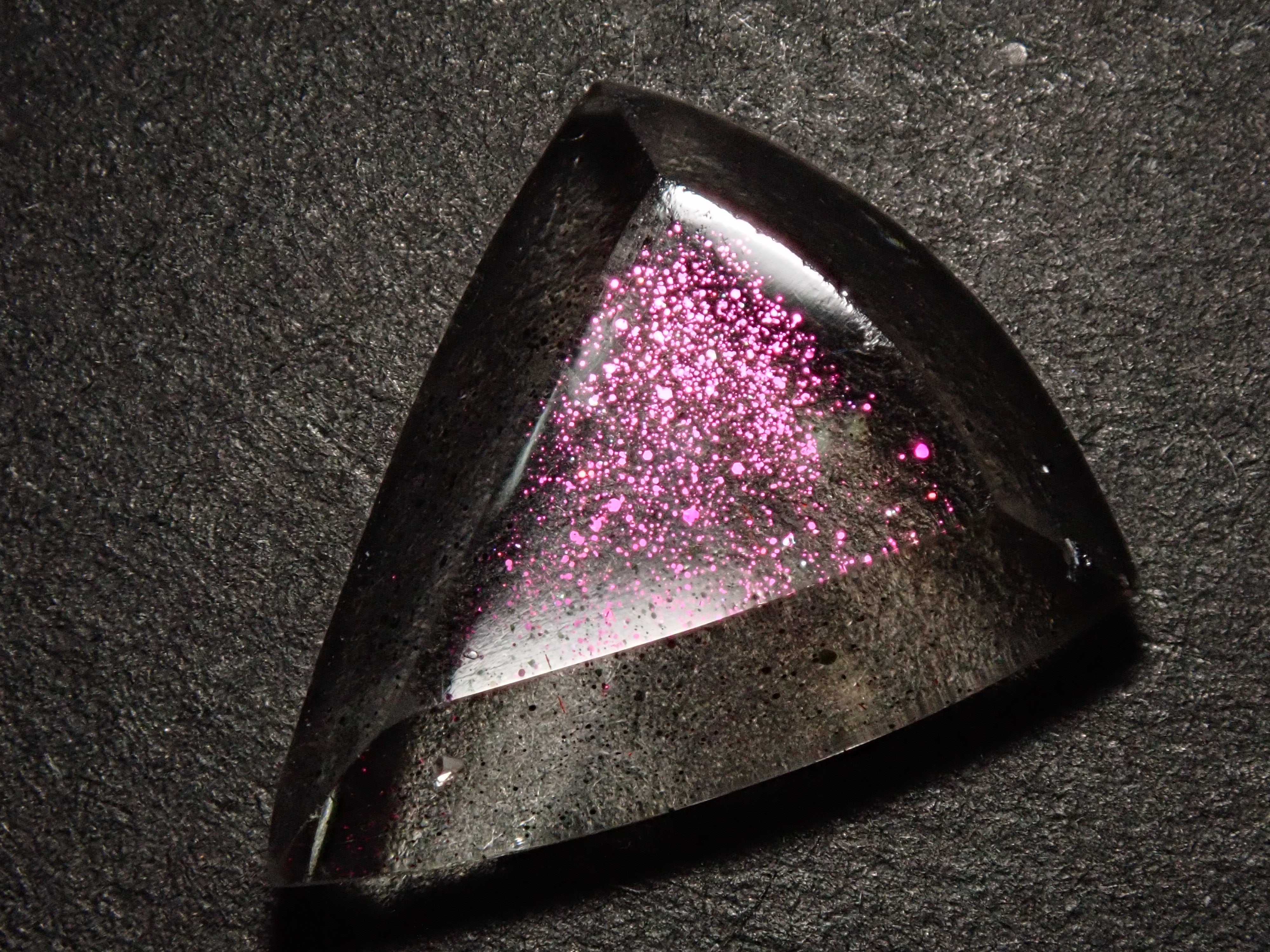 石英在日文中稱為水晶。它是一種在日本非常熟悉的石頭,但它也是一種深寶石,有紫水晶和黃水晶等多種類型。這種晶體看起來像暴風雪般的紅色花朵,被稱為小叮噹石英或粉紅火石英。為了清楚地顯示裡麵包裹體的樣子,我用了筆電筒拍照。
