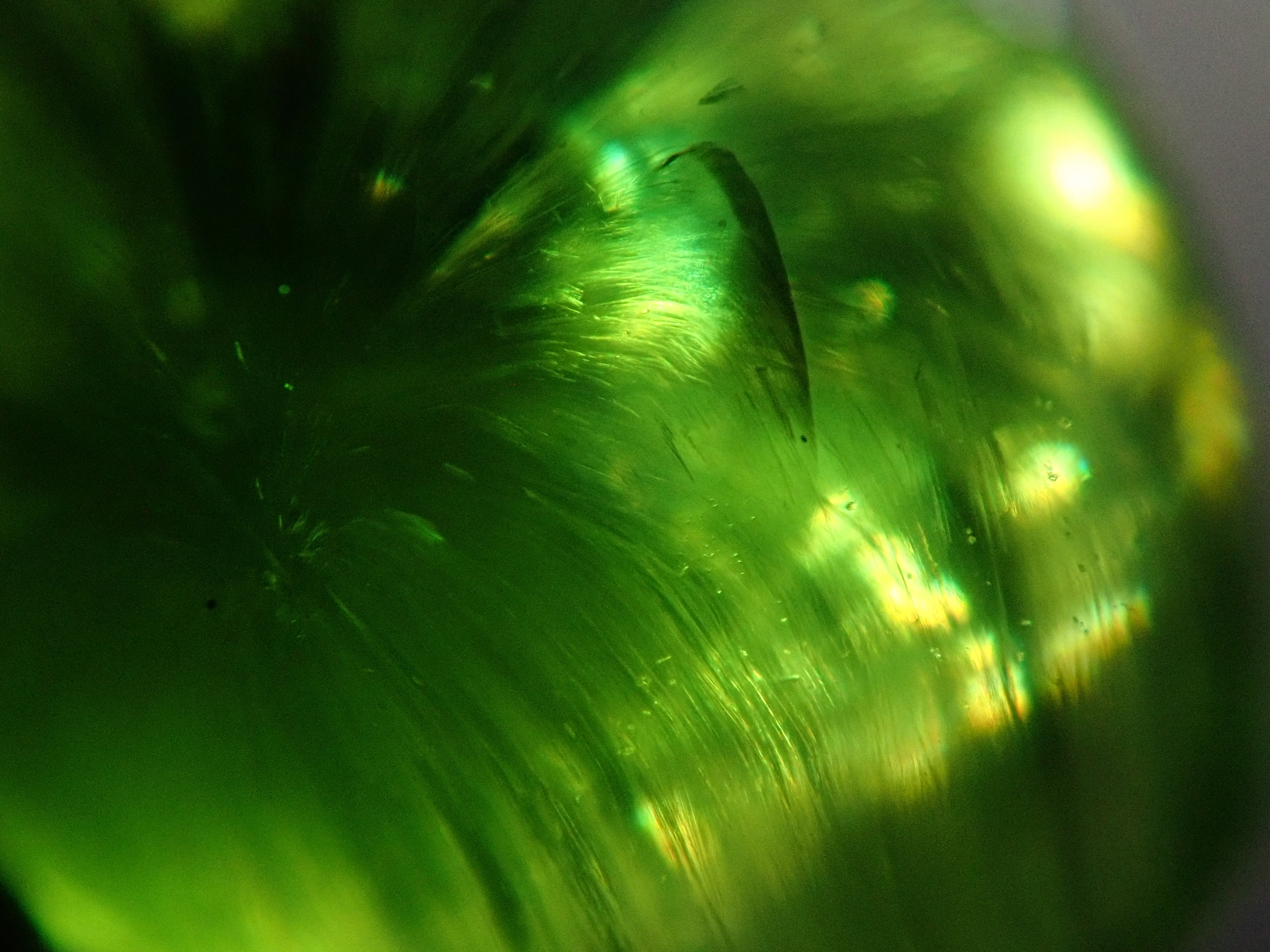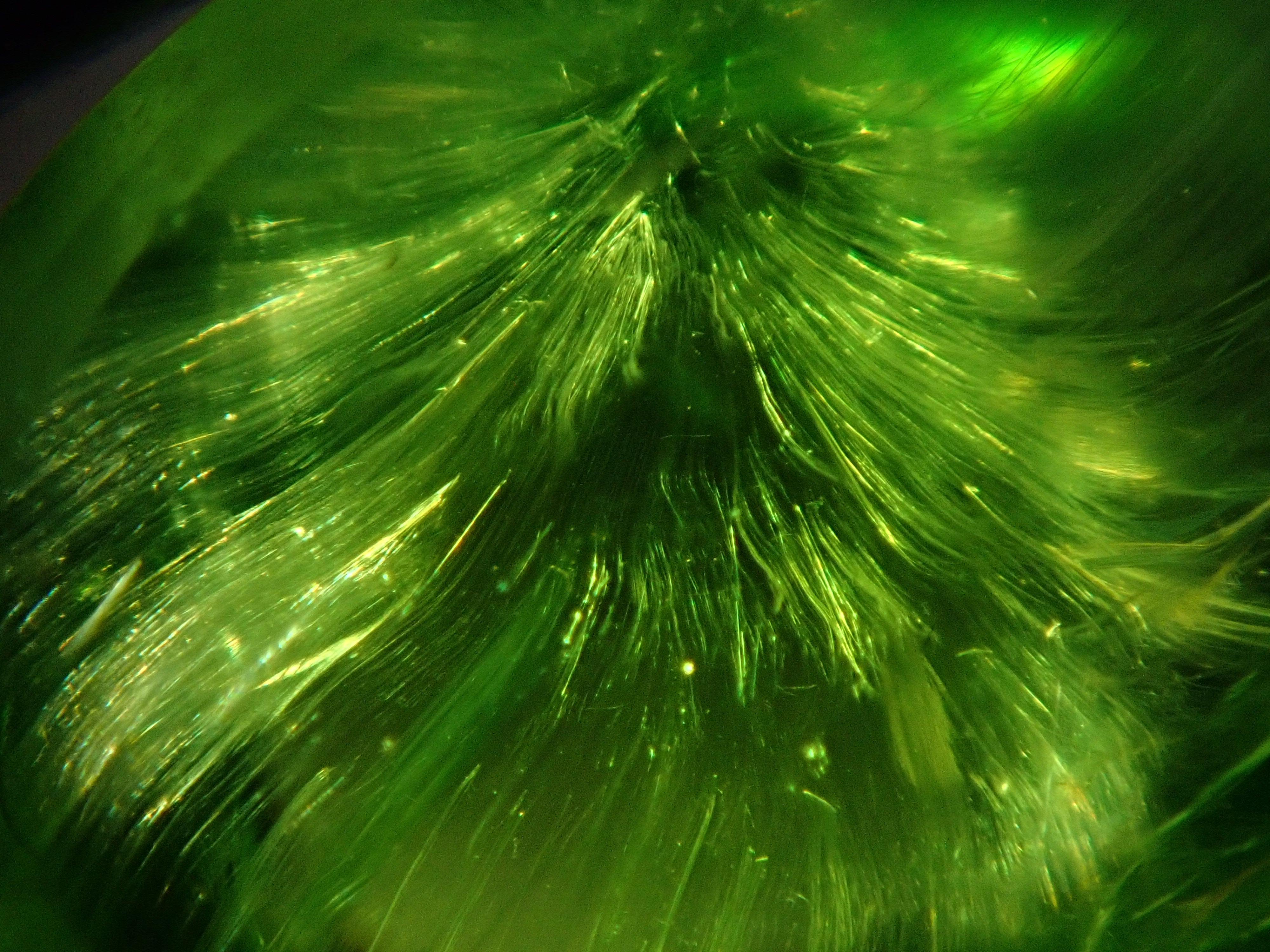 石榴石具有強烈的光色散和強烈的閃光。其中,這顆綠色的「濃綠榴石」是一種特別美麗且稀有的石榴石。這種類型的內含物被稱為“馬尾”,看起來像馬尾巴,甚至有貓眼效果。而且,這在俄羅斯也是很少見的。筆燈用於攝影。石頭的背面基本上是未拋光的。透過顯微鏡檢查證實了馬尾草的存在。俄羅斯製造,顆粒尺寸達 2ctUP。