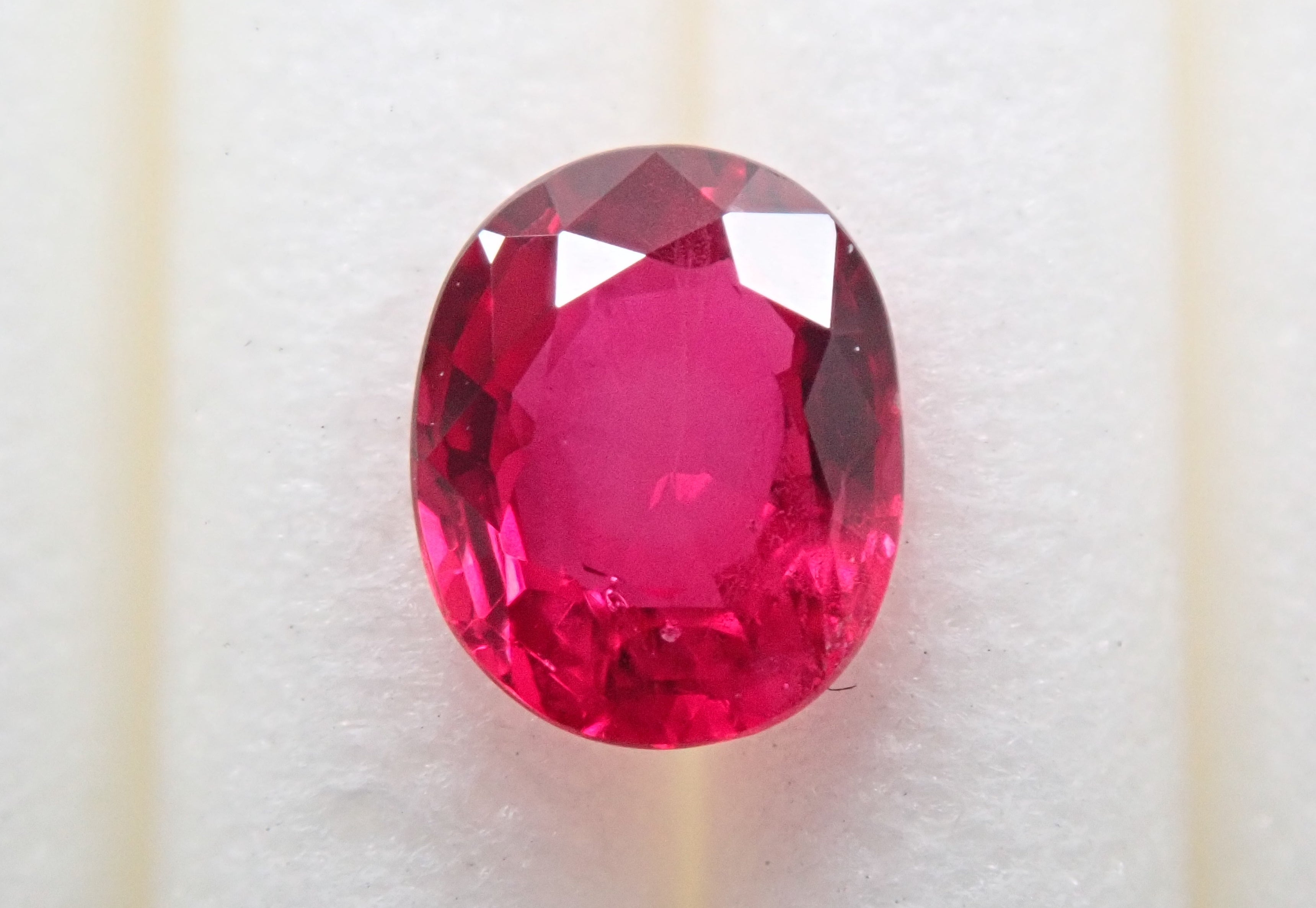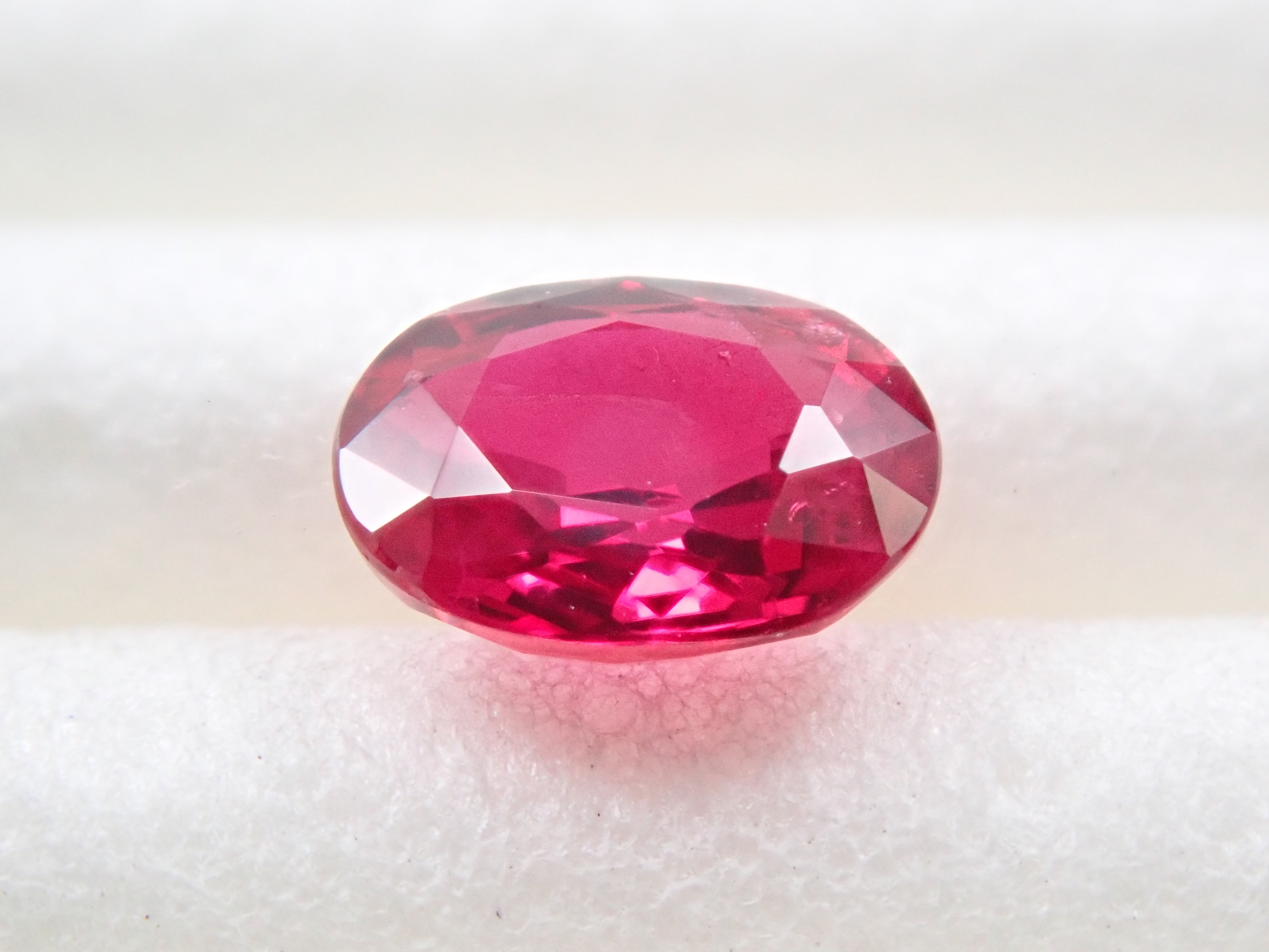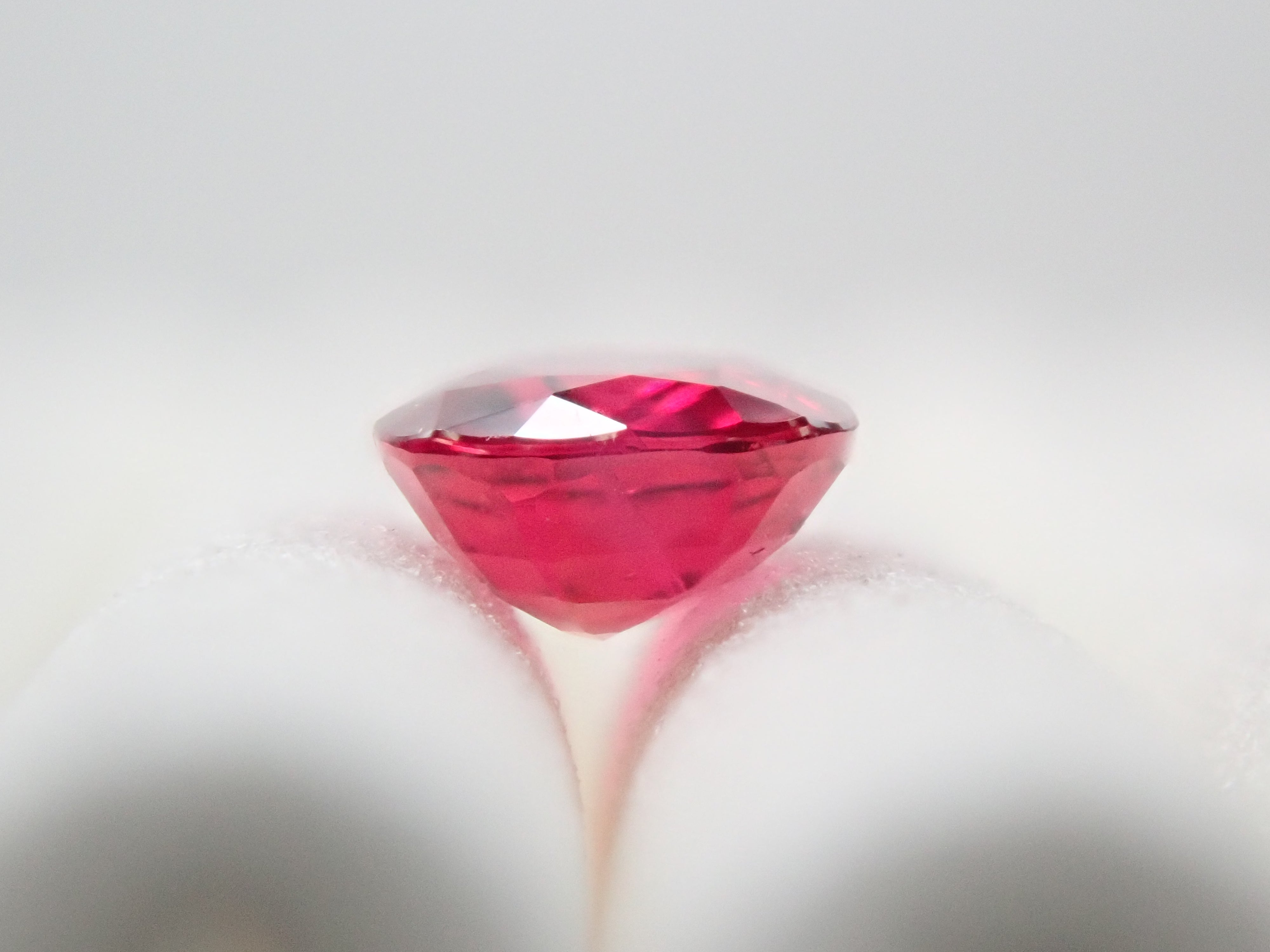 這是一顆產自泰國的橢圓形切割鴿血紅寶石。它透明度極高,色澤鮮豔。附有AIGS鑑定證書。