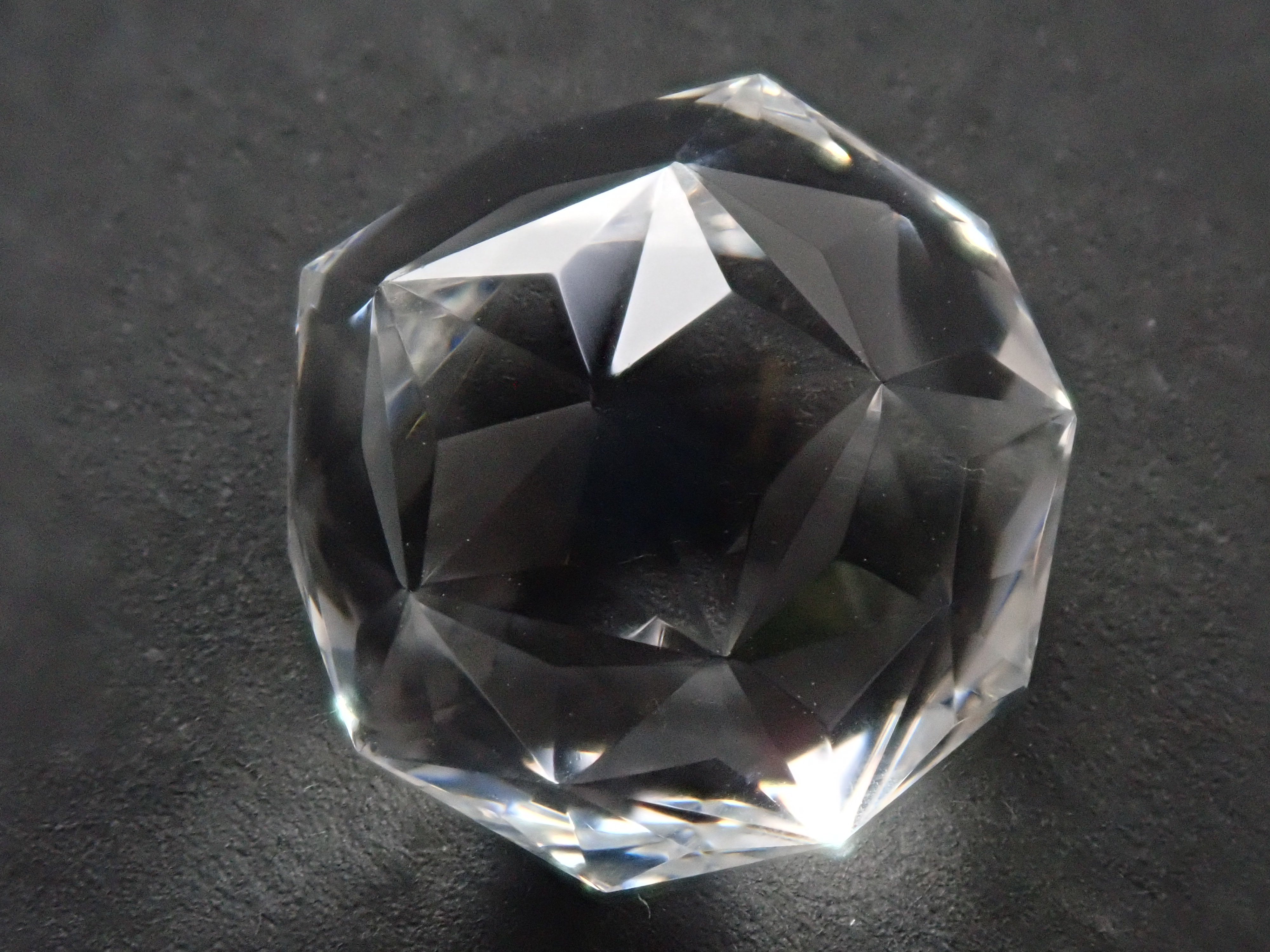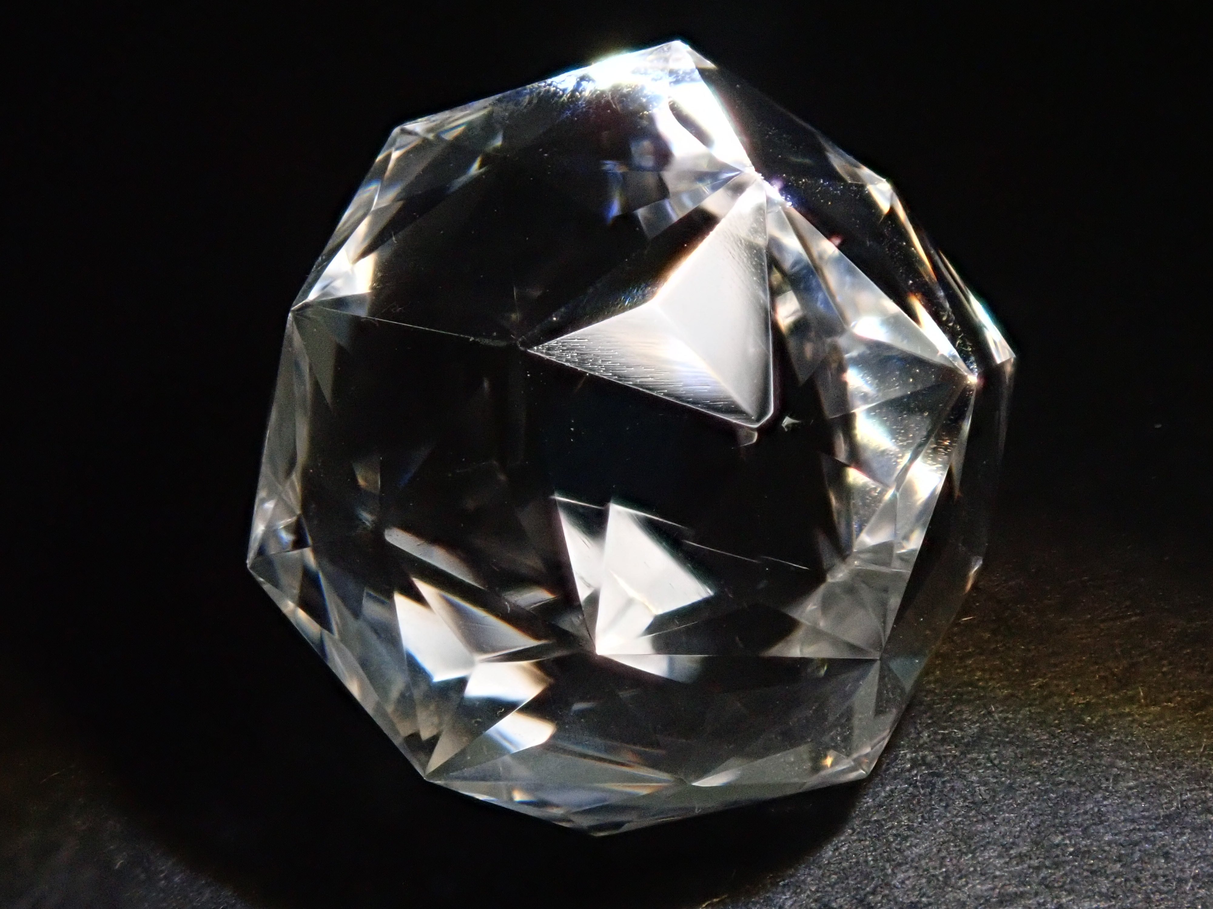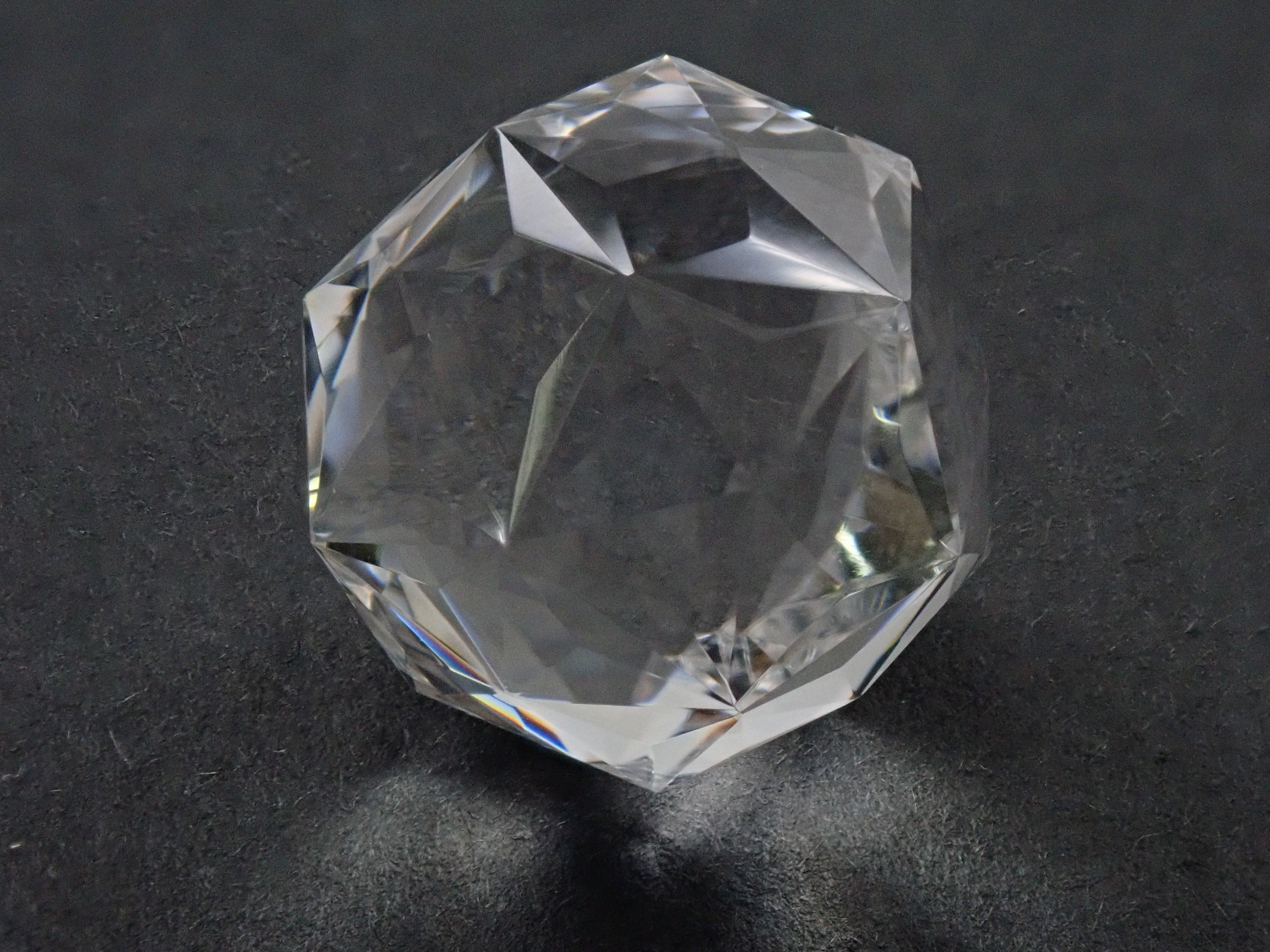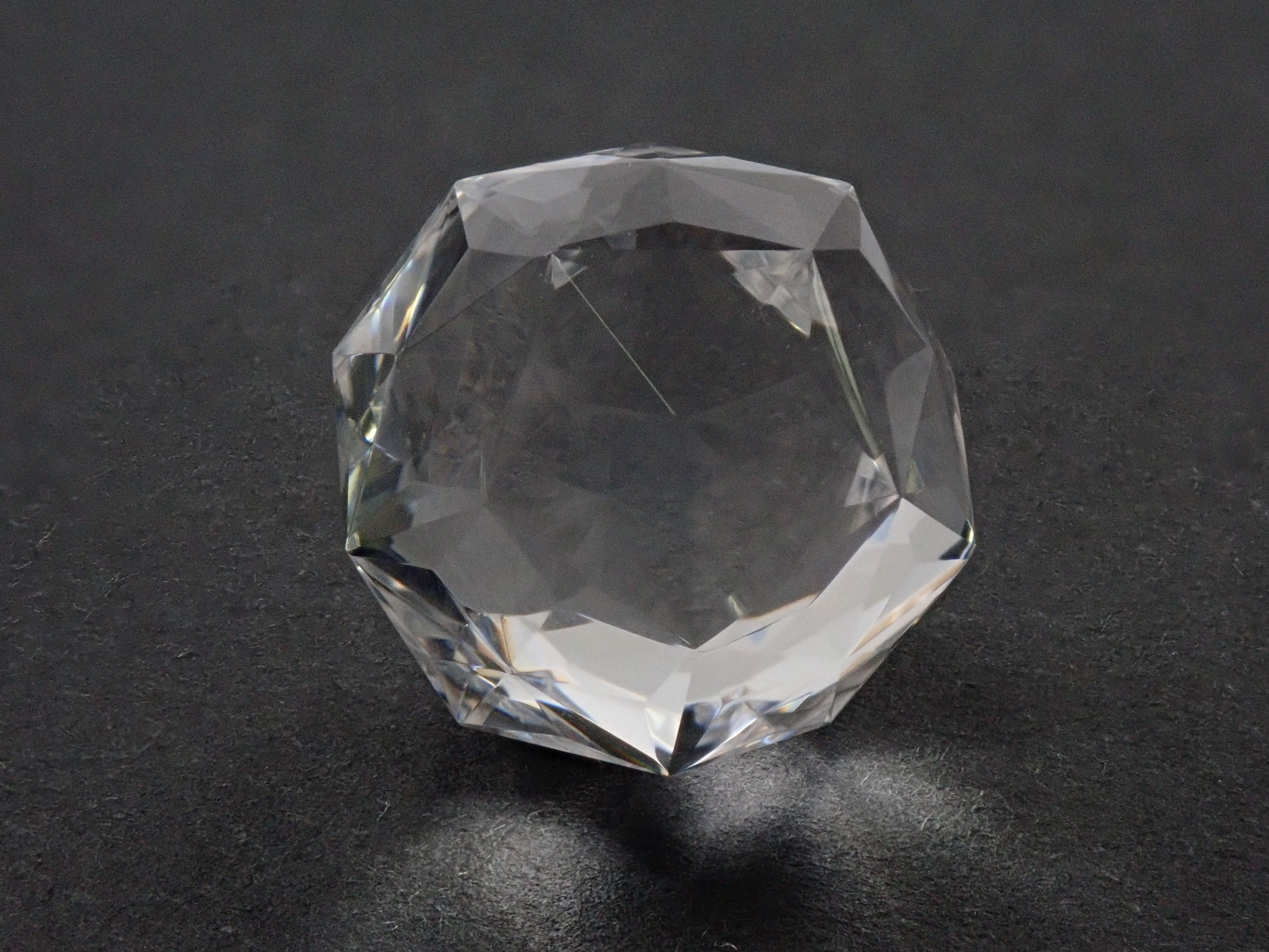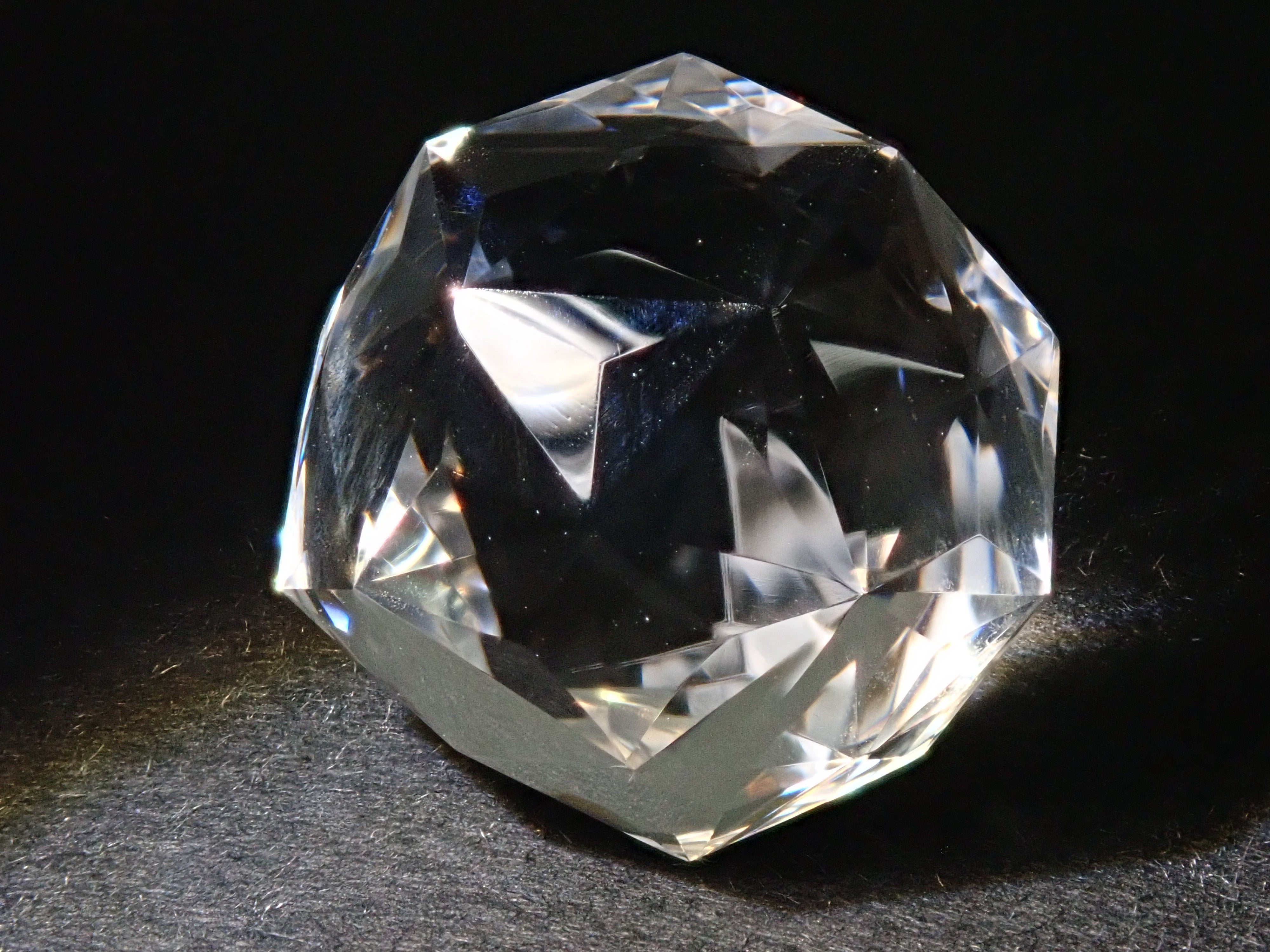 這就是KIKYO CUT,只有清水奇蹟的代表人物清水幸雄先生才能創造,他是世界上唯一能做到這一點的人。對於桔梗切割,首先,使用由 12 個正五邊形包圍的正十二面體作為基底,並向每個正五邊形的中心製作帶有脊線的五邊形切割。在此基礎上,進行進一步切割以建立總共 180 個面的多面體。這種切割需要經過許多令人畏懼的步驟和精細的工作才能完成,因其形狀而被稱為“風鈴草切割”。包括一個特殊的補丁。