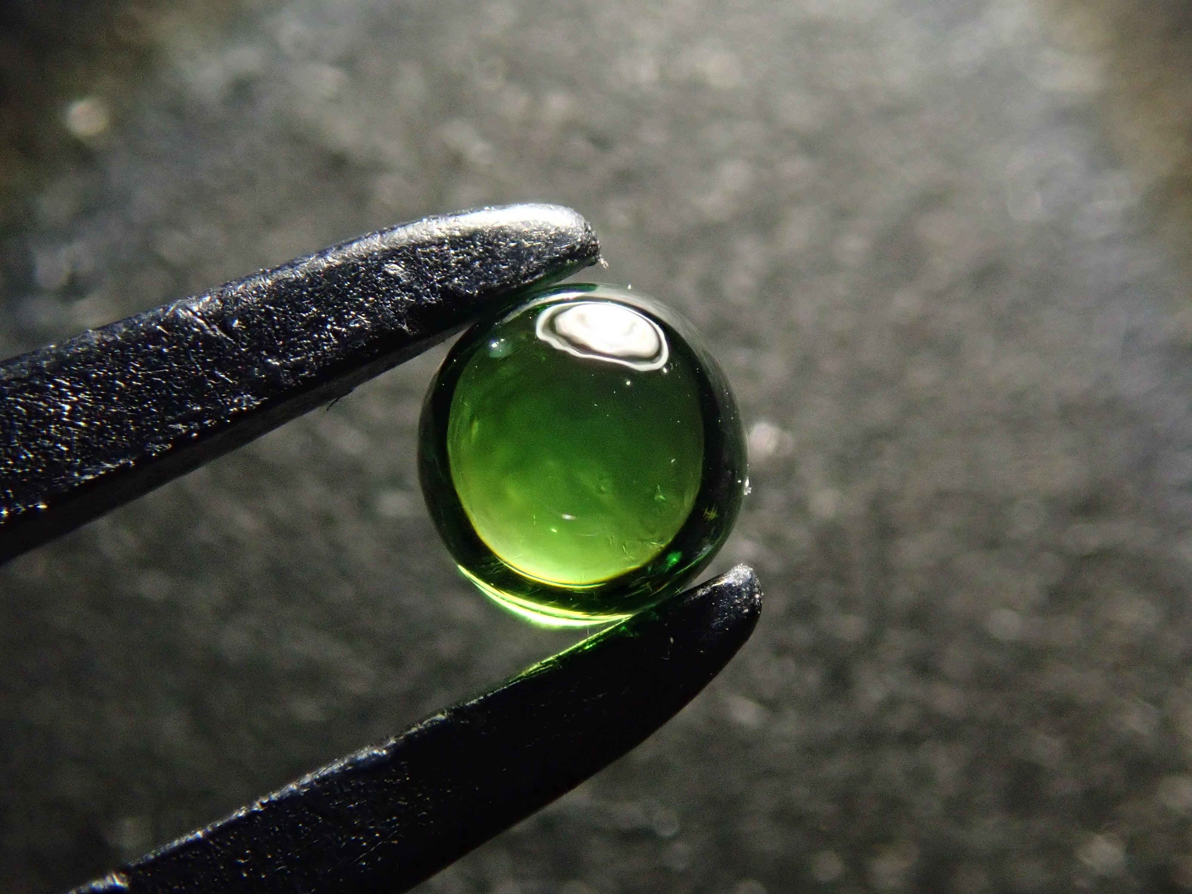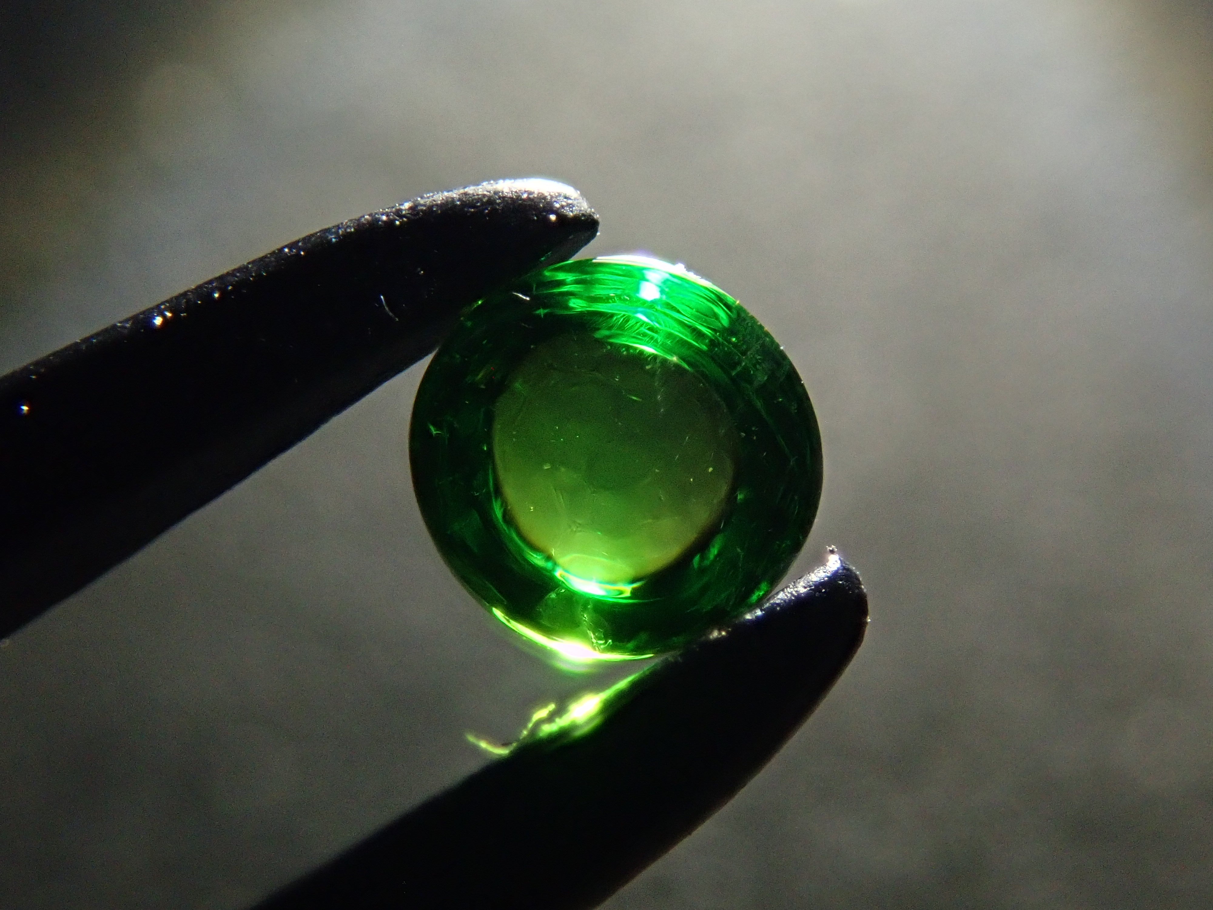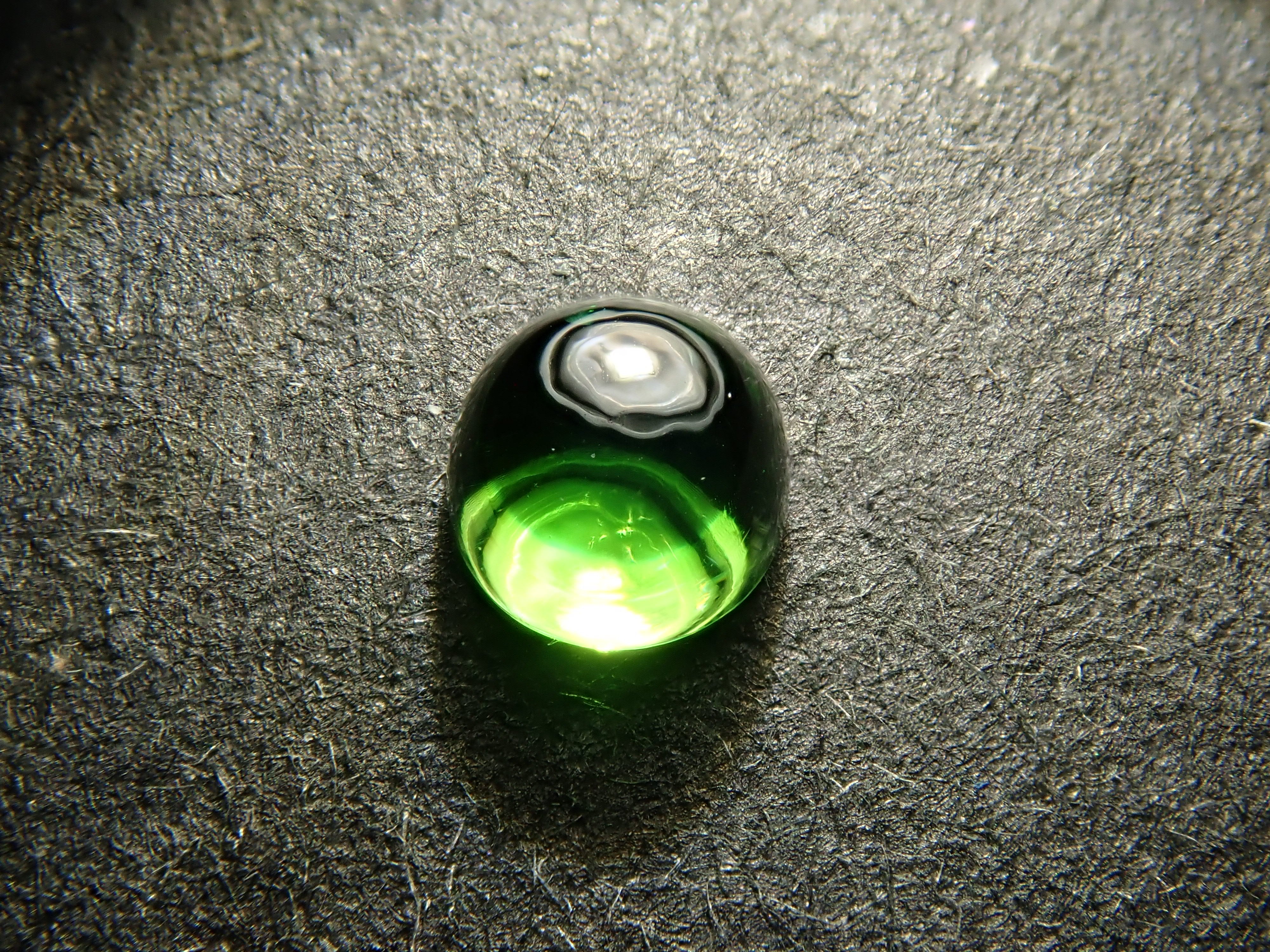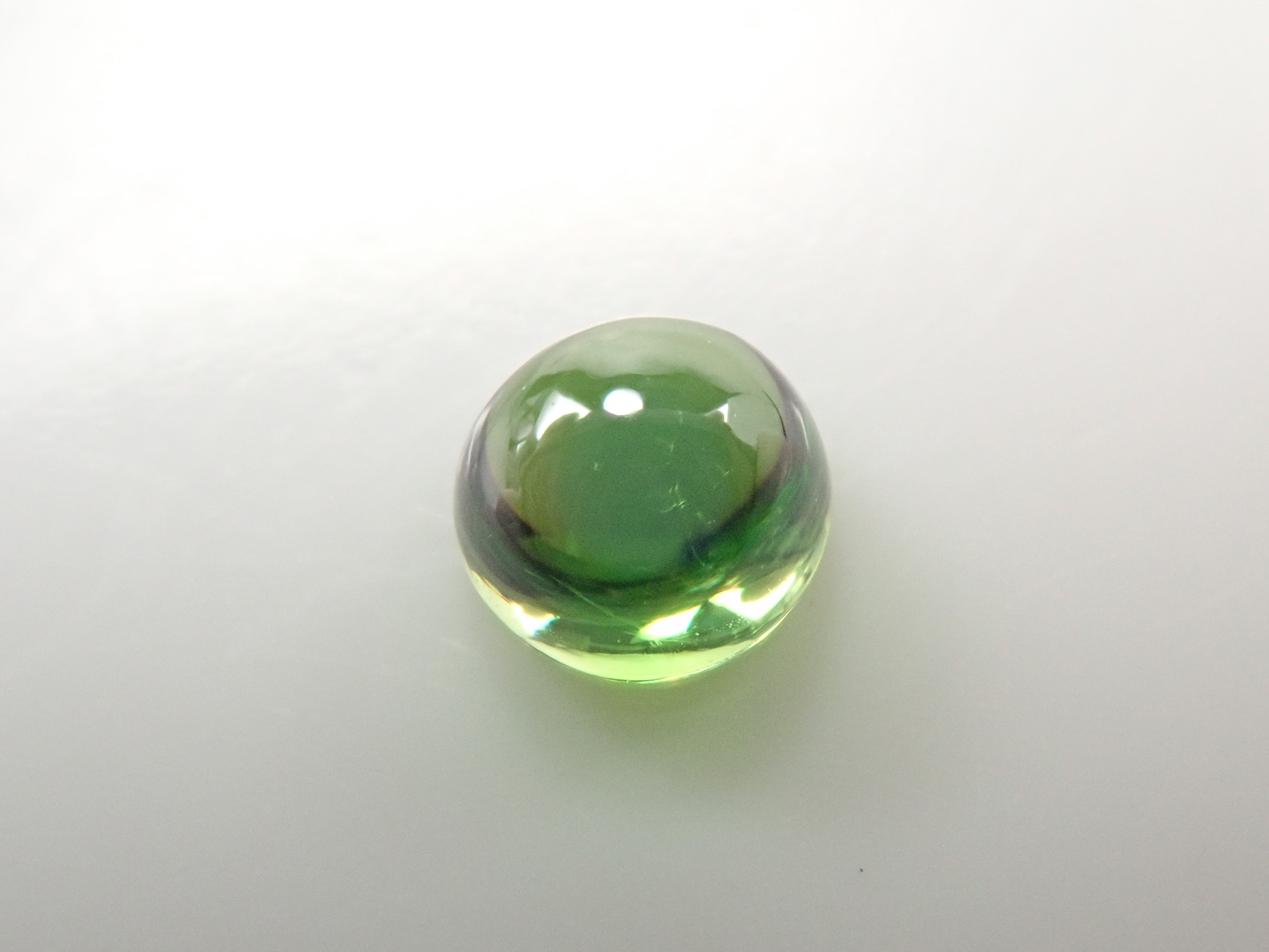 石榴石色散性強,散發出強烈閃耀的光芒。其中,綠色的「翠綠榴石」特別美麗罕見。這是一顆凸圓形切割的俄羅斯翠綠榴石。