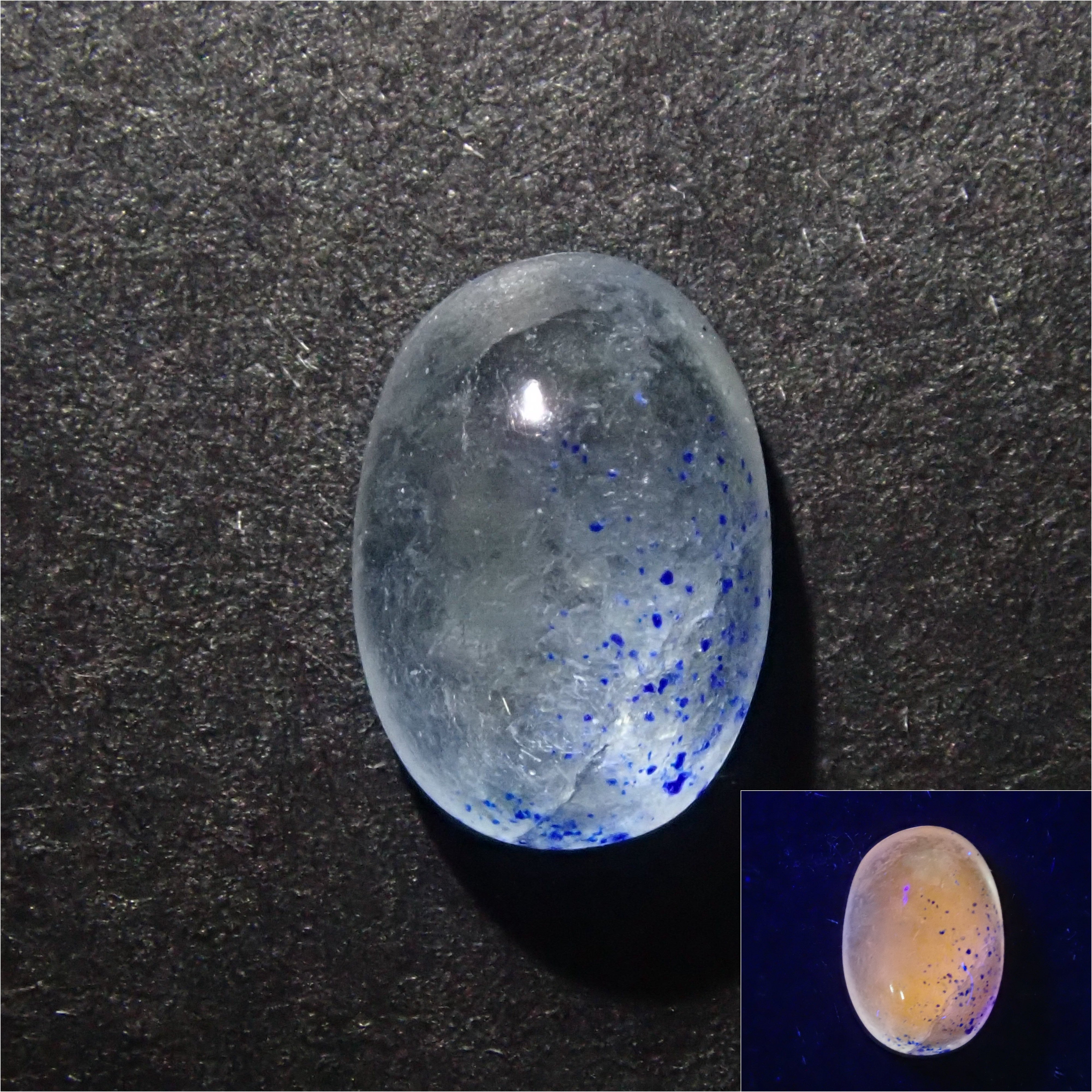 稀有石頭,阿富汗石。它是在阿富汗巴達赫尚省發現的藍色礦物,於 1968 年命名。再加上它的美麗,它也是一種迅速確立了稀有寶石地位的寶石。硬度低的寶石級寶石非常罕見。請務必將其添加到您的收藏中。使用黑光燈欣賞螢光。