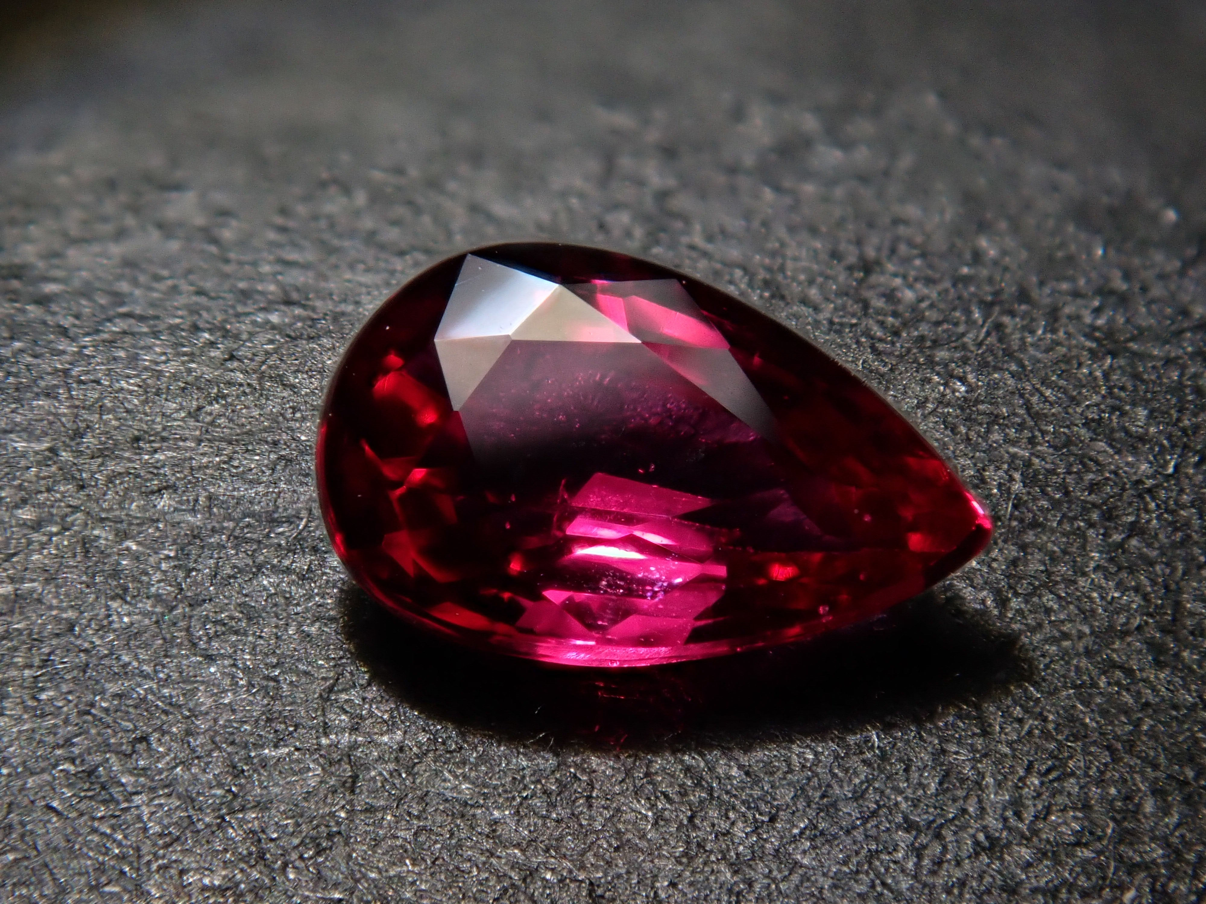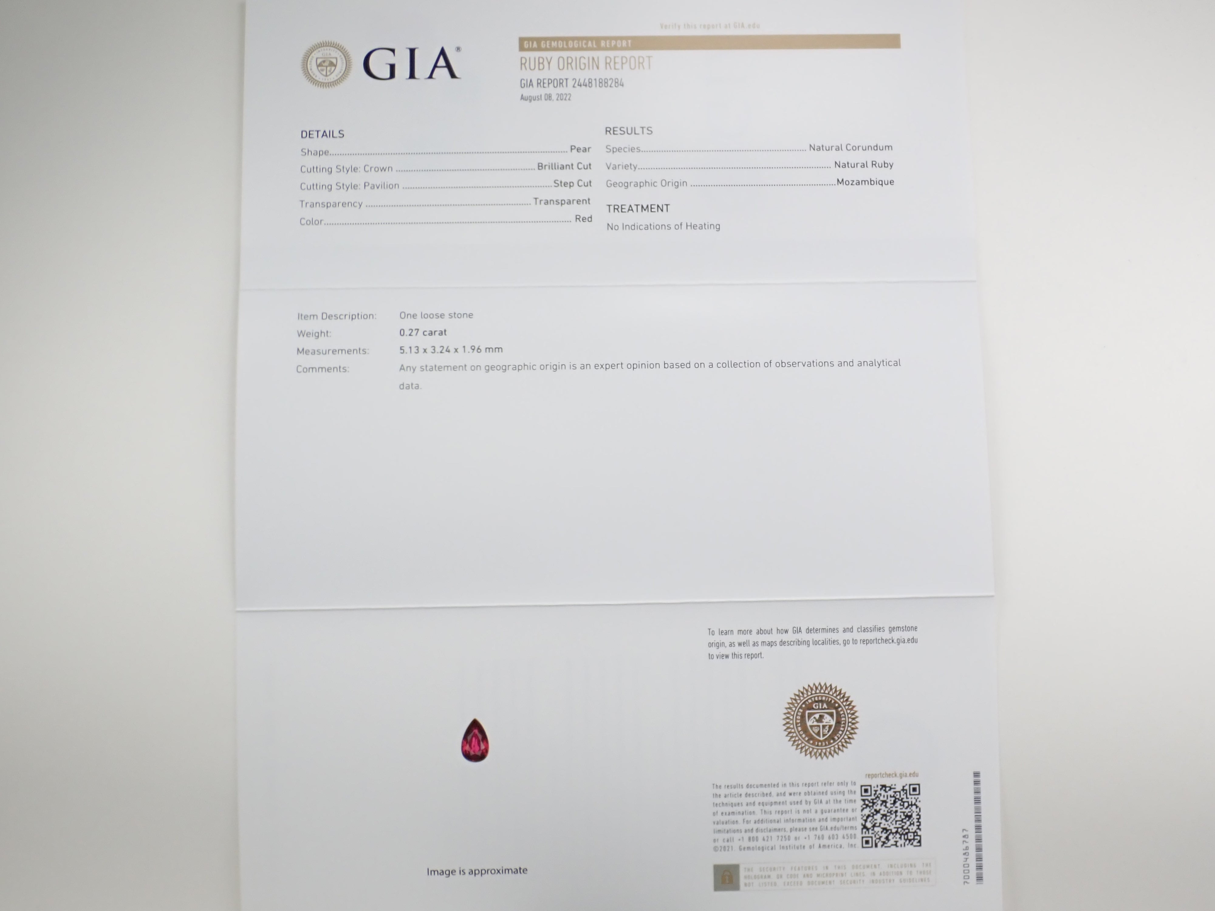 紅寶石自古以來就被視為寶石而受到推崇。指紅剛玉。紅寶石是僅次於鑽石的第二硬寶石,硬度為9,堅韌、穩定且易於處理。這是產自莫三比克的稀有未加熱紅寶石。它是梨形切工,透明度高,品質高。隨附 GIA 真品證書。