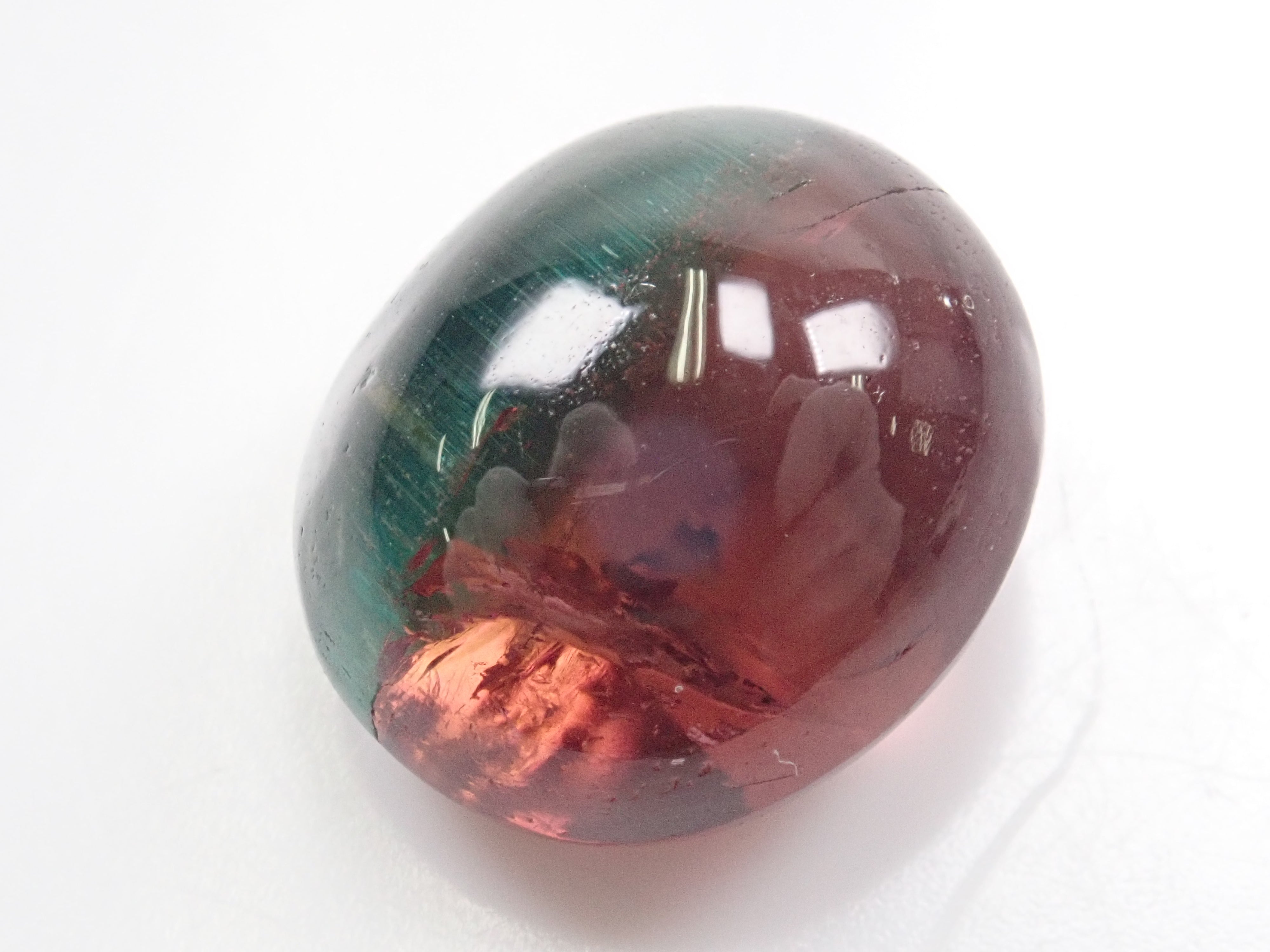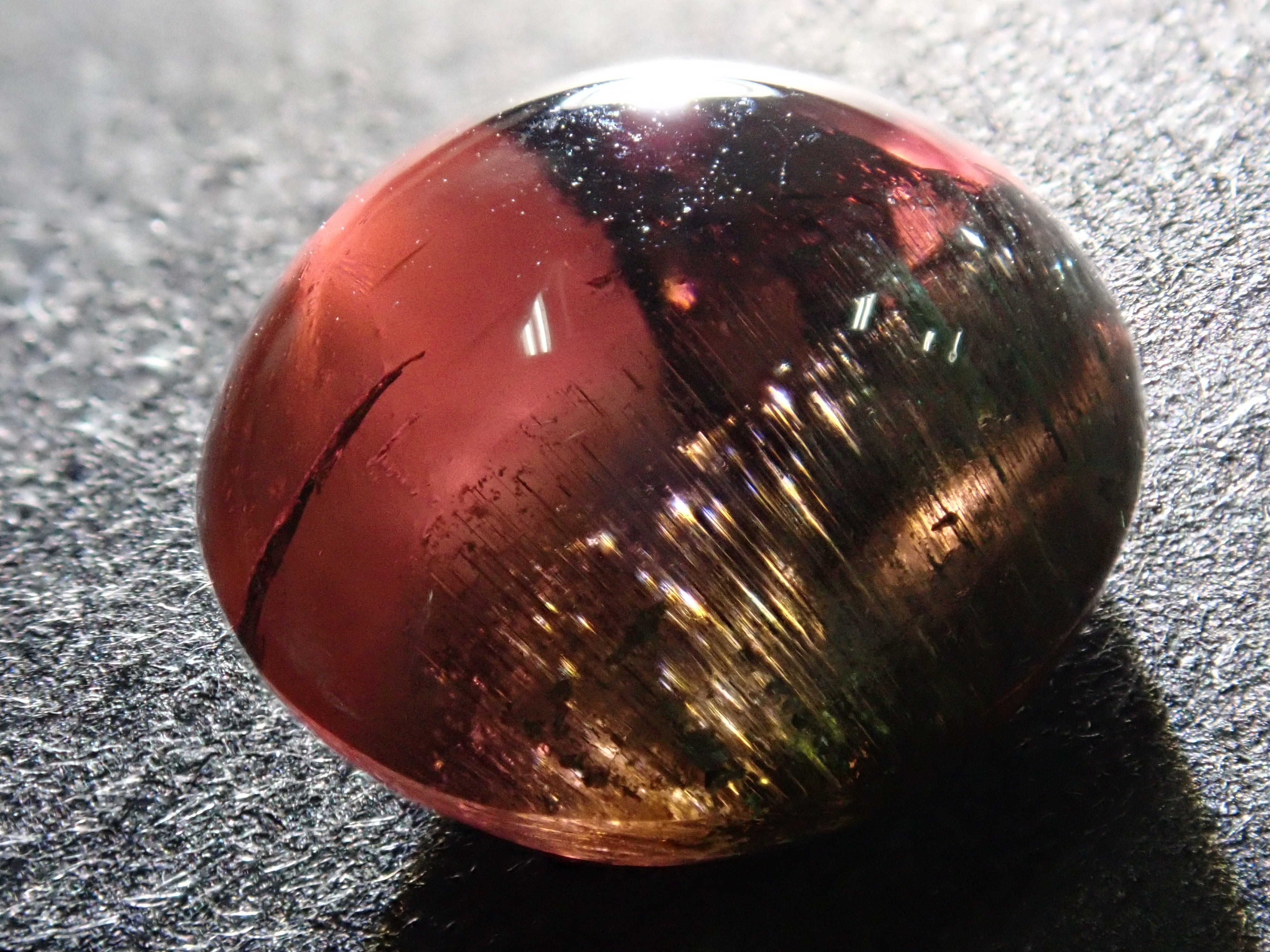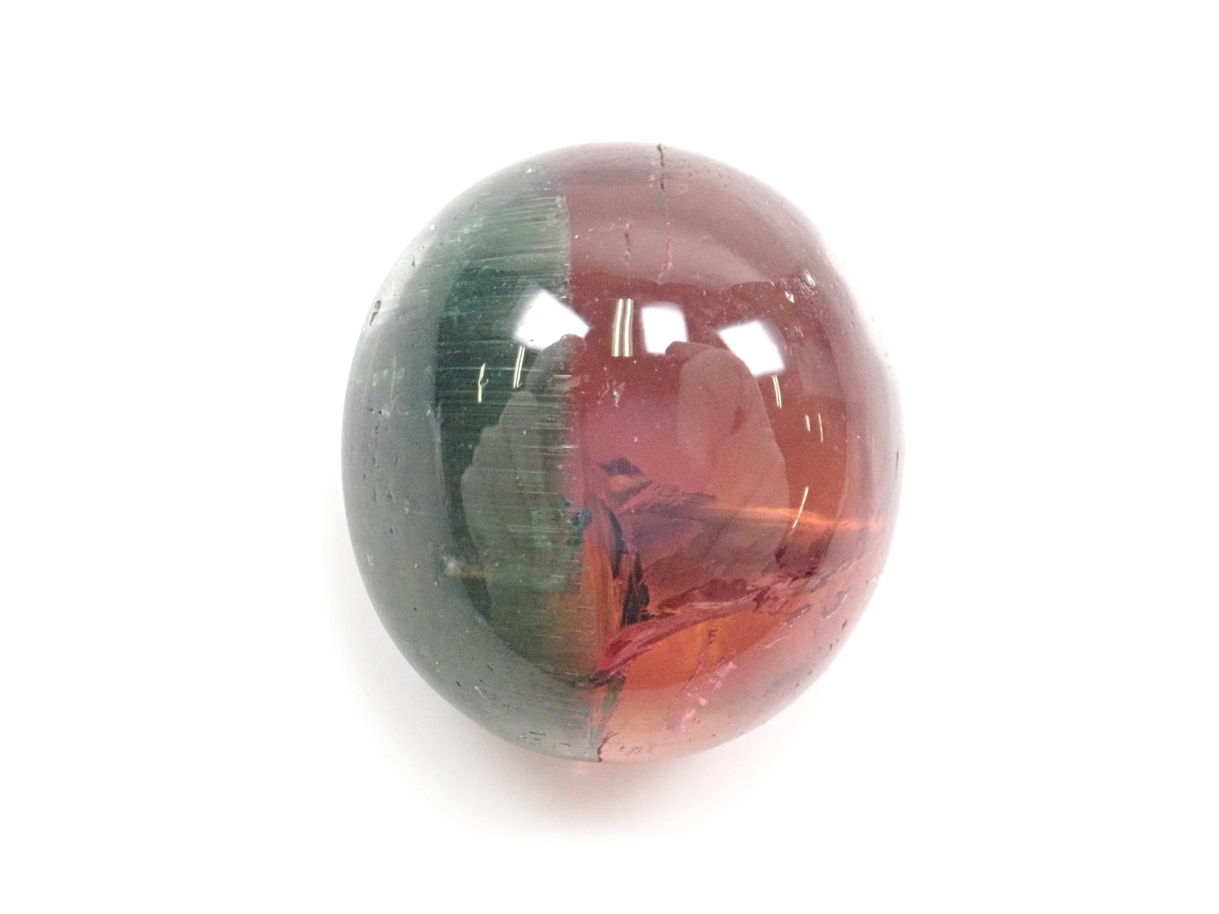 碧璽被稱為色彩寶庫。它擁有無數豐富的顏色,包括粉紅色、紅色、藍色、綠色、靛藍、橙色、紫色、黑色和棕色。這顆碧璽上竟然同時呈現兩種顏色。照片是用筆型手電筒拍攝的。碧璽背面基本未經打磨。這是一顆罕見的雙色碧璽,綠色和橙色之間有著美麗的交錯。