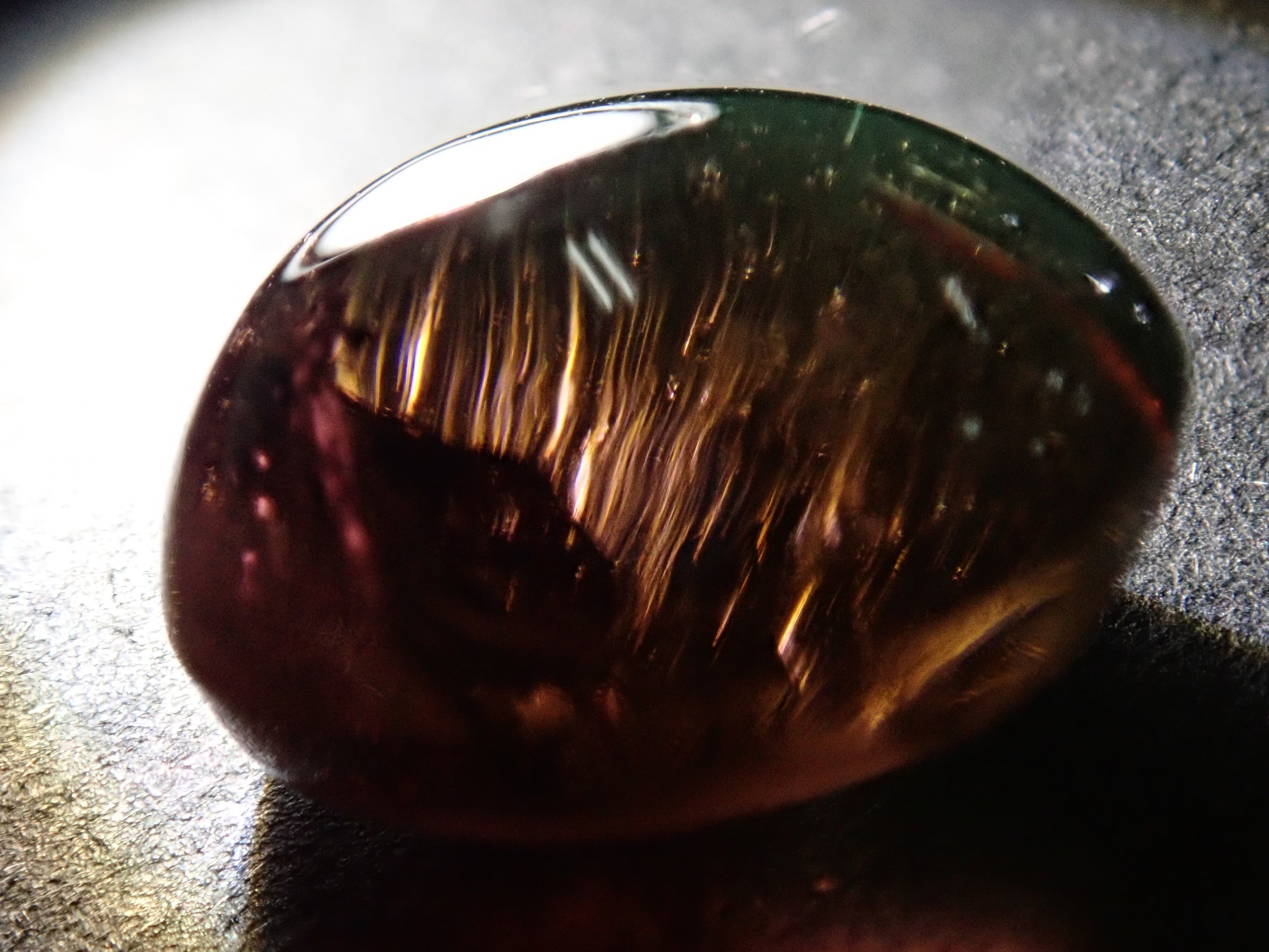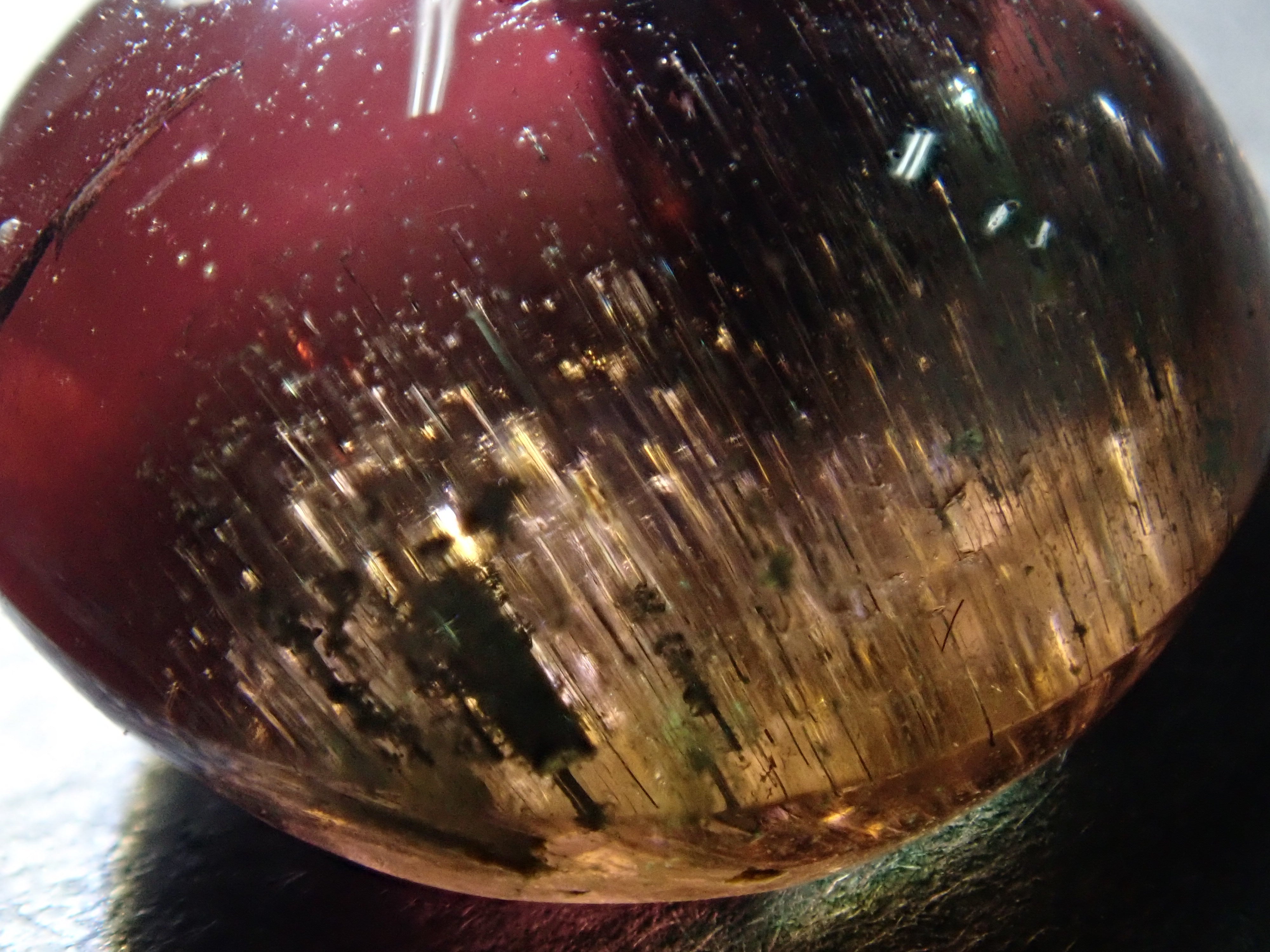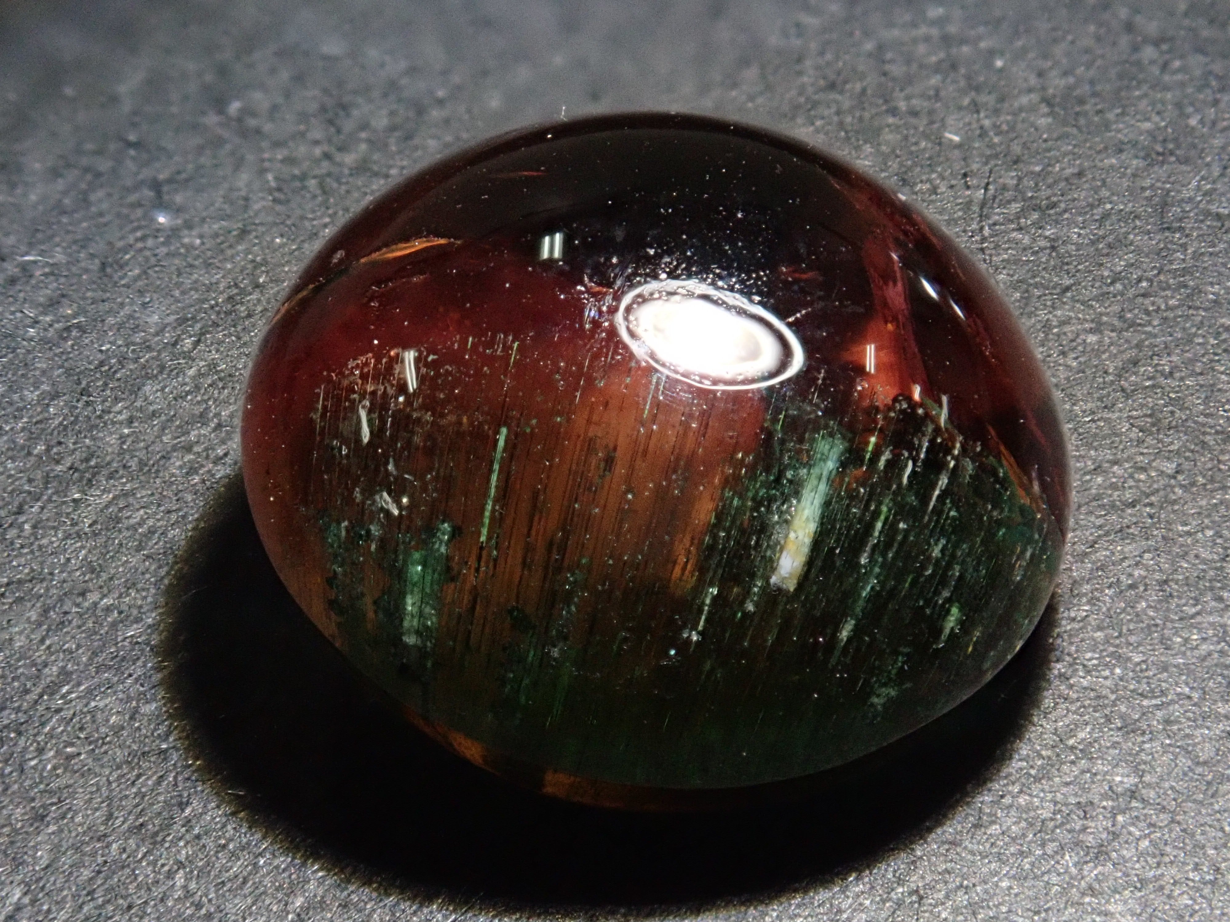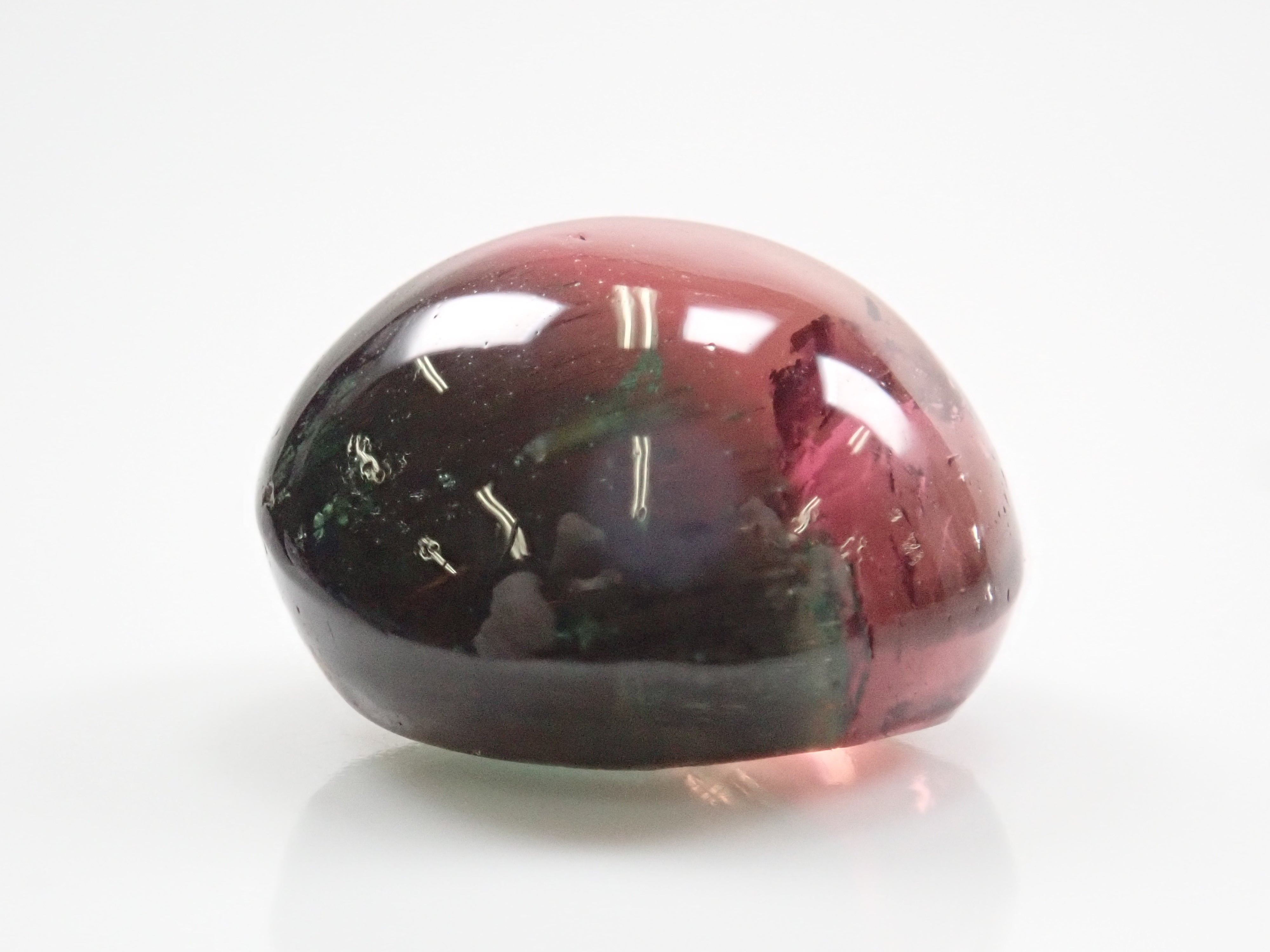 碧璽被稱為色彩寶庫。它擁有無數豐富的顏色,包括粉紅色、紅色、藍色、綠色、靛藍、橙色、紫色、黑色和棕色。這顆碧璽上竟然同時呈現兩種顏色。照片是用筆型手電筒拍攝的。碧璽背面基本未經打磨。這是一顆罕見的雙色碧璽,綠色和橙色之間有著美麗的交錯。