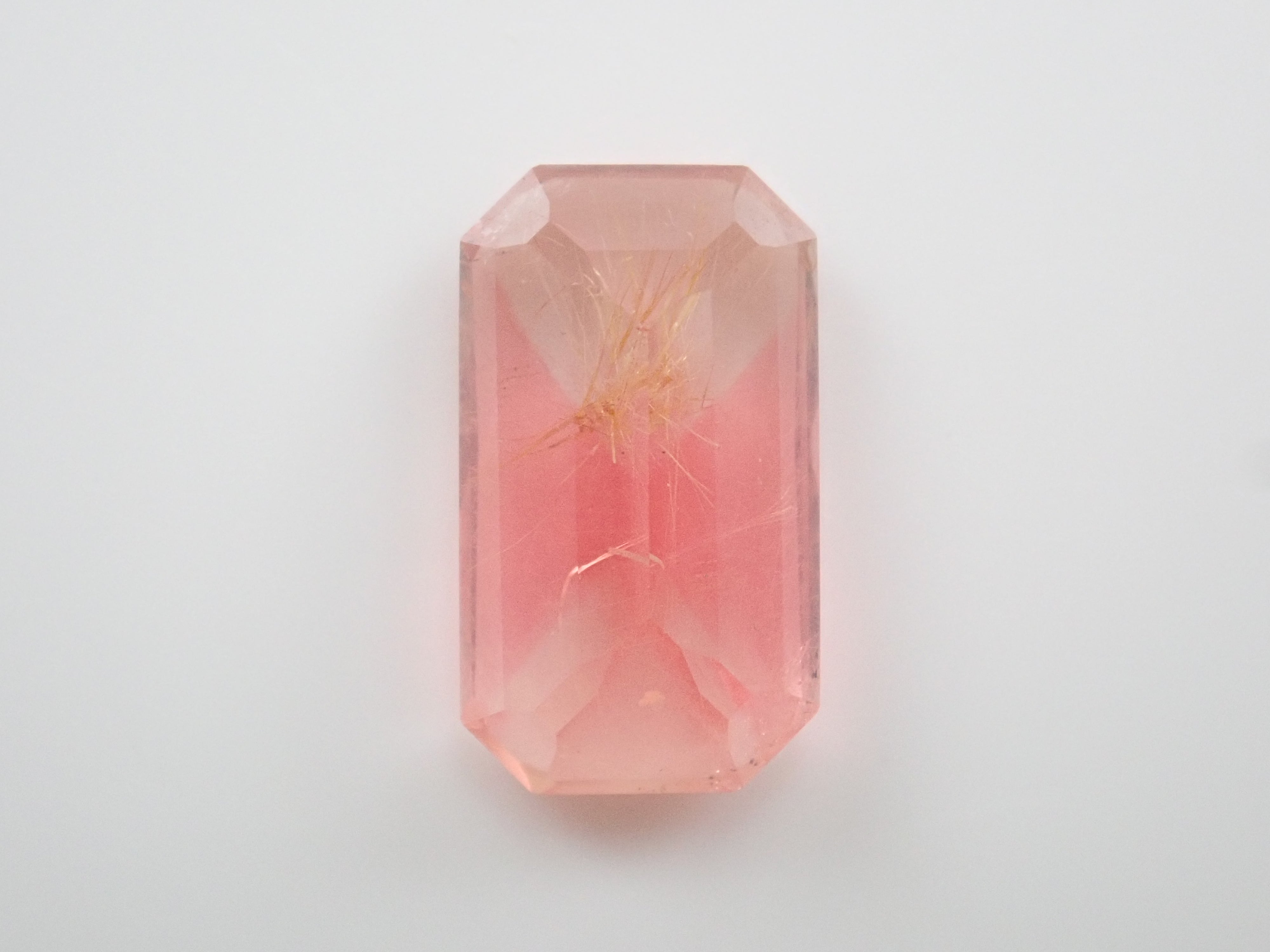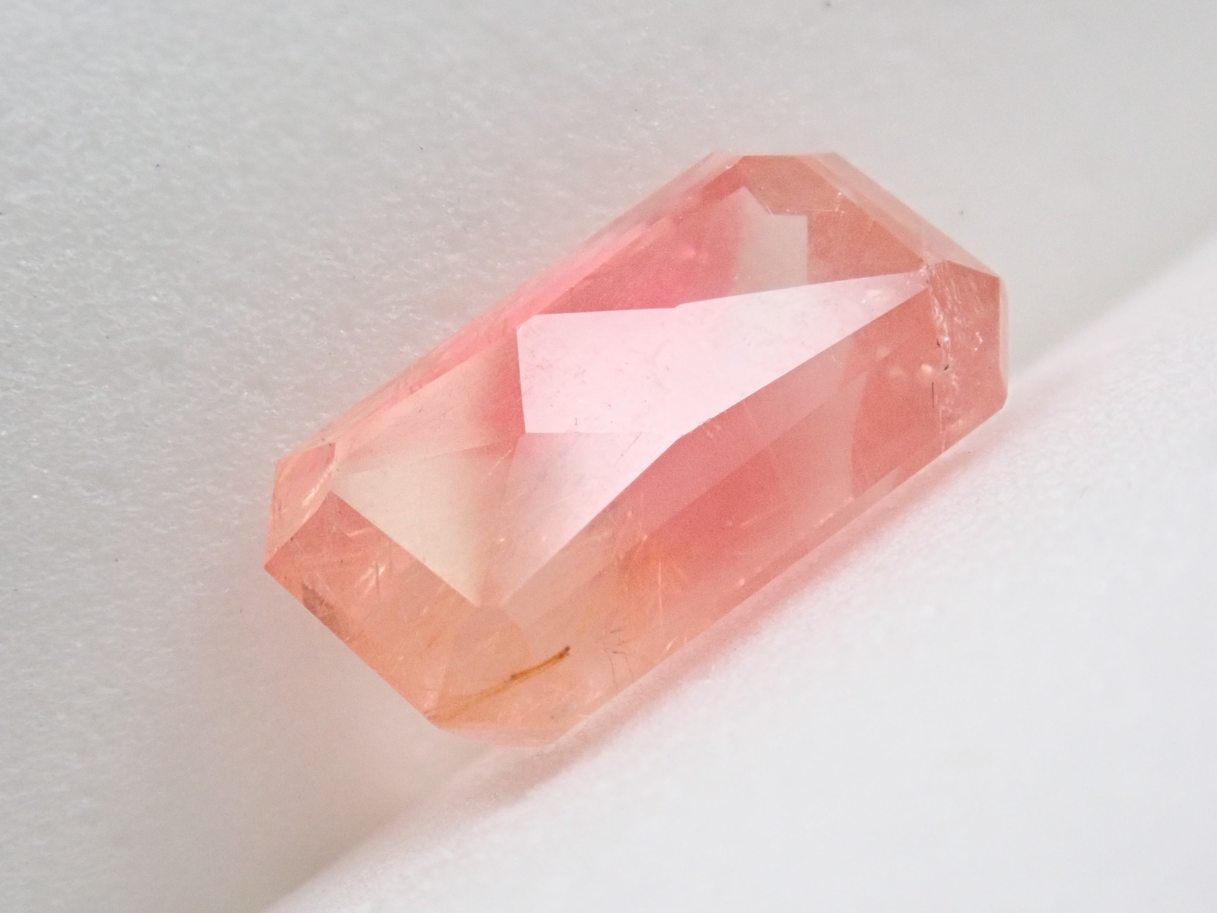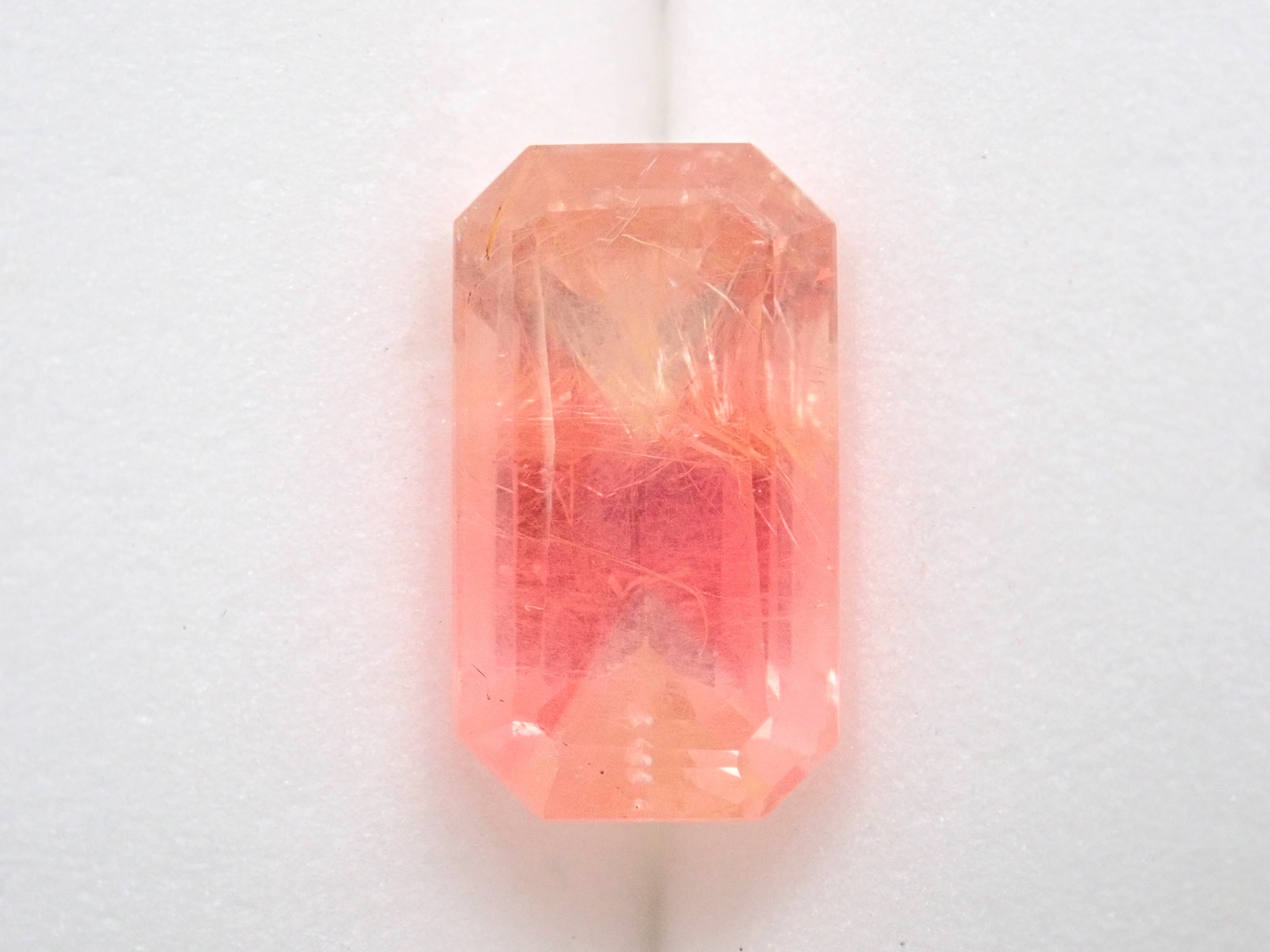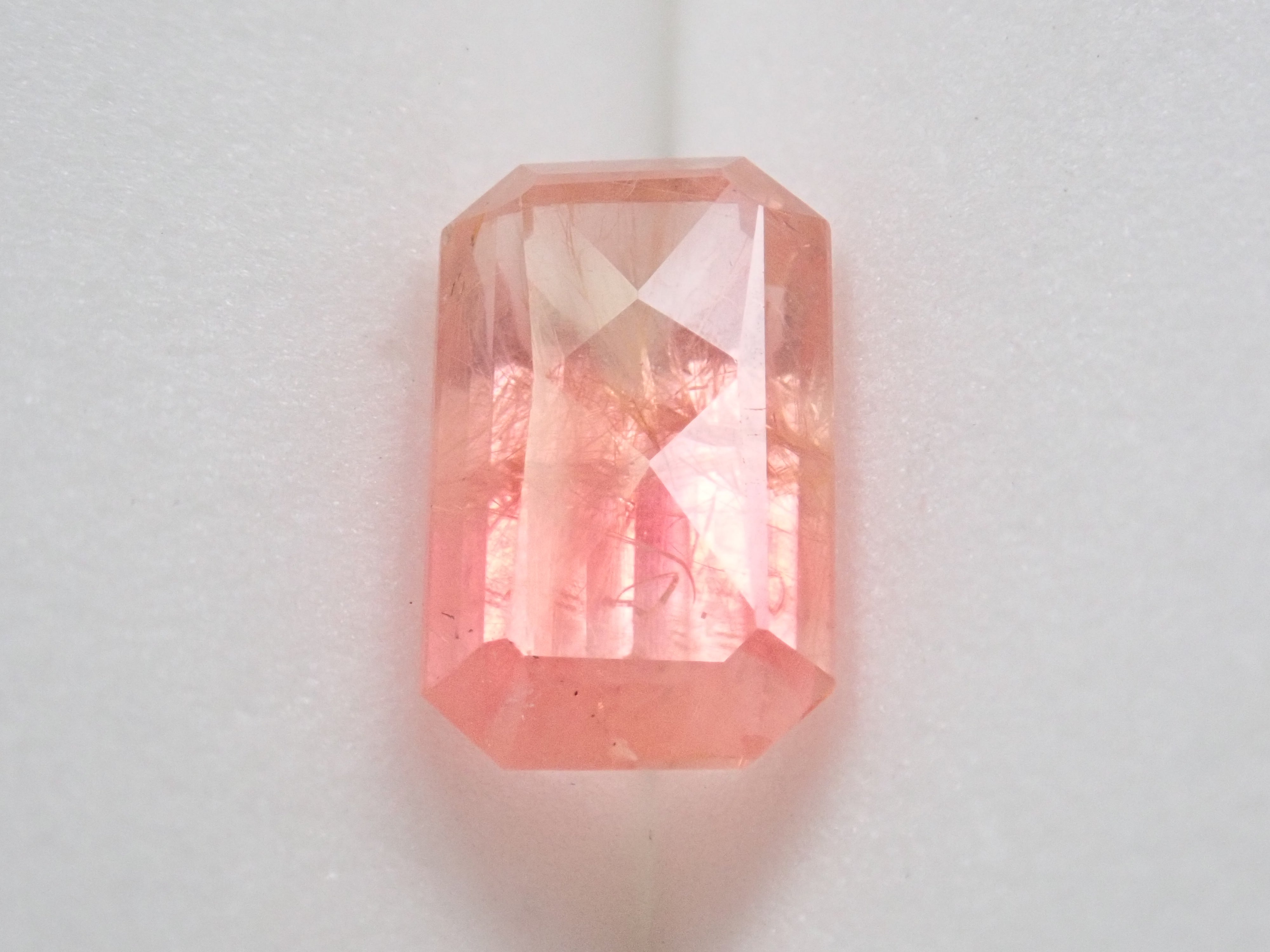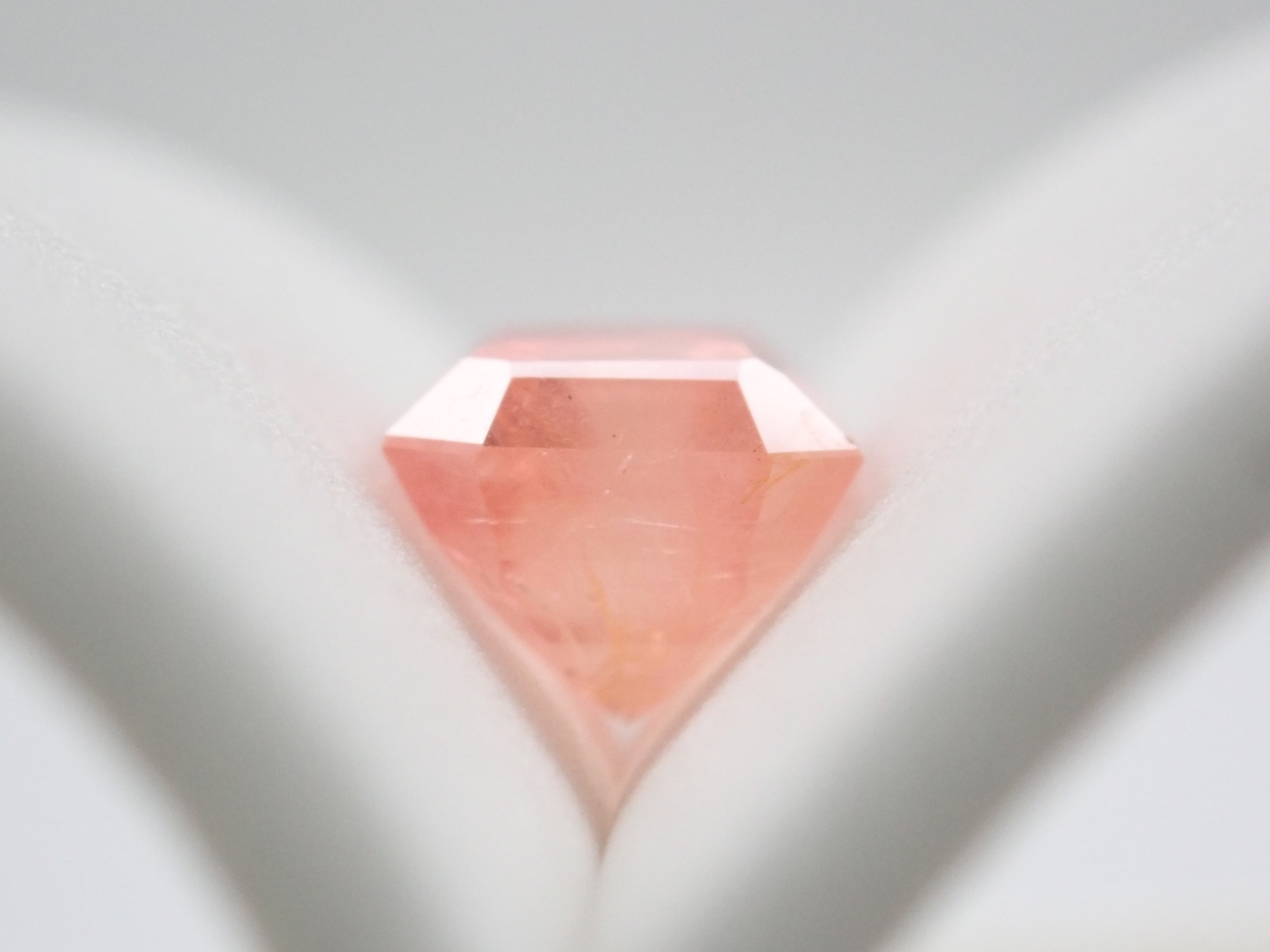 尤長石,顏色與帕帕拉恰藍寶石相似。 Pink Euclase 於 2015 年在巴西巴伊亞首次發現,並於 2019 年左右在全球上市。它比藍色更稀有,對於收藏家來說是一種罕見的寶石,最近在日本上市,儘管數量很少。藍色尤長石是由鐵和鈦著色的,粉紅色是由微量元素錳著色的。這是粉紅色和橙色的雙色尤克勞斯。它是一種超過 3 克拉的大型雙色顆粒,分佈體積特別小。據說裡面還含有另一種礦物,這種礦物可能就是褐鐵礦。有趣的是,粉紅色的長石中還含有另一種礦物質。附有日德寶石研究所頒發的鑑定證書。