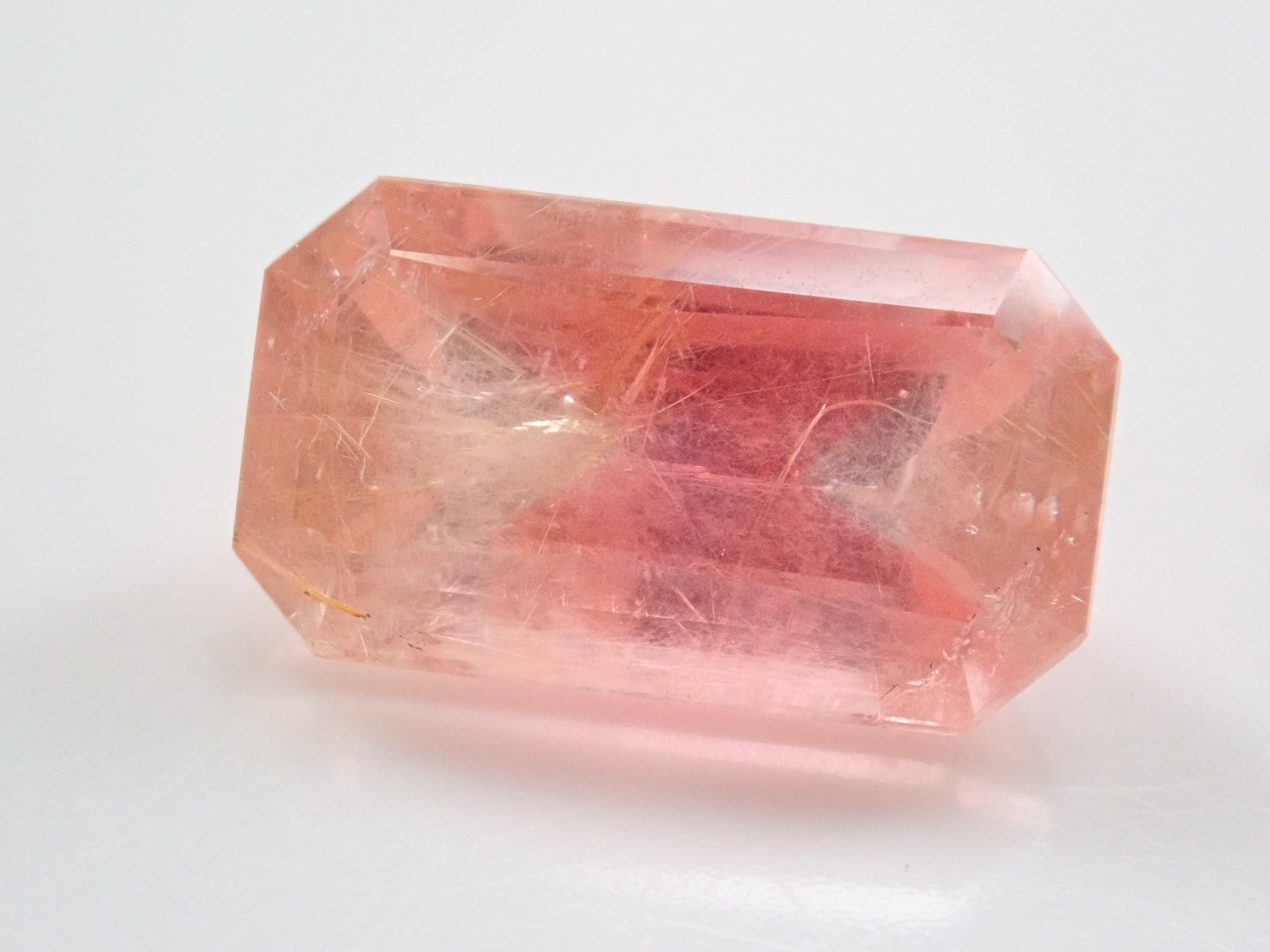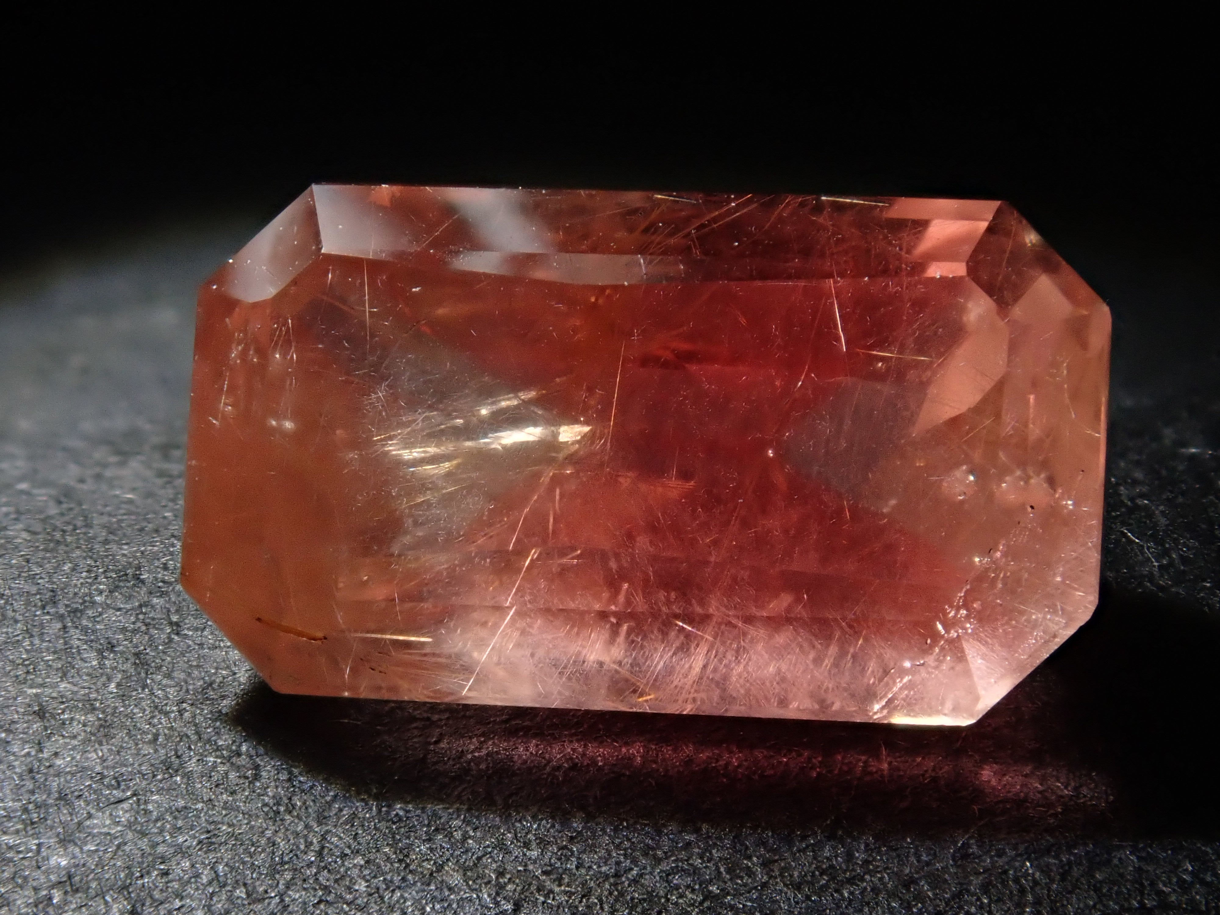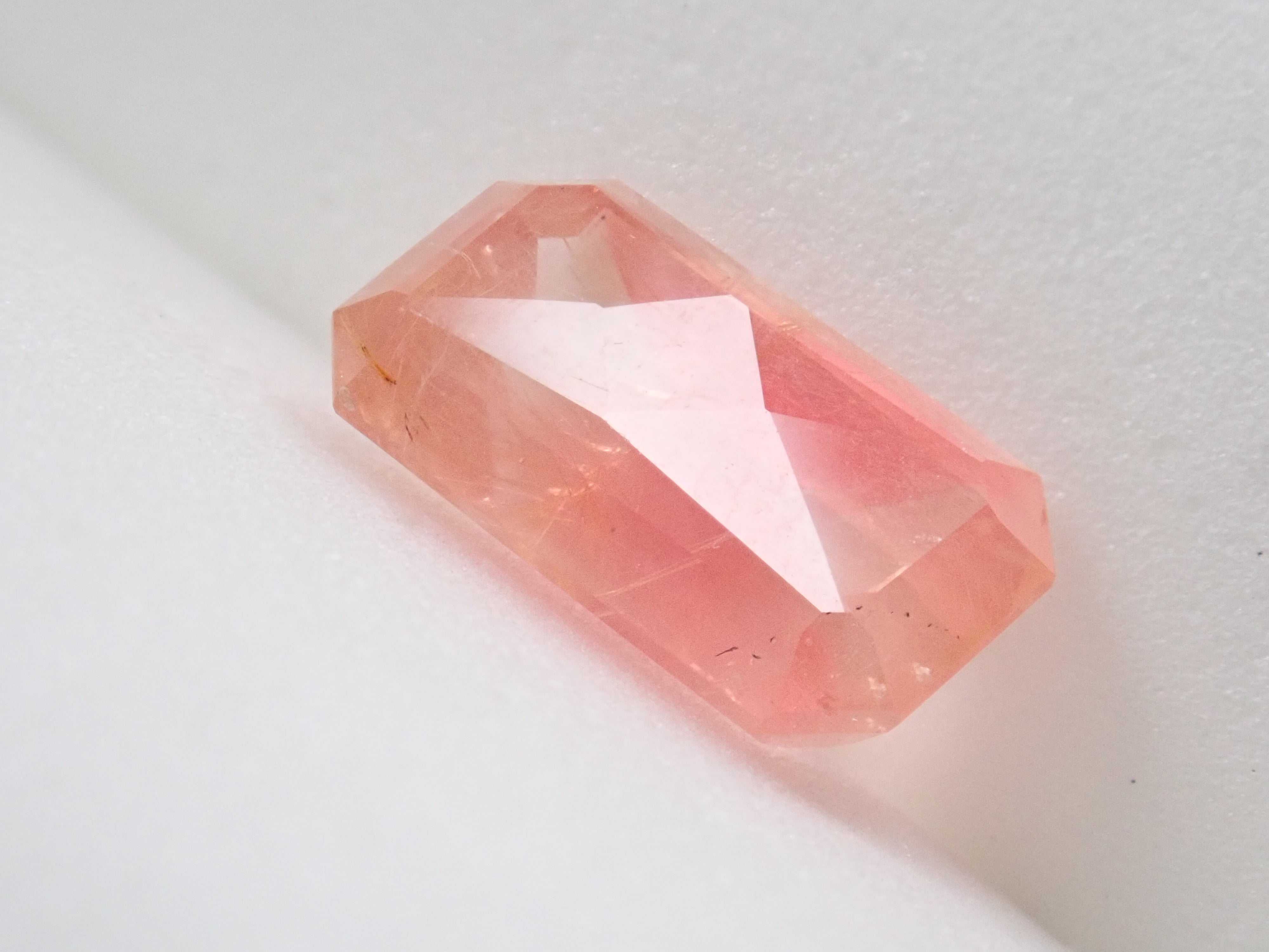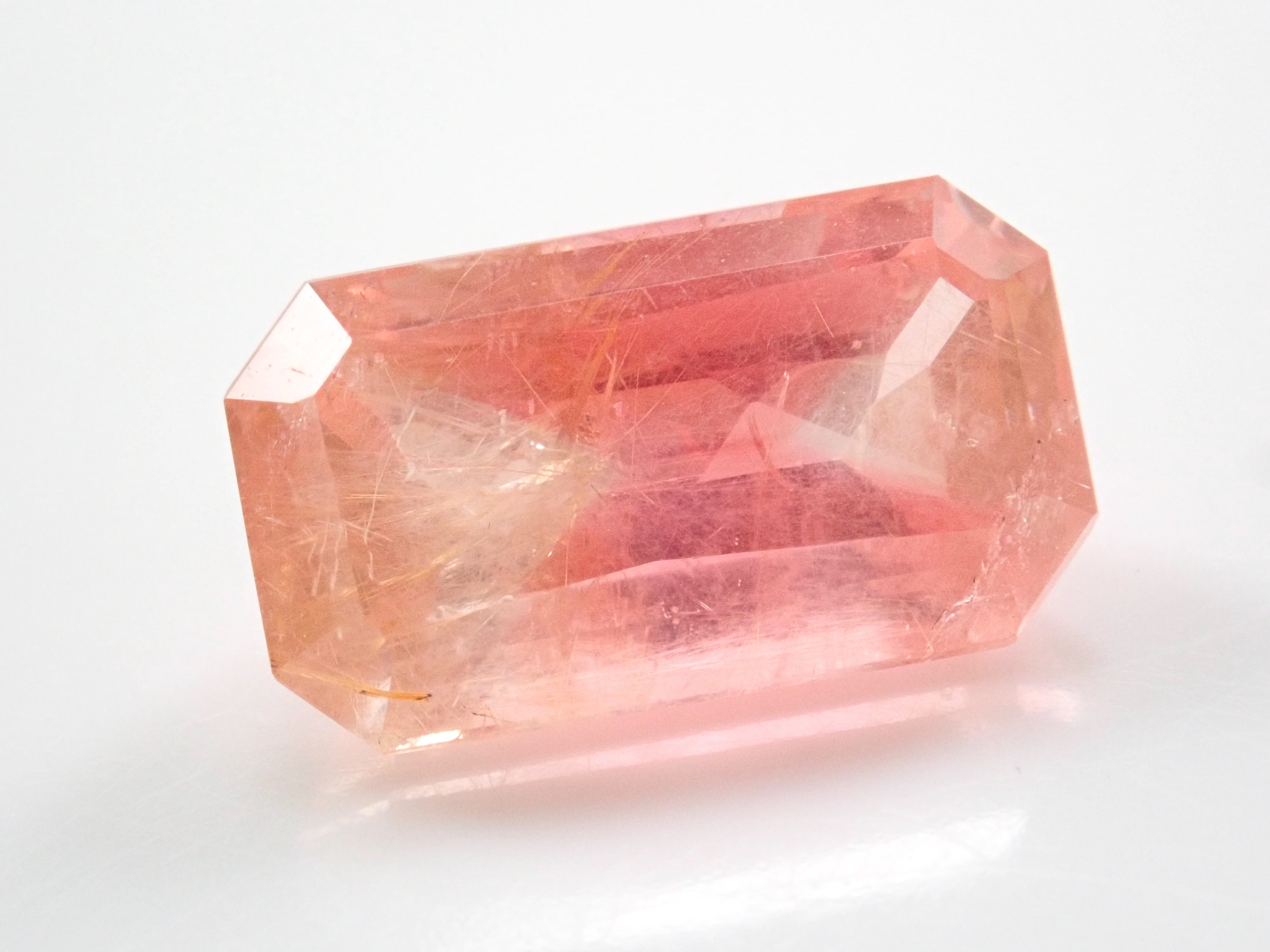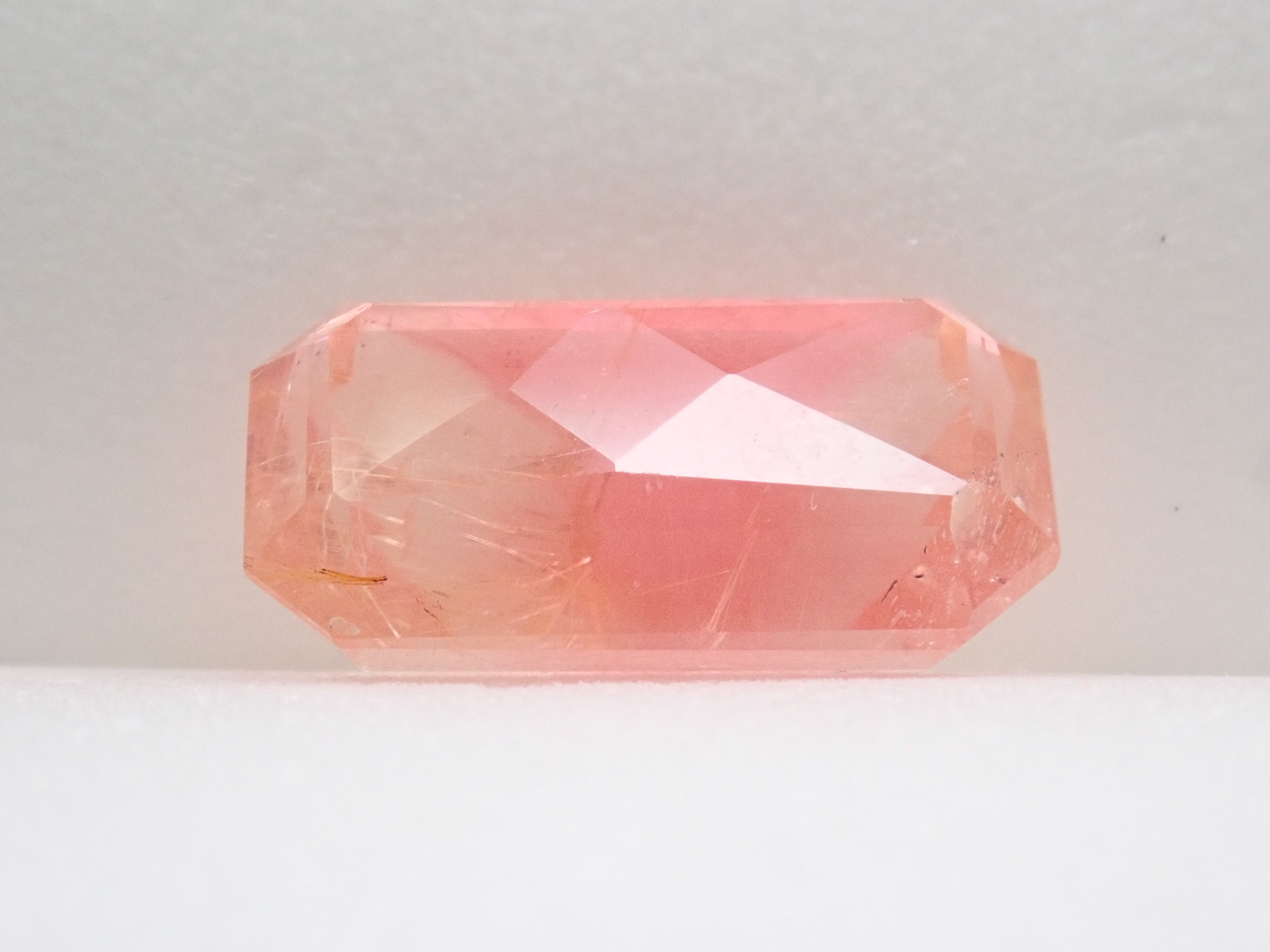 尤長石,顏色與帕帕拉恰藍寶石相似。 Pink Euclase 於 2015 年在巴西巴伊亞首次發現,並於 2019 年左右在全球上市。它比藍色更稀有,對於收藏家來說是一種罕見的寶石,最近在日本上市,儘管數量很少。藍色尤長石是由鐵和鈦著色的,粉紅色是由微量元素錳著色的。這是粉紅色和橙色的雙色尤克勞斯。它是一種超過 3 克拉的大型雙色顆粒,分佈體積特別小。據說裡面還含有另一種礦物,這種礦物可能就是褐鐵礦。有趣的是,粉紅色的長石中還含有另一種礦物質。附有日德寶石研究所頒發的鑑定證書。