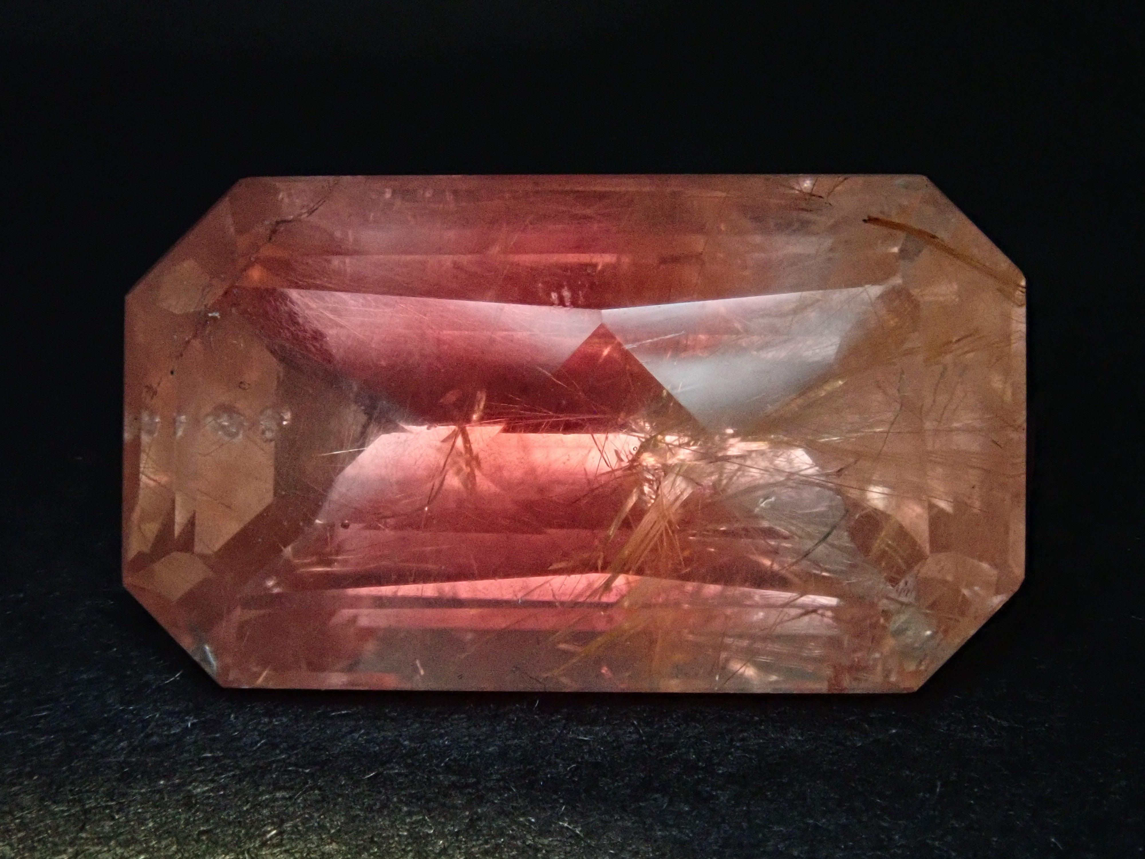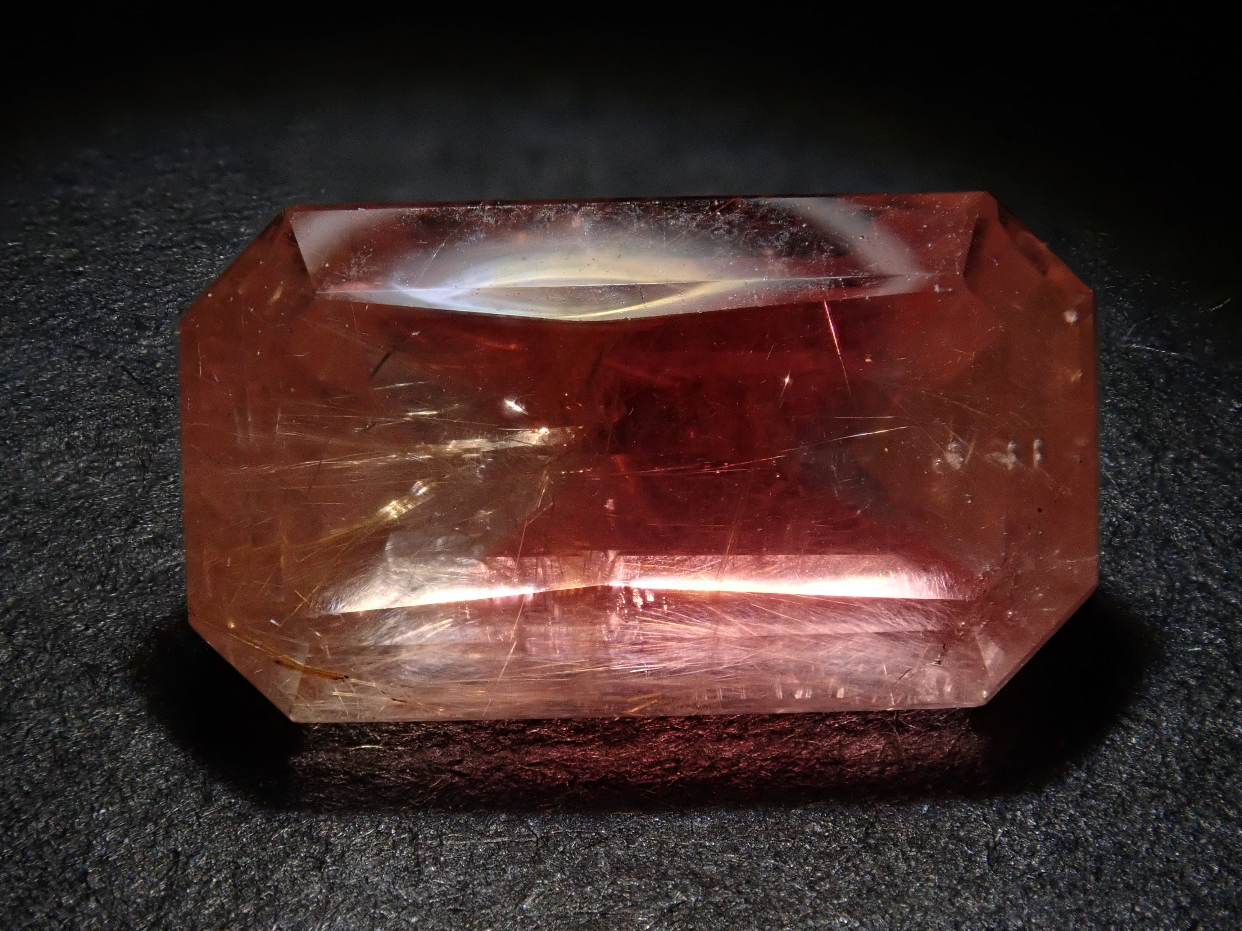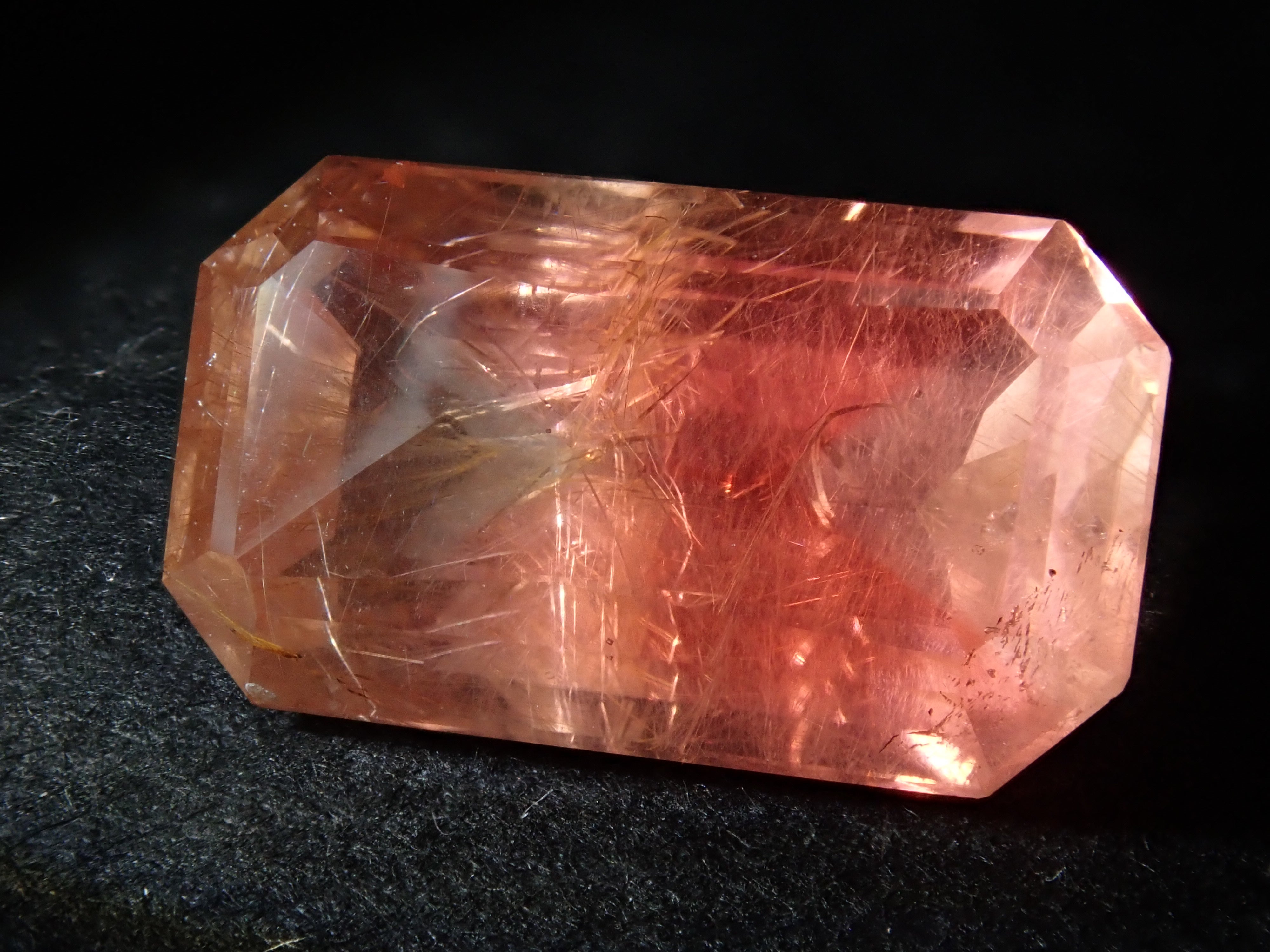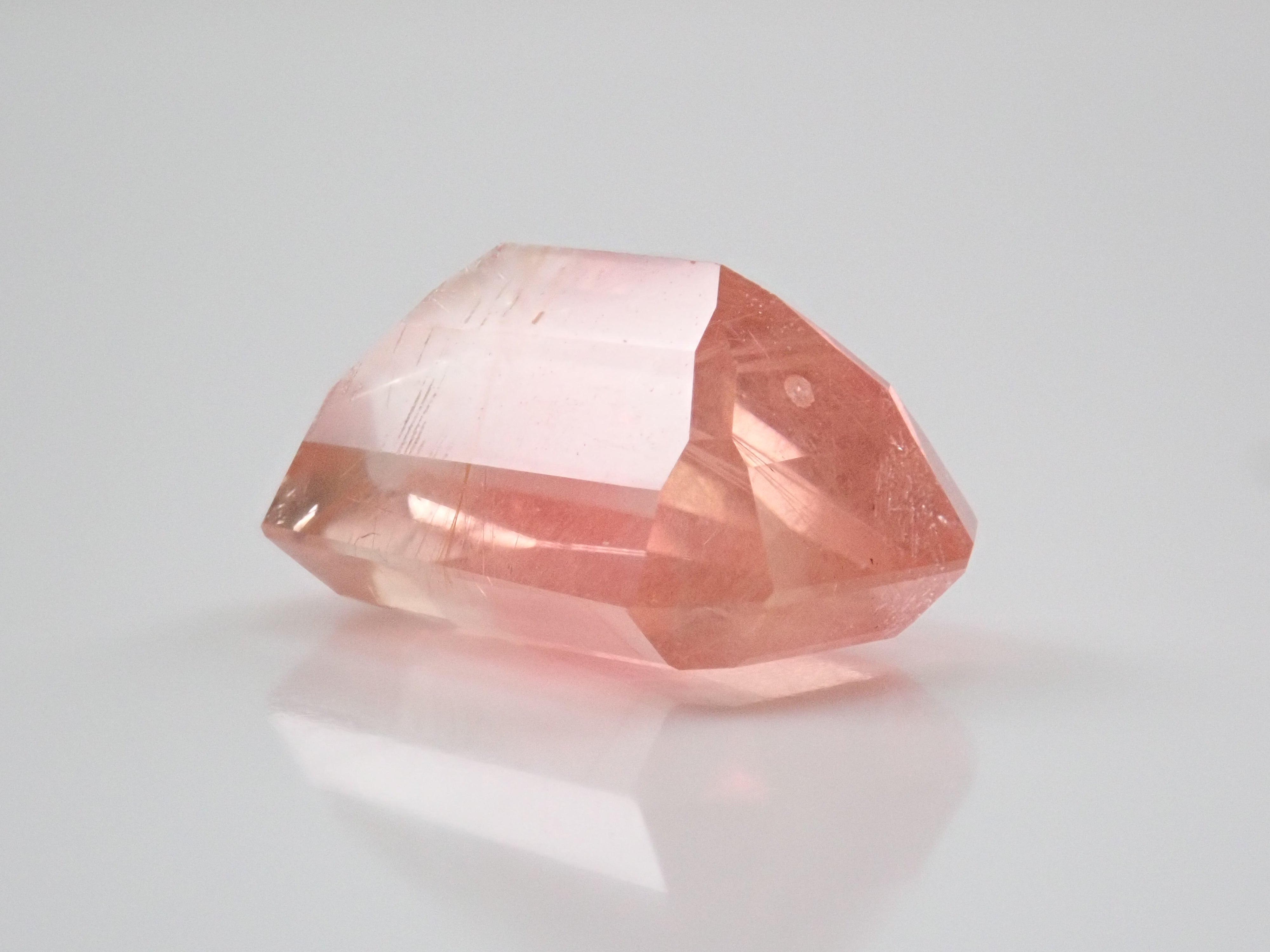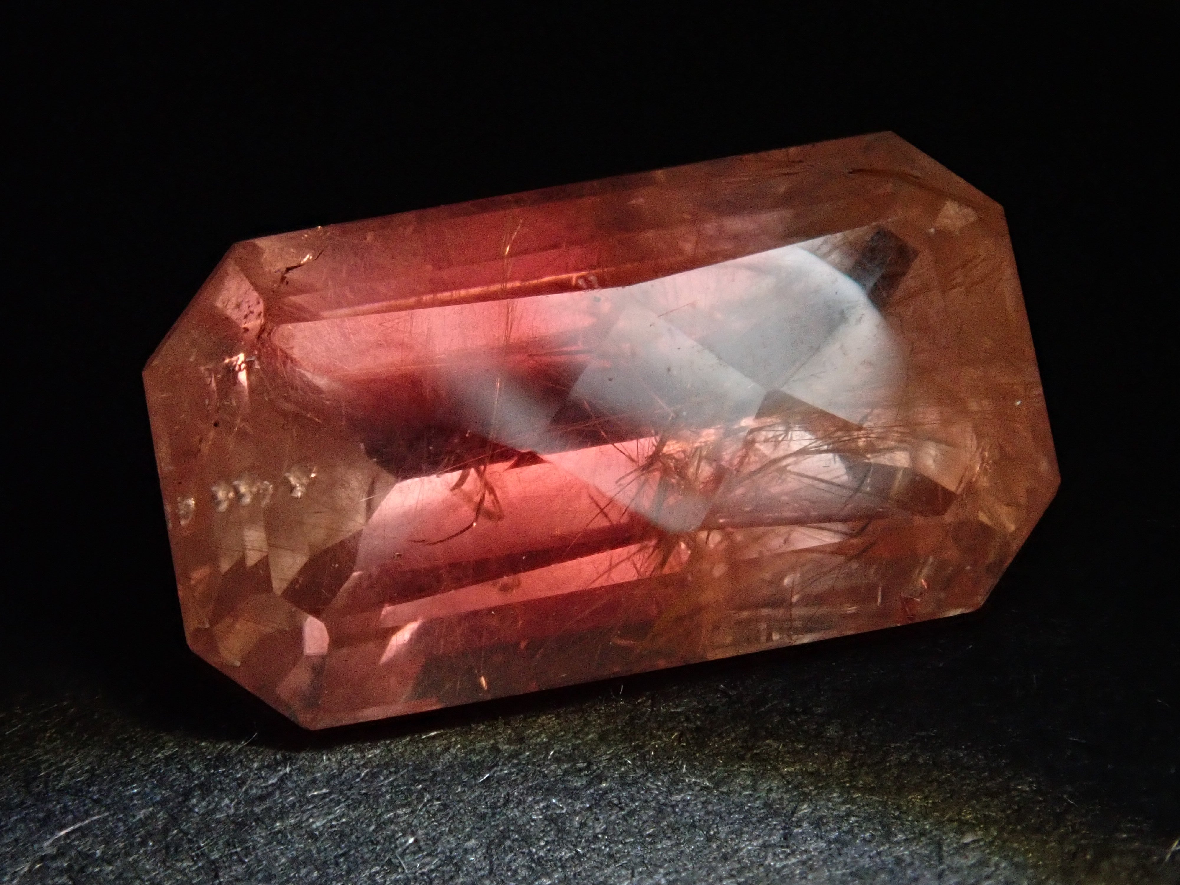 尤長石,顏色與帕帕拉恰藍寶石相似。 Pink Euclase 於 2015 年在巴西巴伊亞首次發現,並於 2019 年左右在全球上市。它比藍色更稀有,對於收藏家來說是一種罕見的寶石,最近在日本上市,儘管數量很少。藍色尤長石是由鐵和鈦著色的,粉紅色是由微量元素錳著色的。這是粉紅色和橙色的雙色尤克勞斯。它是一種超過 3 克拉的大型雙色顆粒,分佈體積特別小。據說裡面還含有另一種礦物,這種礦物可能就是褐鐵礦。有趣的是,粉紅色的長石中還含有另一種礦物質。附有日德寶石研究所頒發的鑑定證書。