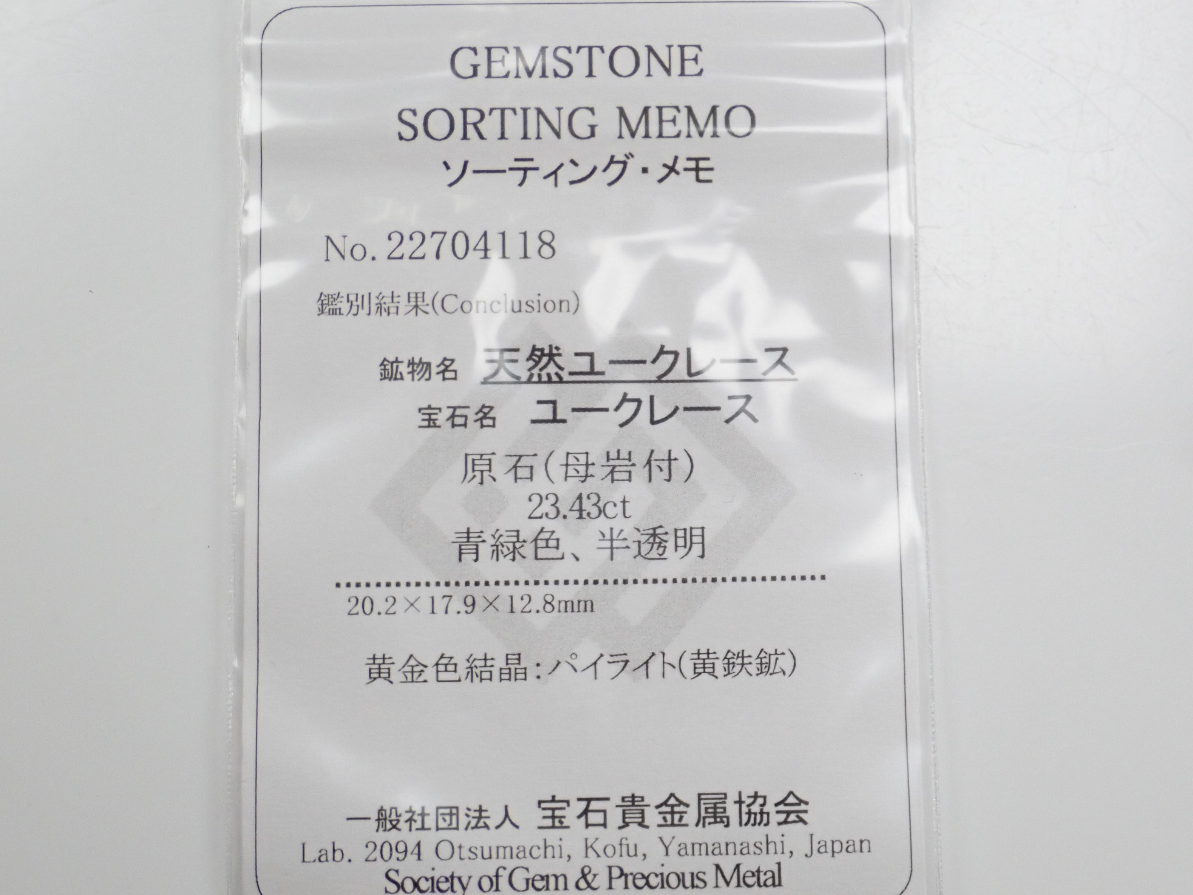 綠柱石(Euclase)的名字來自希臘語“eu”(意為“好”)和“klasis”(意為“破碎”)。顧名思義,它擁有完美的解理。由於產地稀少,這種寶石很少被製成寶石。它有多種顏色,包括白色、無色、淺綠色、淺藍色和深藍色。這顆產自哥倫比亞的綠柱石含黃鐵礦。它由日本寶石和貴金屬協會進行分類。